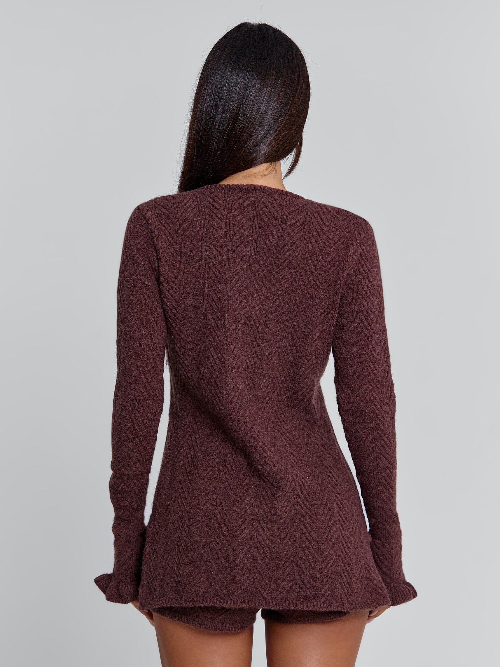 Crafted from a true knit with a beautiful herringbone texture, she features a deep neckline and a sculptural gold clasp that draws the waist in while keeping the silhouette effortless. Long sleeves with a gentle frill finish add a touch of softness to the overall look.