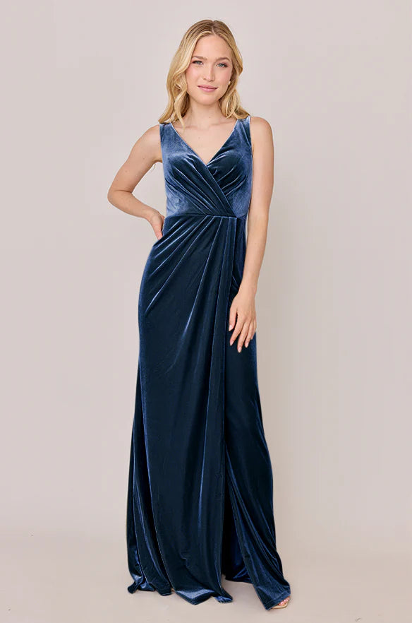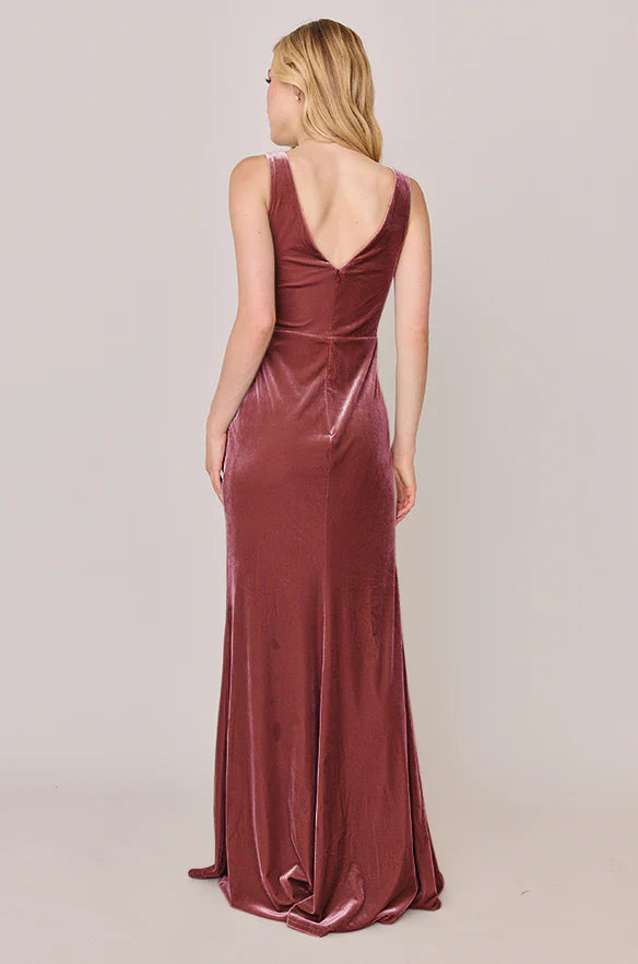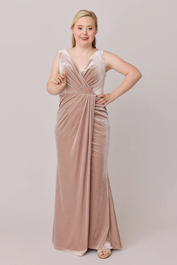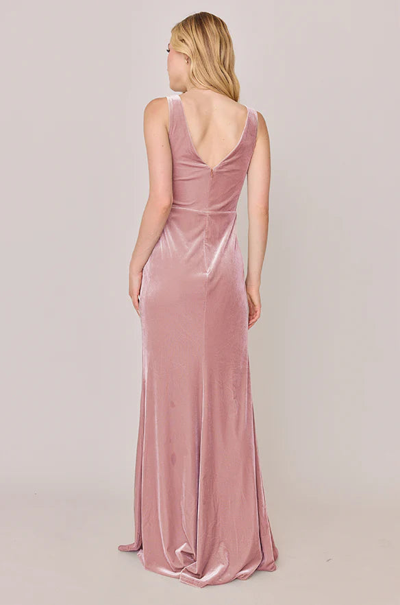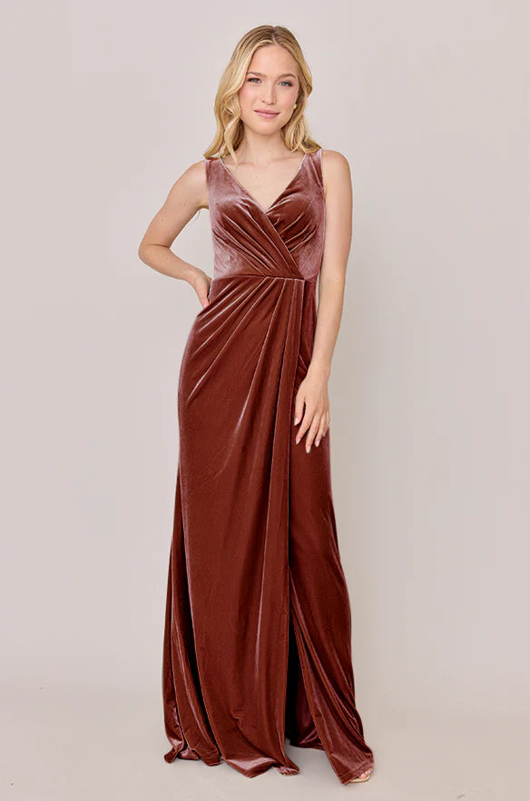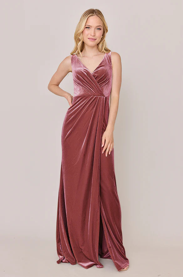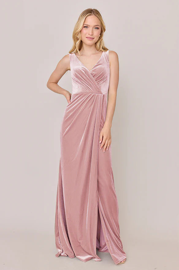 Our Blair Ellapink dress is a timeless silhouette that everyone will want in their bridal lineup!This dress features stylized pleats that meet at the left side front of the waistline to help create a refined faux version of the widely known wrap dress accompanied by a modest slit. Blair is fit to flatter all types of figures and this modest style will still have you feeling confident and sexy all night long!