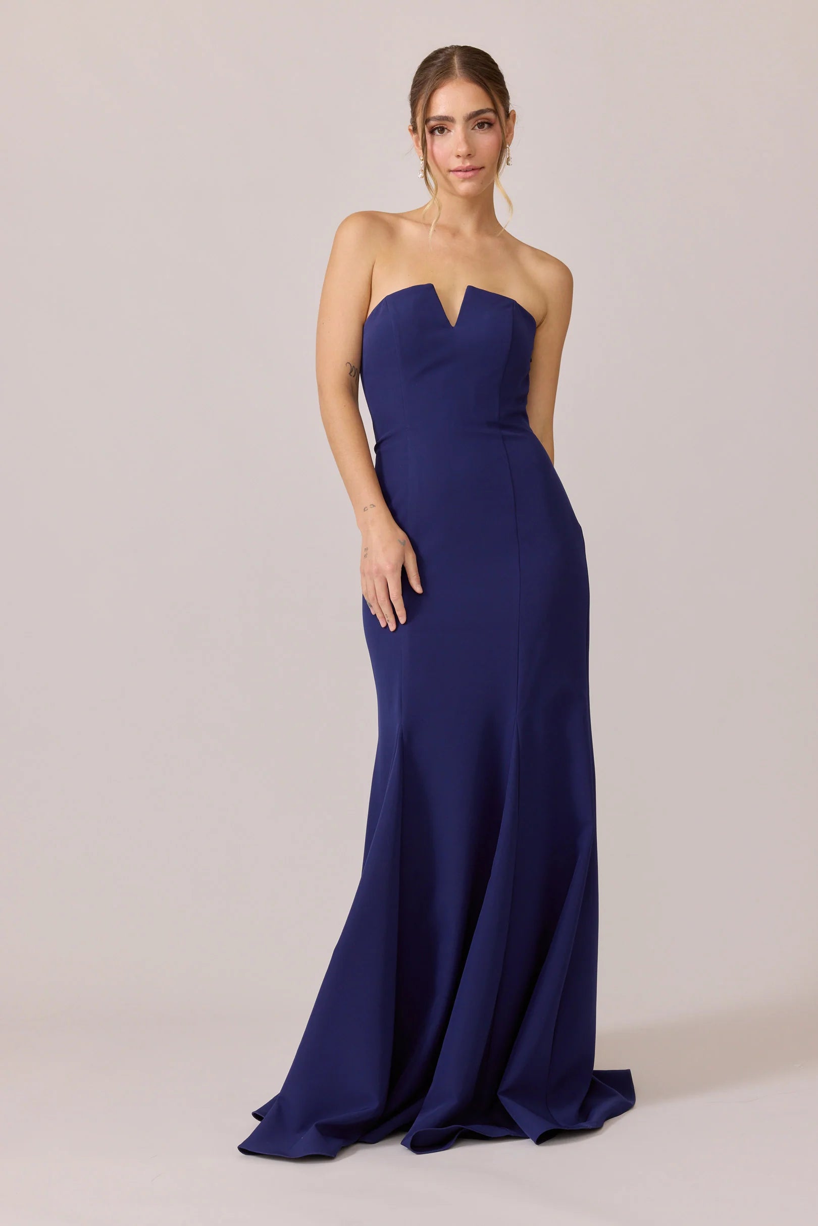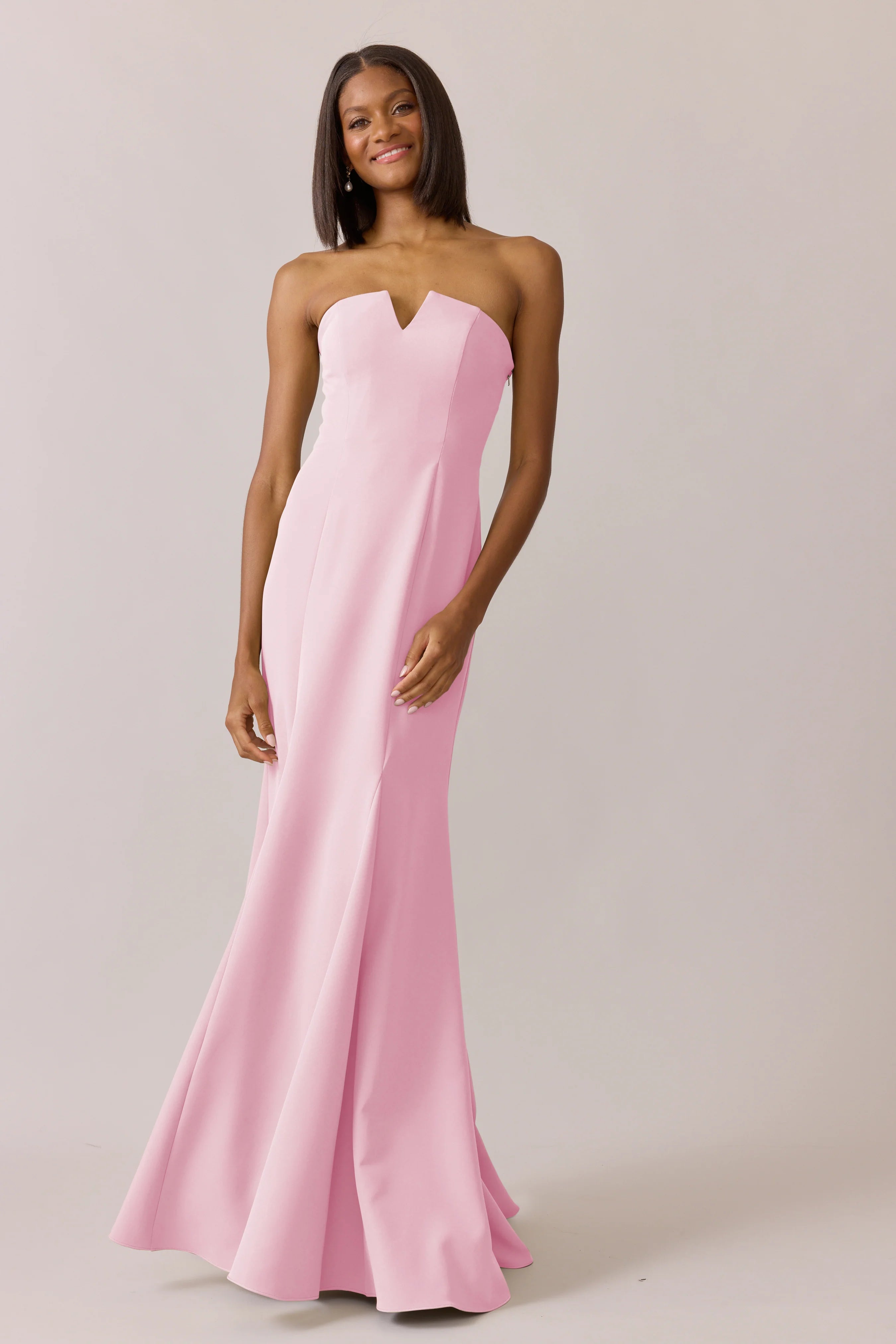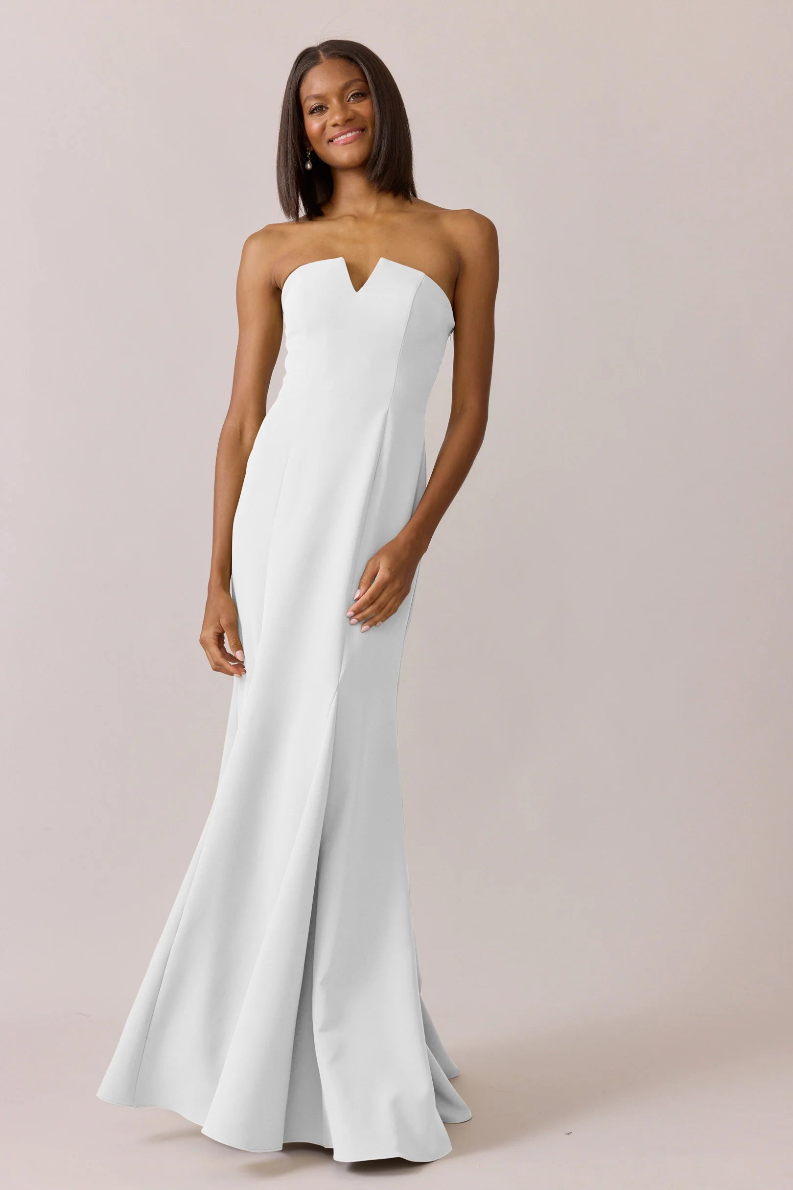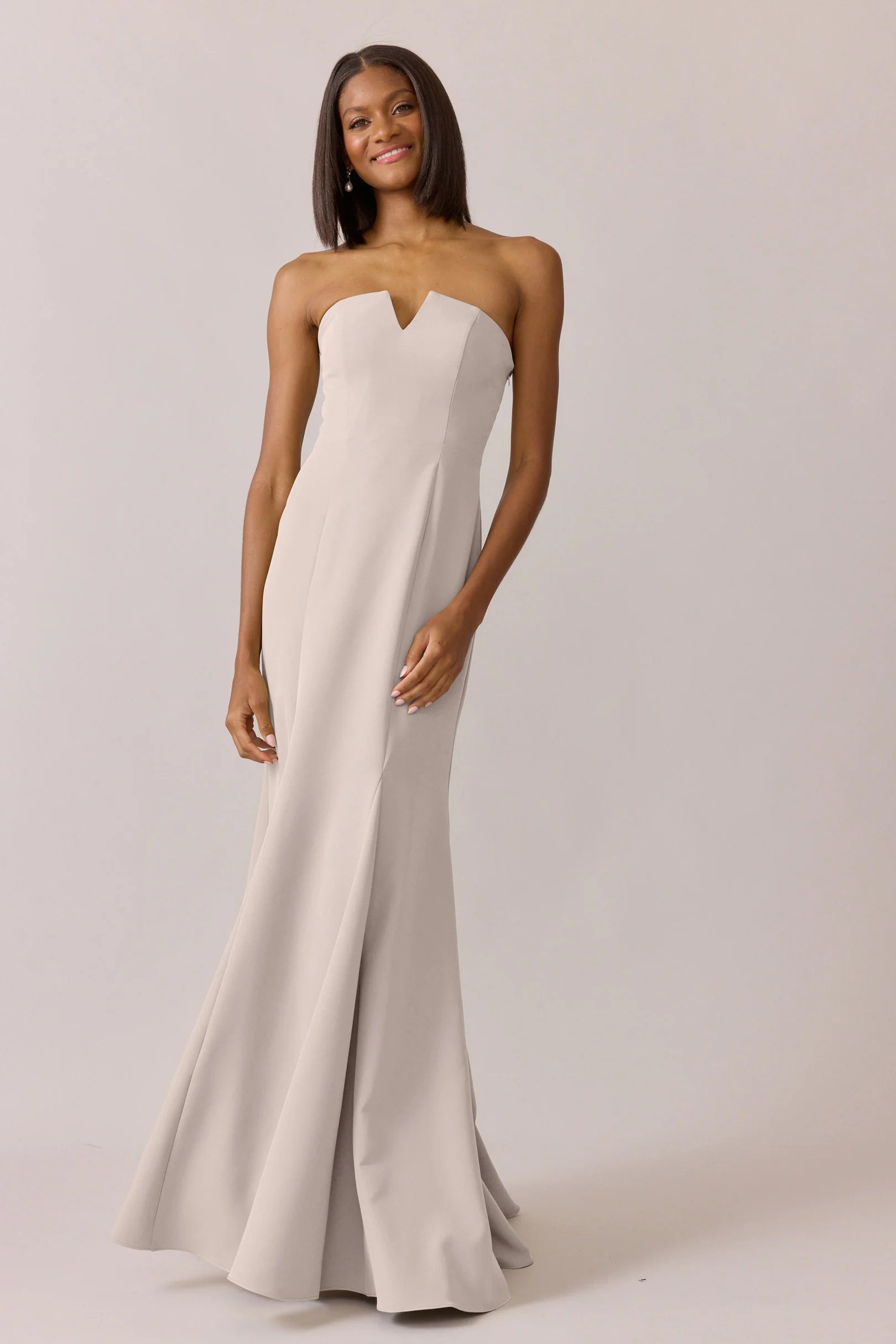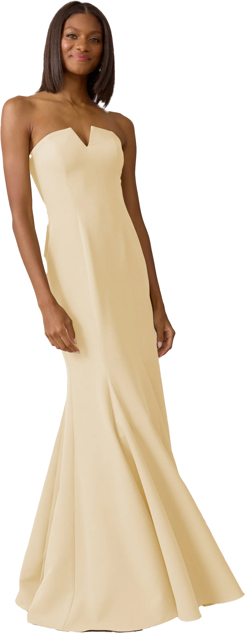 Understated, sculpted, and so refined. The Estelle Crepe Dress stuns with a sleek mermaid silhouette, strapless V-notch neckline, and a flowing godet pleated skirt that adds just the right amount of drama—without a slit. Built-in cups and boning keep things supported, while the full-length double lining ensures smooth, confident wear from ceremony to celebration.