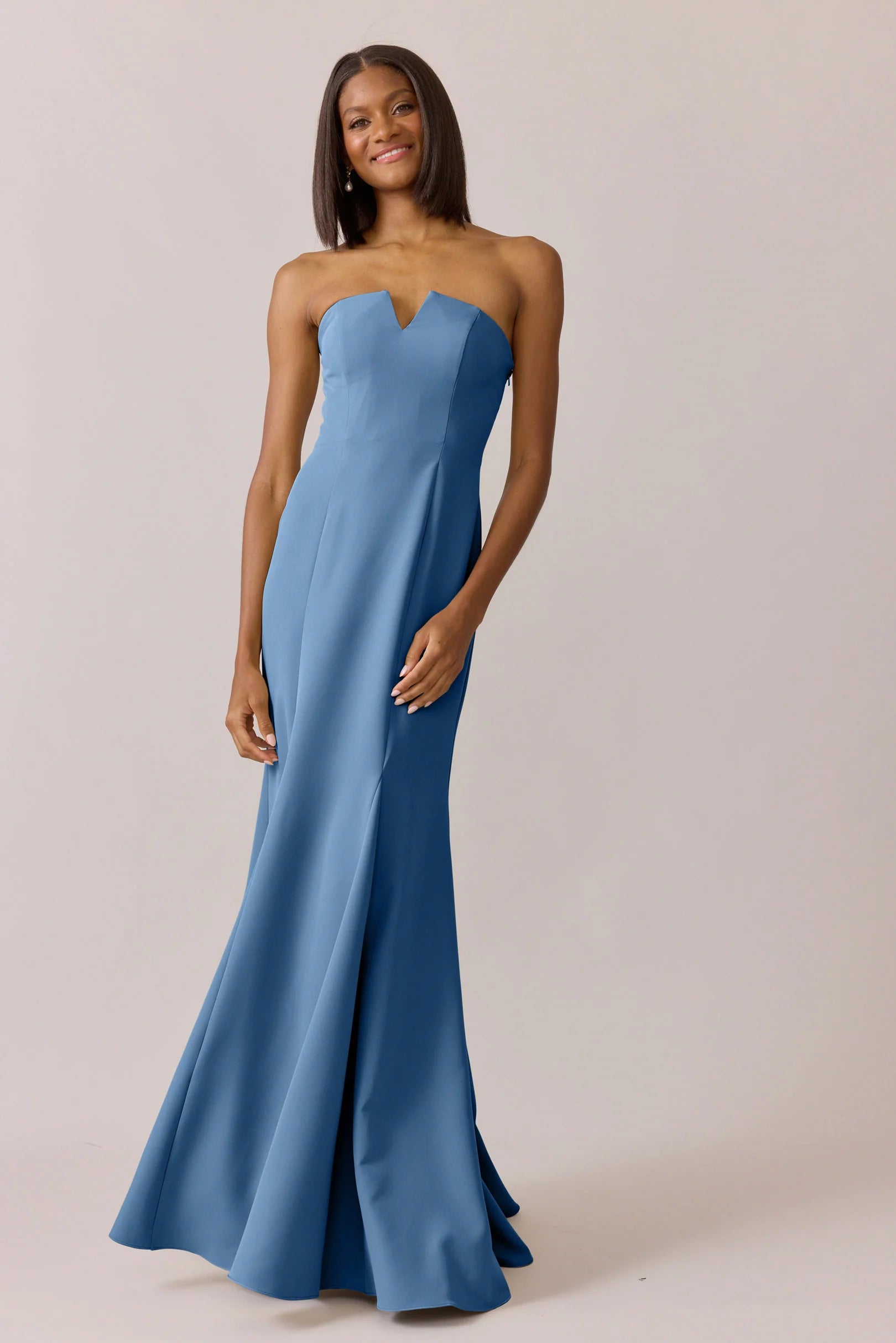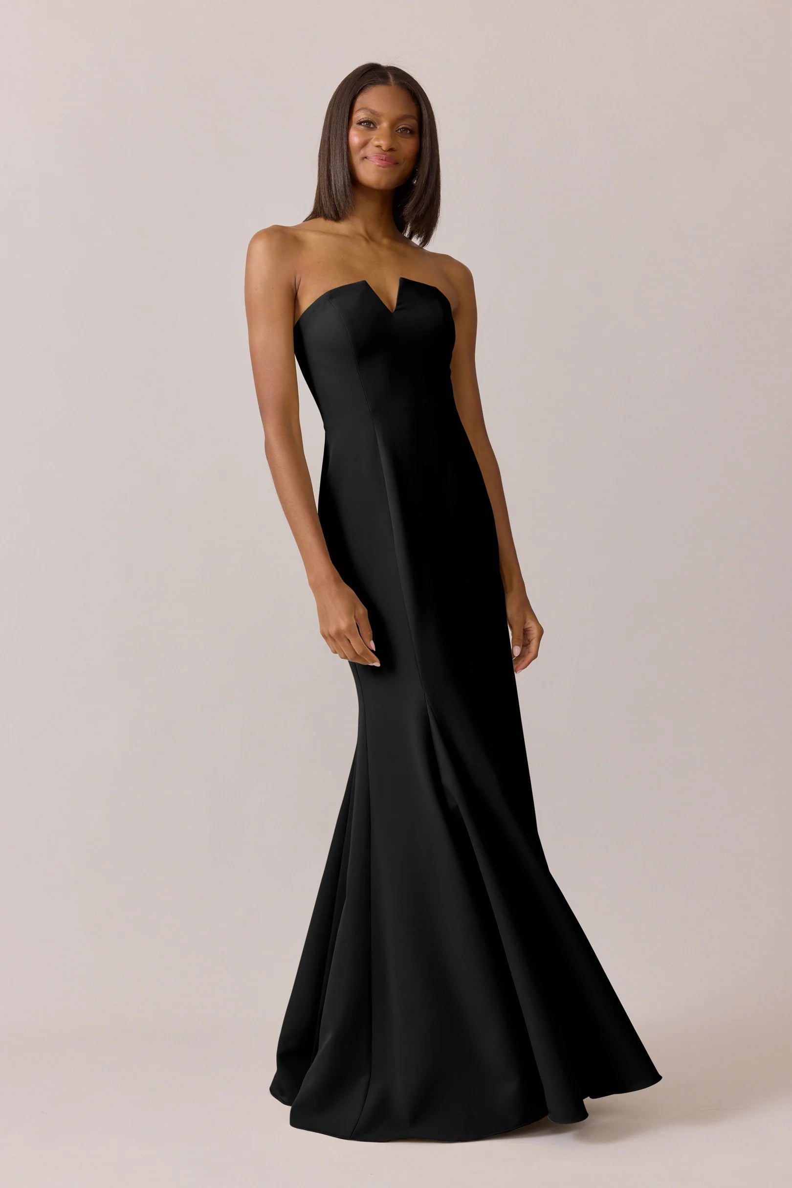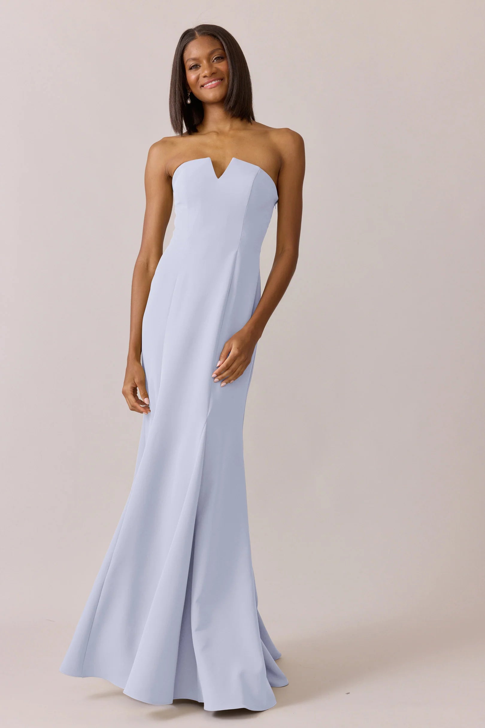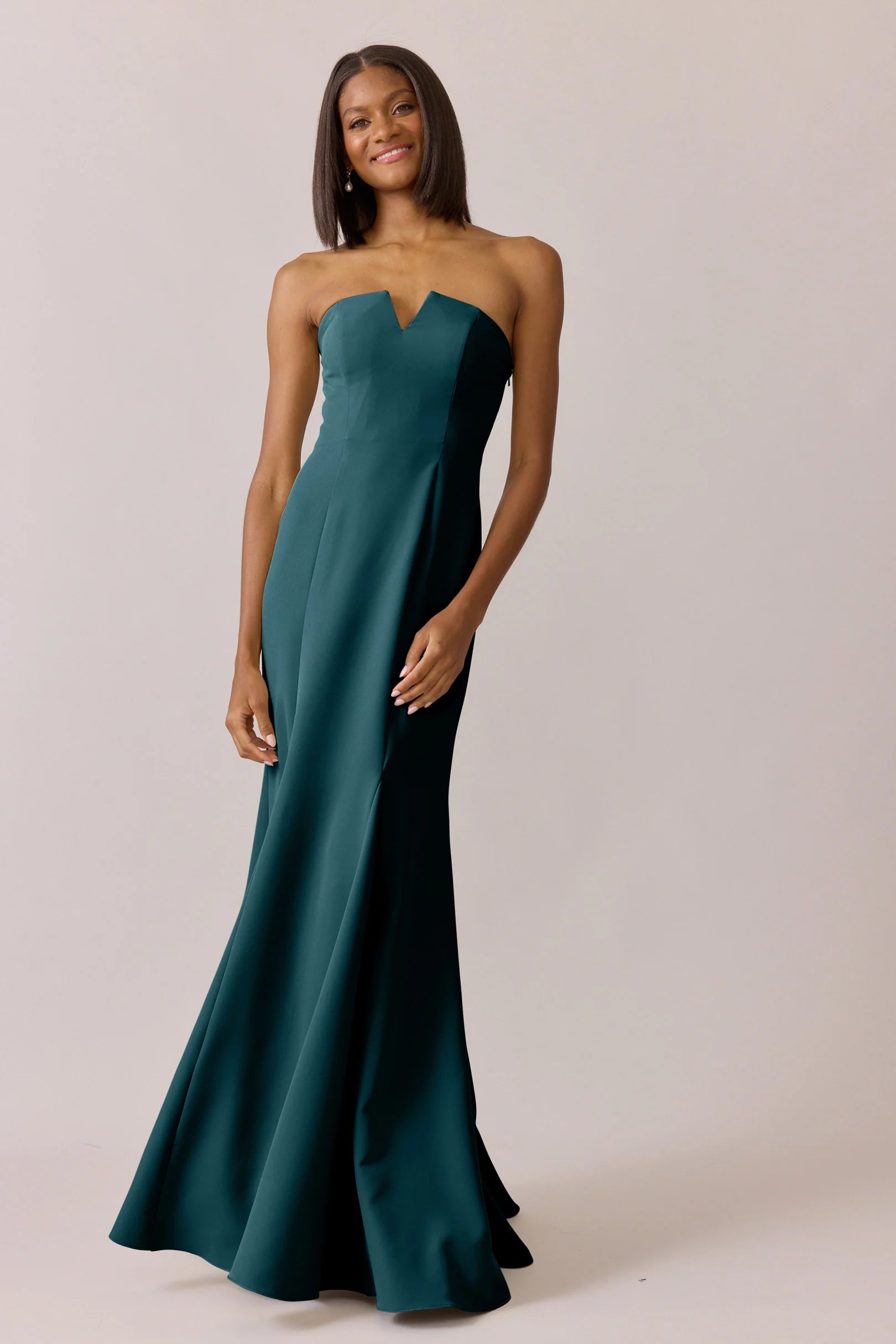 Understated, sculpted, and so refined. The Estelle Crepe Dress stuns with a sleek mermaid silhouette, strapless V-notch neckline, and a flowing godet pleated skirt that adds just the right amount of drama—without a slit. Built-in cups and boning keep things supported, while the full-length double lining ensures smooth, confident wear from ceremony to celebration.