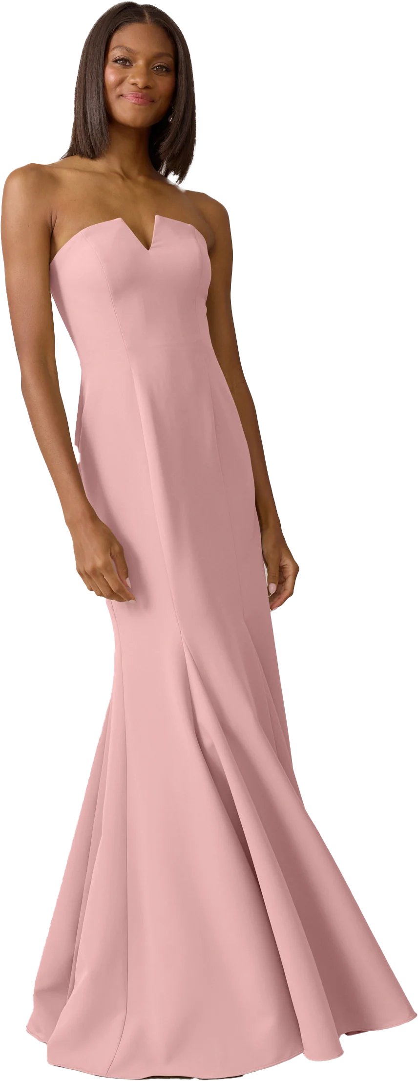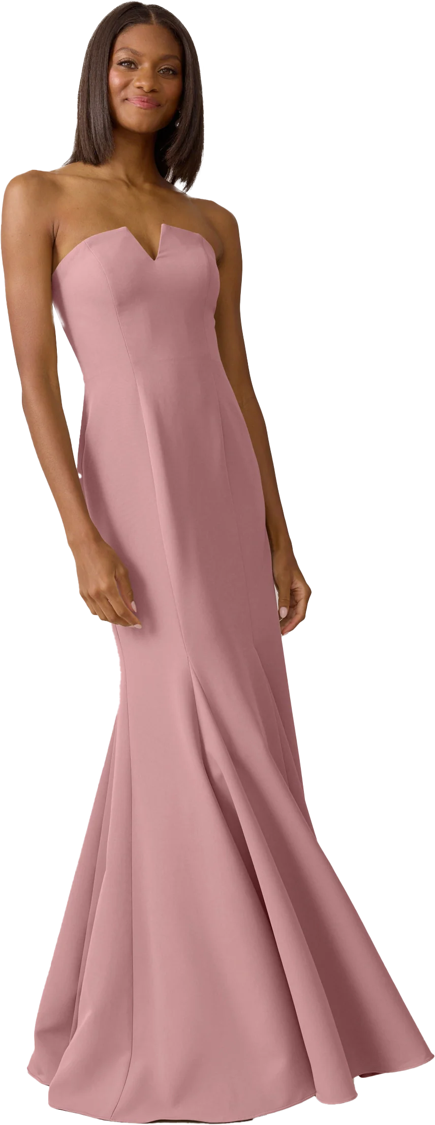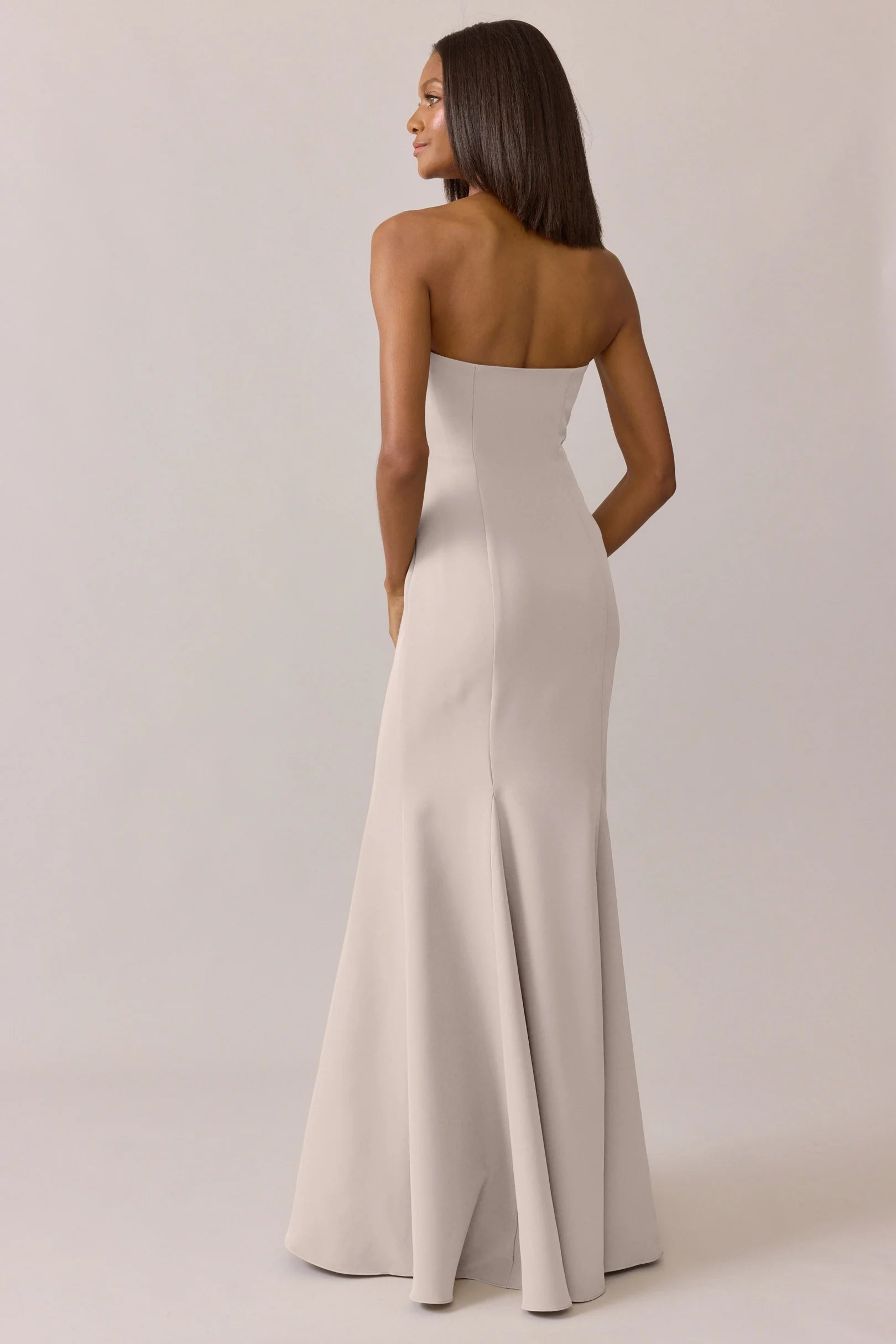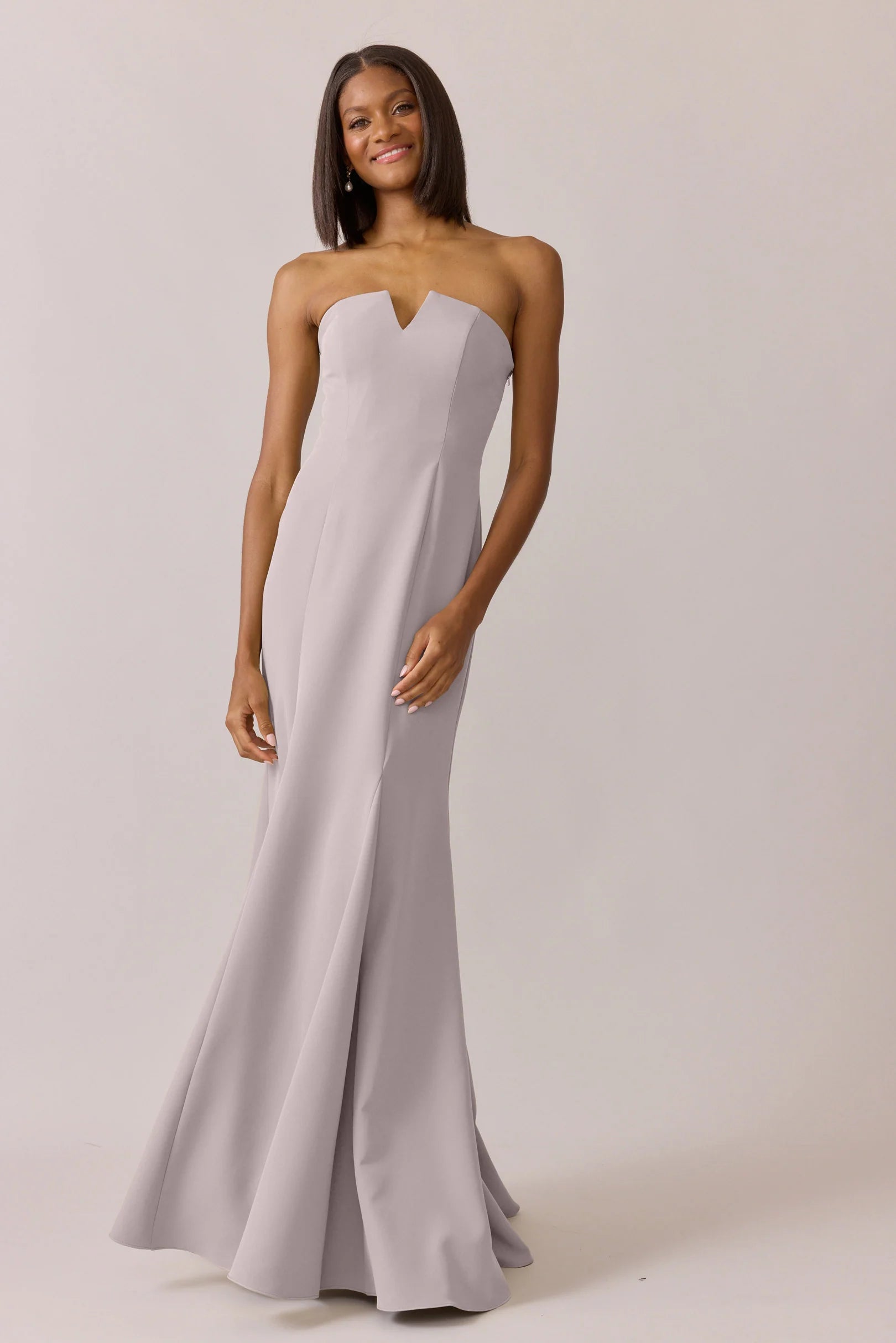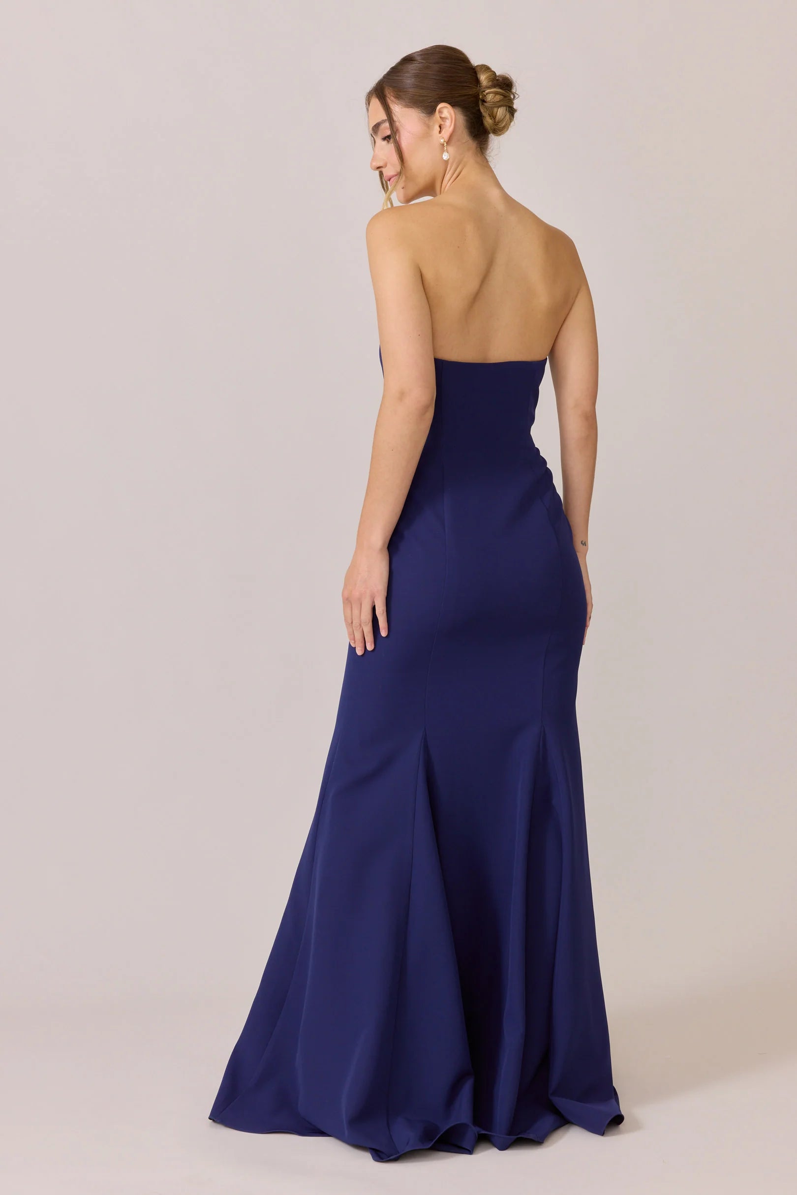 Understated, sculpted, and so refined. The Estelle Crepe Dress stuns with a sleek mermaid silhouette, strapless V-notch neckline, and a flowing godet pleated skirt that adds just the right amount of drama—without a slit. Built-in cups and boning keep things supported, while the full-length double lining ensures smooth, confident wear from ceremony to celebration.