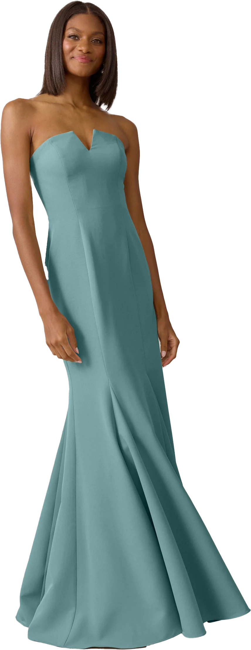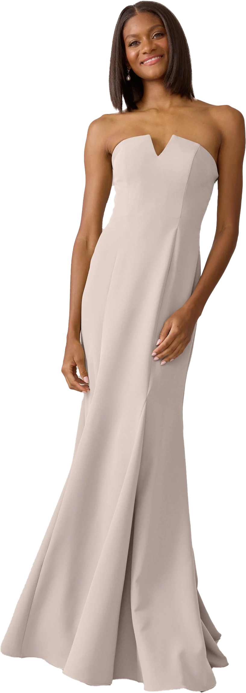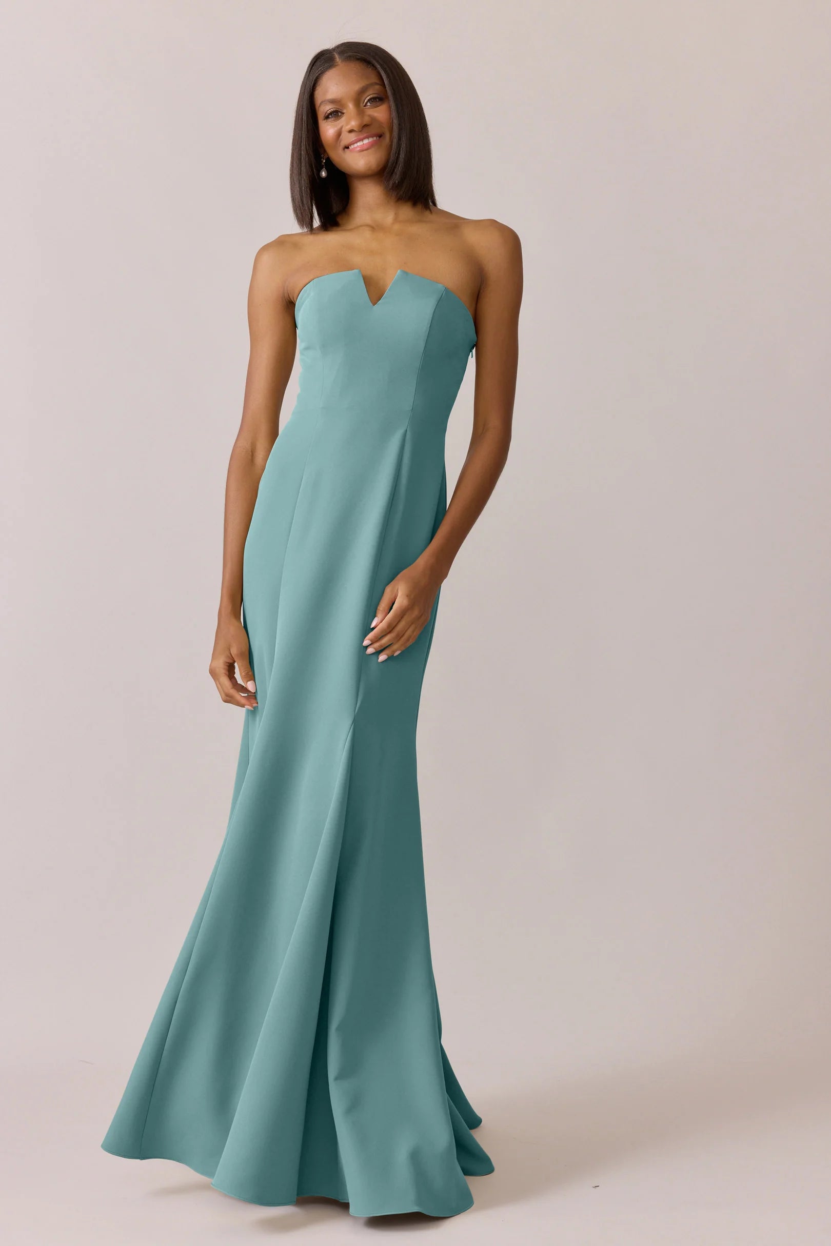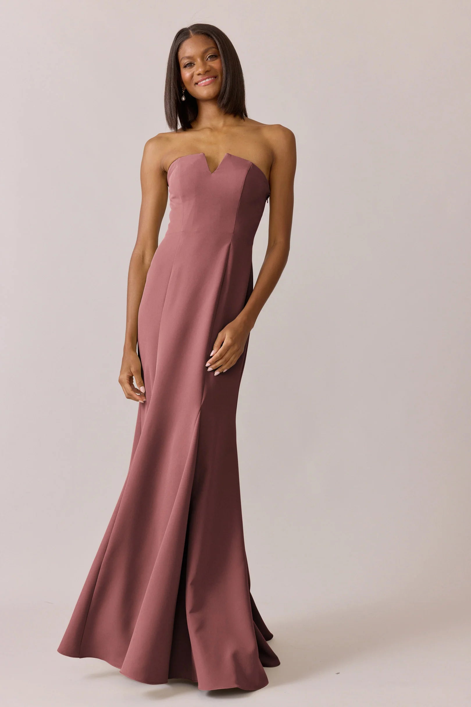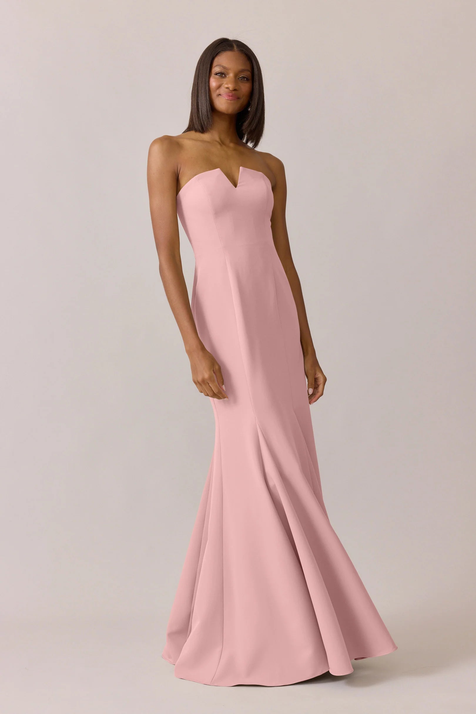 Understated, sculpted, and so refined. The Estelle Crepe Dress stuns with a sleek mermaid silhouette, strapless V-notch neckline, and a flowing godet pleated skirt that adds just the right amount of drama—without a slit. Built-in cups and boning keep things supported, while the full-length double lining ensures smooth, confident wear from ceremony to celebration.