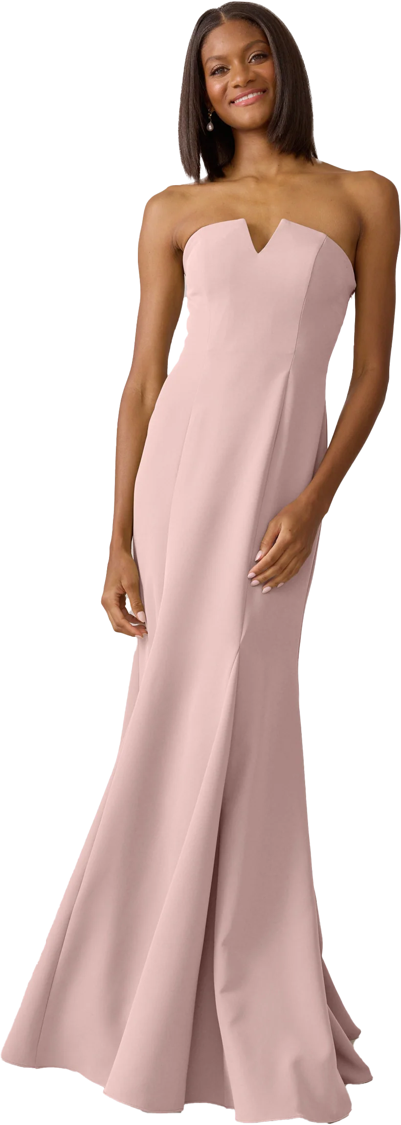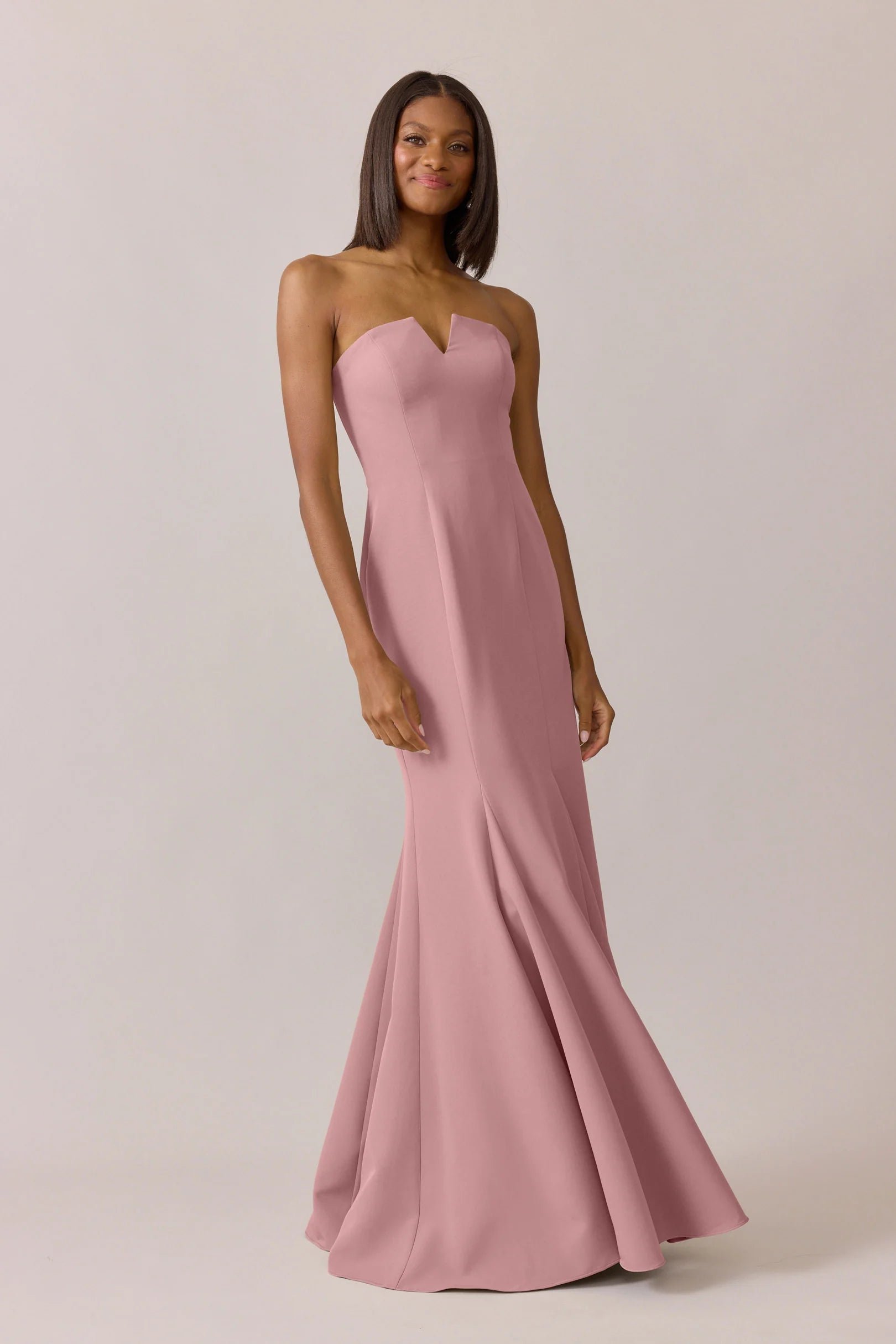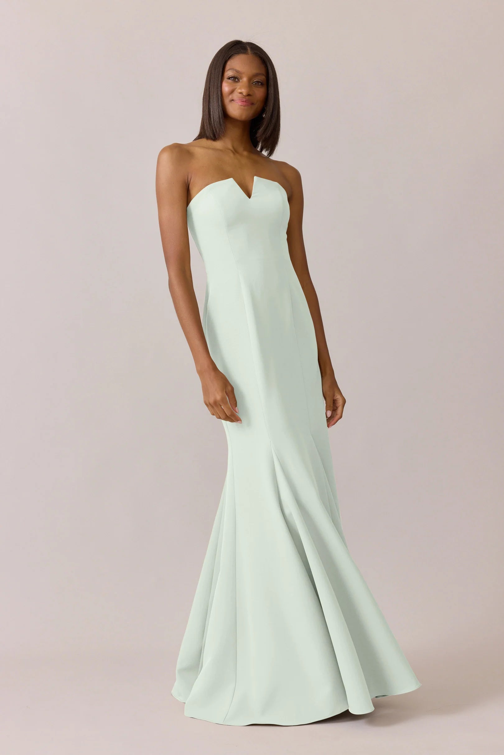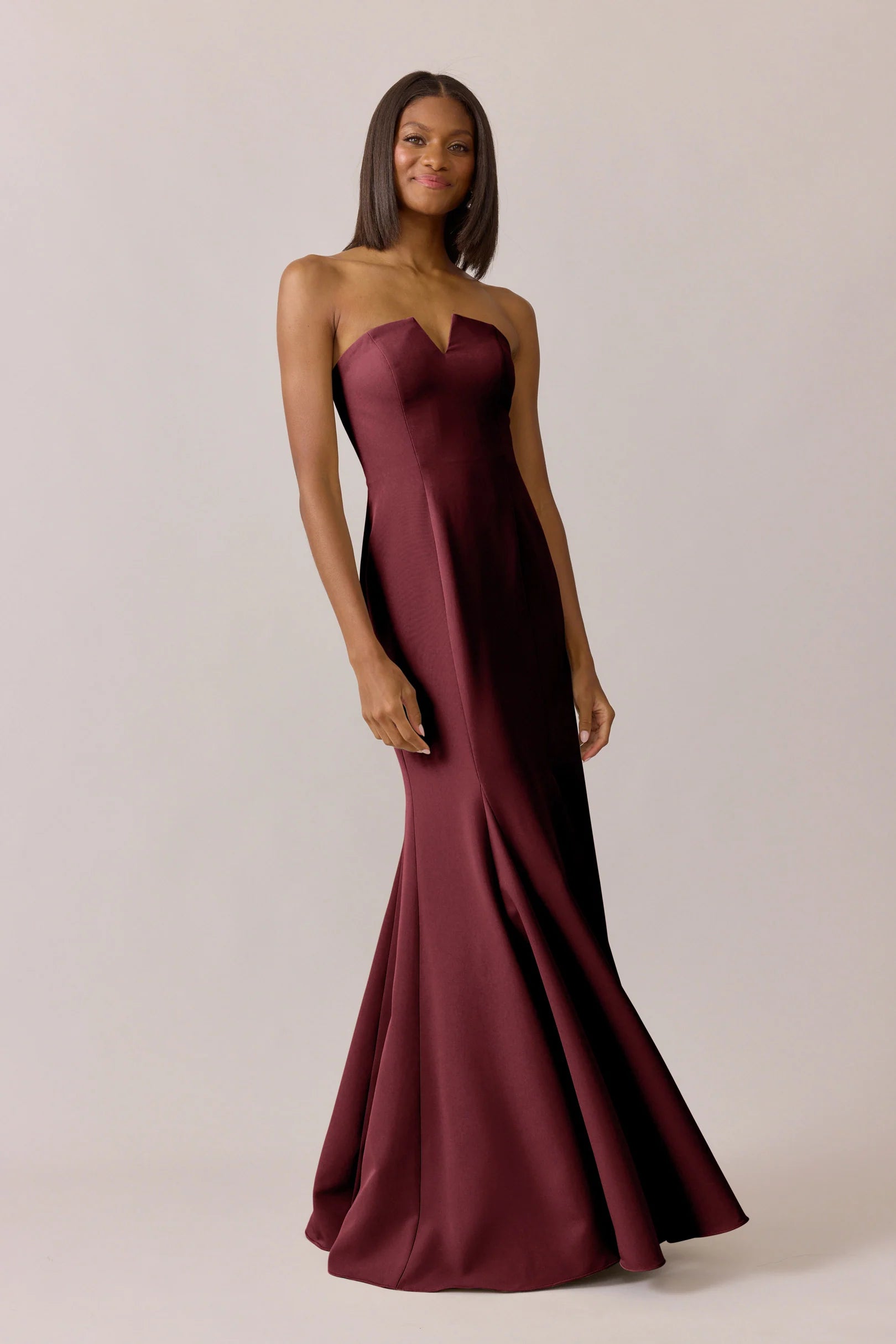 Understated, sculpted, and so refined. The Estelle Crepe Dress stuns with a sleek mermaid silhouette, strapless V-notch neckline, and a flowing godet pleated skirt that adds just the right amount of drama—without a slit. Built-in cups and boning keep things supported, while the full-length double lining ensures smooth, confident wear from ceremony to celebration.