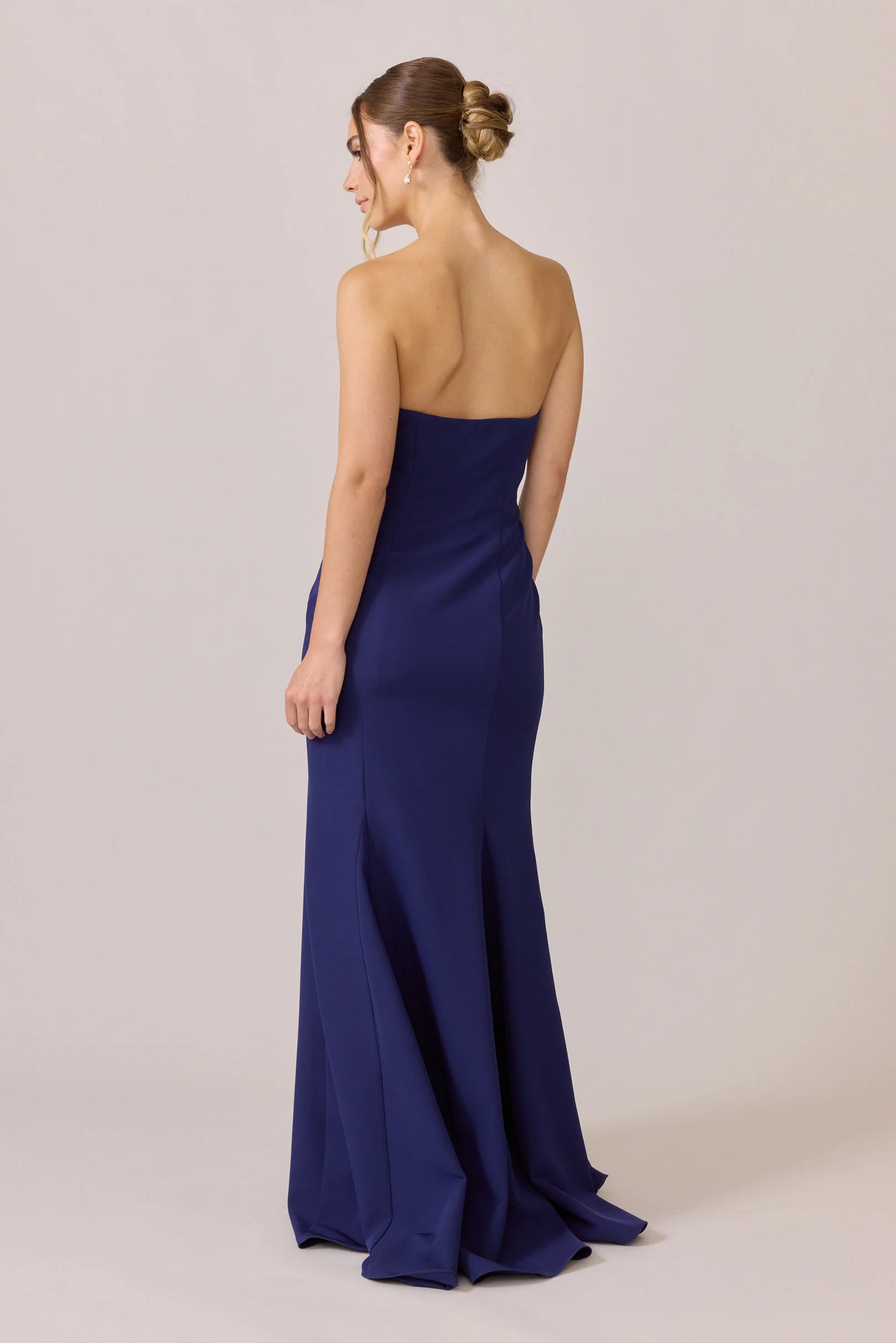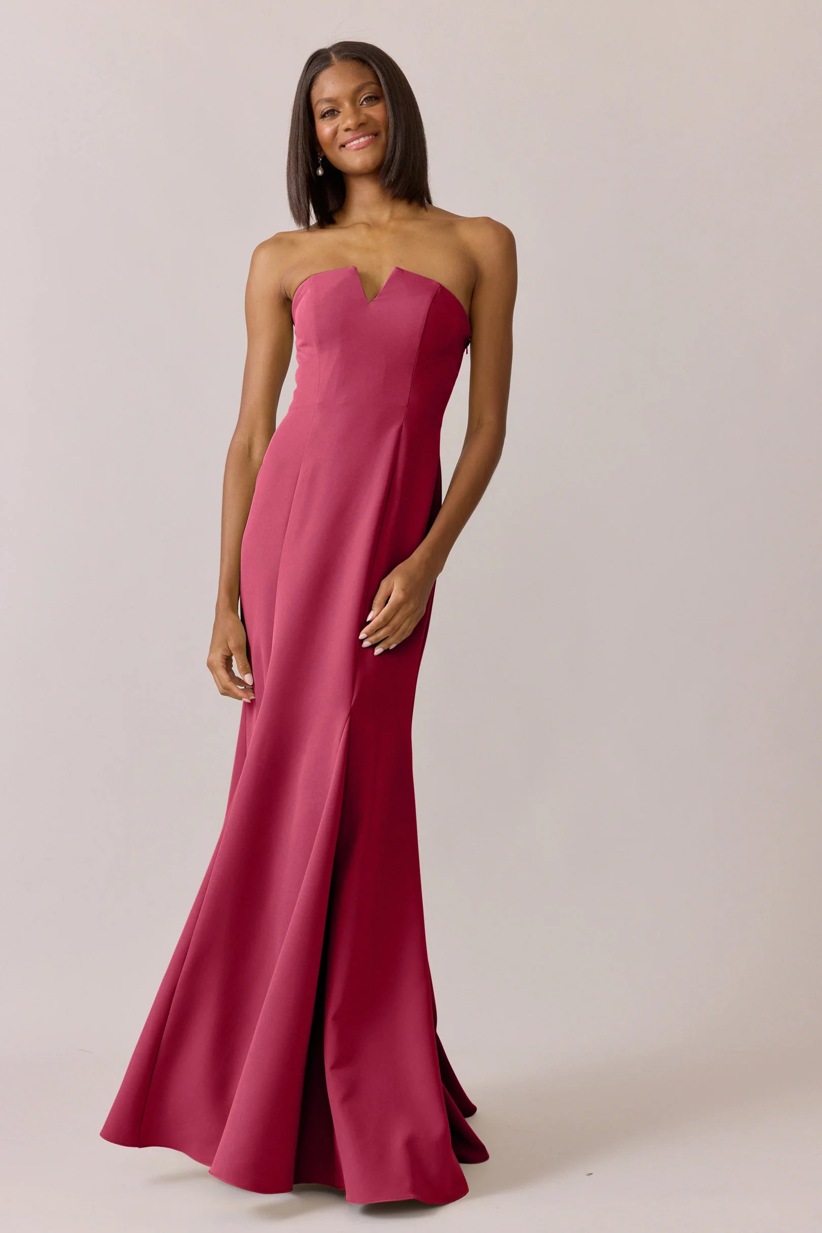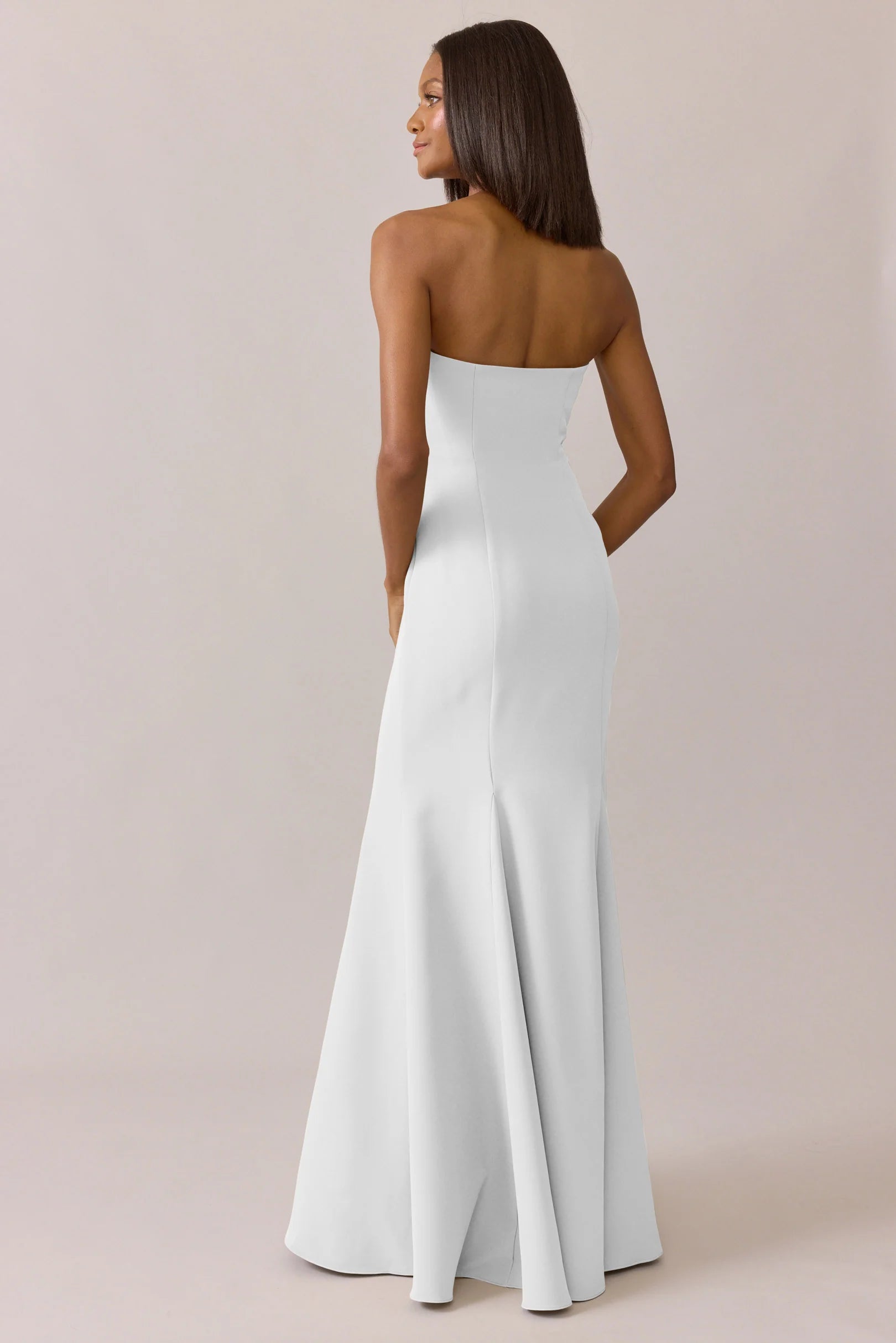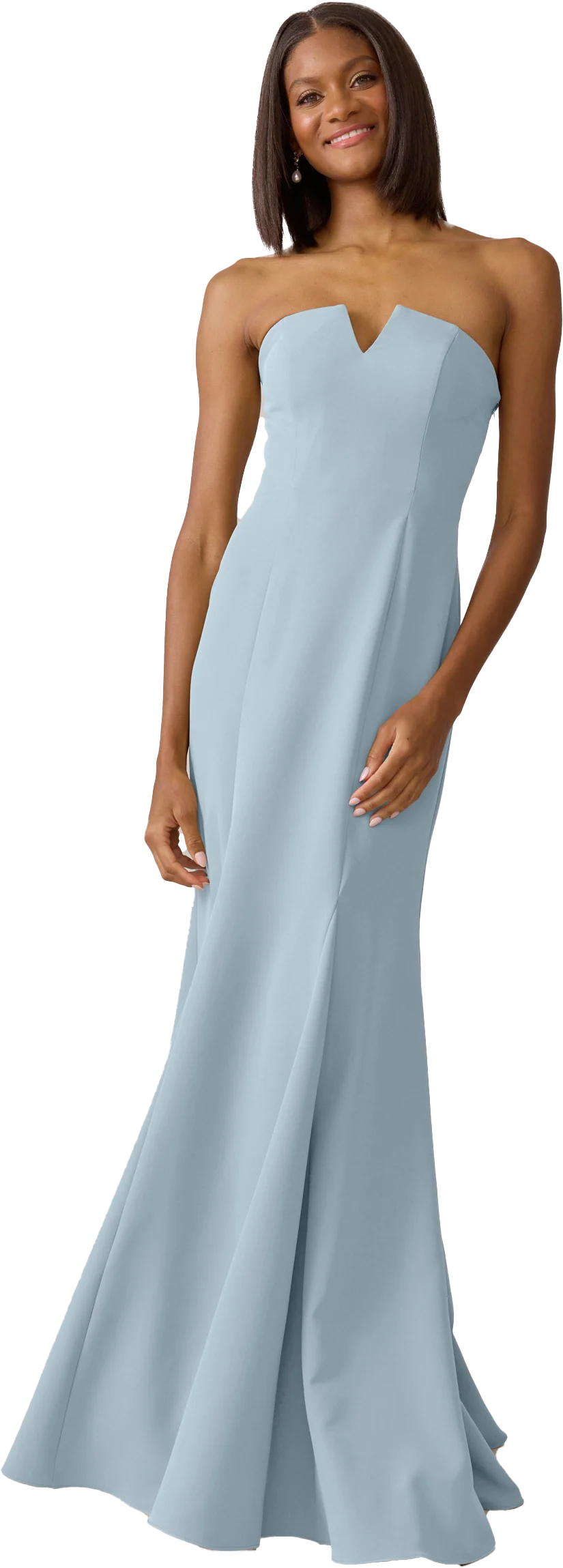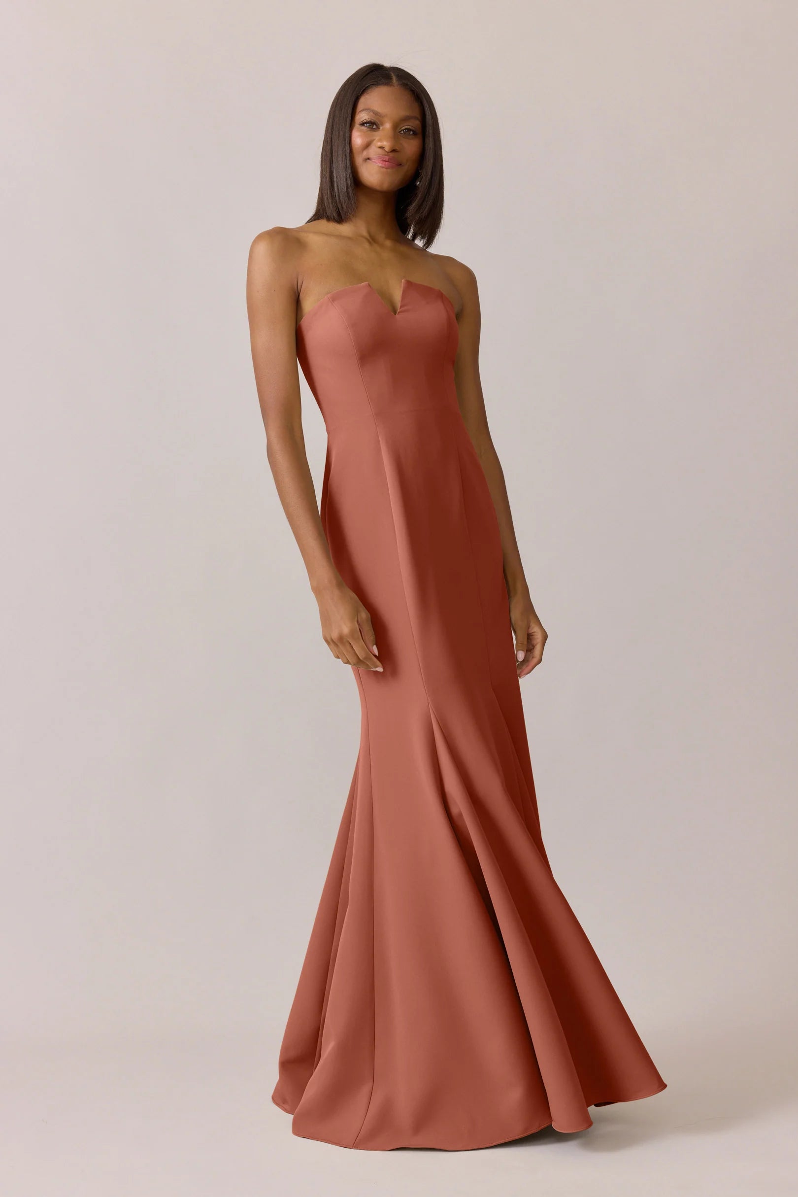 Understated, sculpted, and so refined. The Estelle Crepe Dress stuns with a sleek mermaid silhouette, strapless V-notch neckline, and a flowing godet pleated skirt that adds just the right amount of drama—without a slit. Built-in cups and boning keep things supported, while the full-length double lining ensures smooth, confident wear from ceremony to celebration.