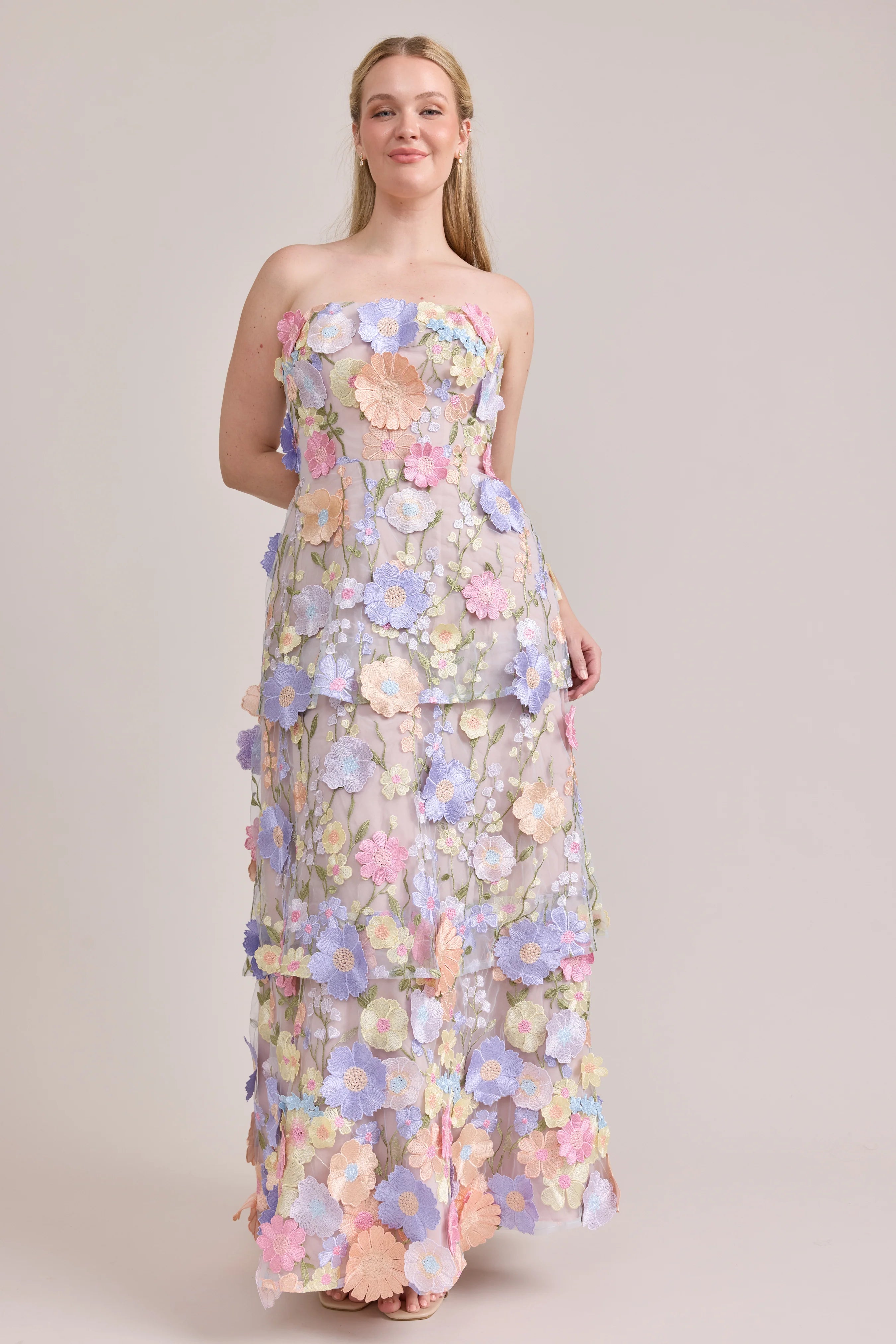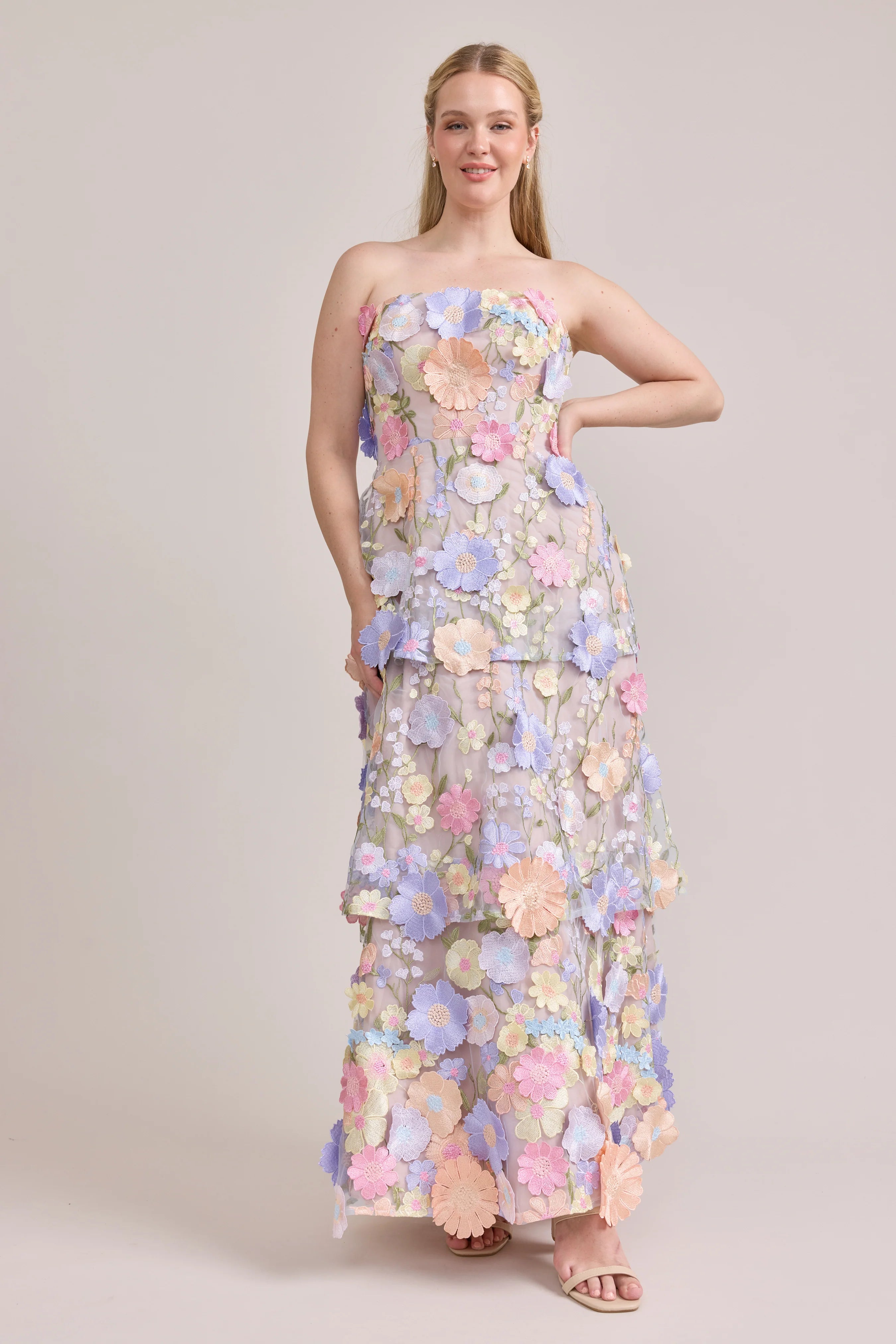 Introducing Flora, thoughtfully designed from our new three dimensional Floral Appliqué fabric, she is a must have addition to any garden or maximalist wedding party! Flora features a straight strapless neckline, 3 tiers of flowing florals, and a lace-up back, offering a supportive and flattering fit for all.