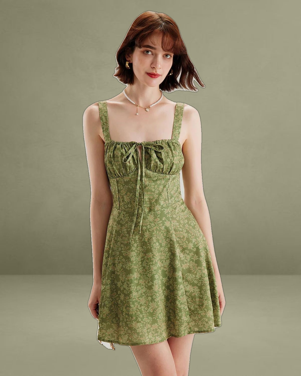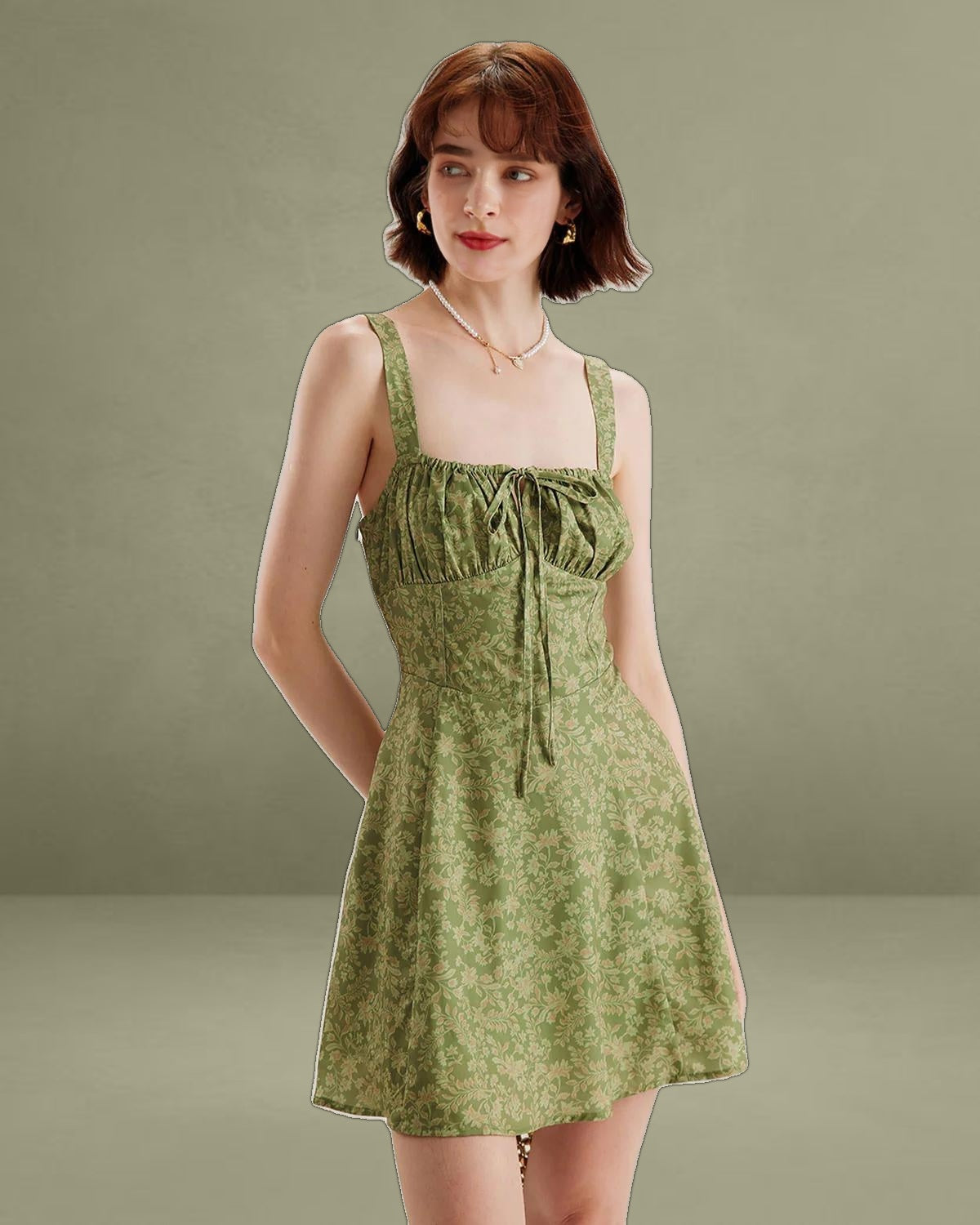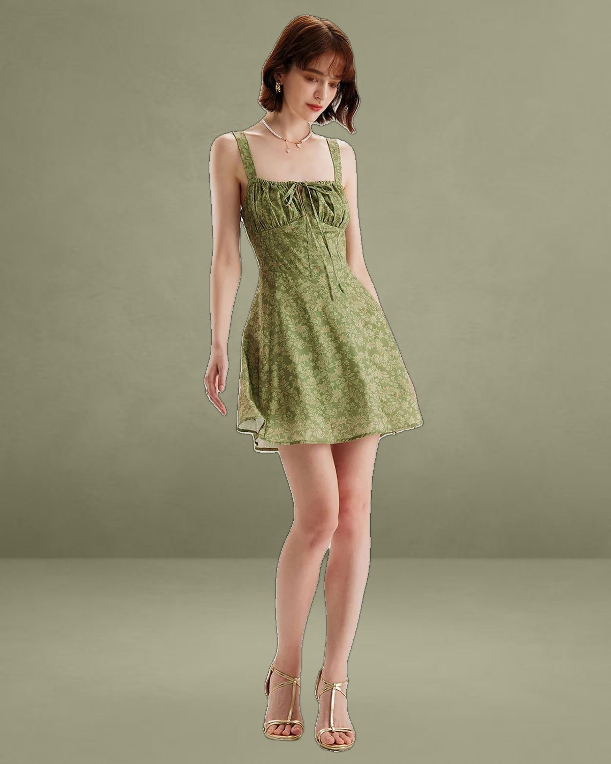 This floral mini dress is crafted from polyester, an artificial fiber known for its soft feel, lustrous appearance, and quick-drying properties. It is also durable, resistant to wrinkles, stains, and sunlight.