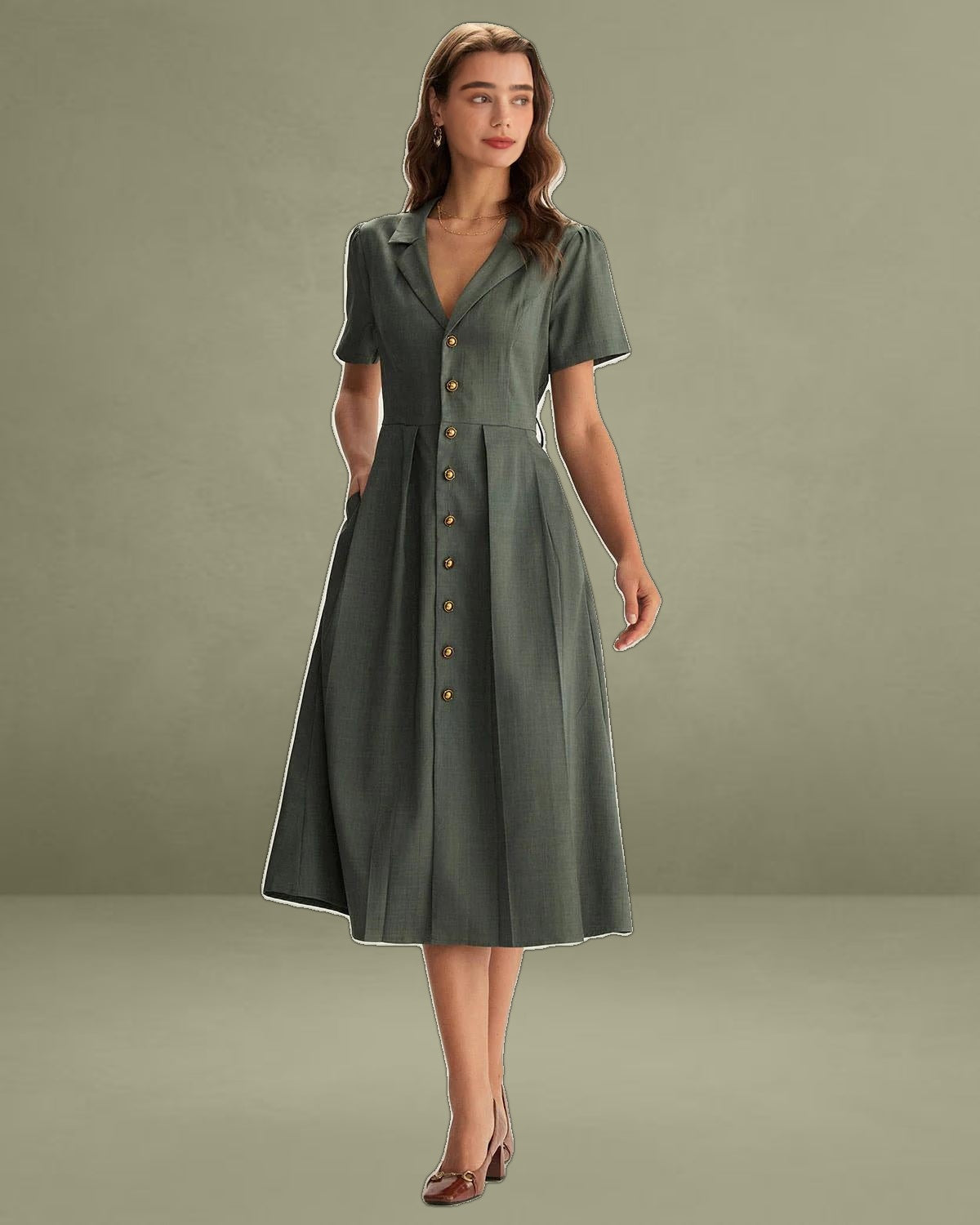 This timeless piece features a flattering V-neckline and delicate pleats that add texture and movement, while the button-down front brings a classic, sophisticated touch. The midi length offers versatile styling options—perfect for both casual outings and special occasions.