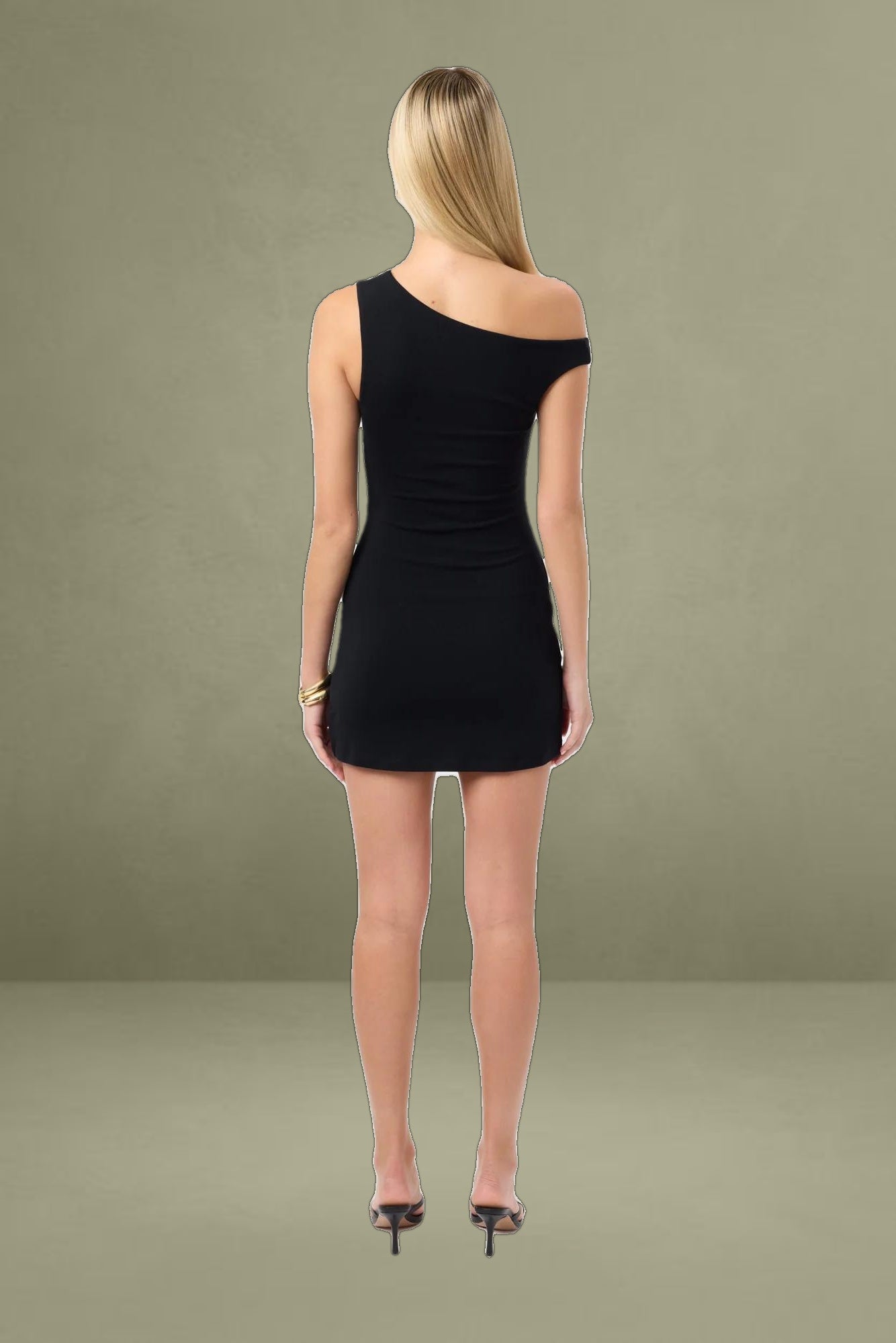 Stun the room in our much loved Greta silhouette. Crafted from our soft cotton Pima fabrication, this mini silhouette features an off-the-shoulder neckline and rouched strap. The striking style boasts a slashed neckline and ruched detailing that falls into an asymmetrical hemline.