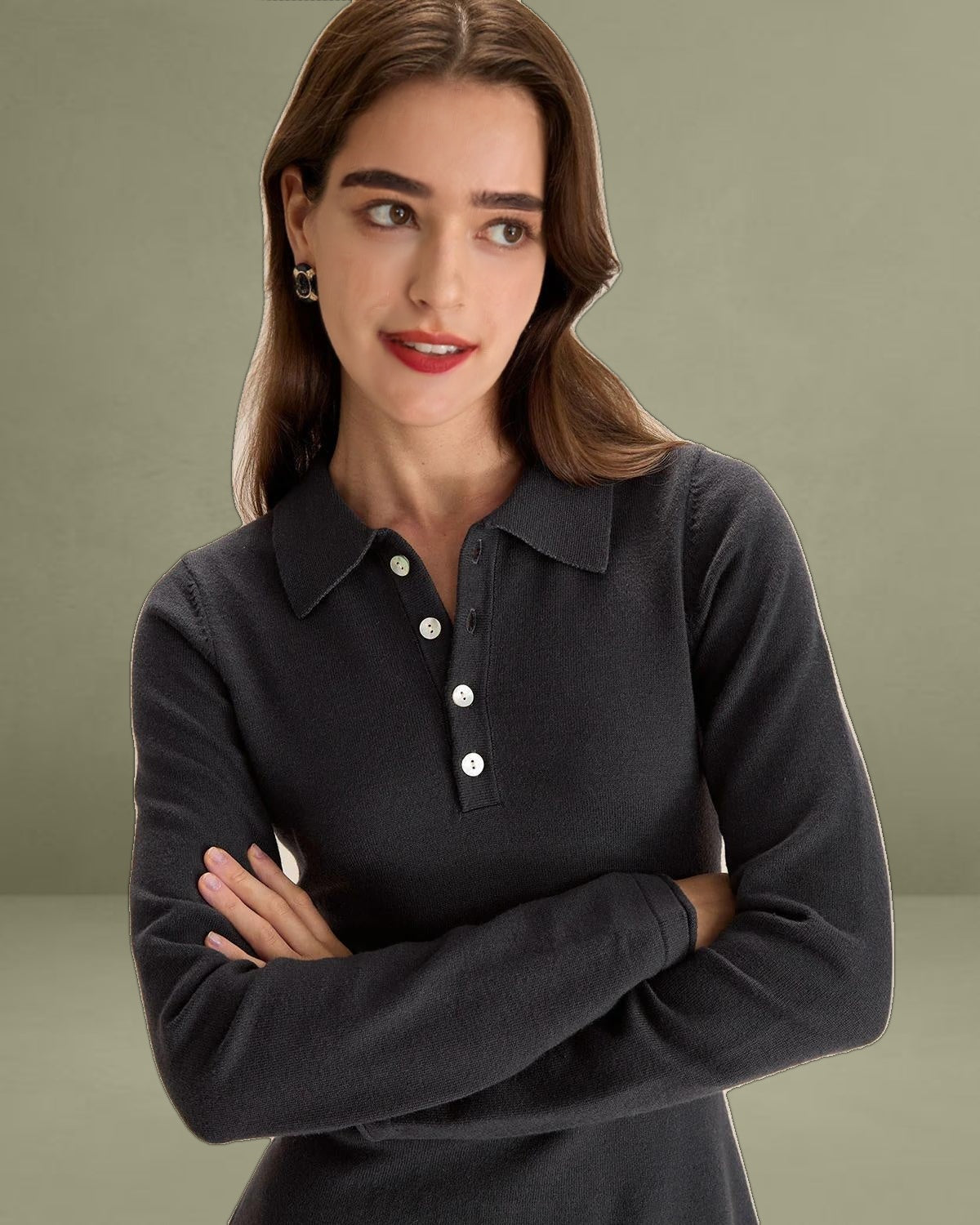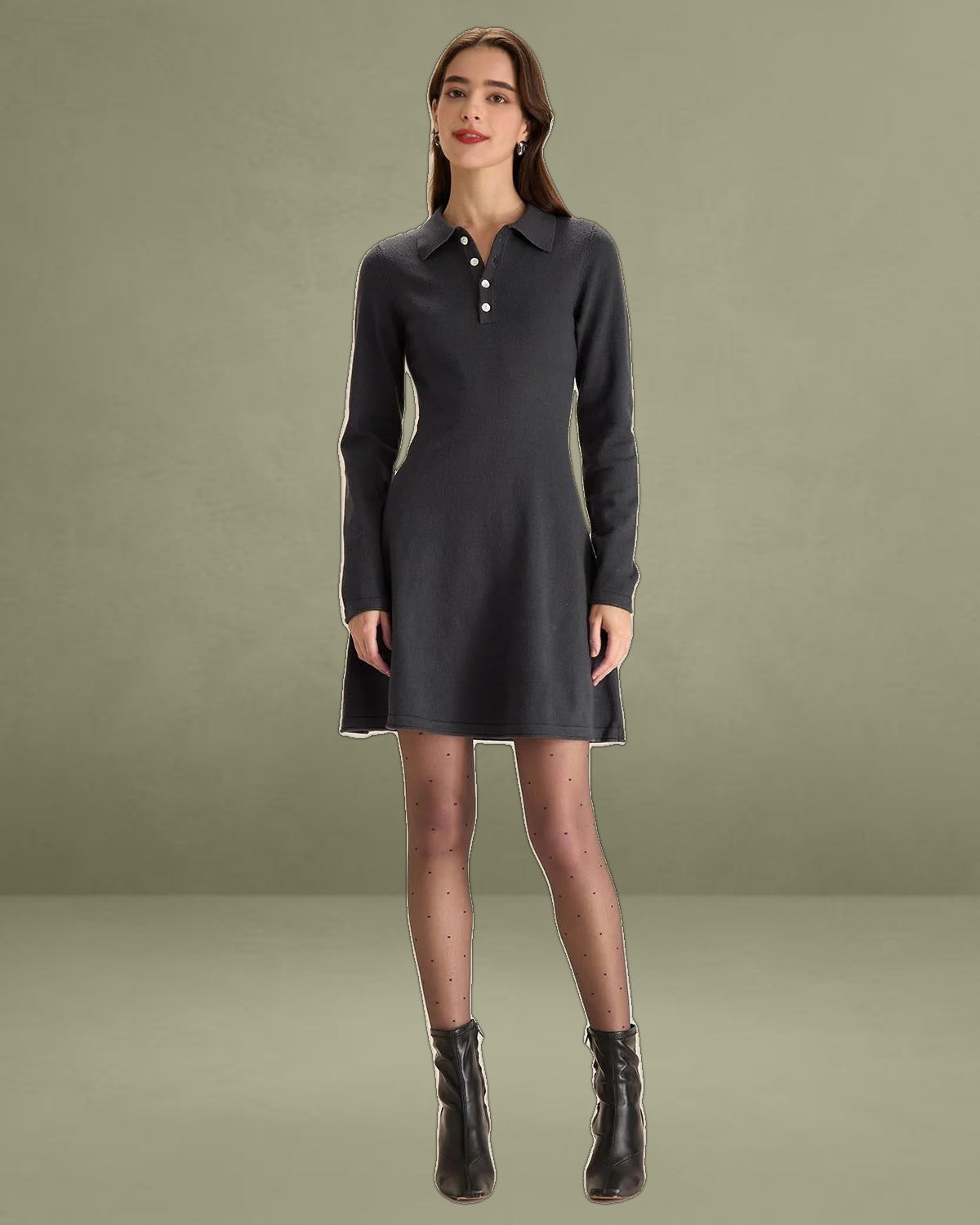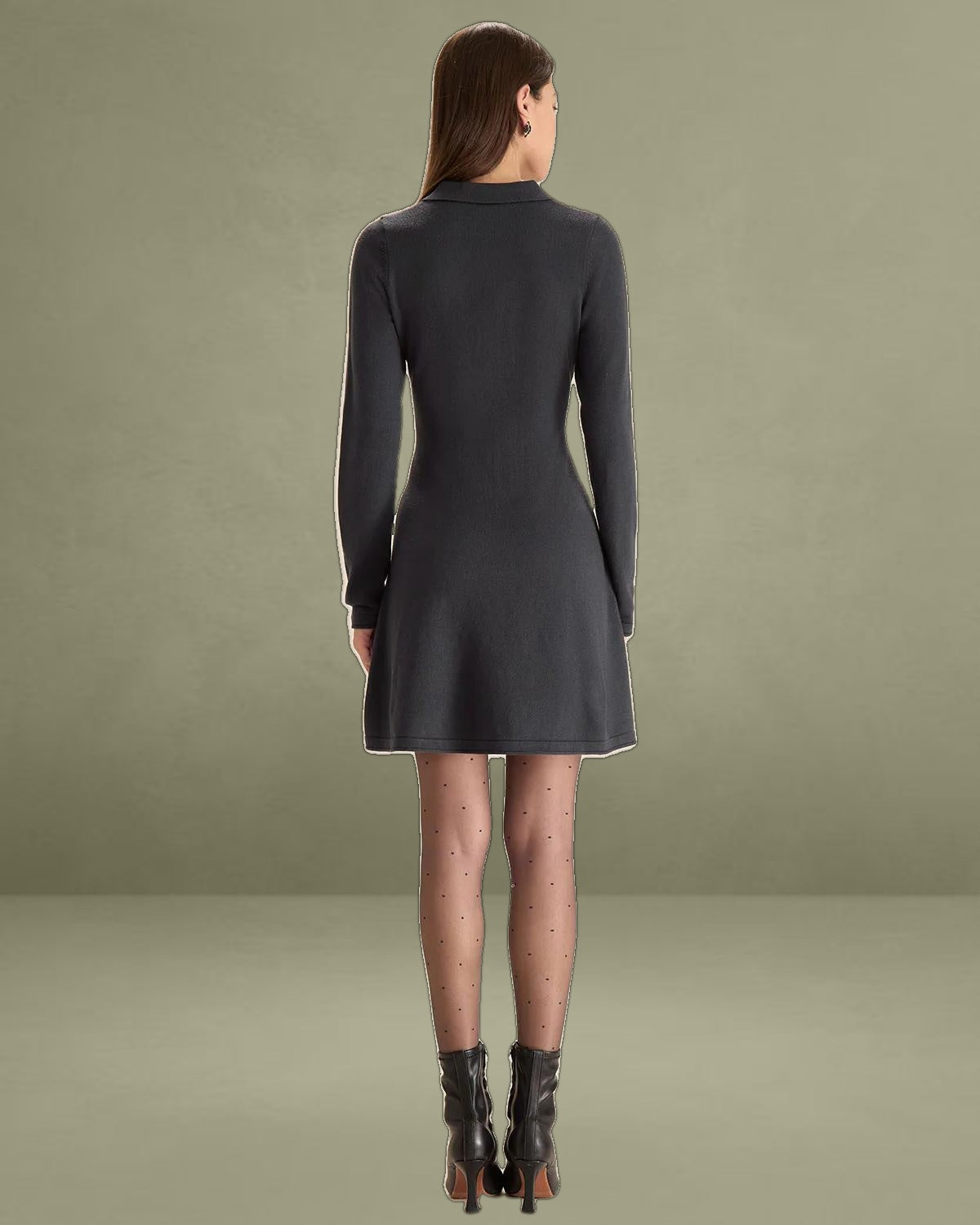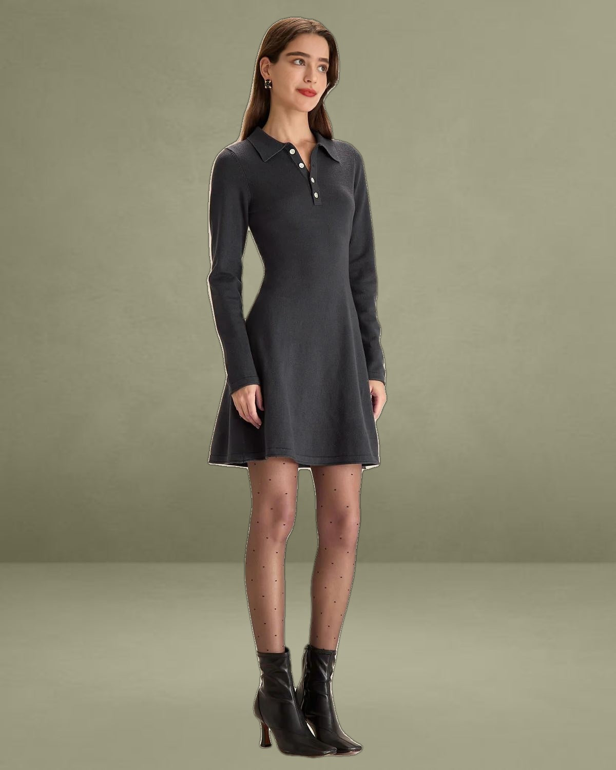 Crafted from soft, stretchy knit fabric, it features a flattering pleated skirt that adds movement and charm to the design. The fitted bodice, long sleeves, and ribbed details create a streamlined silhouette, perfect for cooler days.