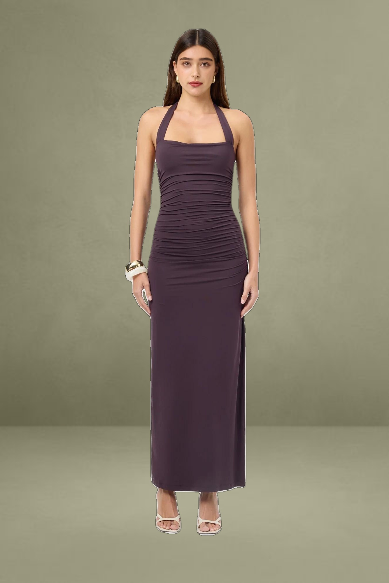 Experience luxury in this halter neck dress. Featuring a halter neckline and rouched details, it's designed to enhance and shape your figure. Made from stretchy polyamide, it combines style with great comfort. The maxi length and slim fit make it suitable for any event.