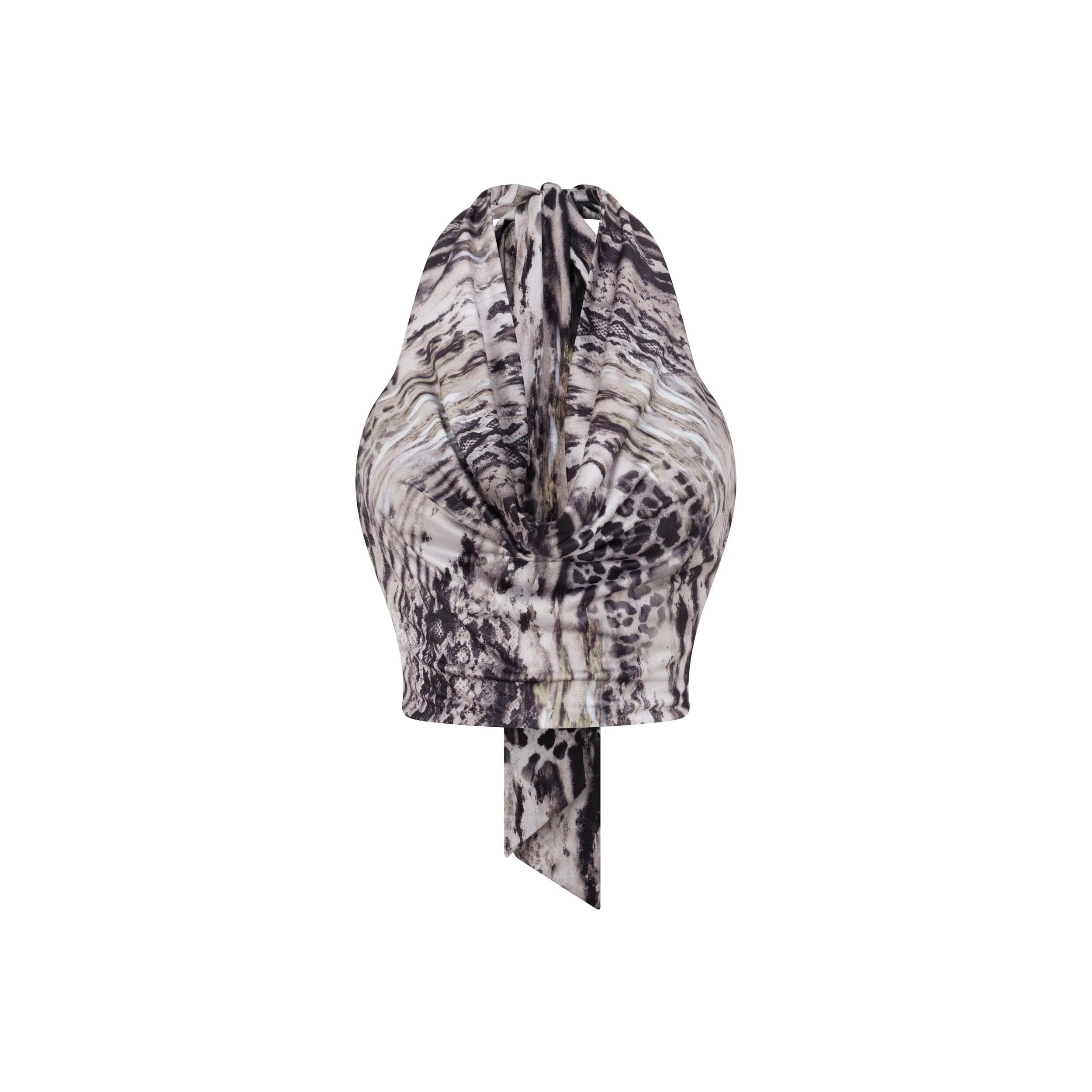 Crafted from printed jersey fabrication, our Illie Top features a flattering cowl neckline, designed with a low open back for a chic look. She has a wrap-around scarf neck detail and adjustable multi-tie straps. Our Illie top allows you to customise the fit to your desire.