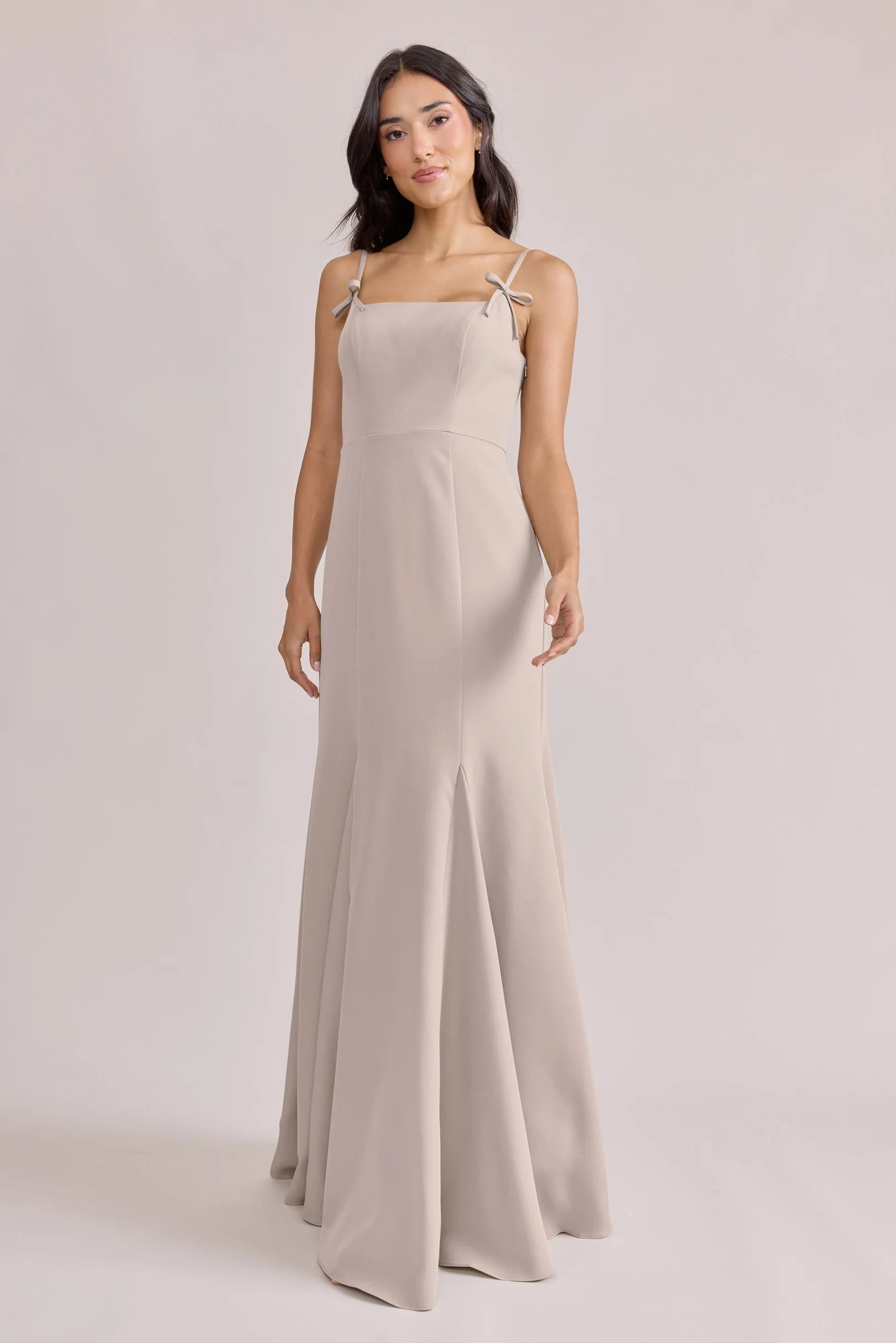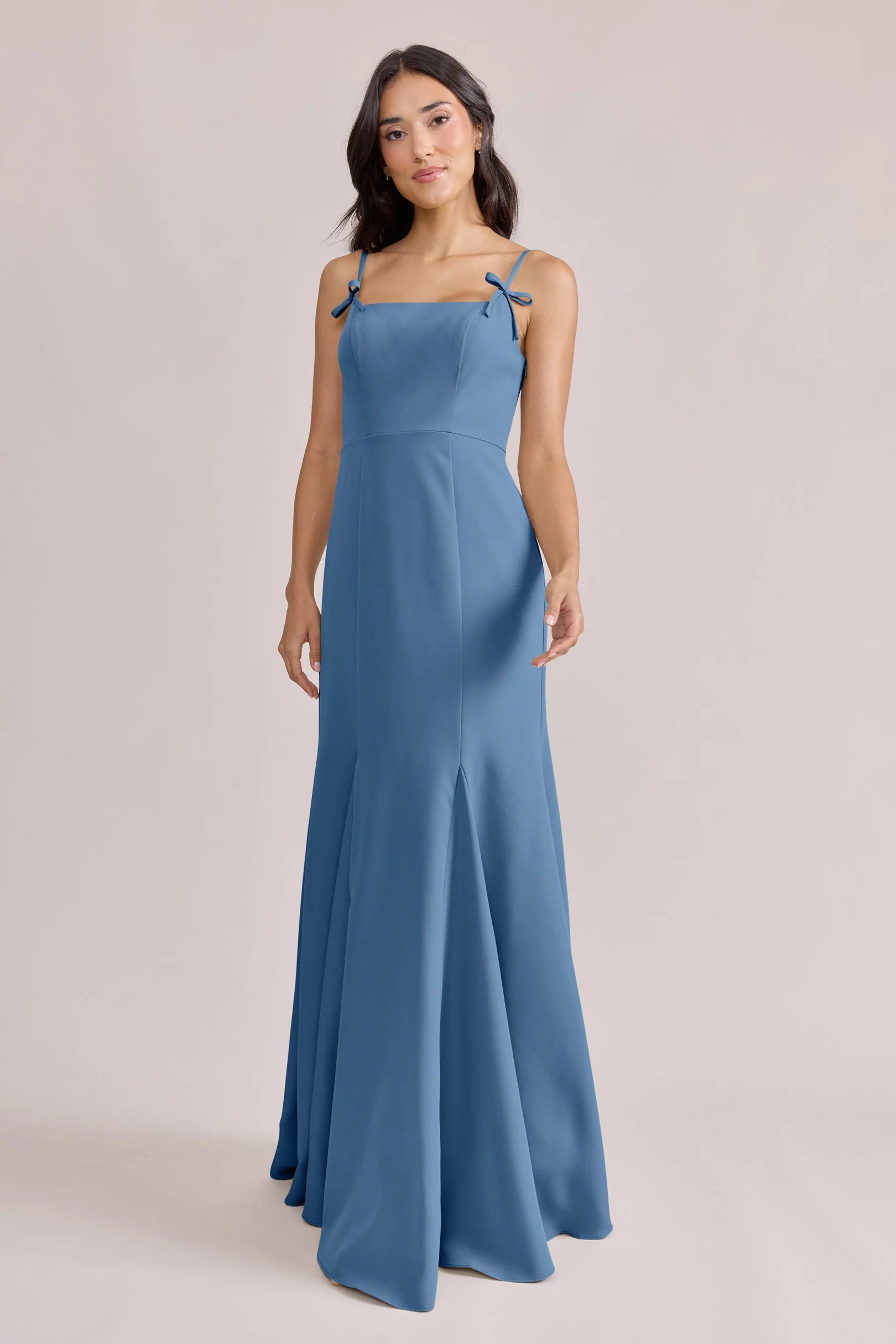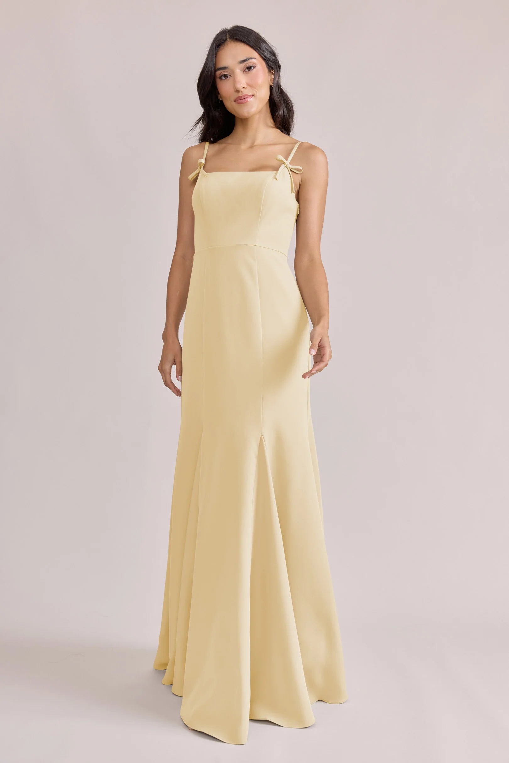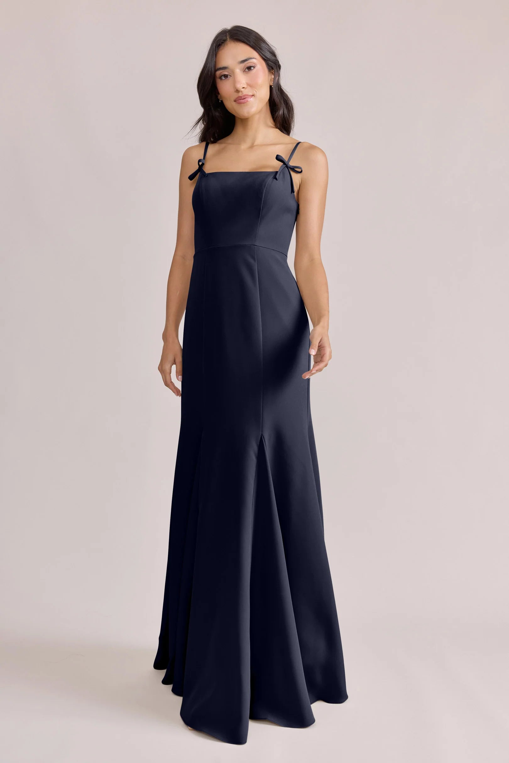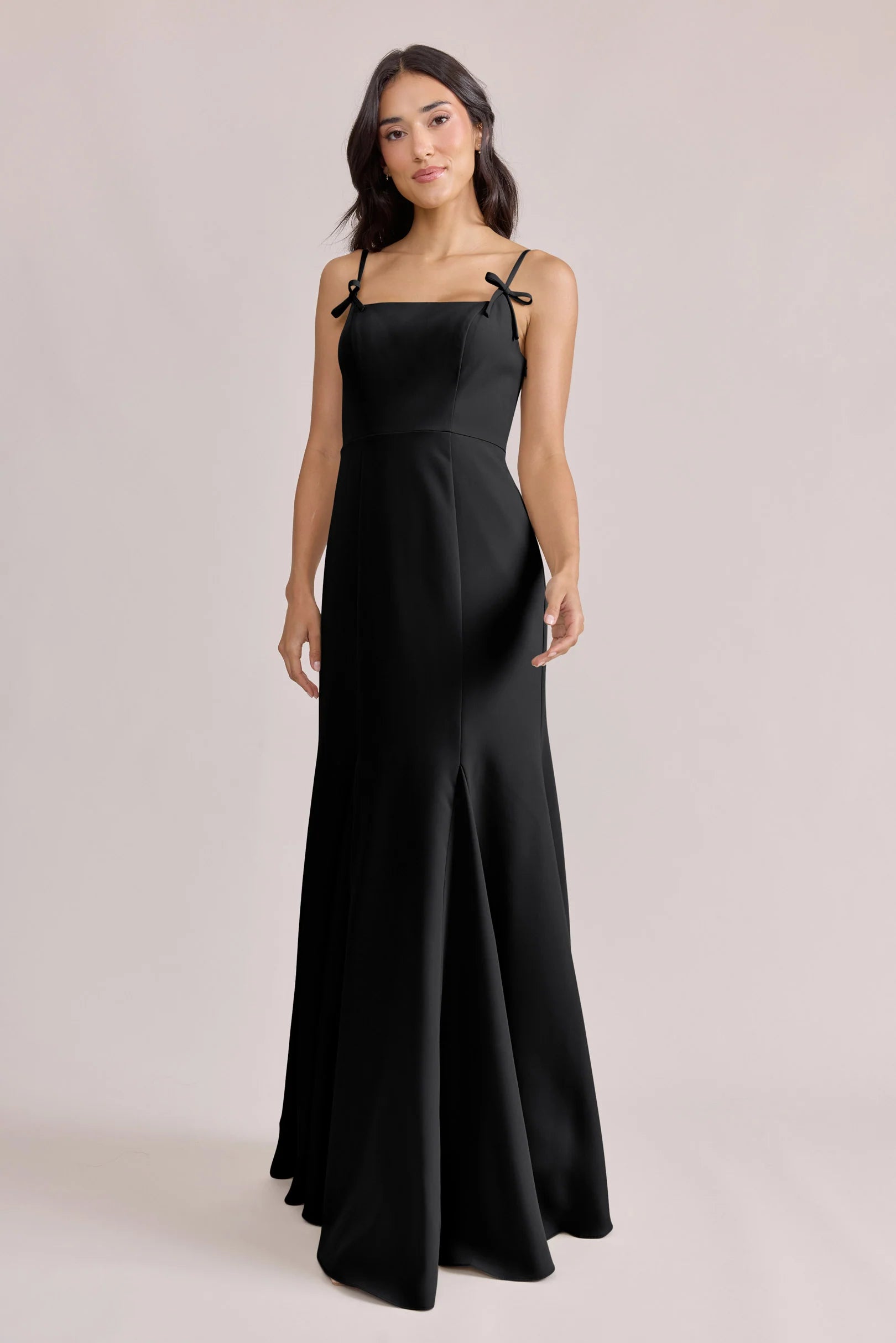 A stunning square neckline, the Jolie is the epitome of chic. The Jolie Crepe dress features a crepe bow that rests on each strap, fitted silhouette, low back, finished with a flowing godet skirt. Pair with our Colette Crepe dress for a charming line-up!