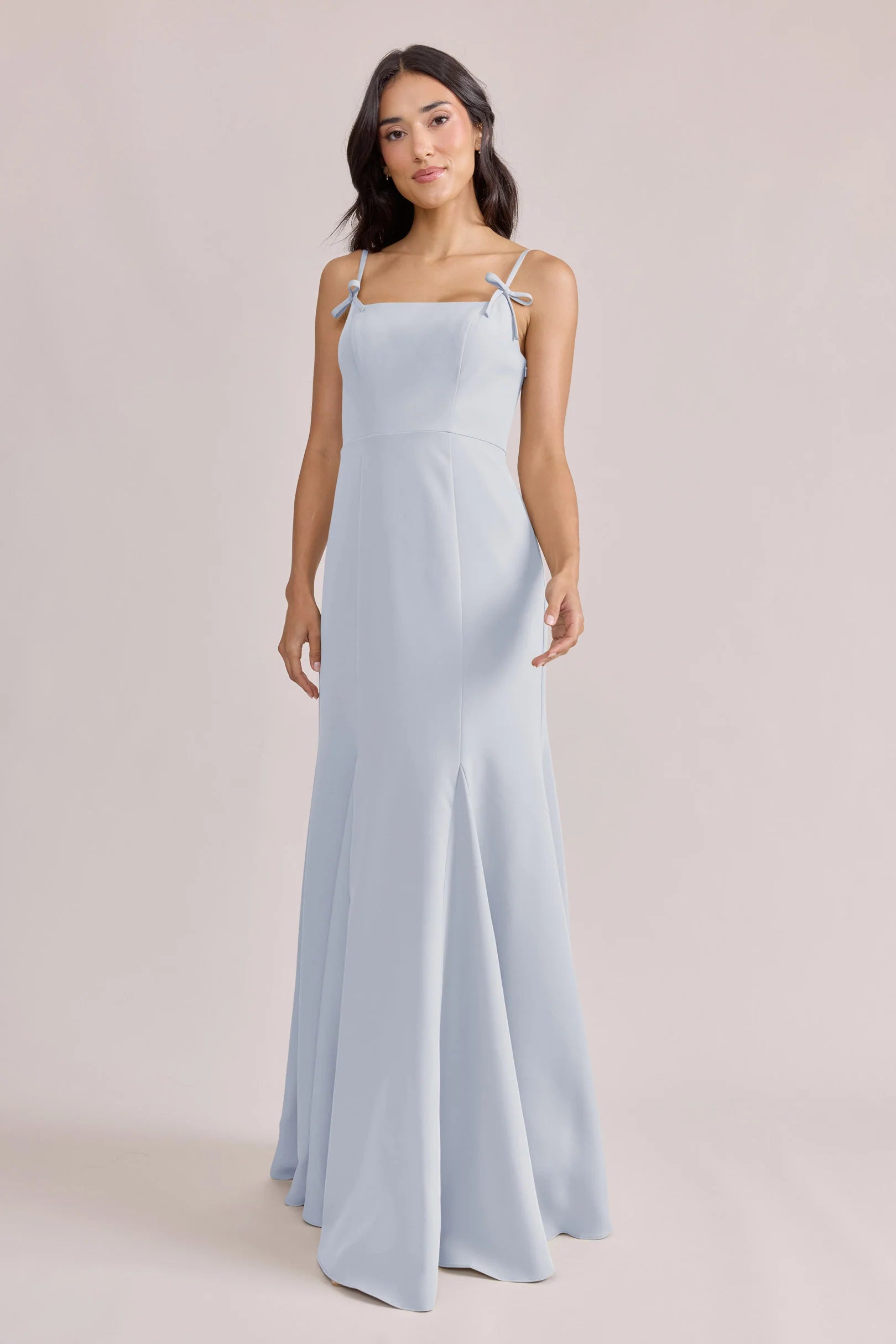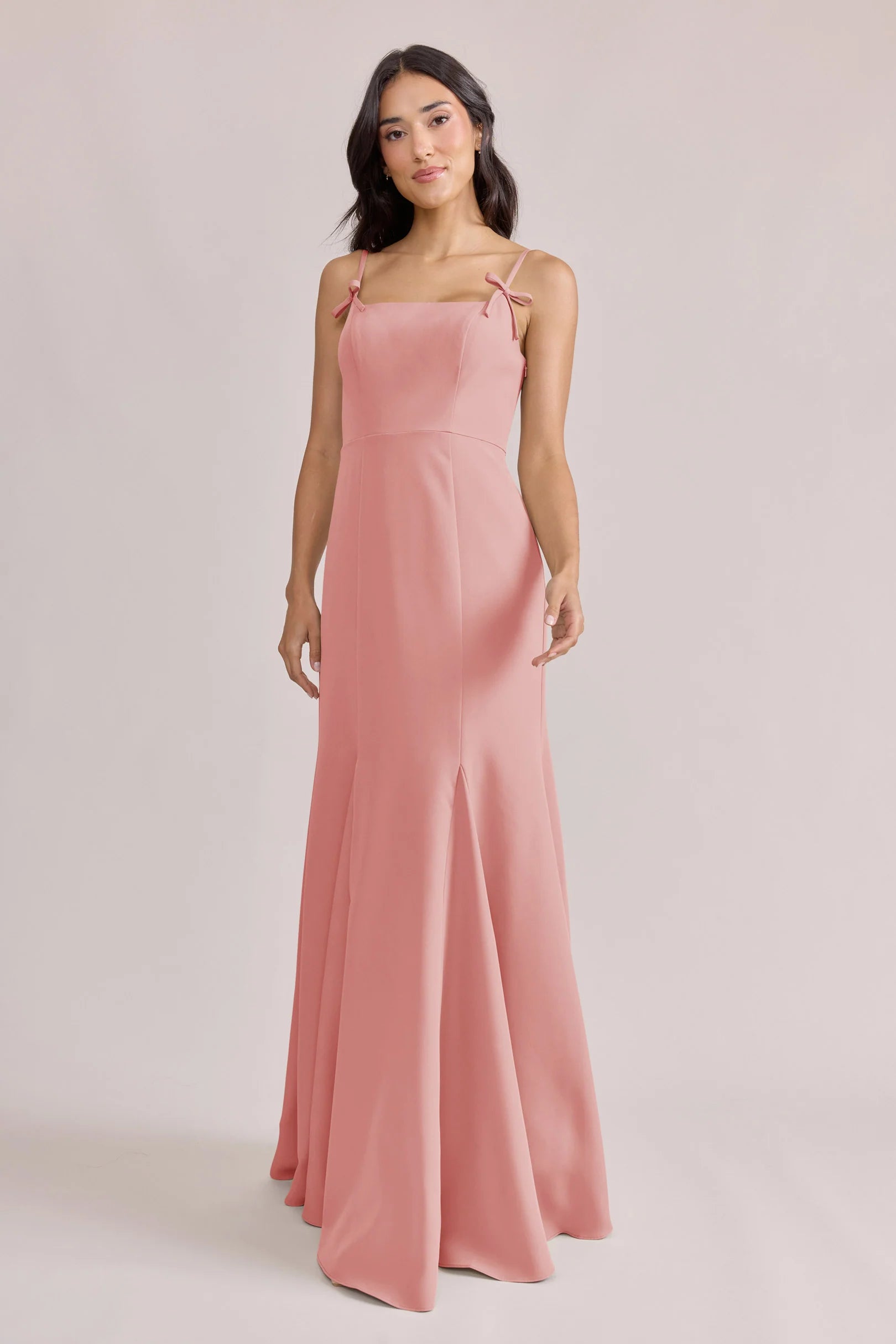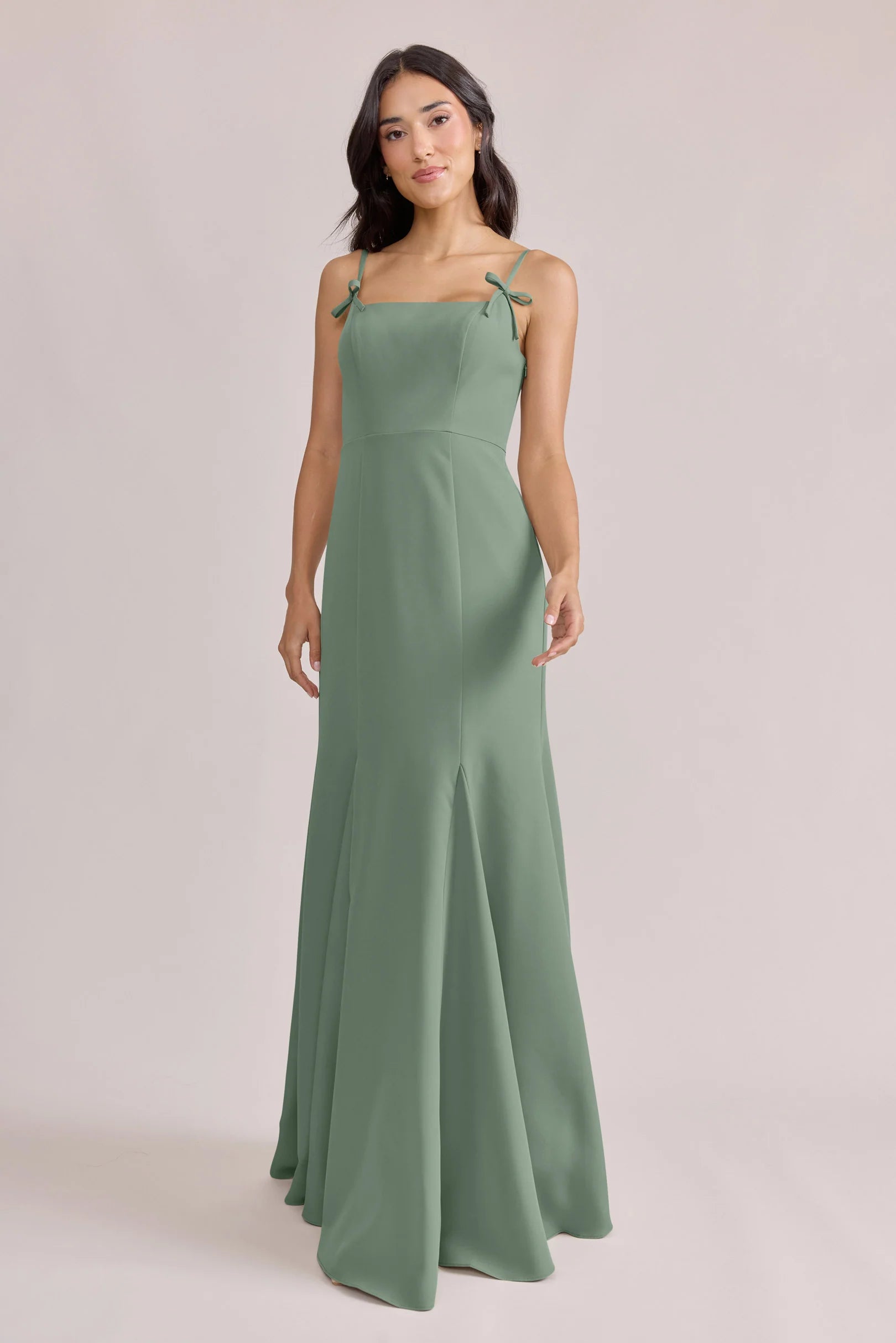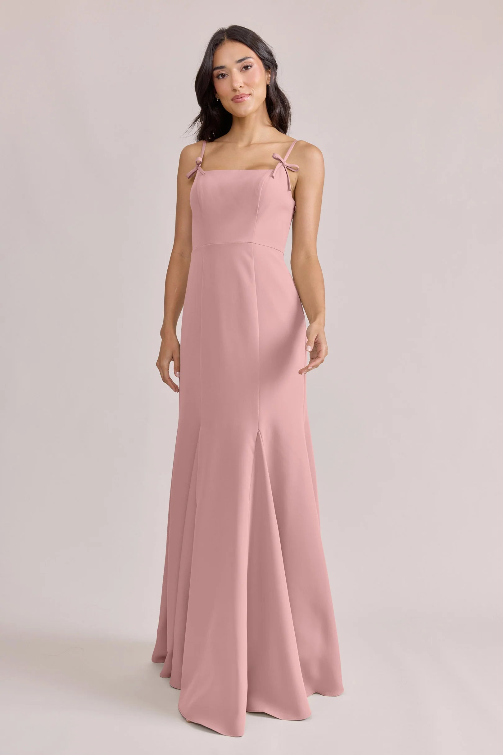 A stunning square neckline, the Jolie is the epitome of chic. The Jolie Crepe dress features a crepe bow that rests on each strap, fitted silhouette, low back, finished with a flowing godet skirt. Pair with our Colette Crepe dress for a charming line-up!