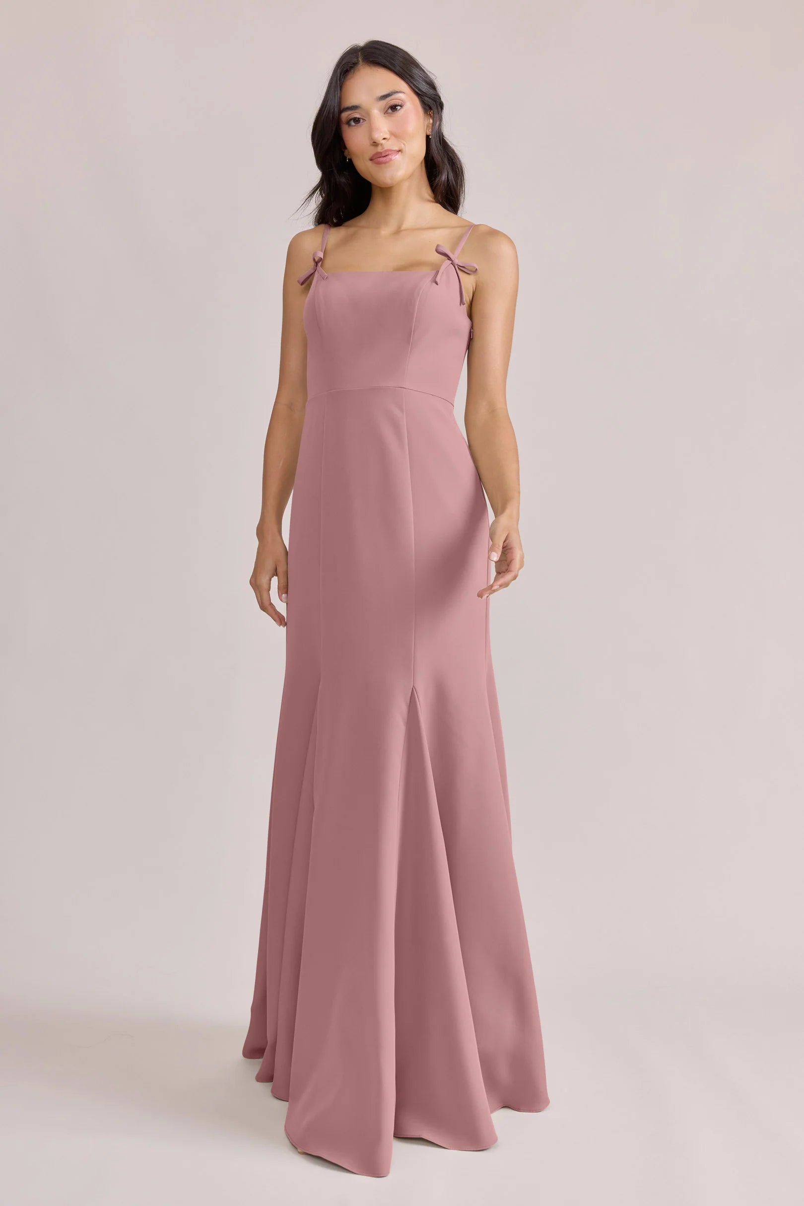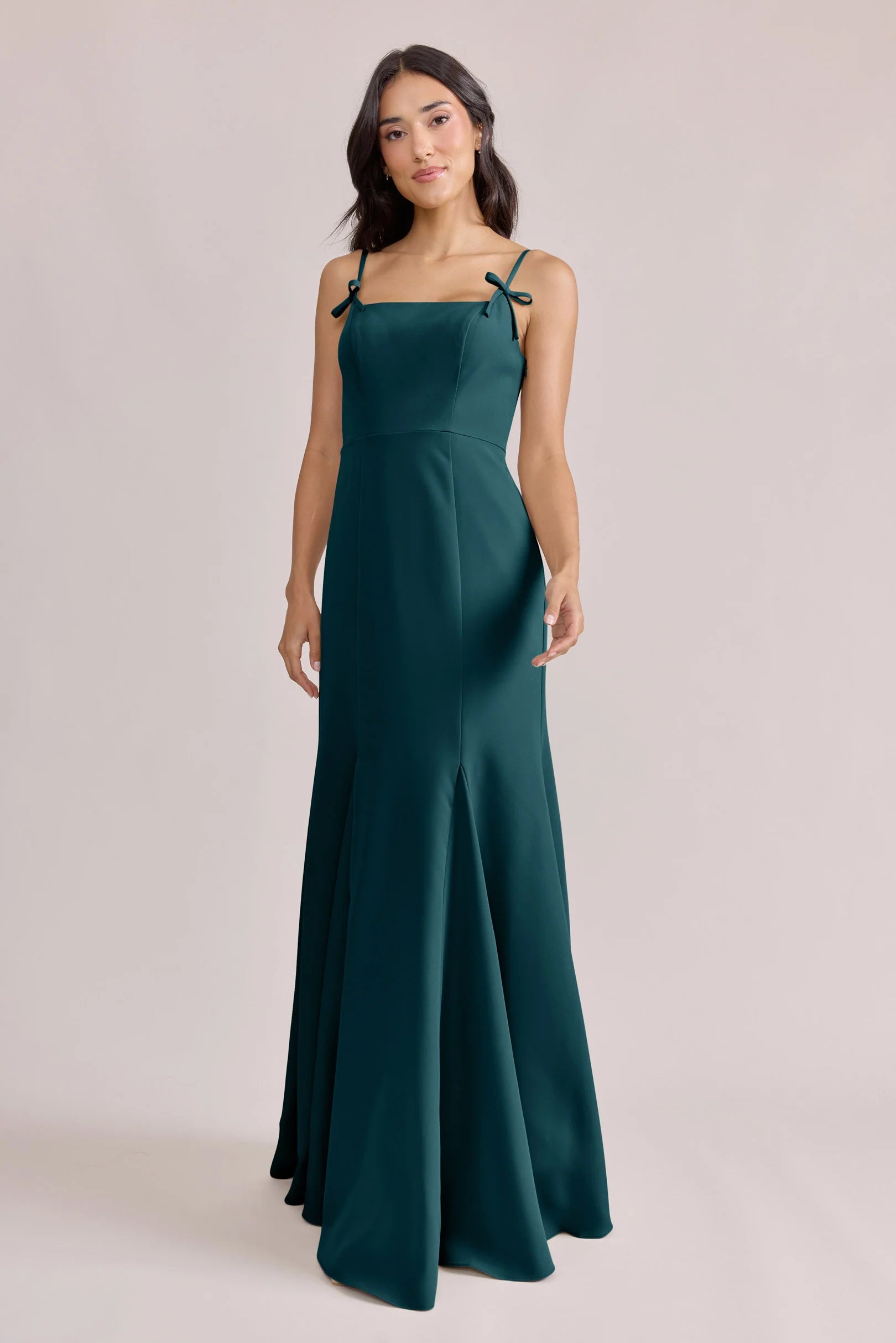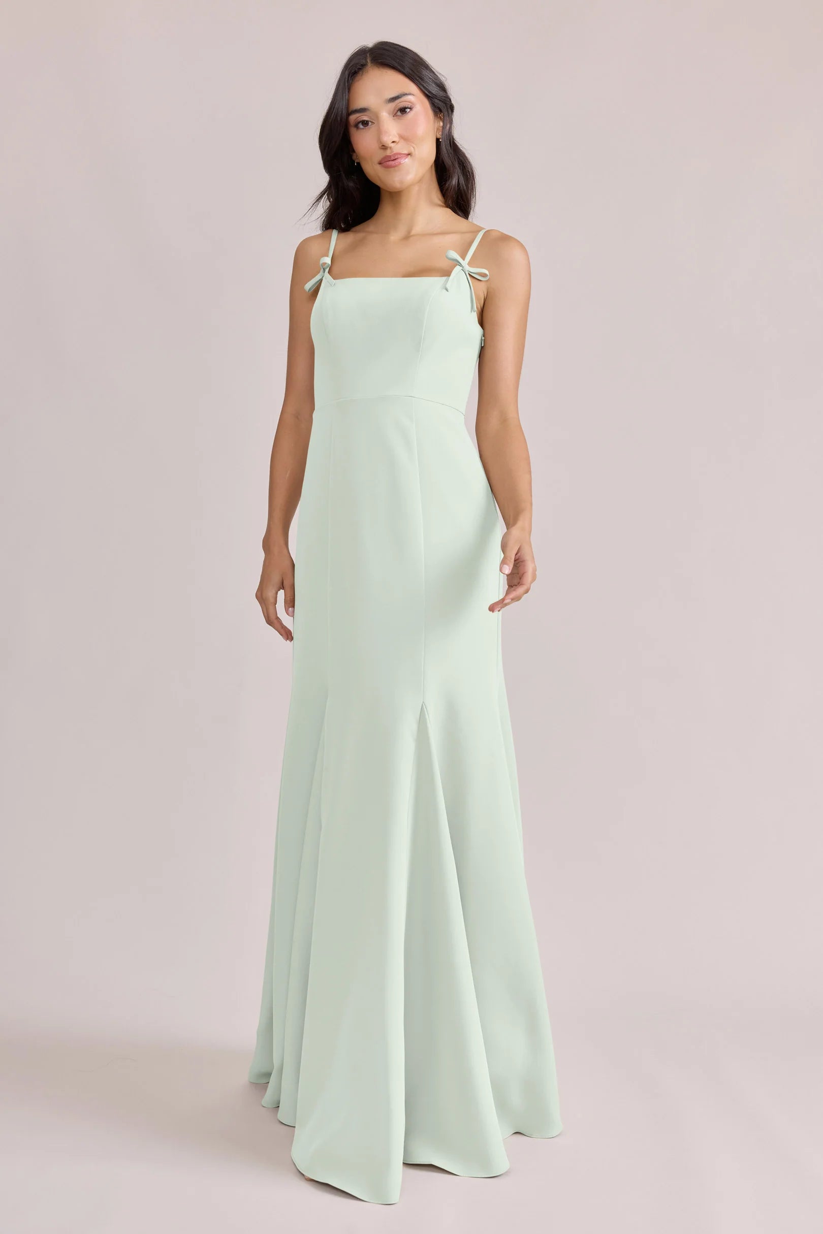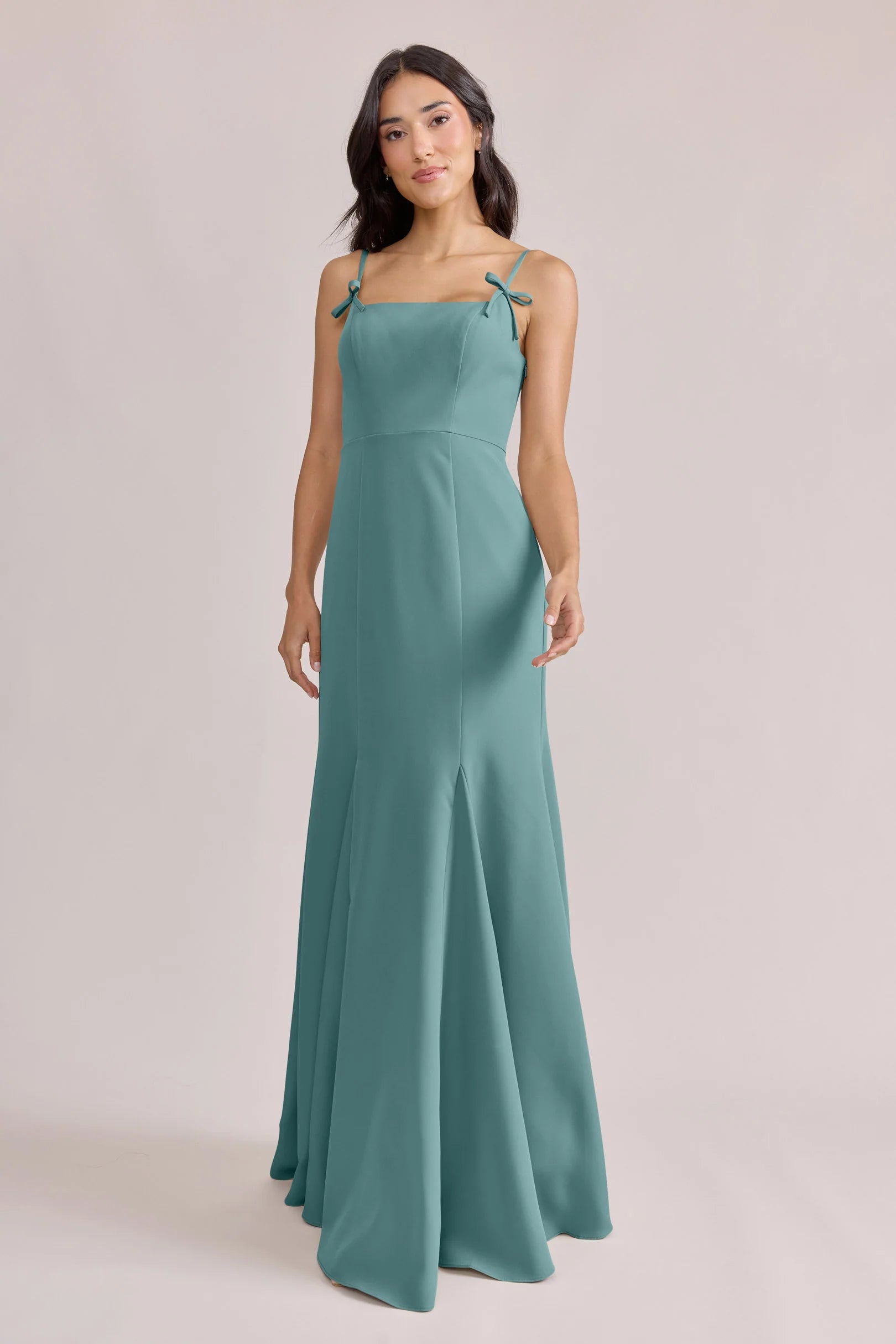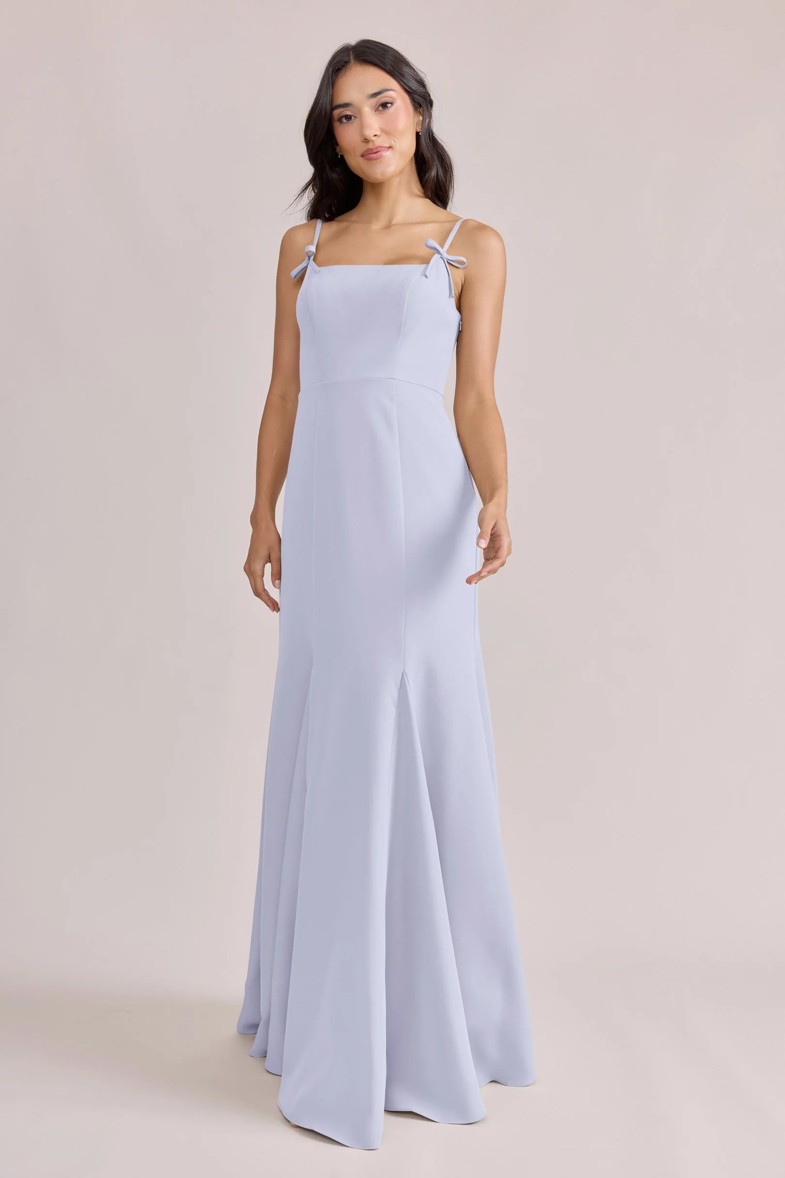 A stunning square neckline, the Jolie is the epitome of chic. The Jolie Crepe dress features a crepe bow that rests on each strap, fitted silhouette, low back, finished with a flowing godet skirt. Pair with our Colette Crepe dress for a charming line-up!