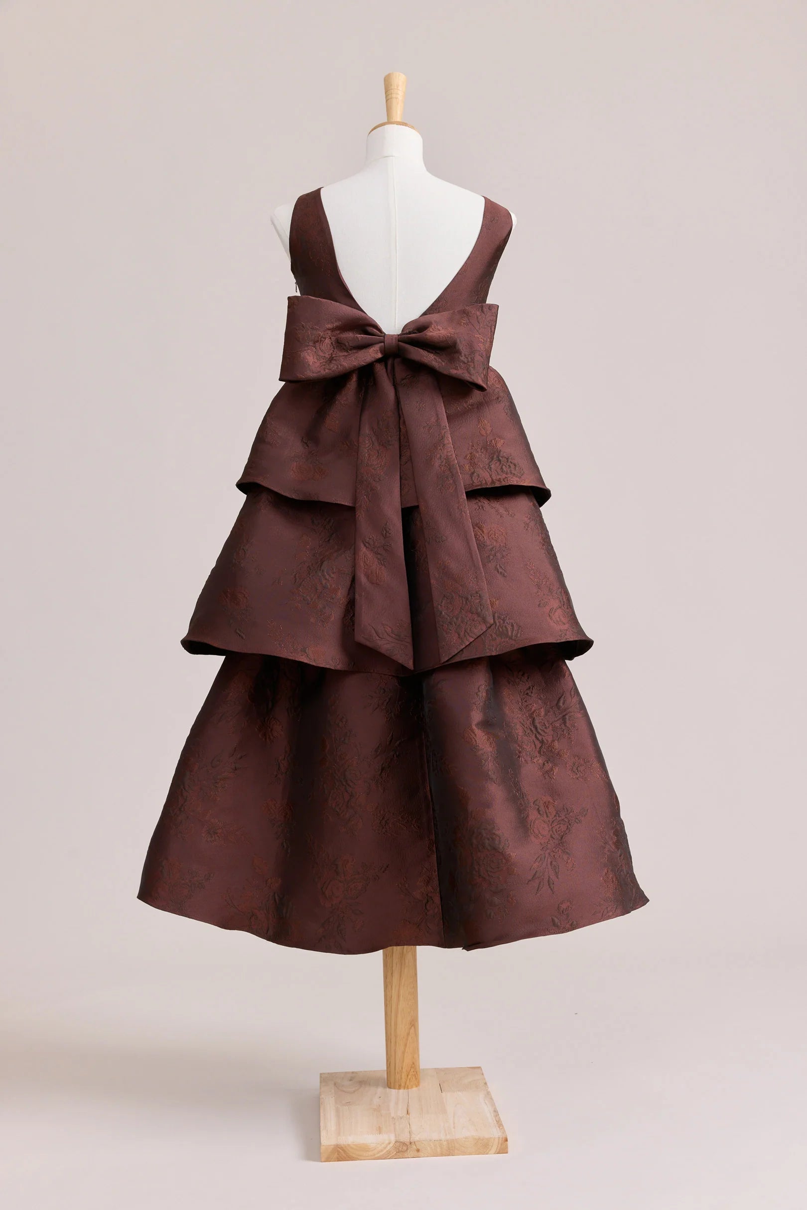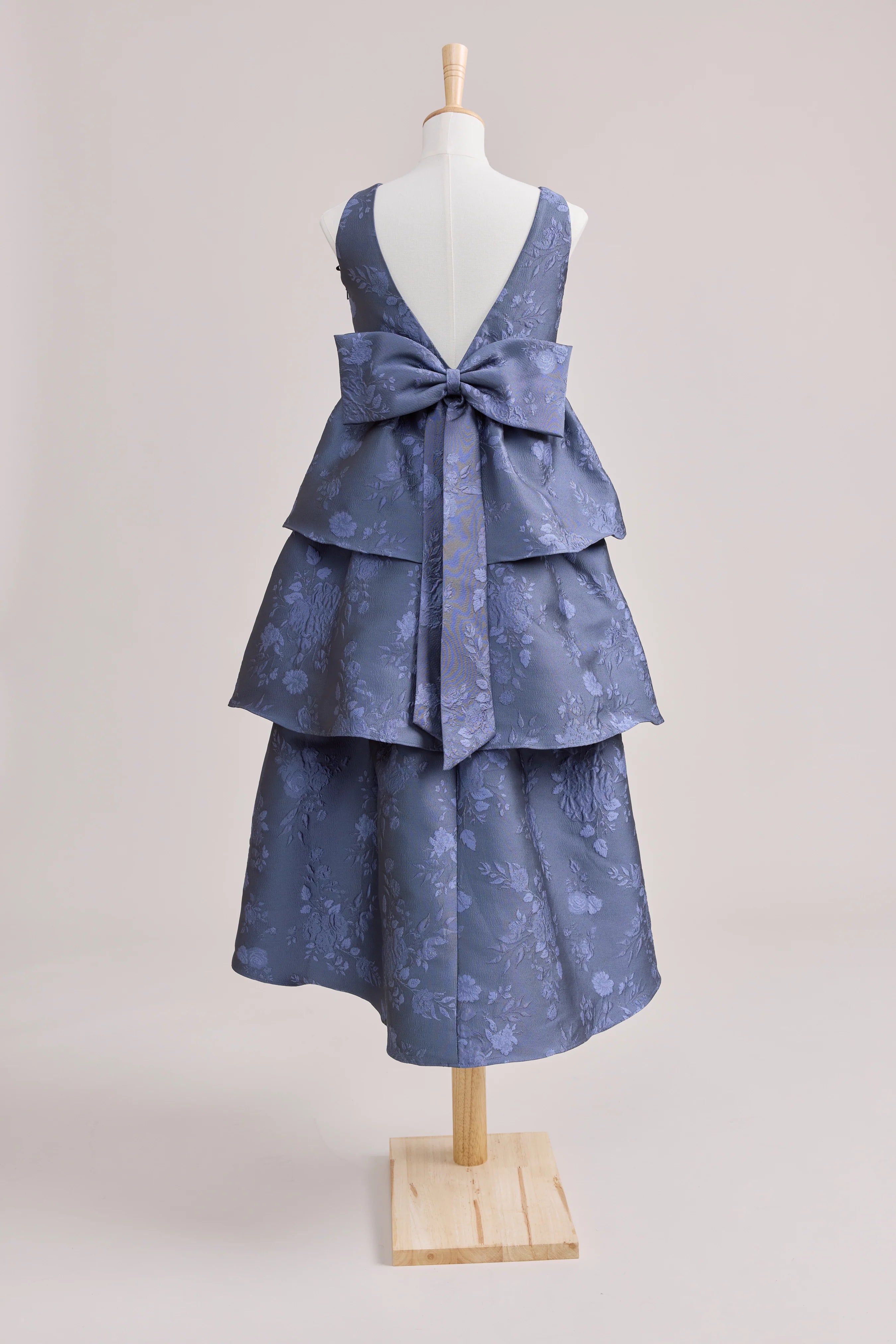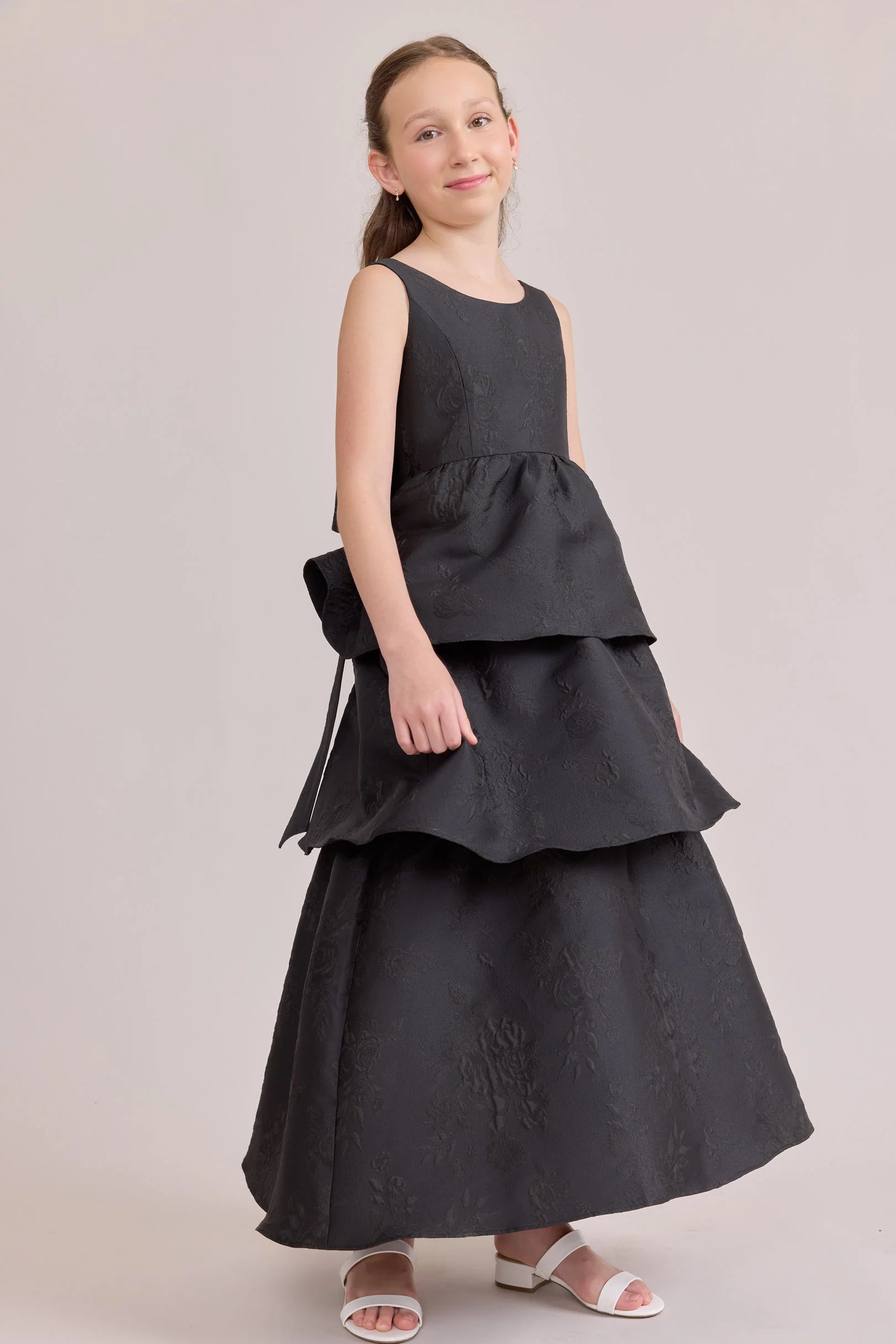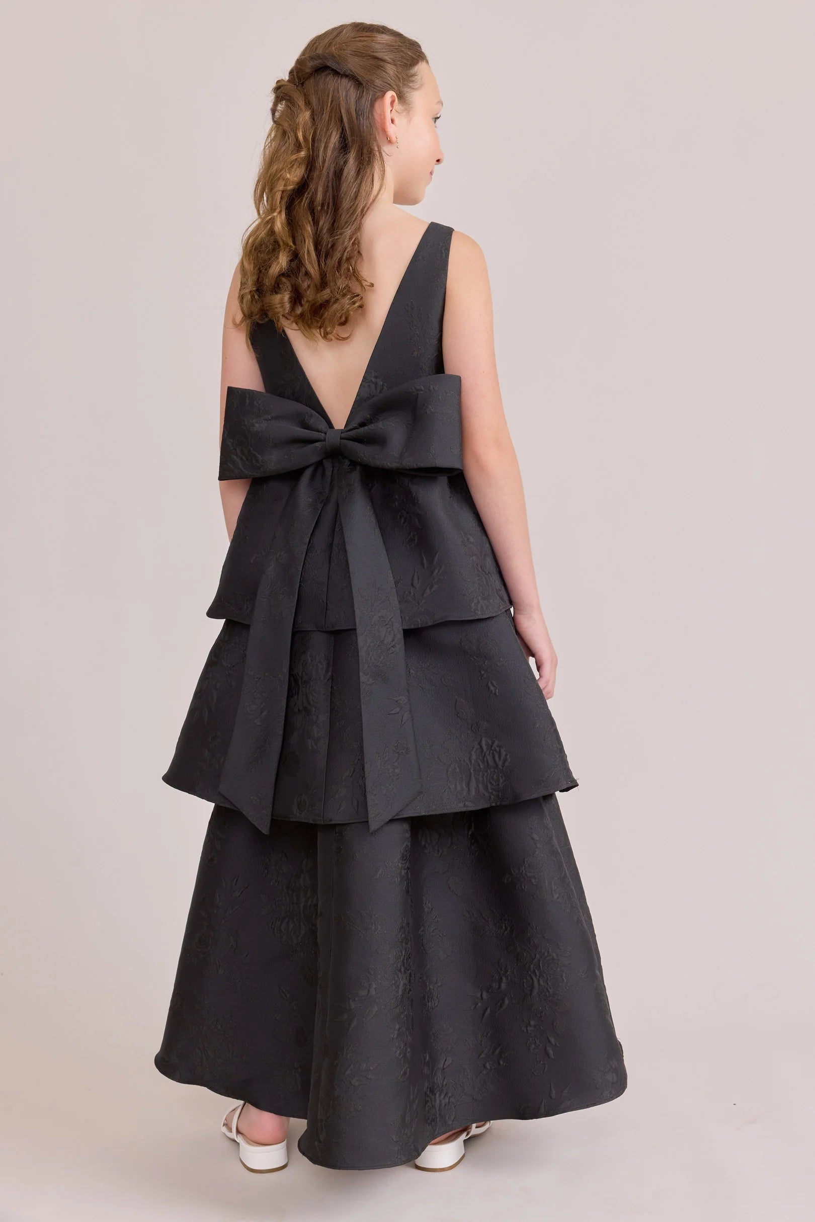 A ruffle-tiered dream in textured jacquard, our Dress is perfect for your Junior Bridesmaid to make a subtle yet stunning statement. The modest neckline offers a classic touch, while the low V-back and oversized bow bring the charm. Designed to beautifully complement our jacquard or solid bridesmaid styles.