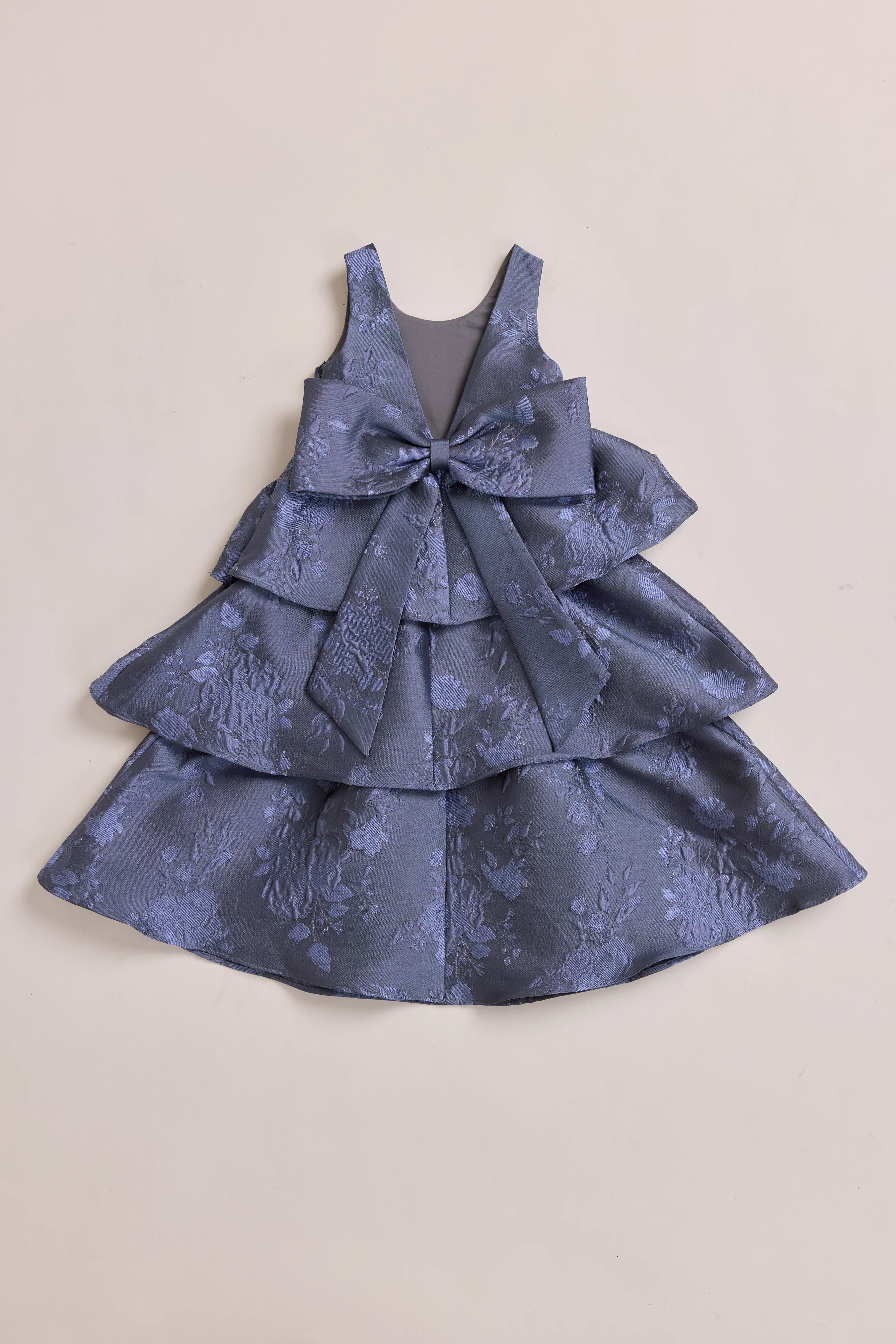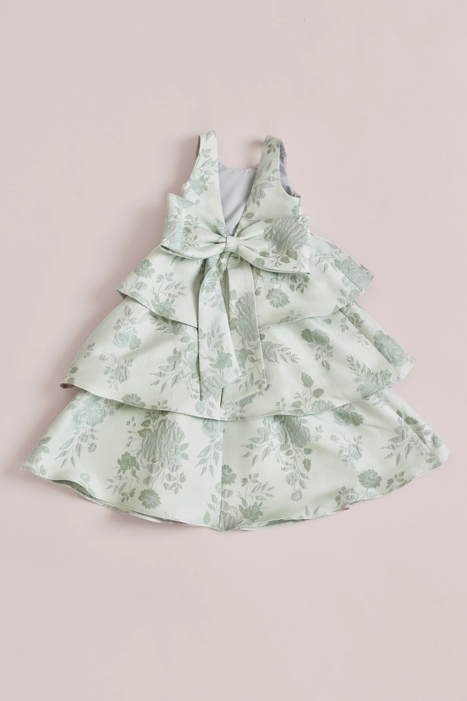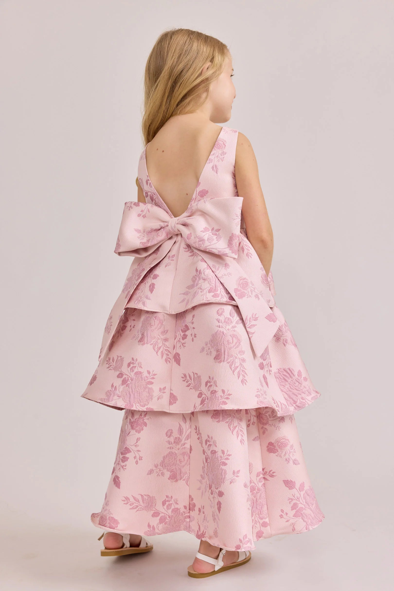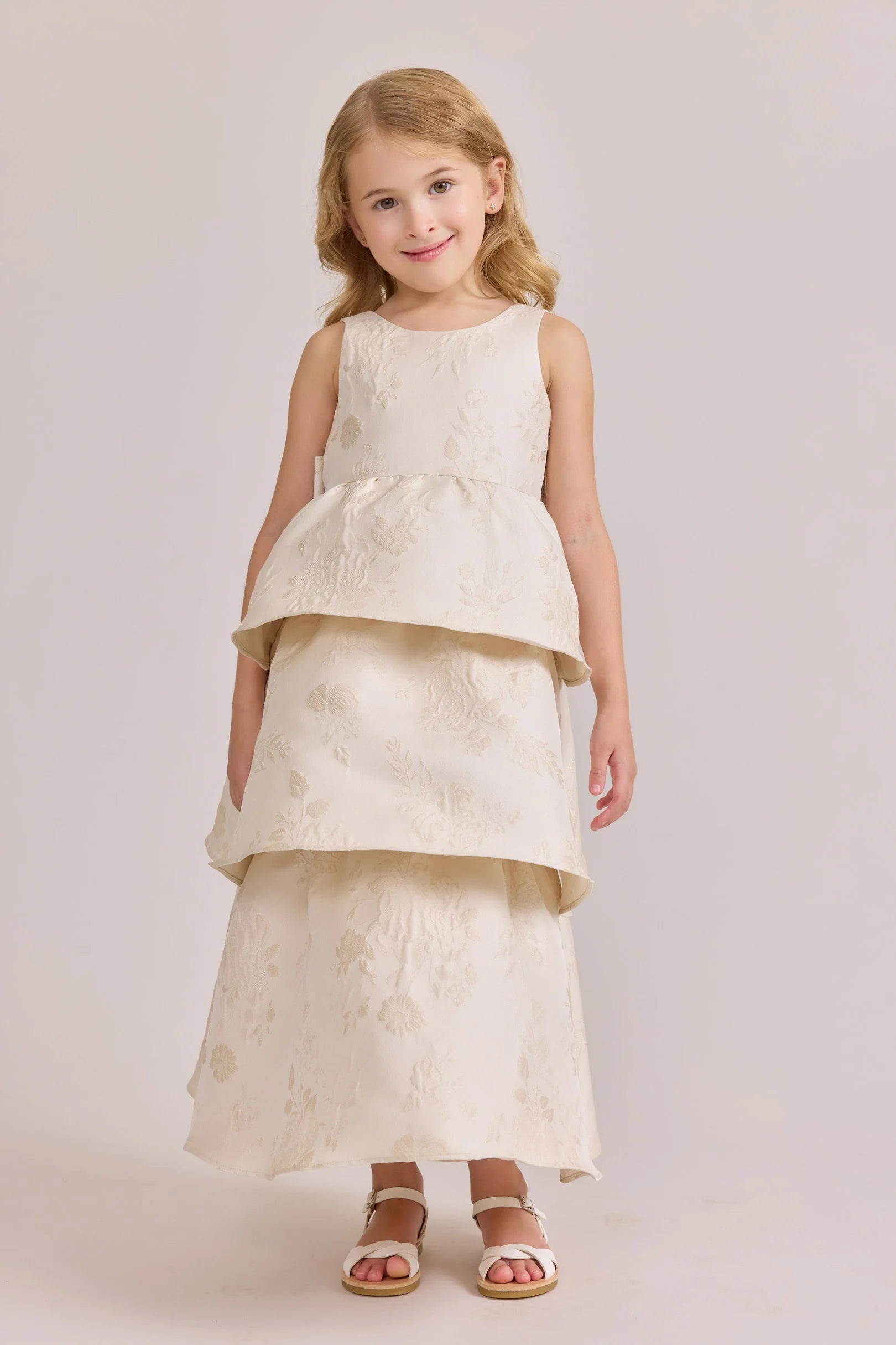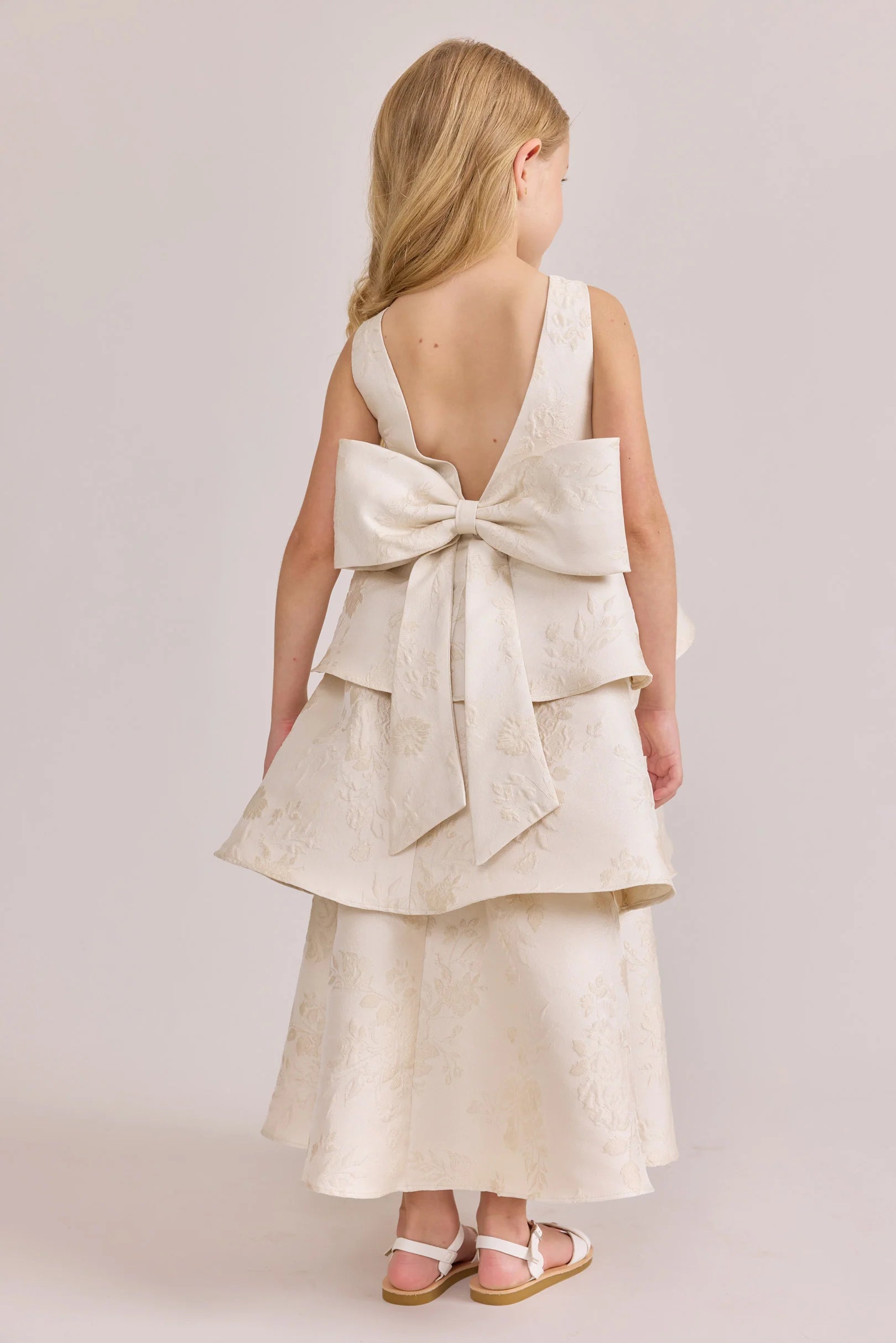 A ruffle-tiered dream in textured jacquard, our Dress is perfect for your Flower Girl to make a subtle yet stunning statement. The modest neckline offers a classic touch, while the low V-back and oversized bow bring the charm. Designed to beautifully complement our jacquard or solid bridesmaid styles.