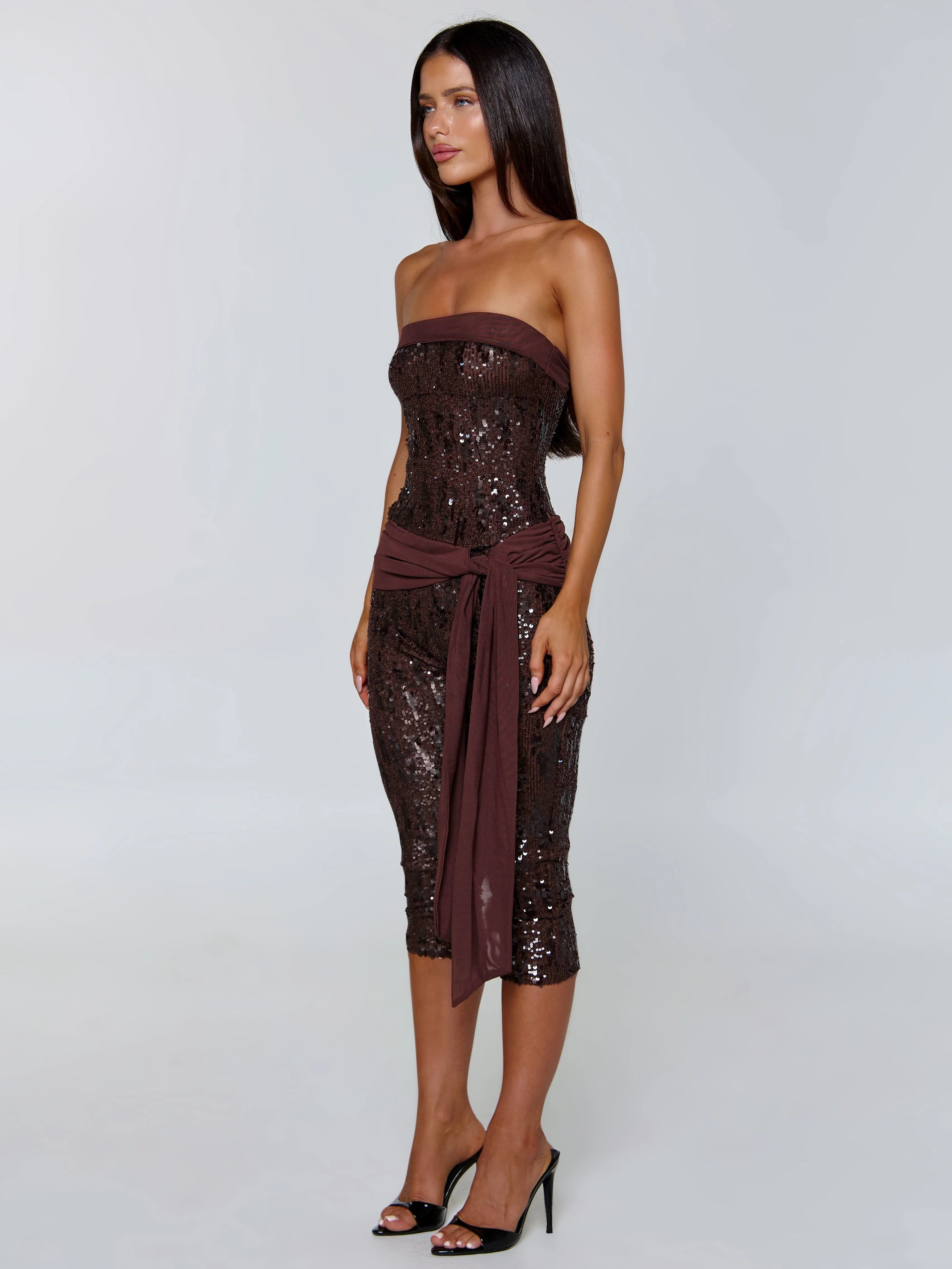 Cut from stretch sequin fabrication, she features a strapless neckline, body-hugging silhouette, and a mesh tie detail that accentuates the waist. Finished with a cropped capri leg for a modern, effortless edge.