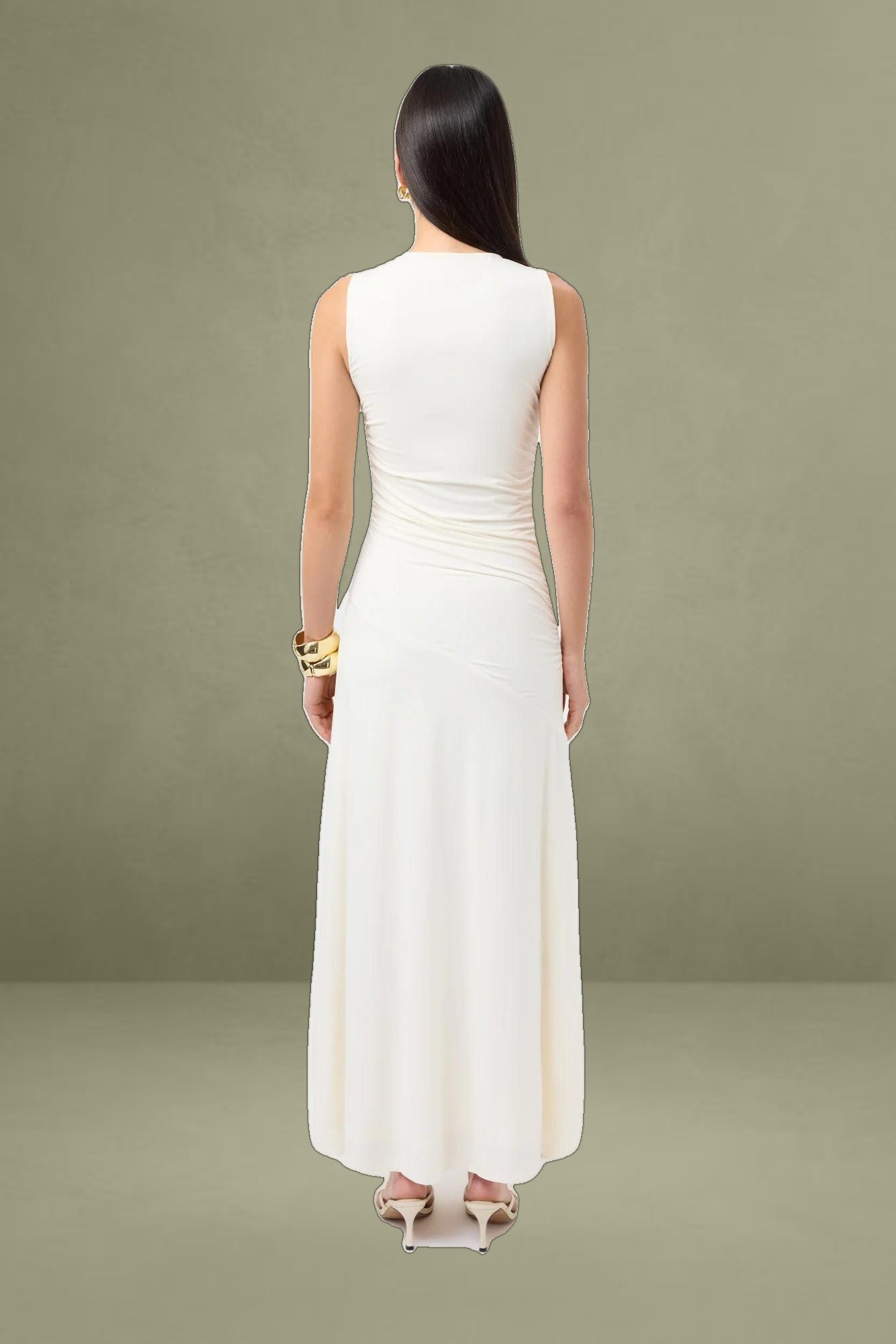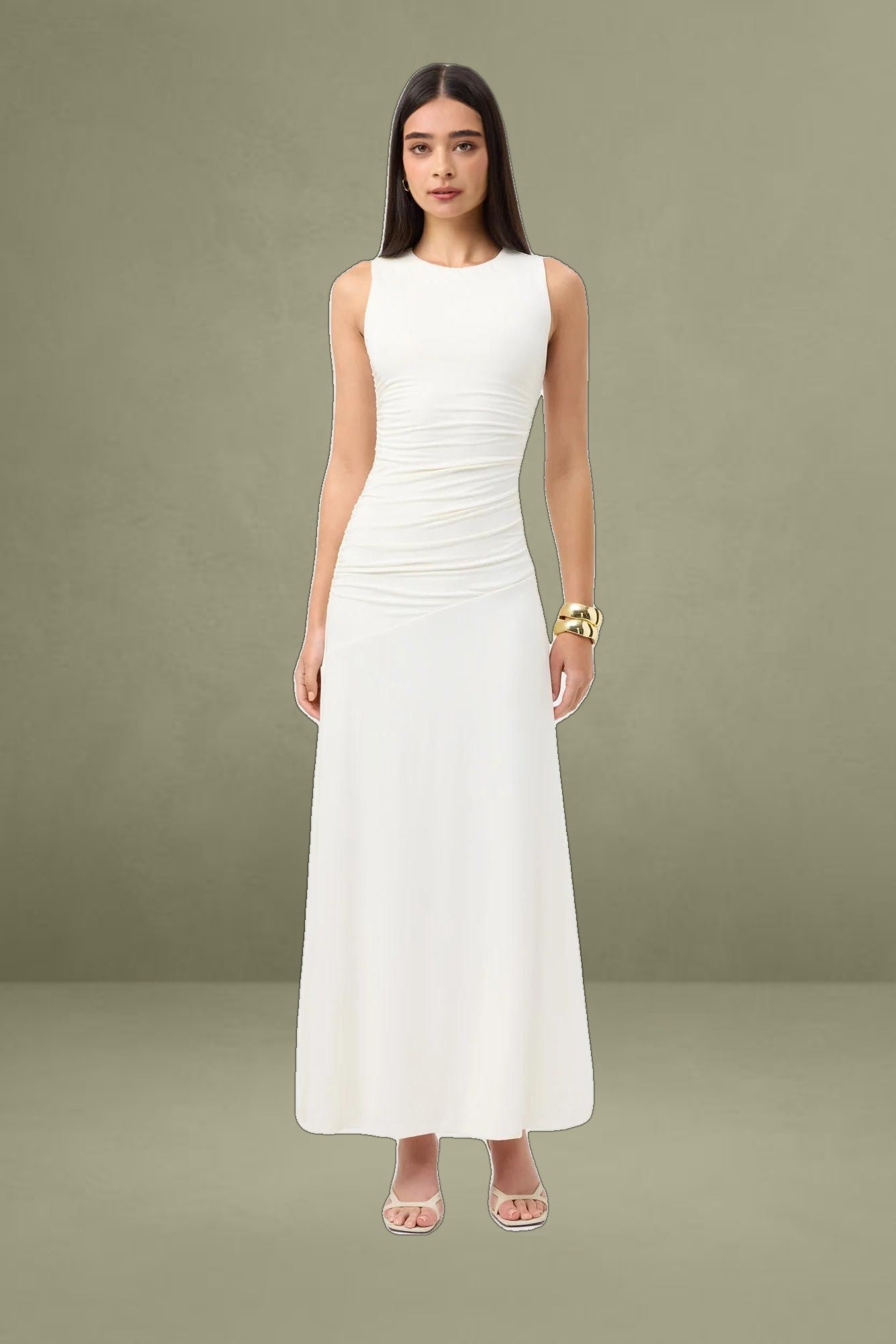 This maxi dress has an elegant silhouette made from soft rayon jersey. It has a fitted bodice and waistline, with delicate ruched details that accentuate the figure before flowing into a fluttering hem. The crew neck and sleeveless design offer a classic and easy - going look.