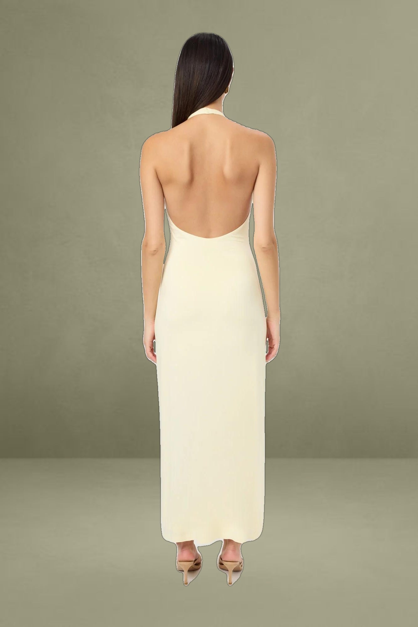 A vibrant yellow maxi dress, a bold and eye - catching statement item. Made from soft jersey fabric that falls gracefully, it provides both comfort and high - end elegance. There is adjustable gold detailing at the neckline, adding a bit of sophistication and enabling customized styling.