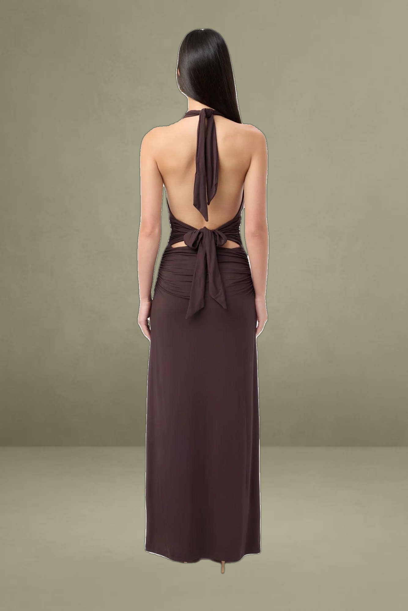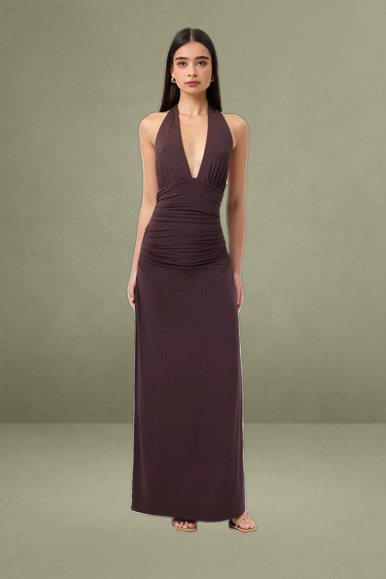 Experience the charm of a maxi dress in a rich brown color. Made from a popular rayon jersey fabric, it features an attractive halter neckline and a flowing maxi shape, presenting a graceful and feminine appearance. The dress is tailored to fit nicely around the waist and has ties at the back to enhance the figure.