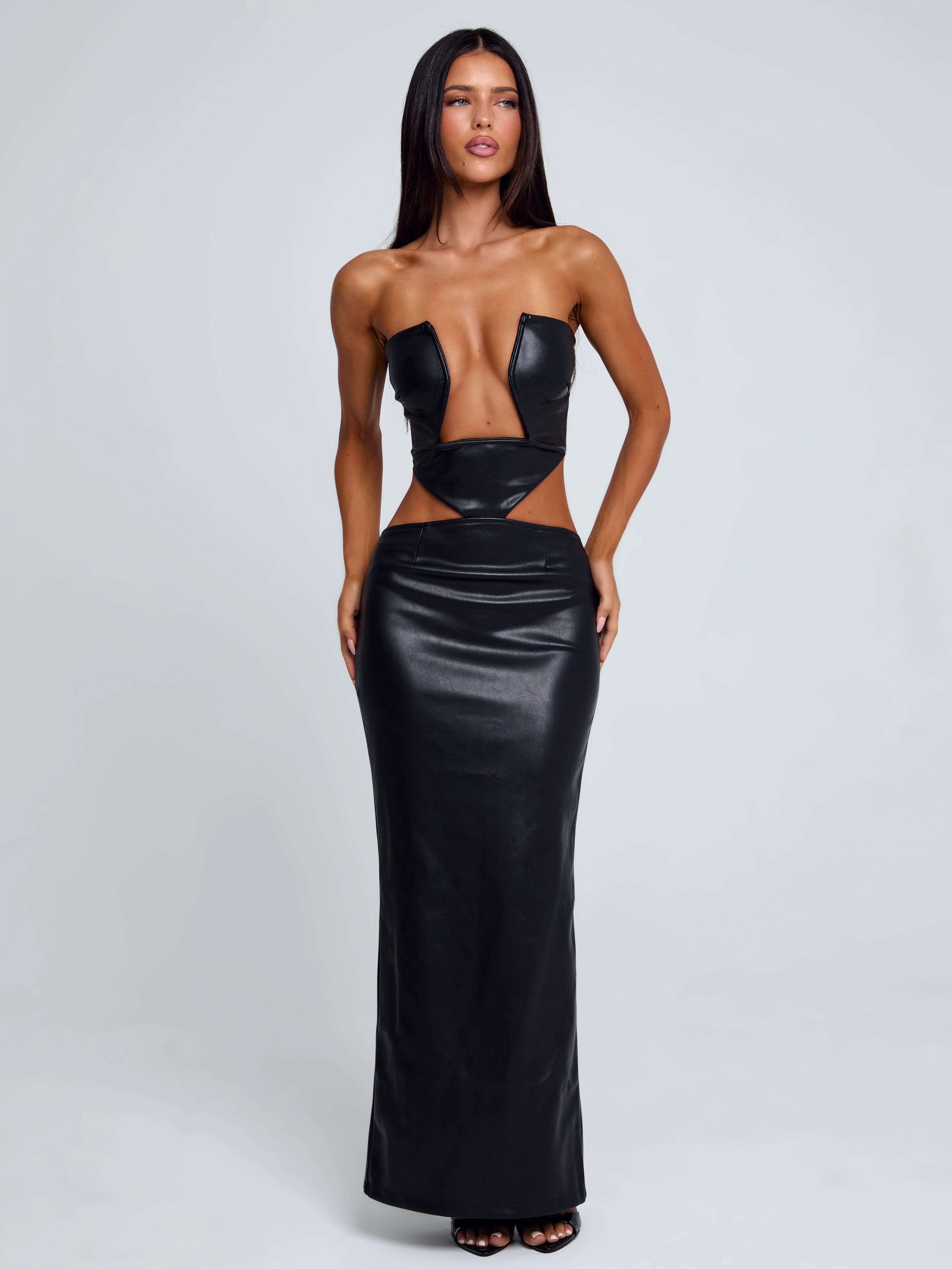 Crafted from a PU fabrication, she¡¯s designed with a sculpting body-con fit that accentuates every curve. Featuring a wired plunge neckline for structure and support, bold hip cut-outs, and a back split for effortless movement, she¡¯s the ultimate mix of modern and seductive. Finished with a back zip closure for ease of wear, this midi is a statement from every angle.