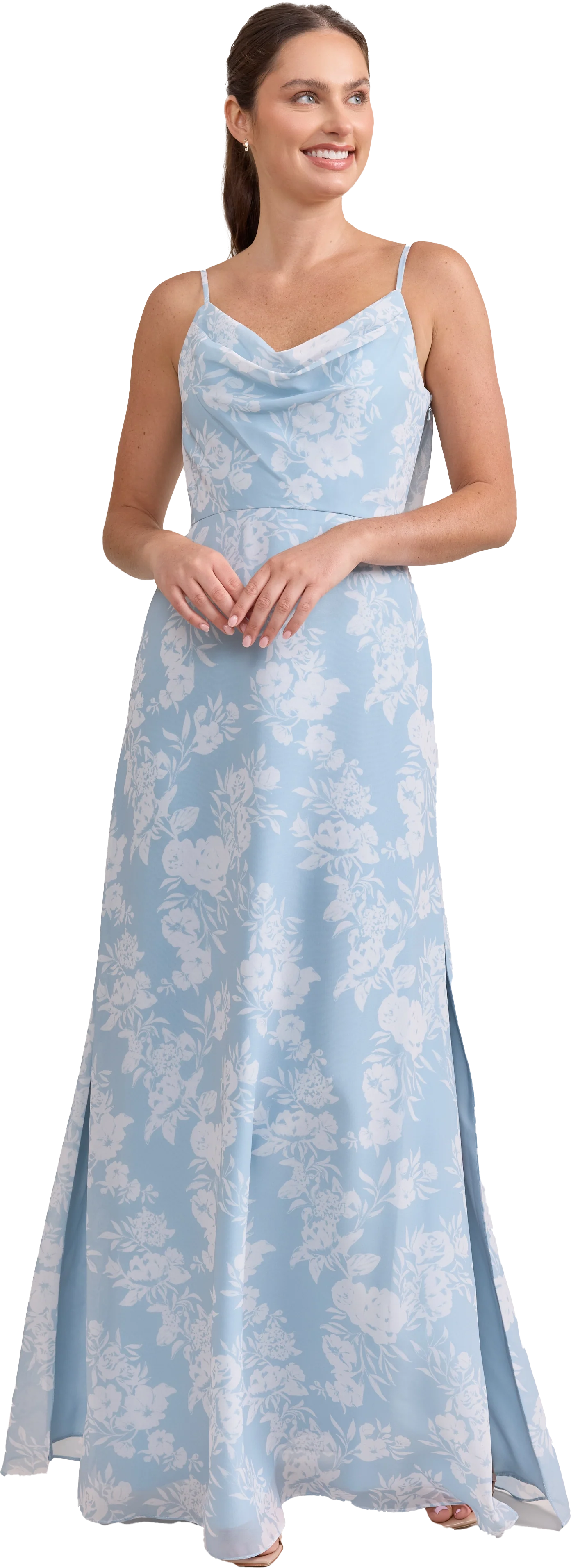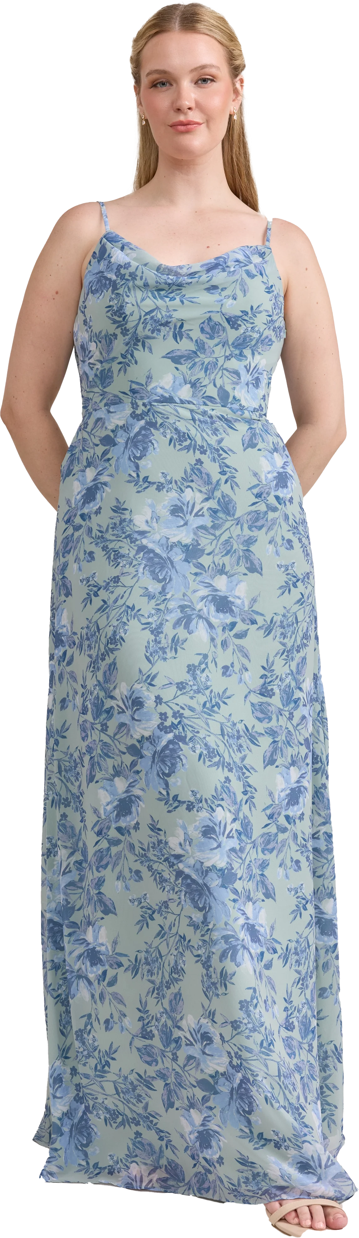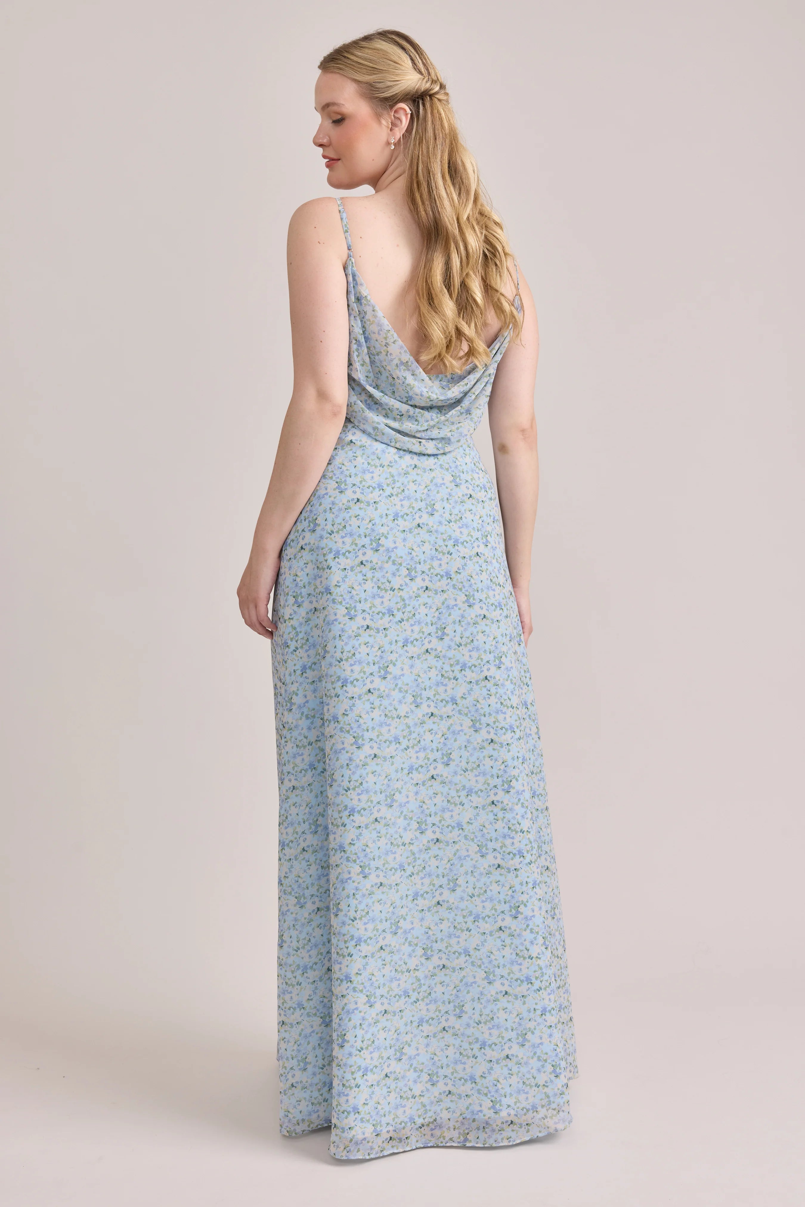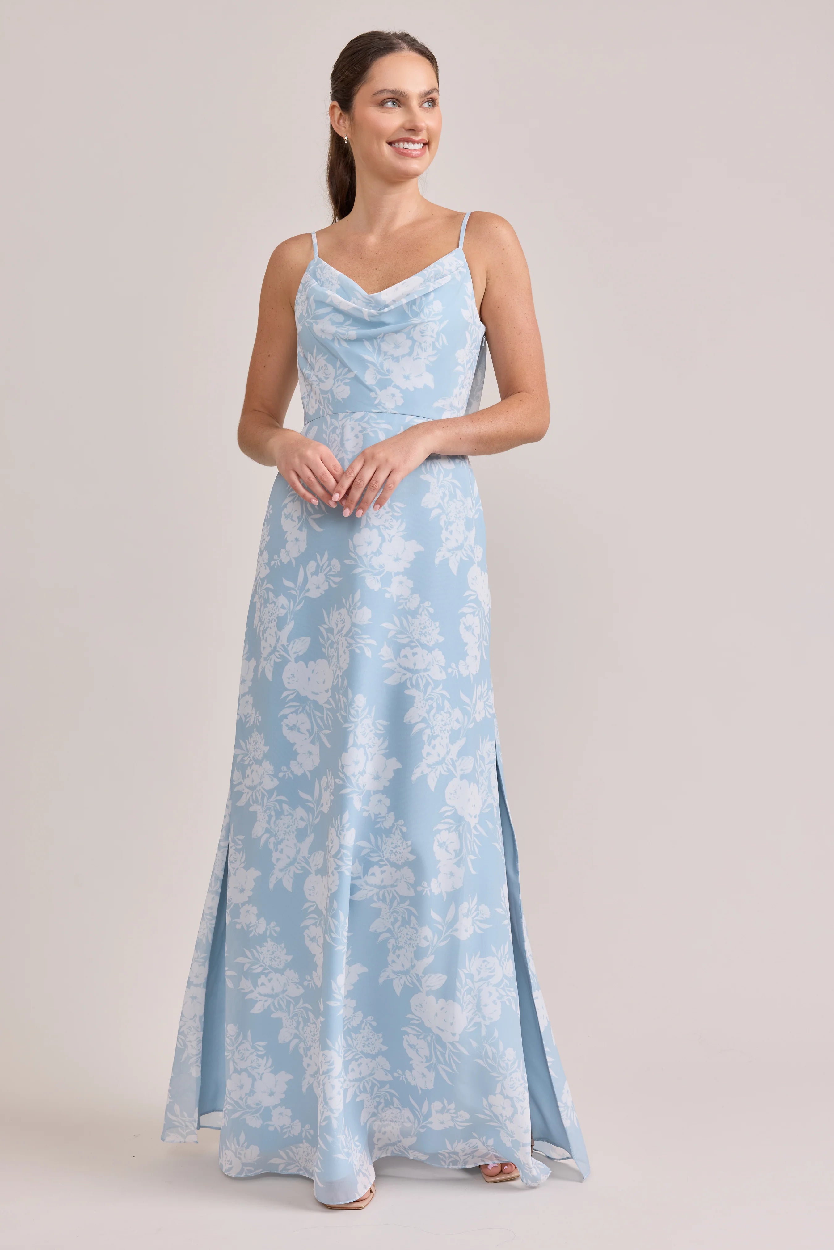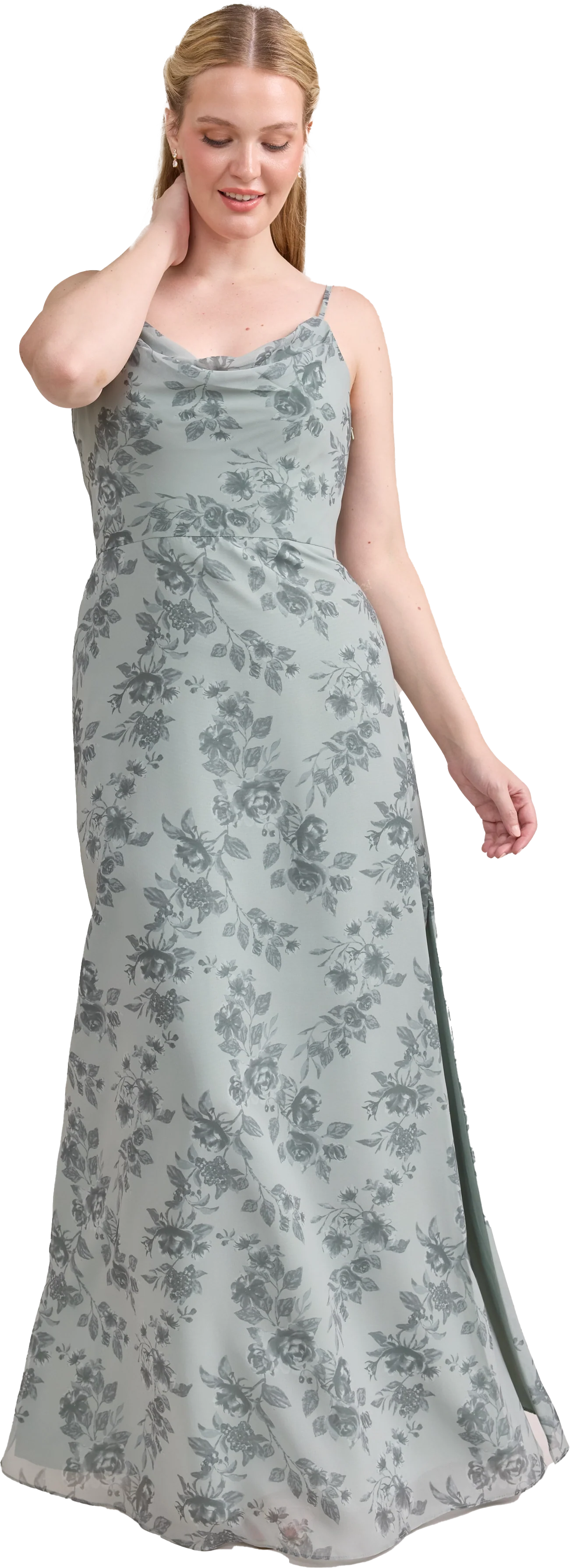 An update on a classic style, our Nadia dress will become your new favorite! Nadia is crafted with a slight empire waist to help provide a flattering fit for all body types! This chiffon dress also features side slits in the skirt with a modest cowl neck and an exaggerated swoop back past the waistline for a dramatically chic statement. Pair it with our Skye dress for a cohesive lineup.