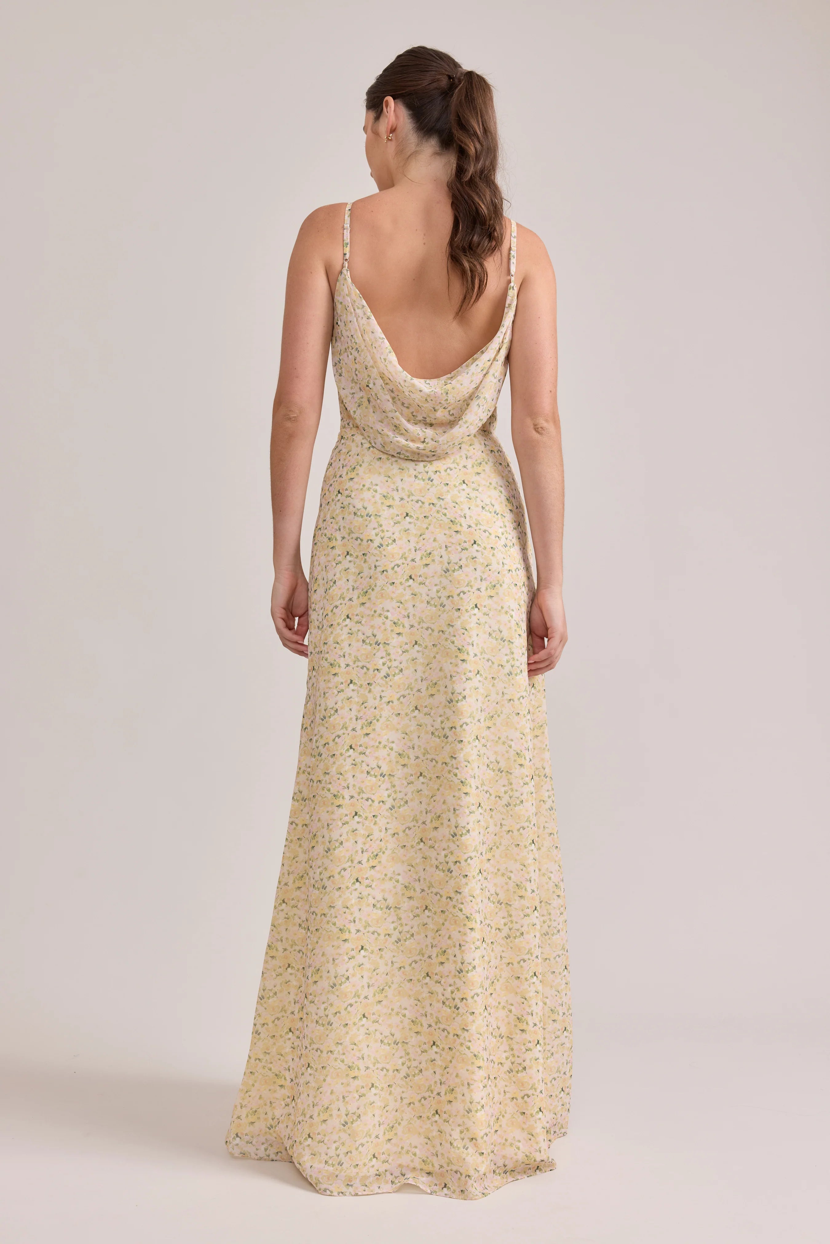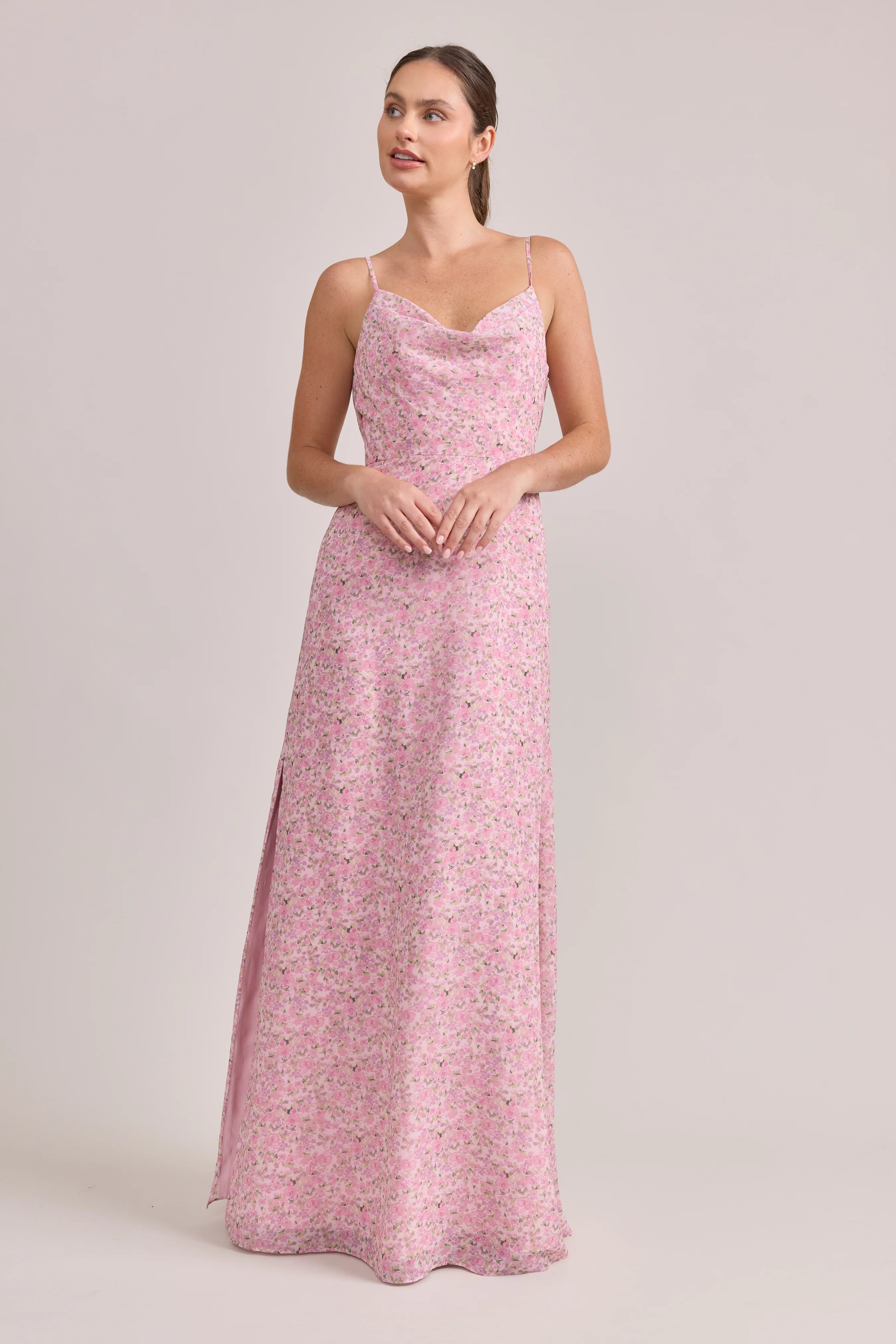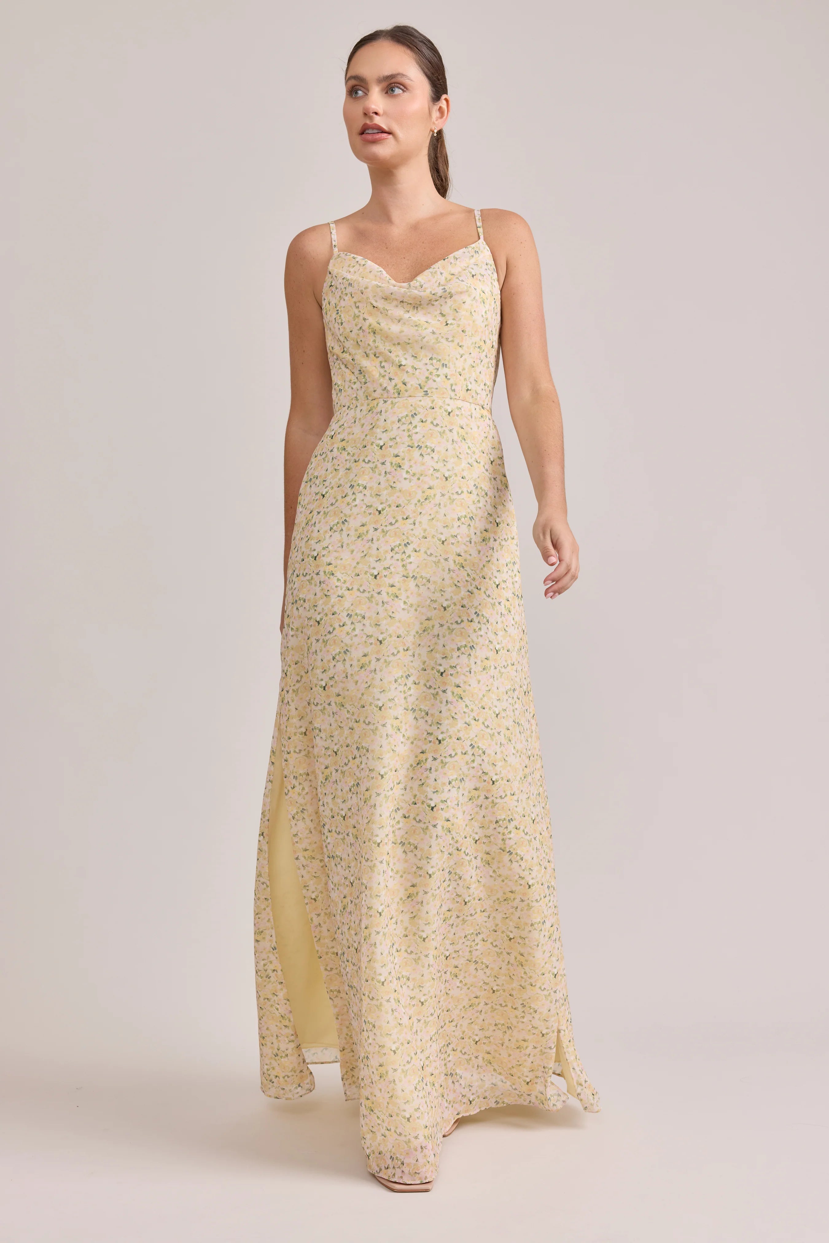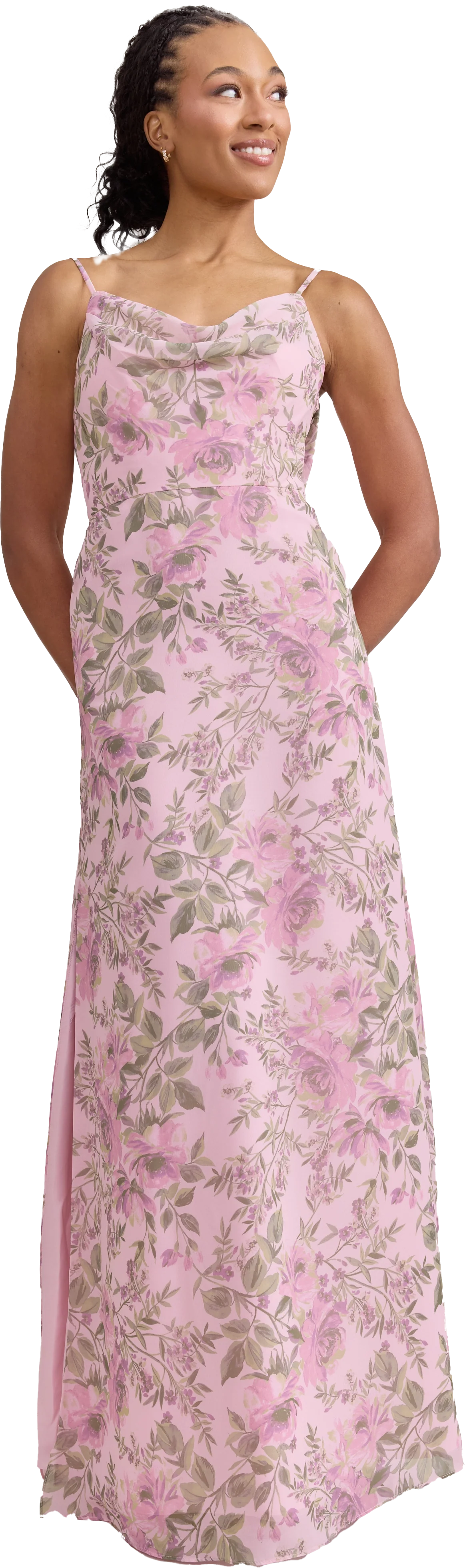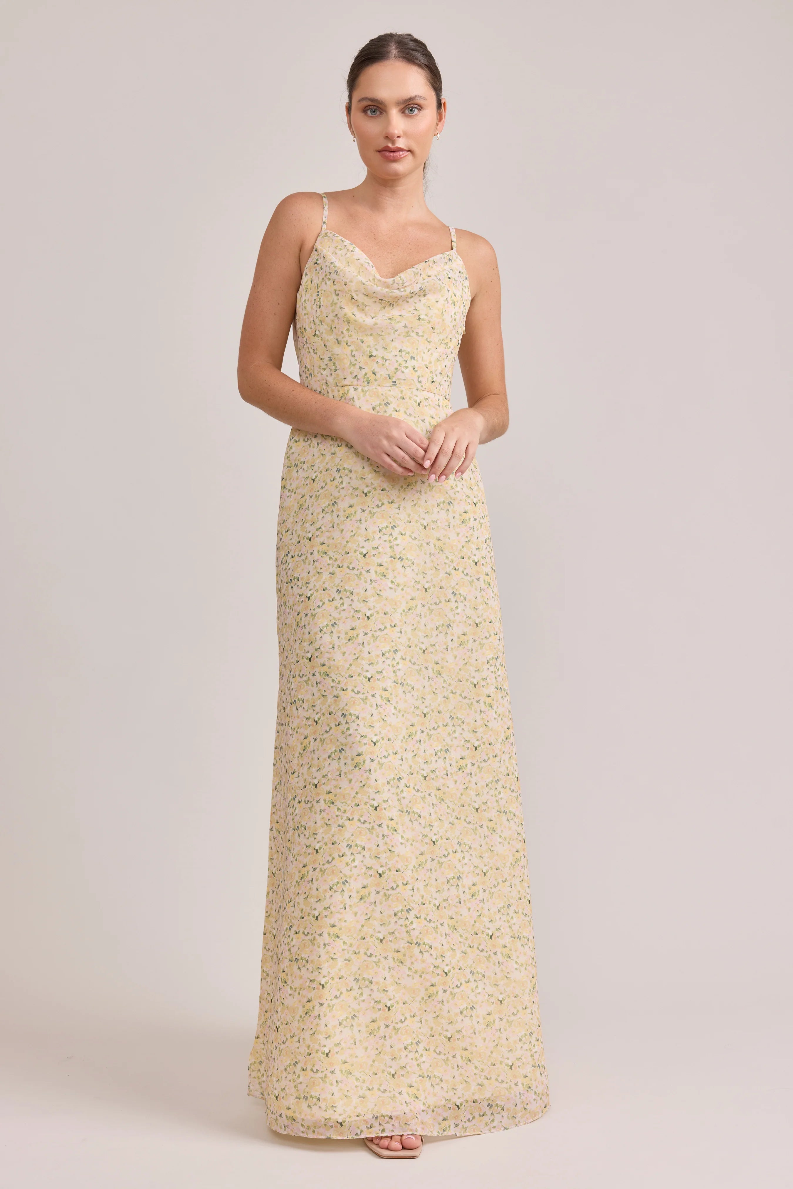 An update on a classic style, our Nadia dress will become your new favorite! Nadia is crafted with a slight empire waist to help provide a flattering fit for all body types! This chiffon dress also features side slits in the skirt with a modest cowl neck and an exaggerated swoop back past the waistline for a dramatically chic statement. Pair it with our Skye dress for a cohesive lineup.