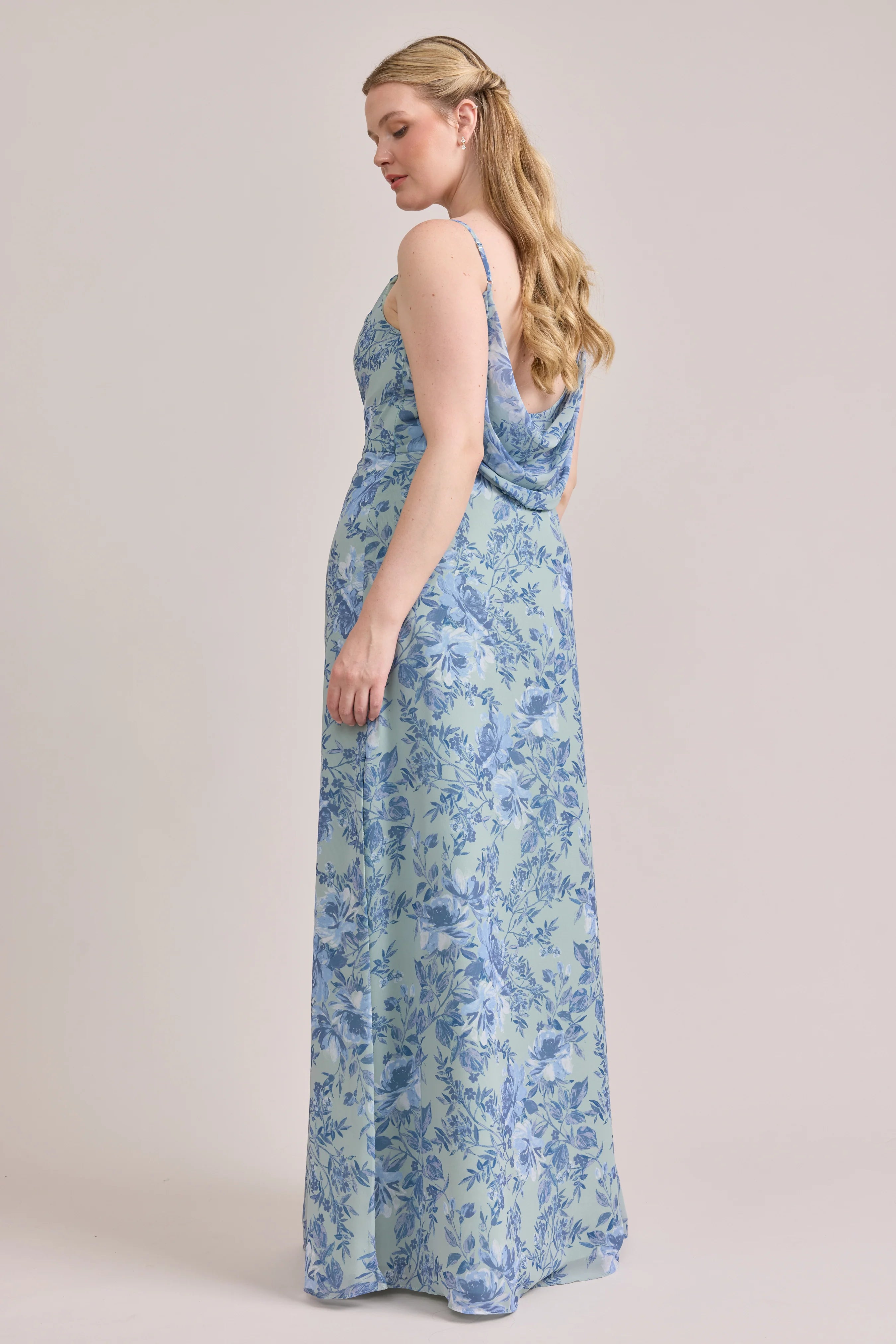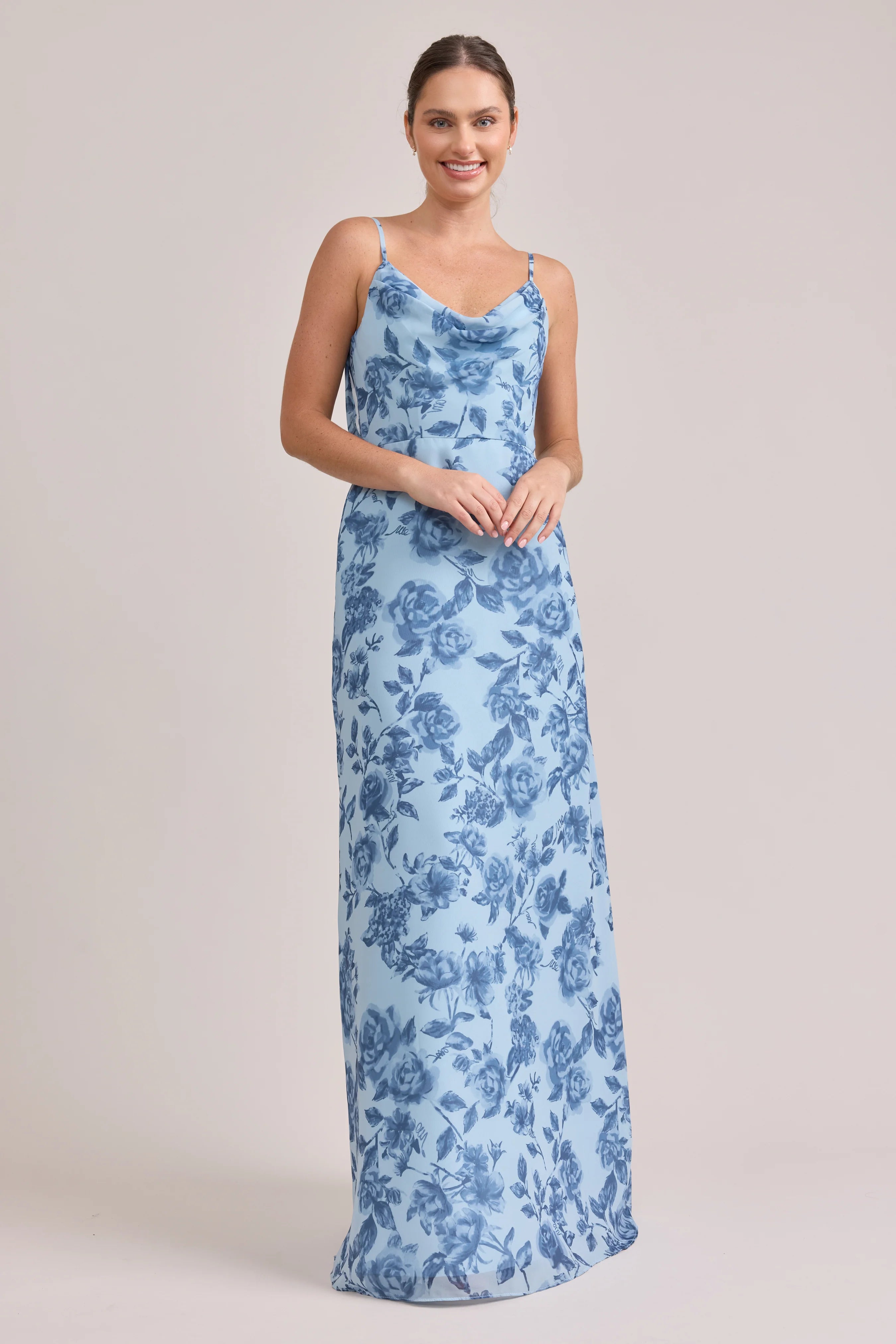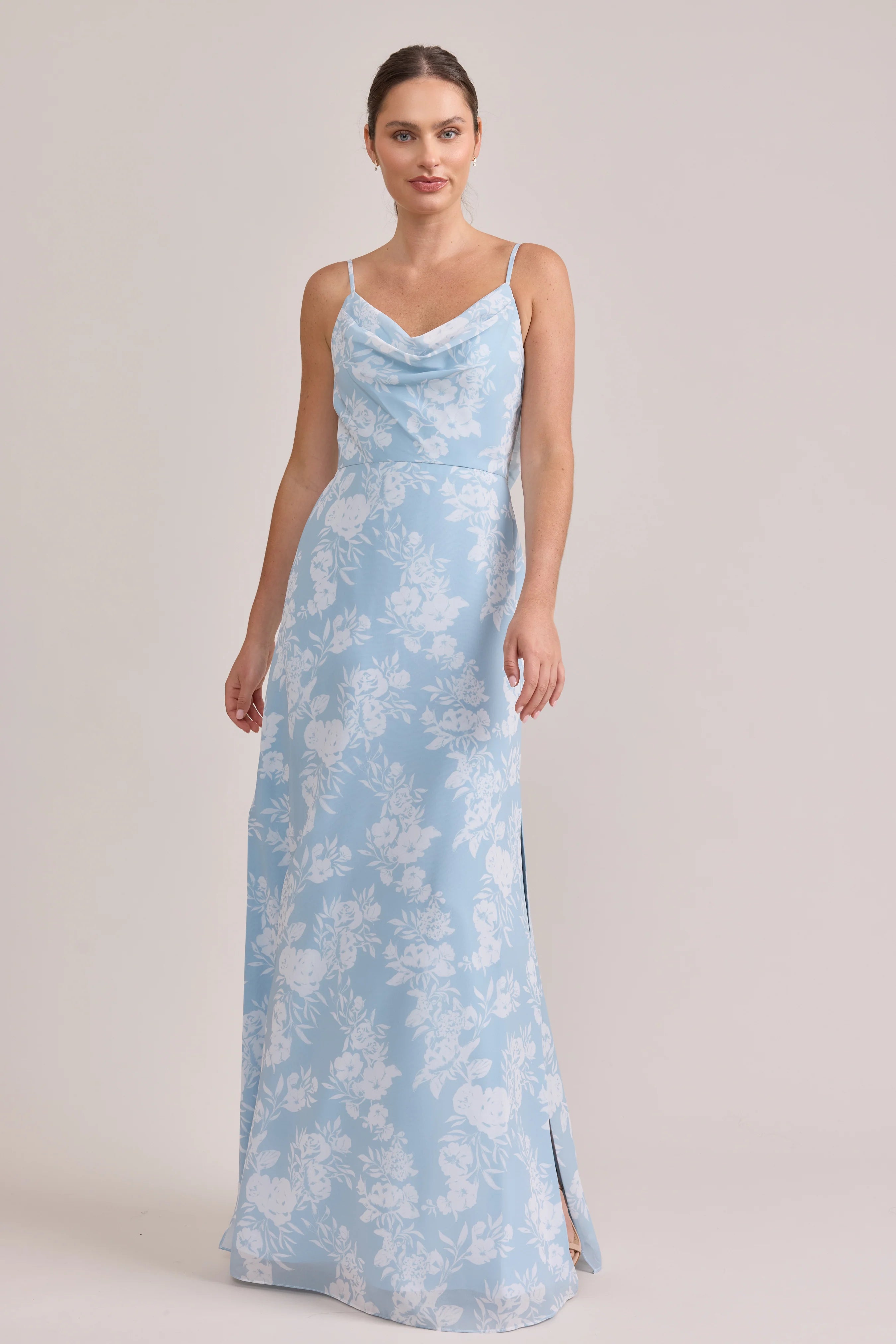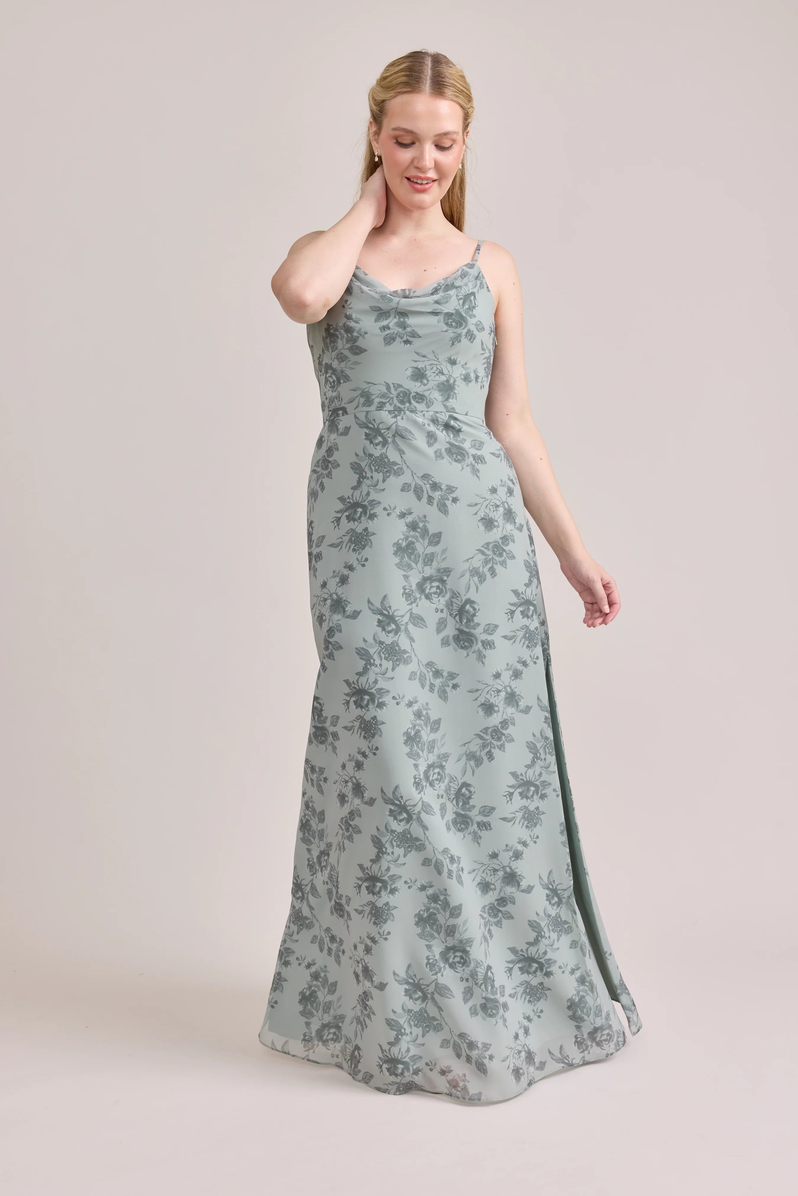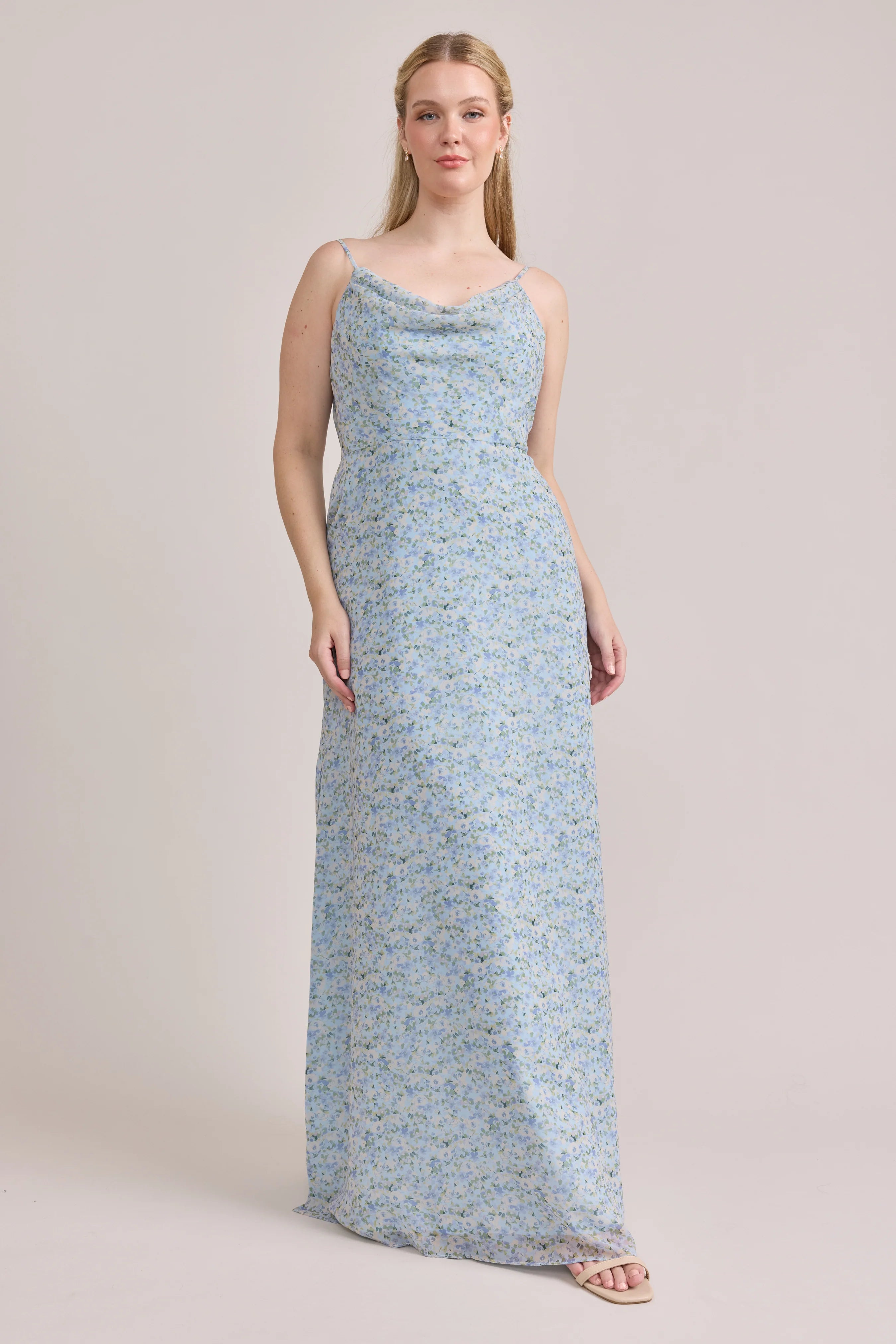 An update on a classic style, our Nadia dress will become your new favorite! Nadia is crafted with a slight empire waist to help provide a flattering fit for all body types! This chiffon dress also features side slits in the skirt with a modest cowl neck and an exaggerated swoop back past the waistline for a dramatically chic statement. Pair it with our Skye dress for a cohesive lineup.