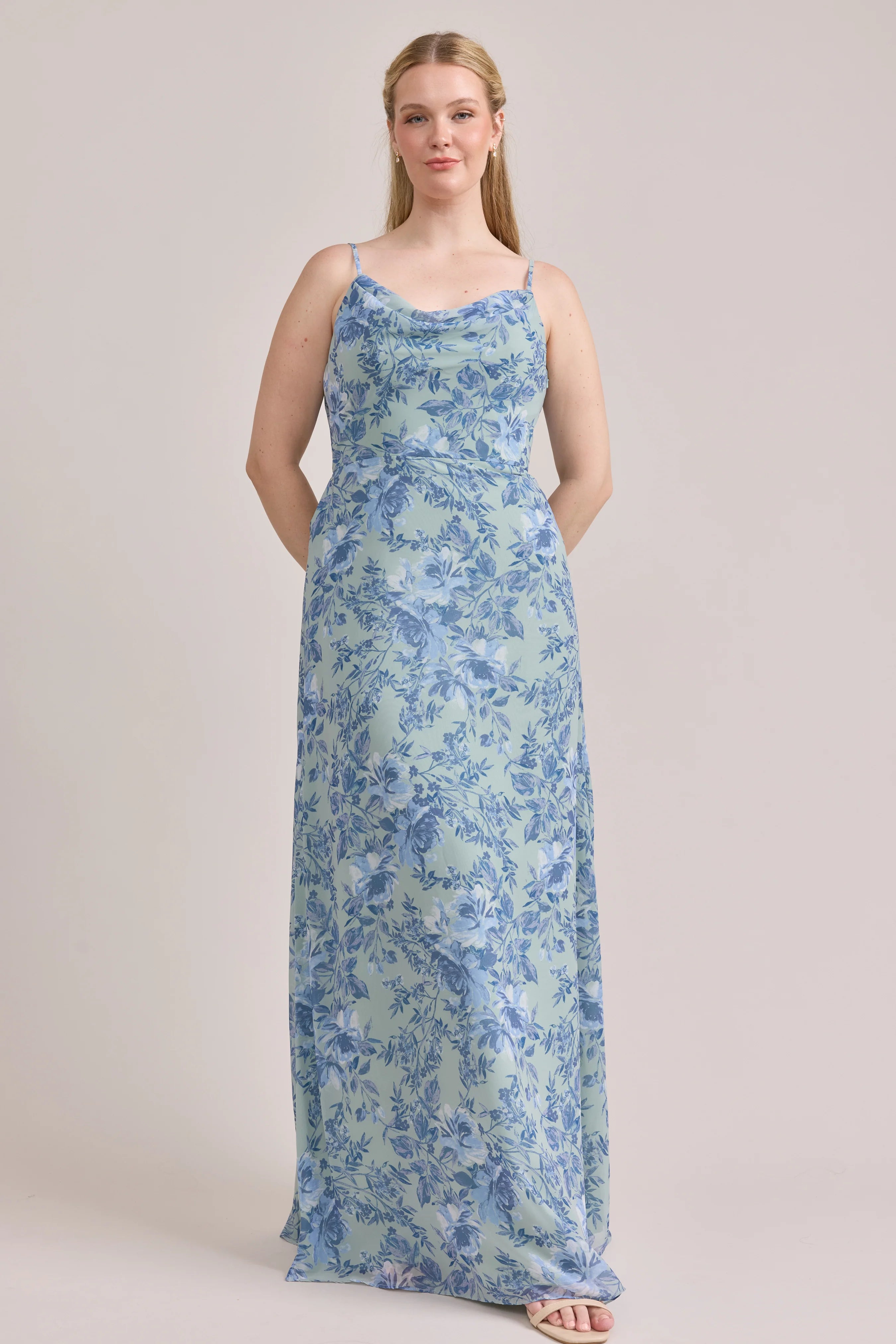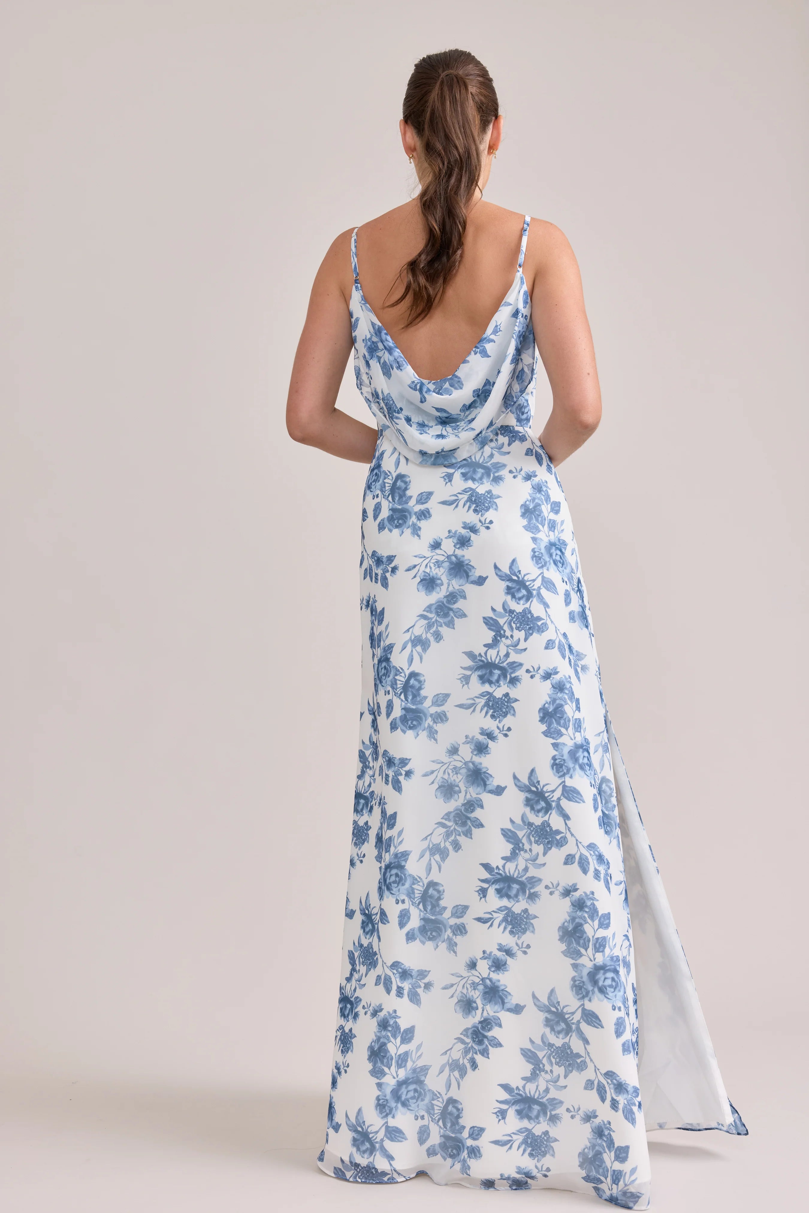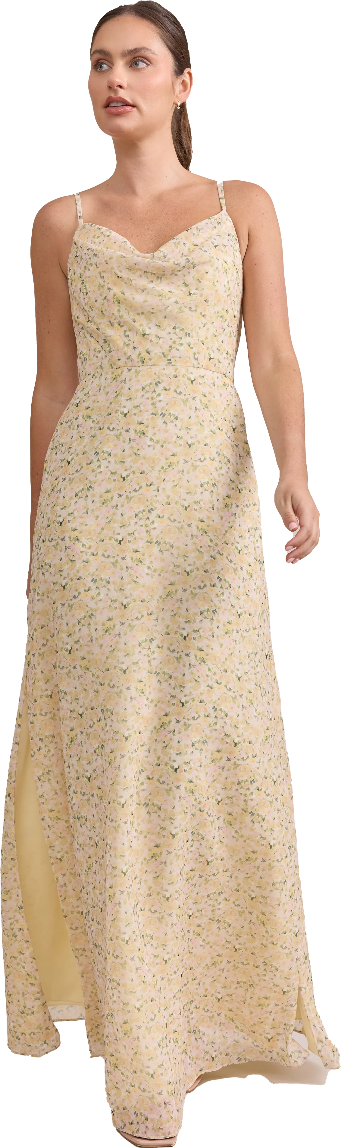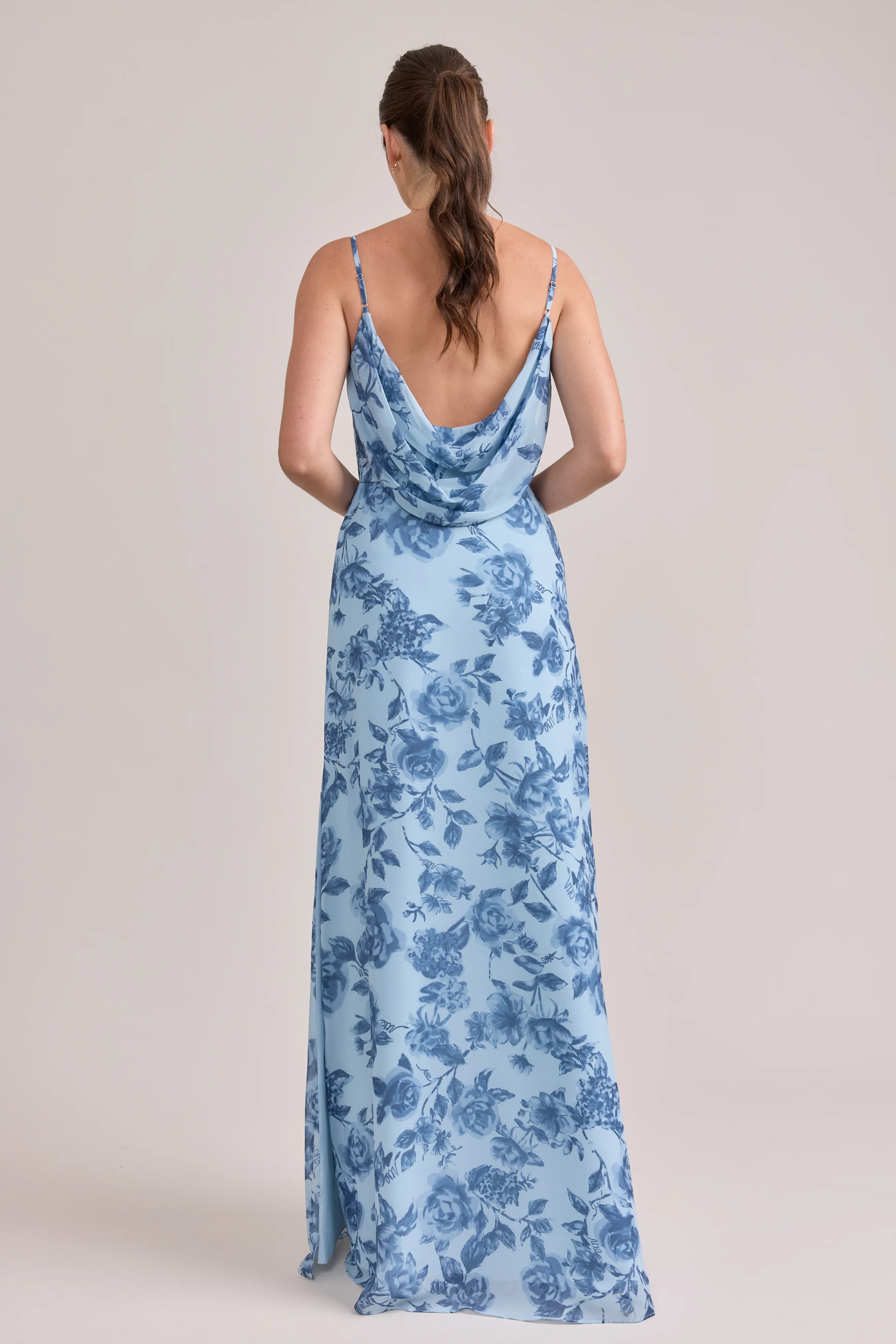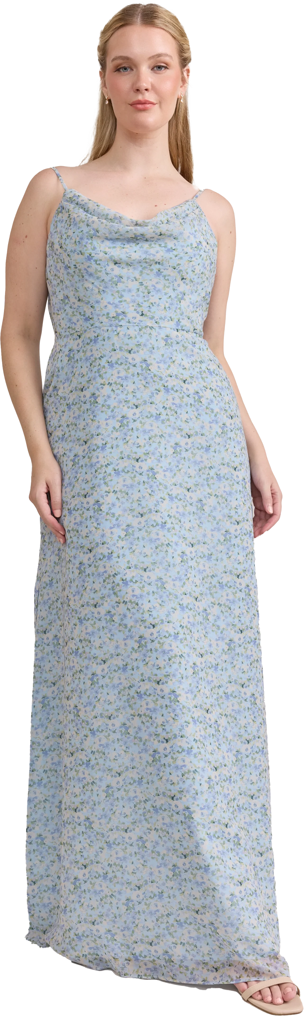 An update on a classic style, our Nadia dress will become your new favorite! Nadia is crafted with a slight empire waist to help provide a flattering fit for all body types! This chiffon dress also features side slits in the skirt with a modest cowl neck and an exaggerated swoop back past the waistline for a dramatically chic statement. Pair it with our Skye dress for a cohesive lineup.