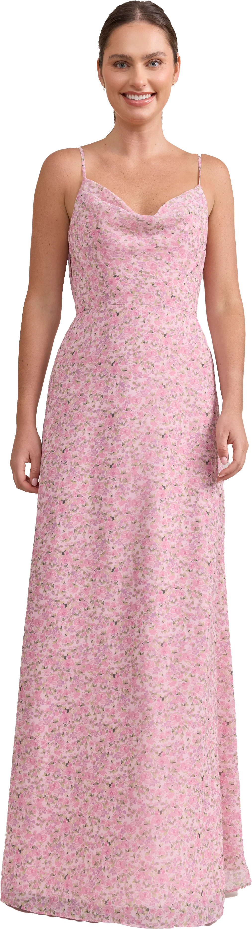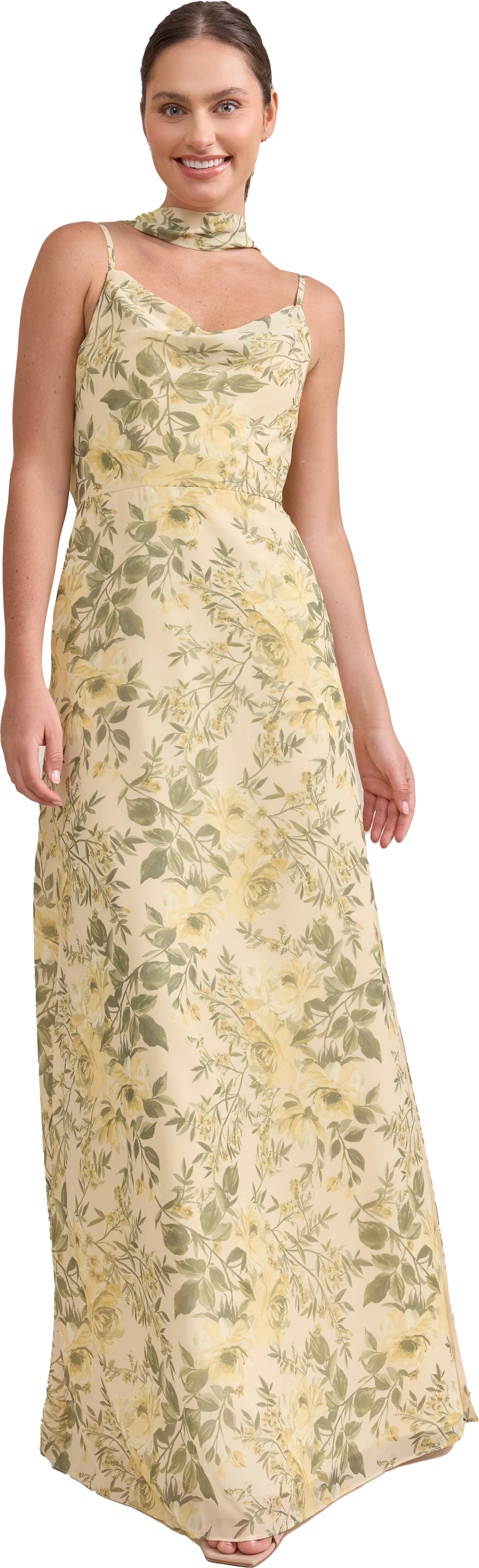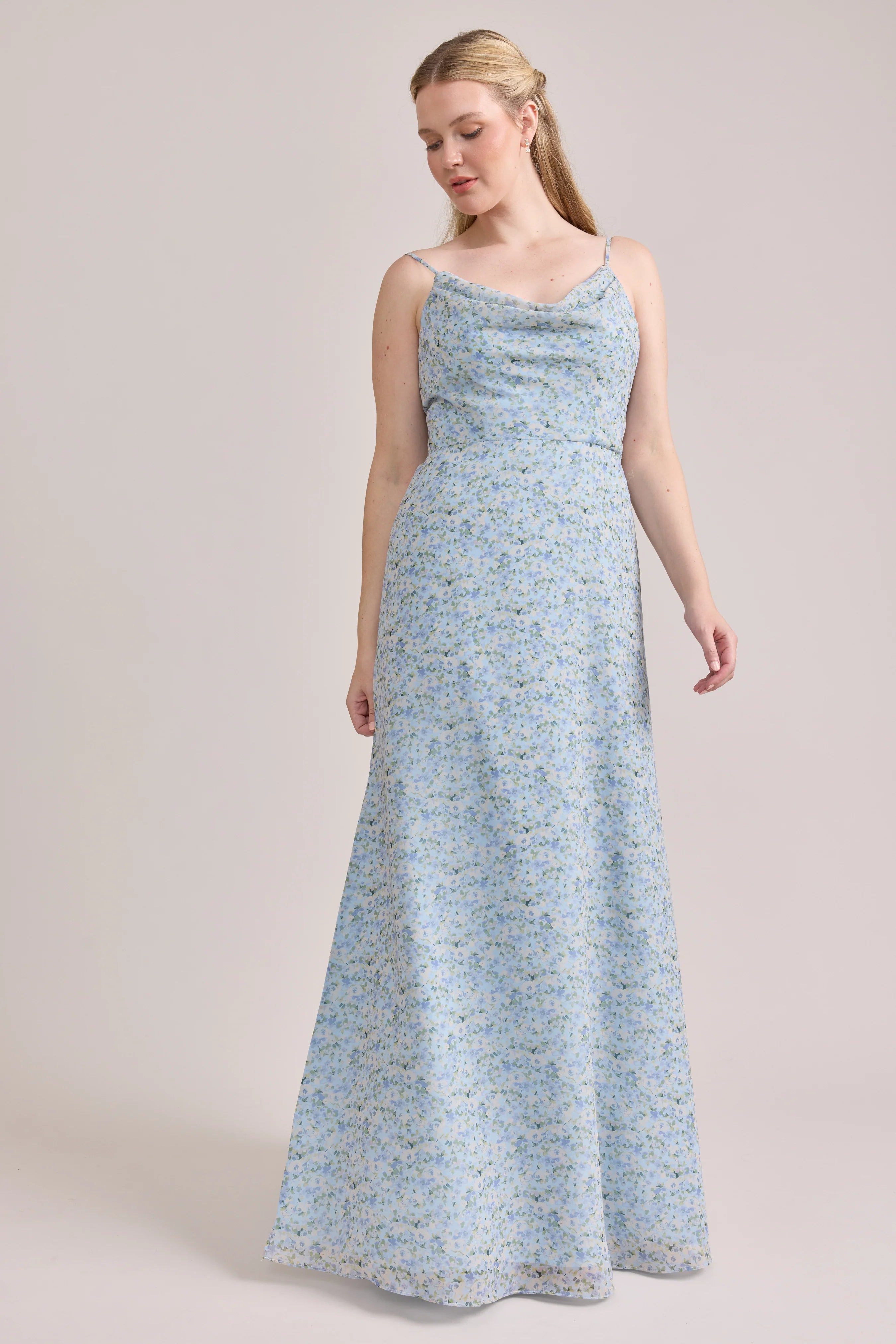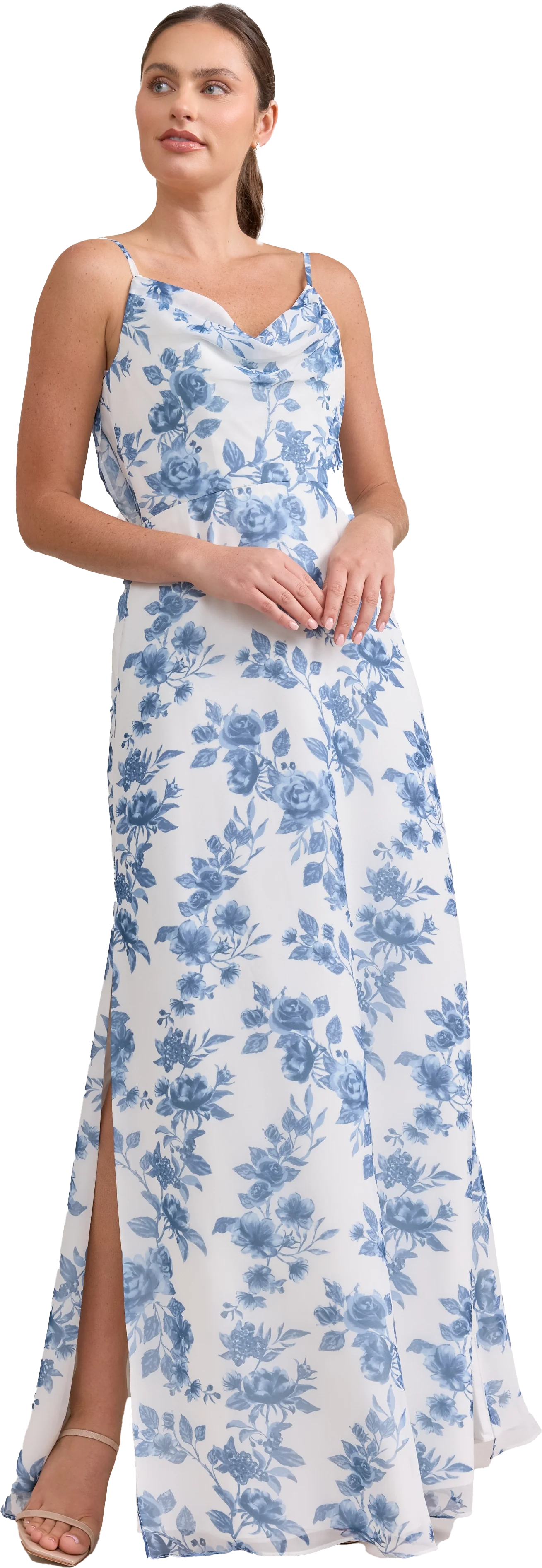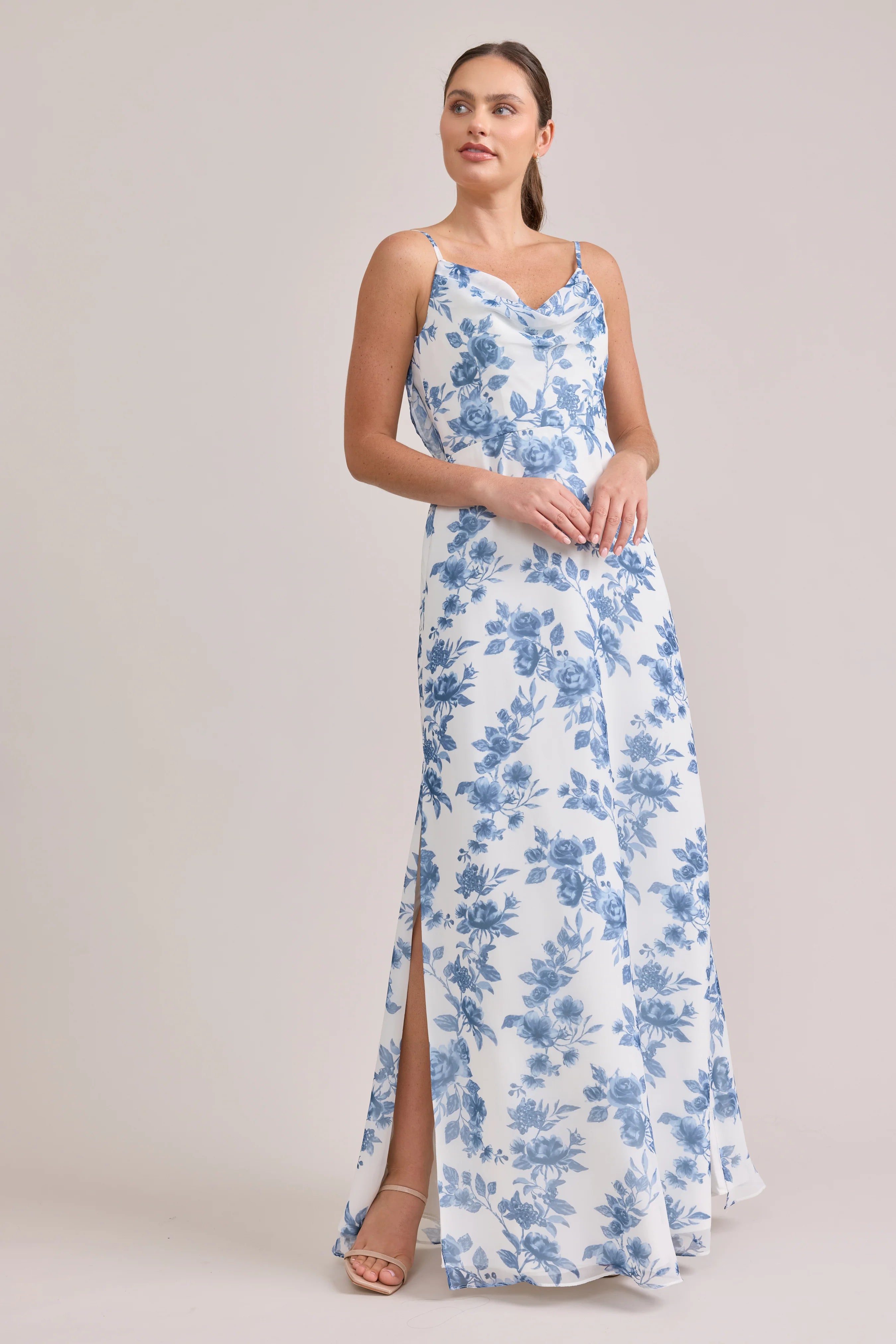 An update on a classic style, our Nadia dress will become your new favorite! Nadia is crafted with a slight empire waist to help provide a flattering fit for all body types! This chiffon dress also features side slits in the skirt with a modest cowl neck and an exaggerated swoop back past the waistline for a dramatically chic statement. Pair it with our Skye dress for a cohesive lineup.