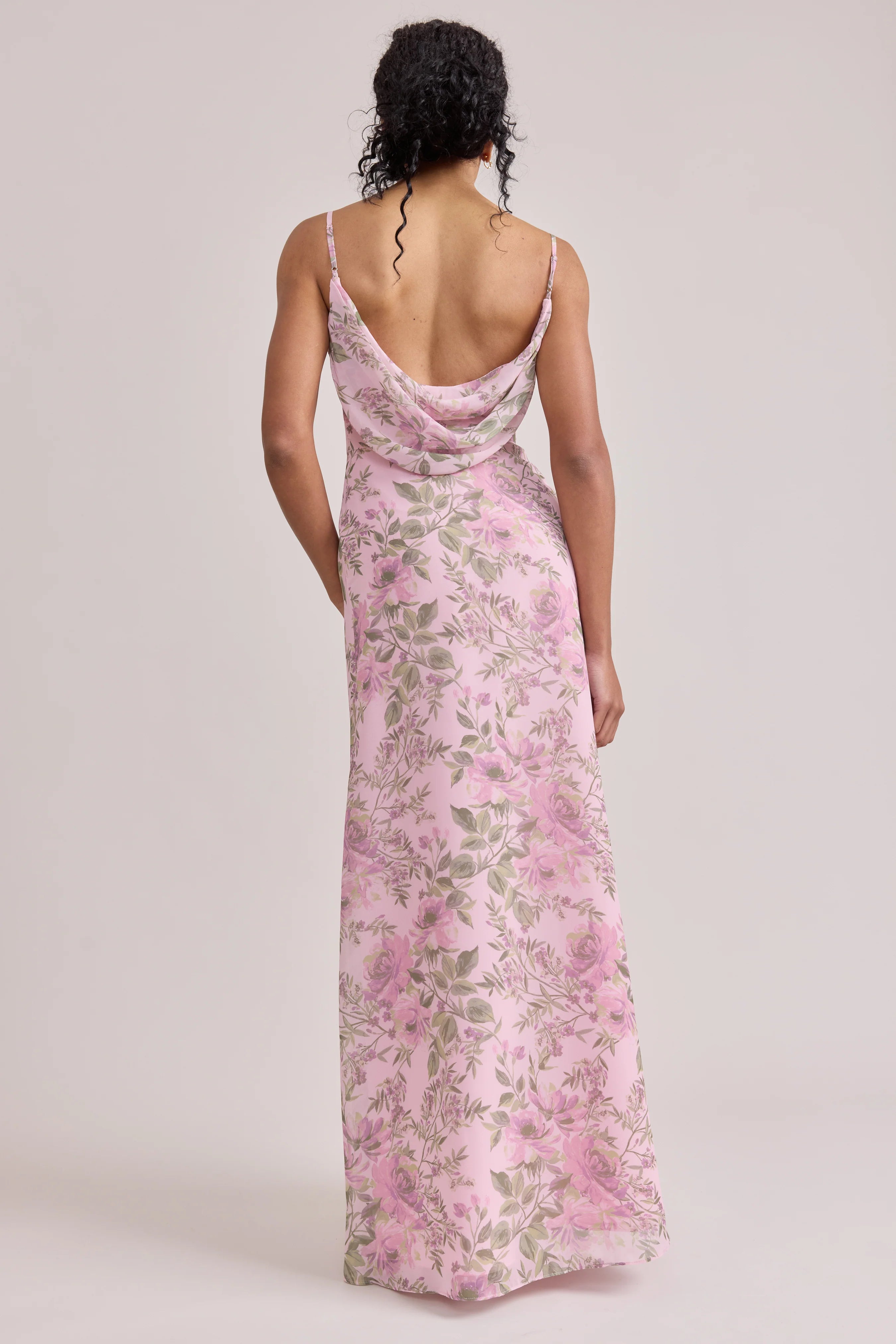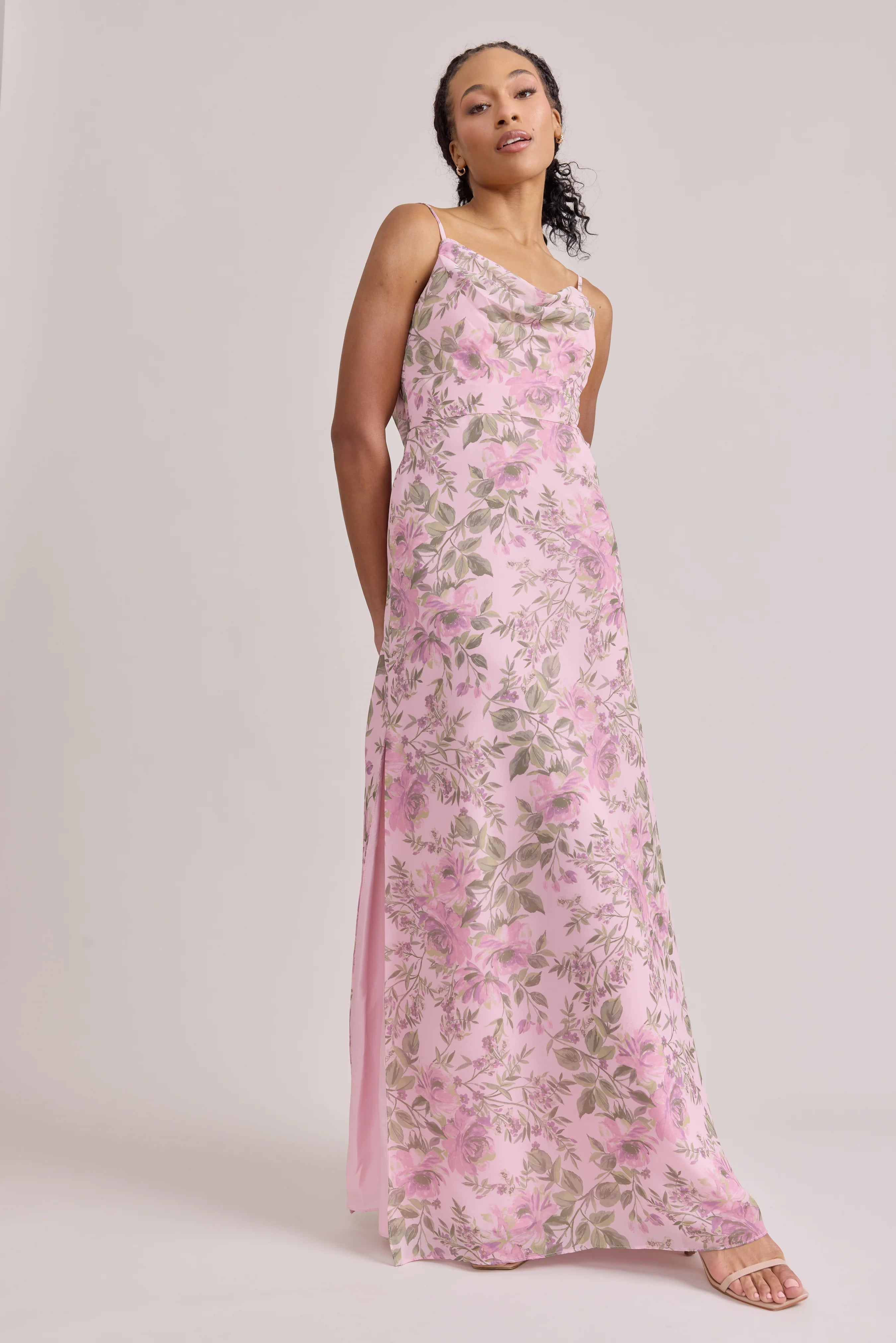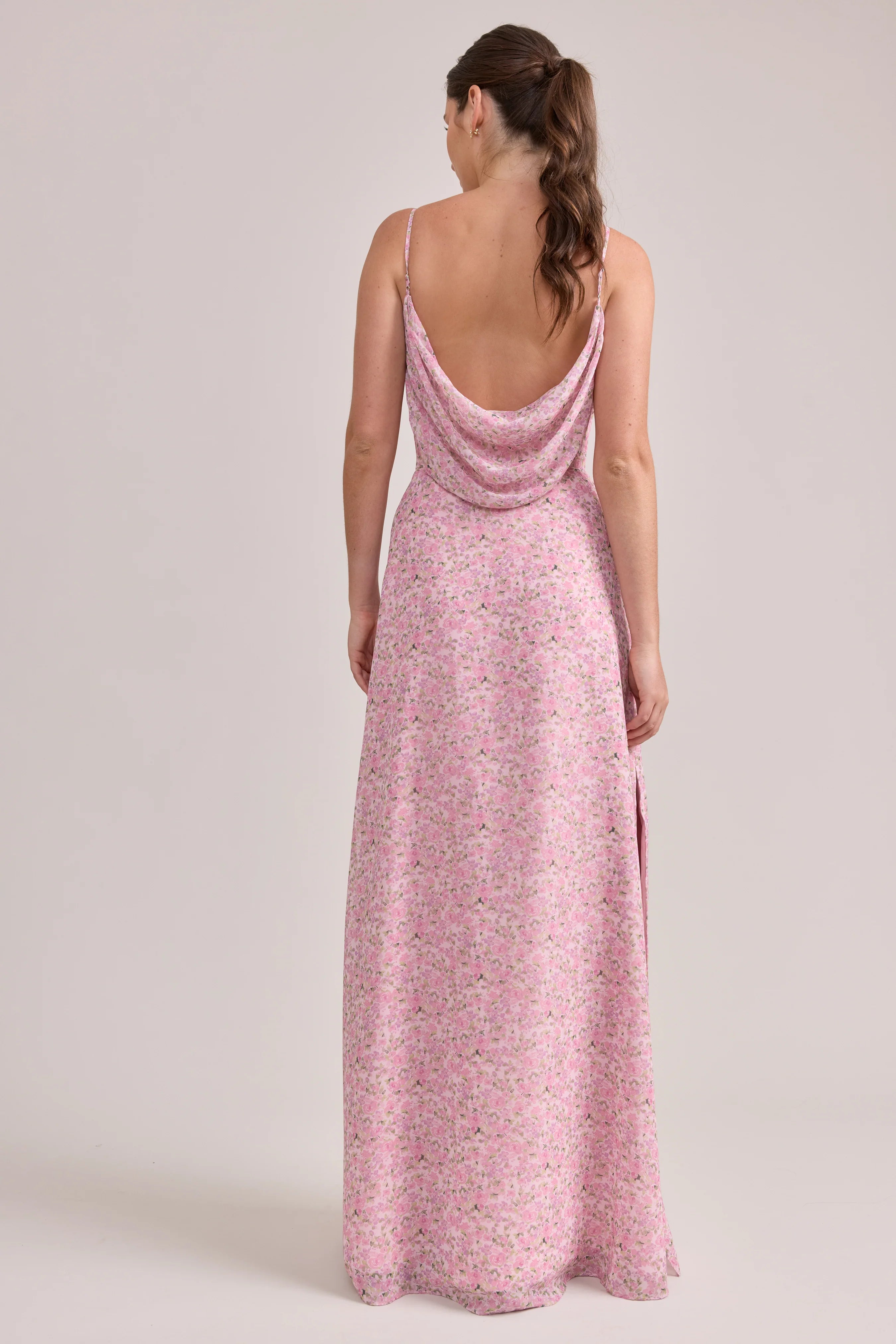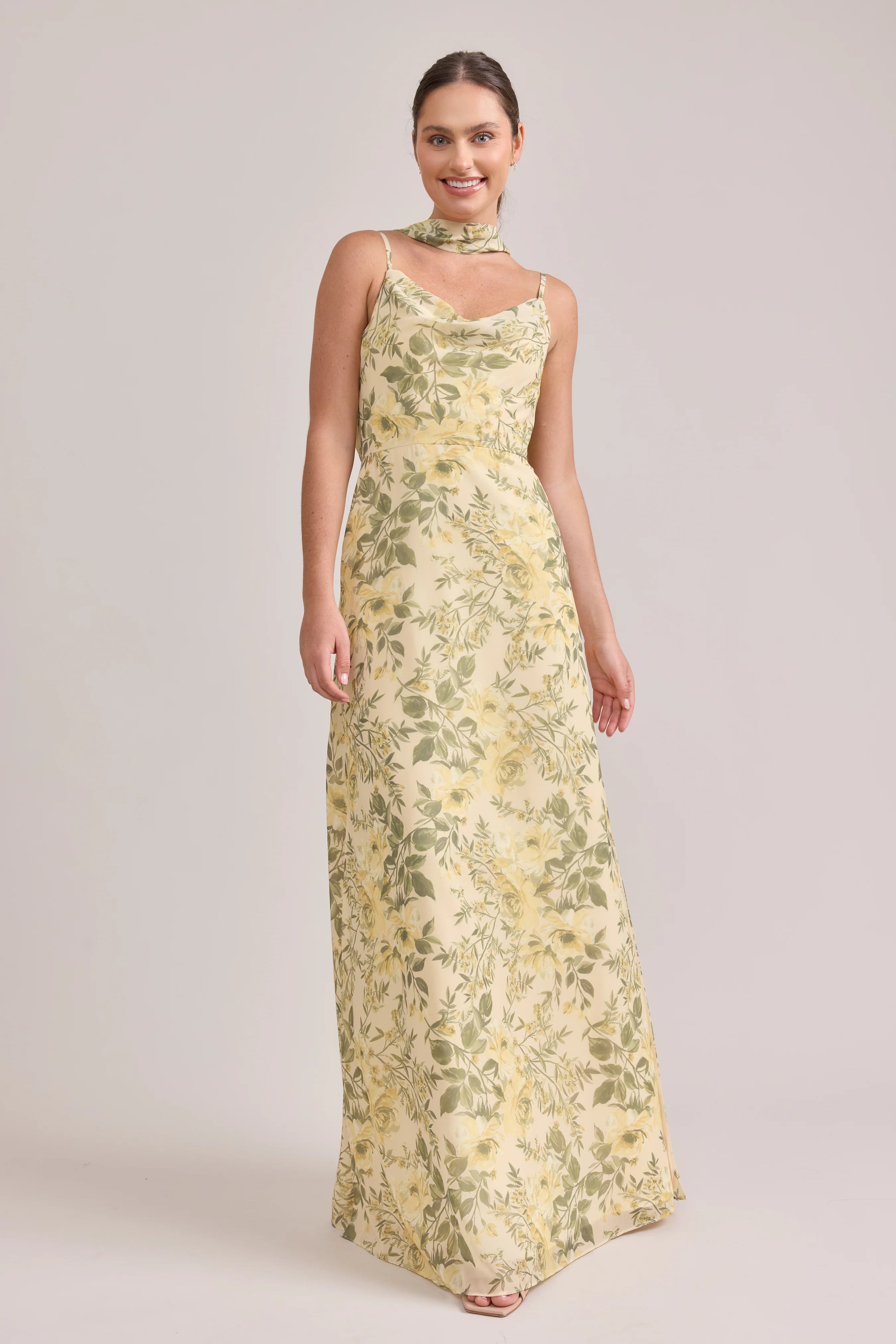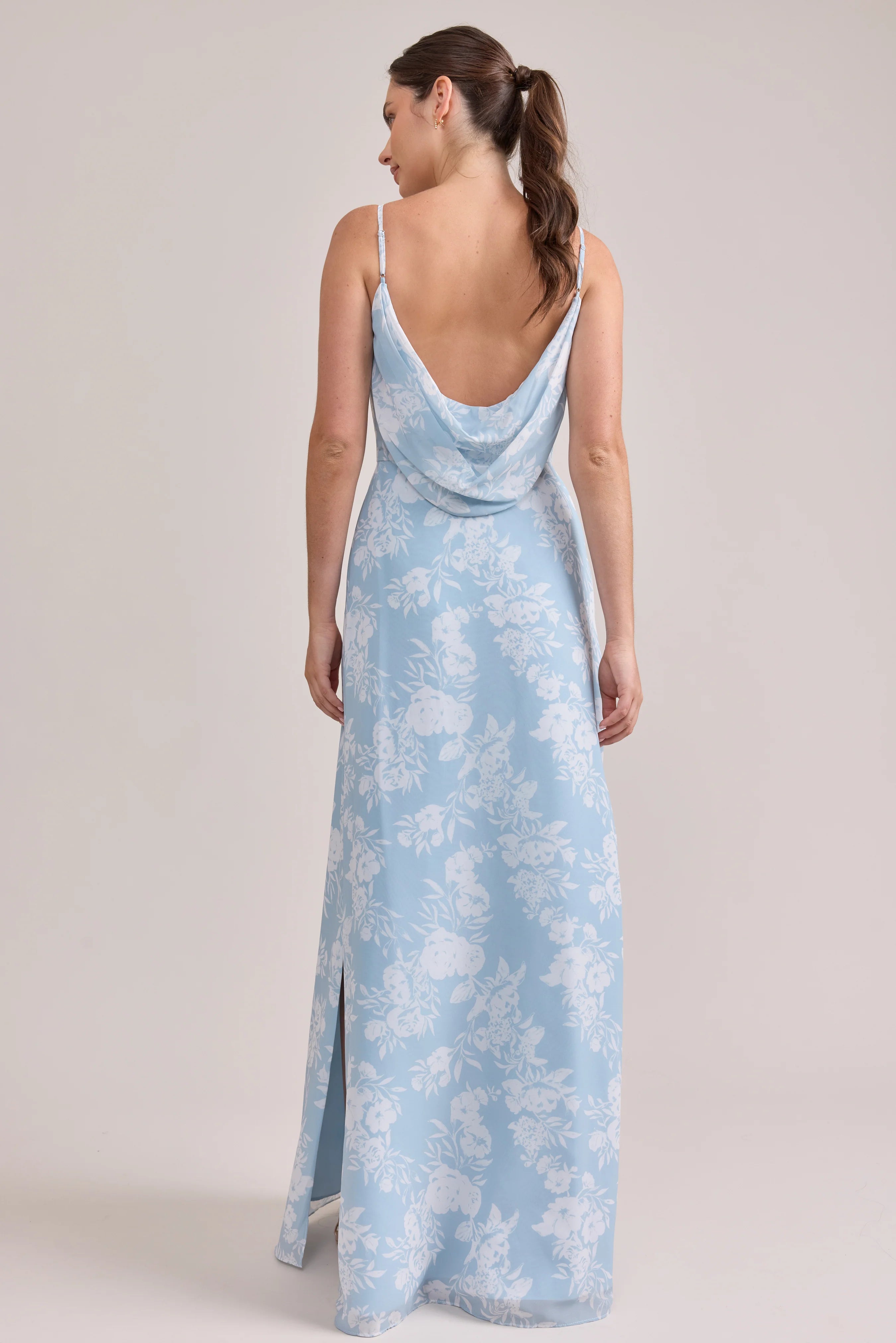 An update on a classic style, our Nadia dress will become your new favorite! Nadia is crafted with a slight empire waist to help provide a flattering fit for all body types! This chiffon dress also features side slits in the skirt with a modest cowl neck and an exaggerated swoop back past the waistline for a dramatically chic statement. Pair it with our Skye dress for a cohesive lineup.