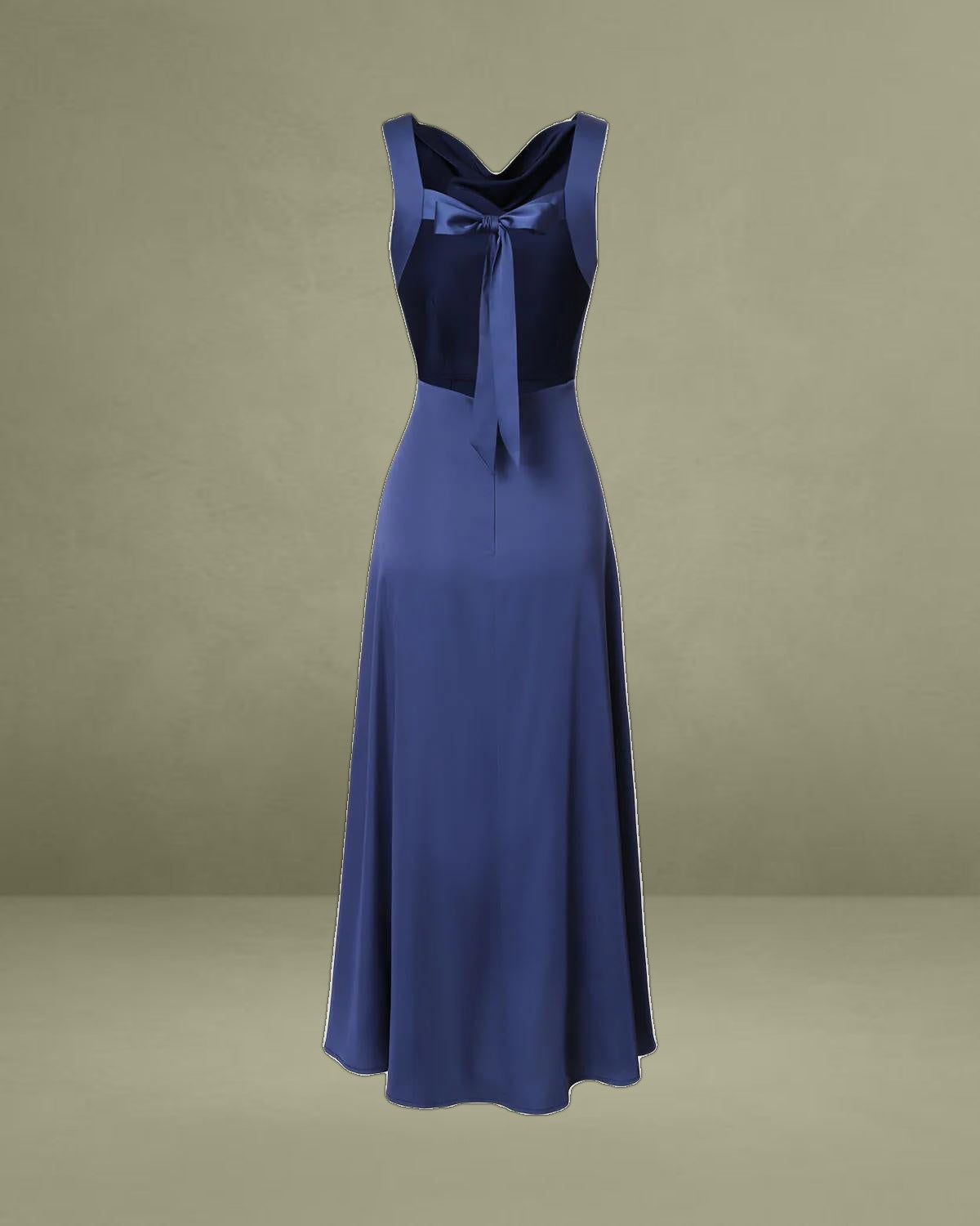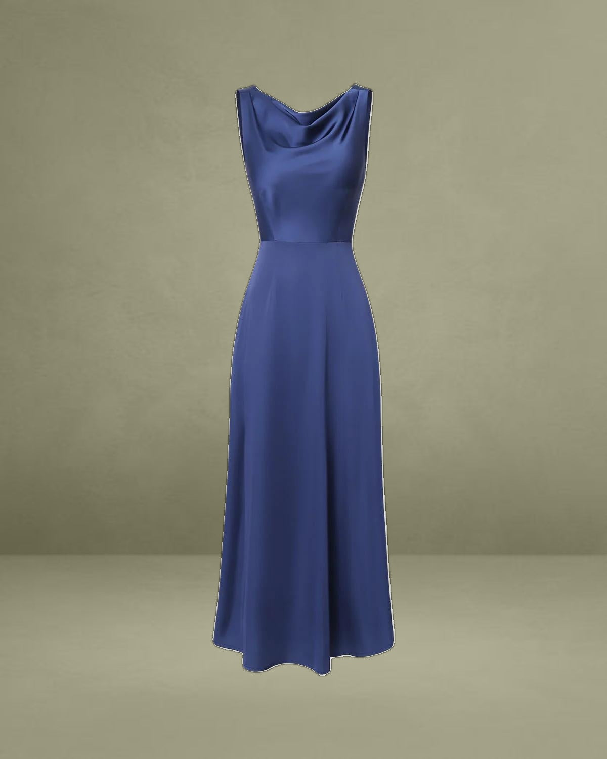 Elegantly crafted, the Navy Cowl Neck Satin Sleeveless Maxi Dress exudes timeless sophistication. Its silky satin fabric, graceful cowl neckline, and floor-length silhouette make it perfect for formal occasions, evening events, or weddings. A stunning choice for those seeking effortless glamour and refined style.