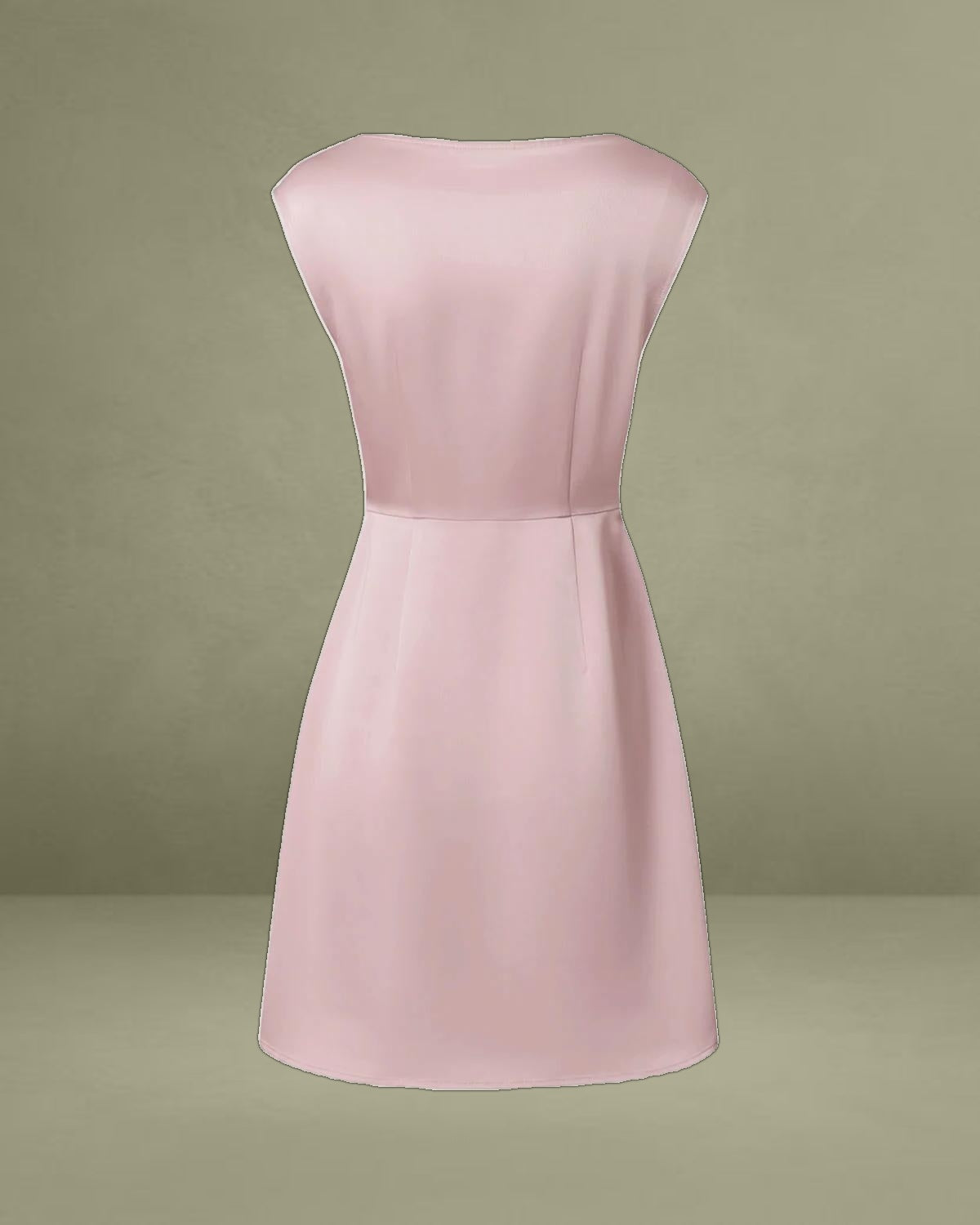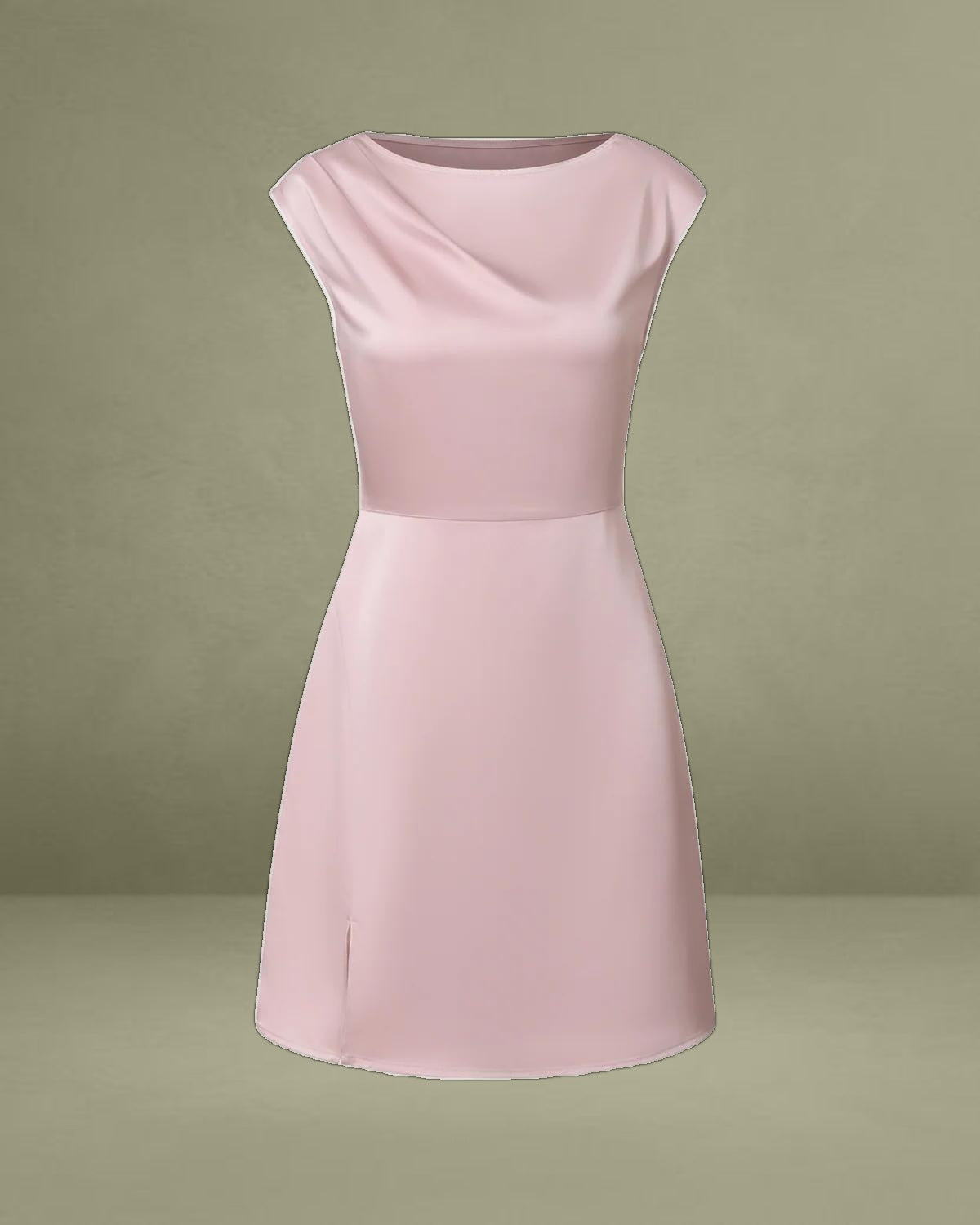 Crafted from silky satin, this dress features a graceful boat neckline that highlights your collarbone, while the figure-hugging silhouette and mini length add a playful edge. Perfect for cocktail parties, date nights, or special occasions, its soft pink hue exudes feminine charm.