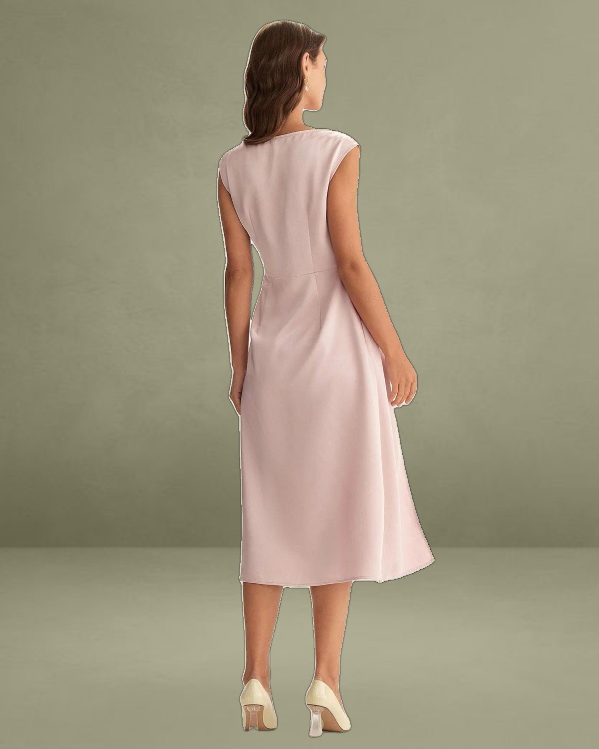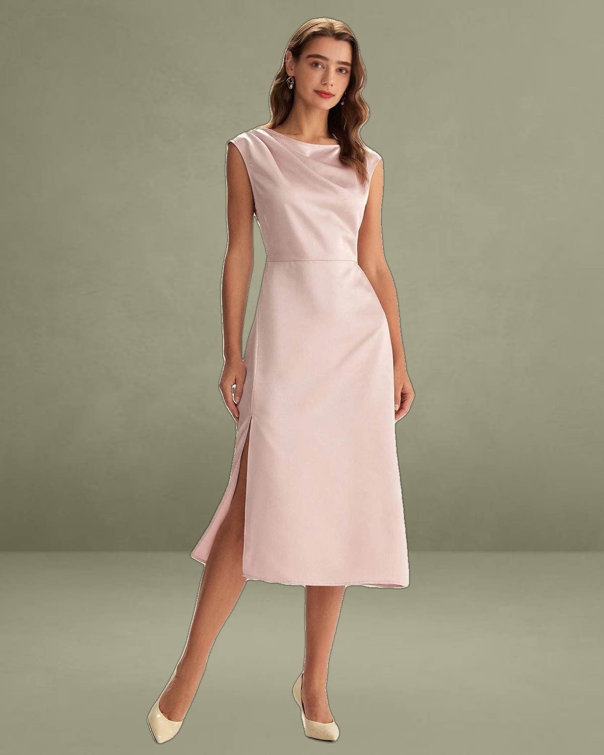 Made from luxurious satin with a gentle sheen, this dress has a beautiful boat neckline and a smooth sleeveless design. The figure-hugging silhouette is accentuated by a slight side slit, adding a bit of charm and allowing for easy movement. Ideal for special events, evenings out, or a romantic date, this midi dress is a symbol of timeless femininity.
