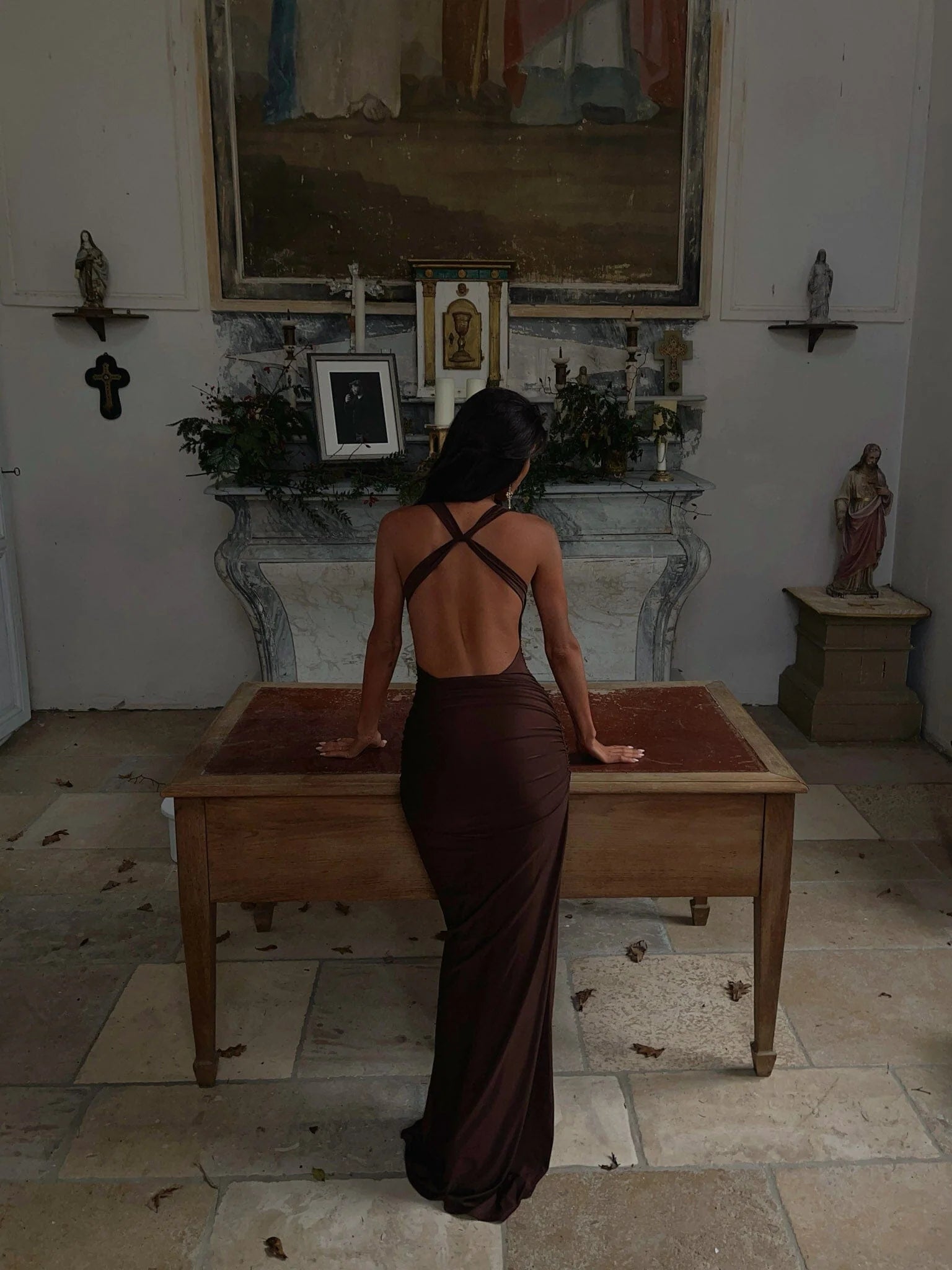 Make an unforgettable statement in the 'Pria Maxi Dress' in Chocolate!