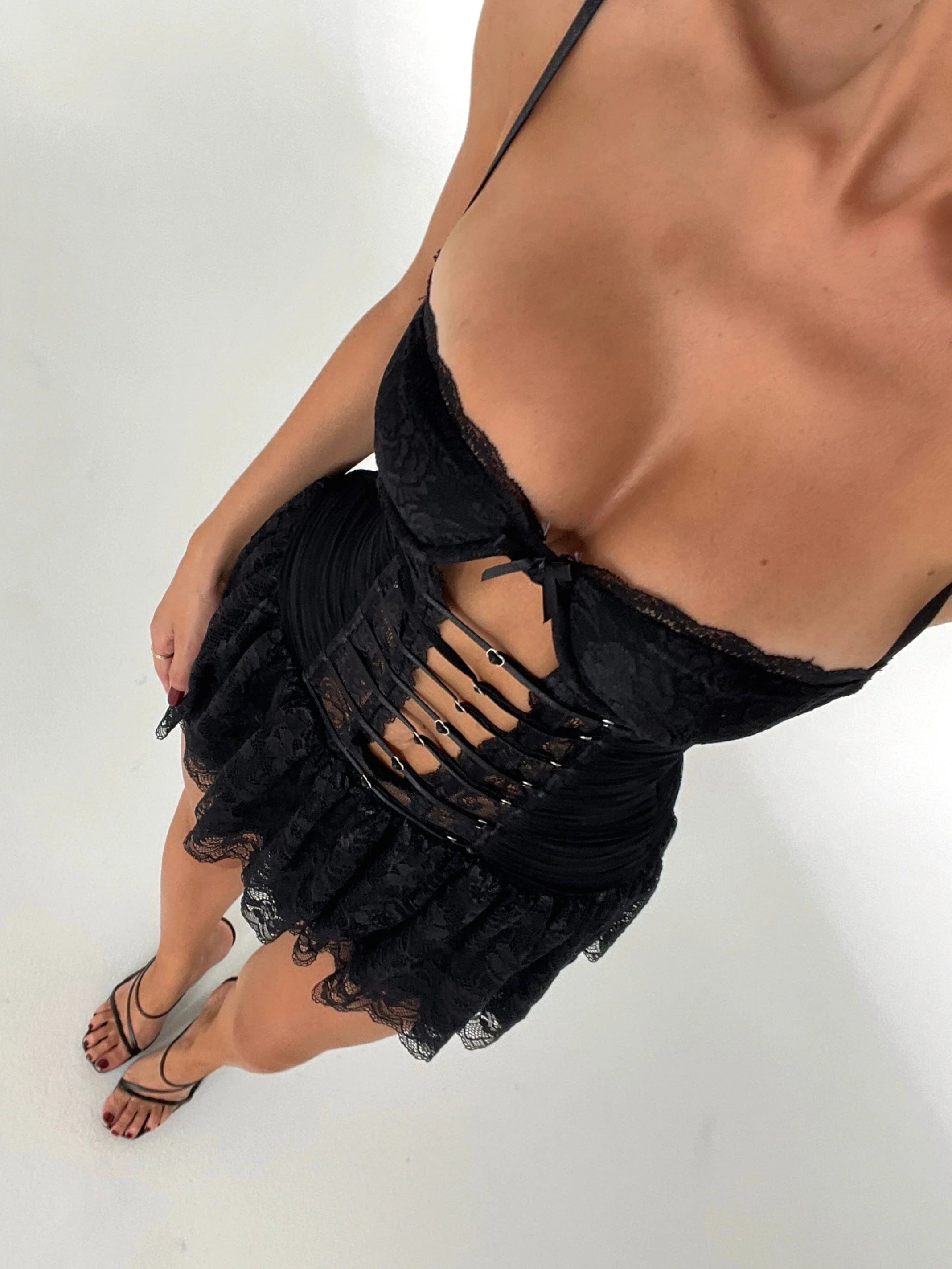 Featuring an underwire bust with a frill sweetheart neckline and thin adjustable shoulder straps to add a touch of femininity to the style. Requim?has a layered hemline and is crafted from a floral printed stretch mesh lace fabrication! Requim has a cut out feature down the centre front which is detailed with small silver 'O' rings throughout. Requim is complete with with an invisible zip closure for easy on-off.