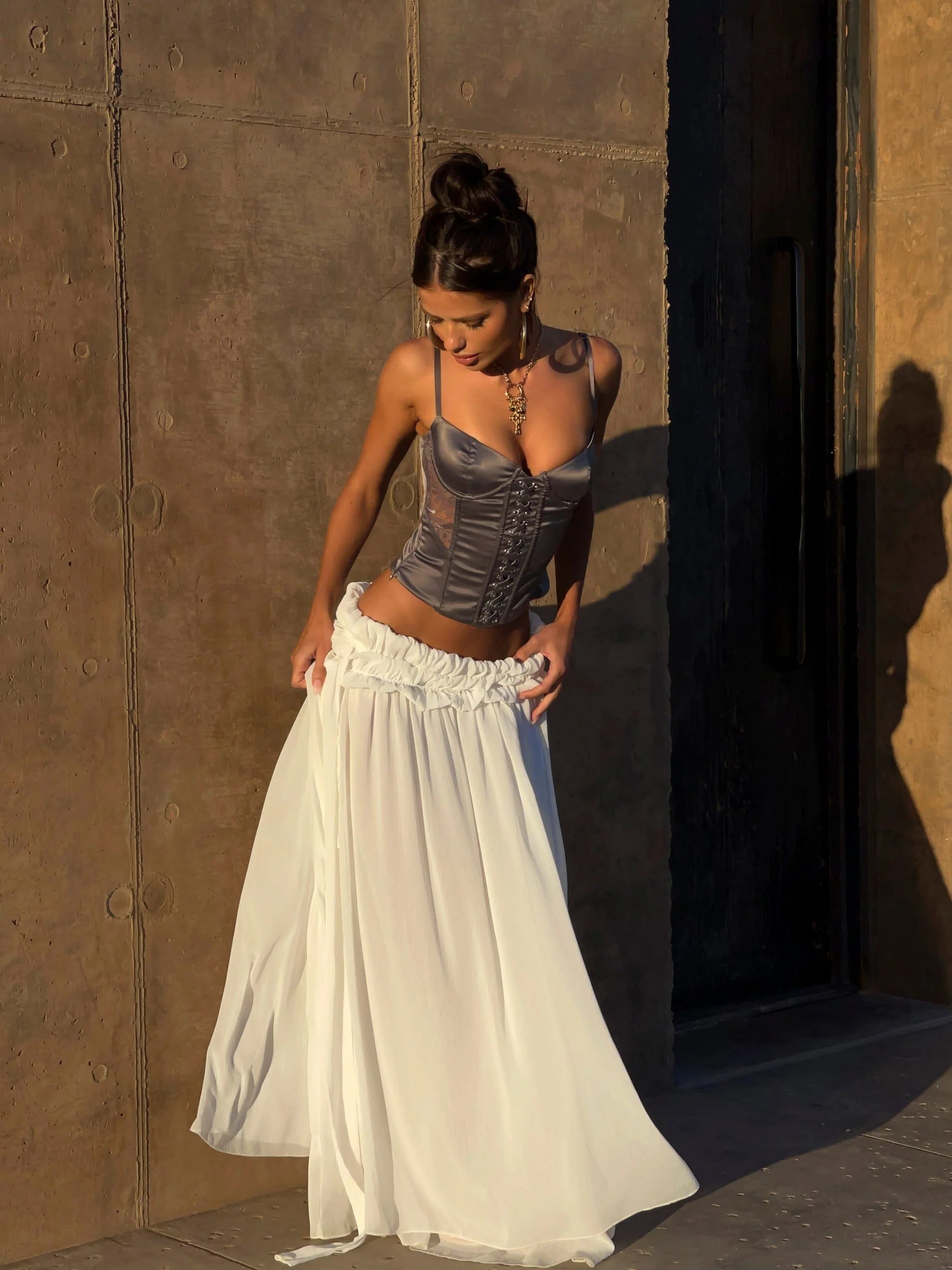 Command attention in the Sade Corset Top in Steel. Crafted from sleek satin, this structured corset features boning for a sculpted fit, while silver eyelets and crisscross lacing add an edgy touch. Lace panel detailing enhances the look, bringing a bold yet feminine contrast.