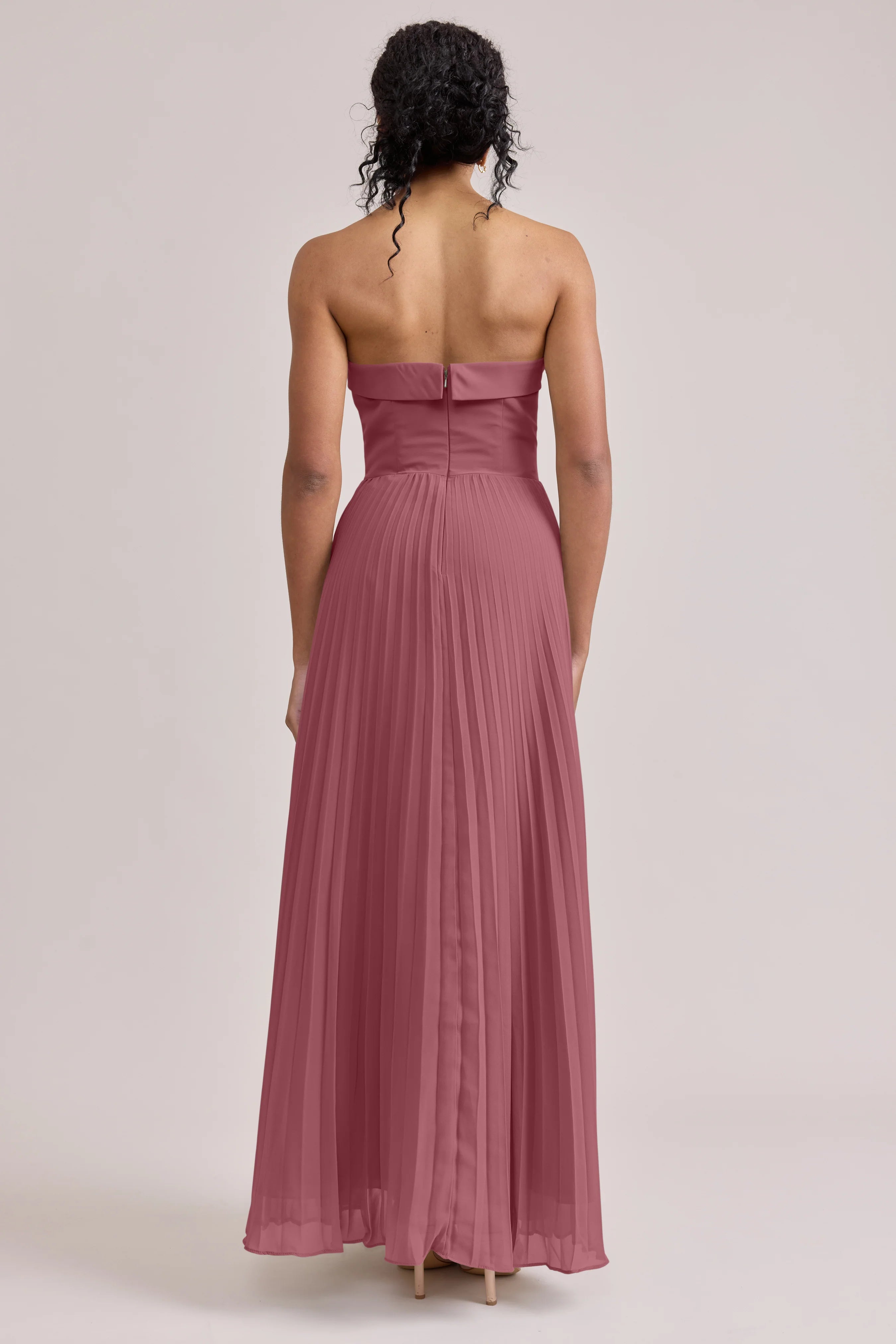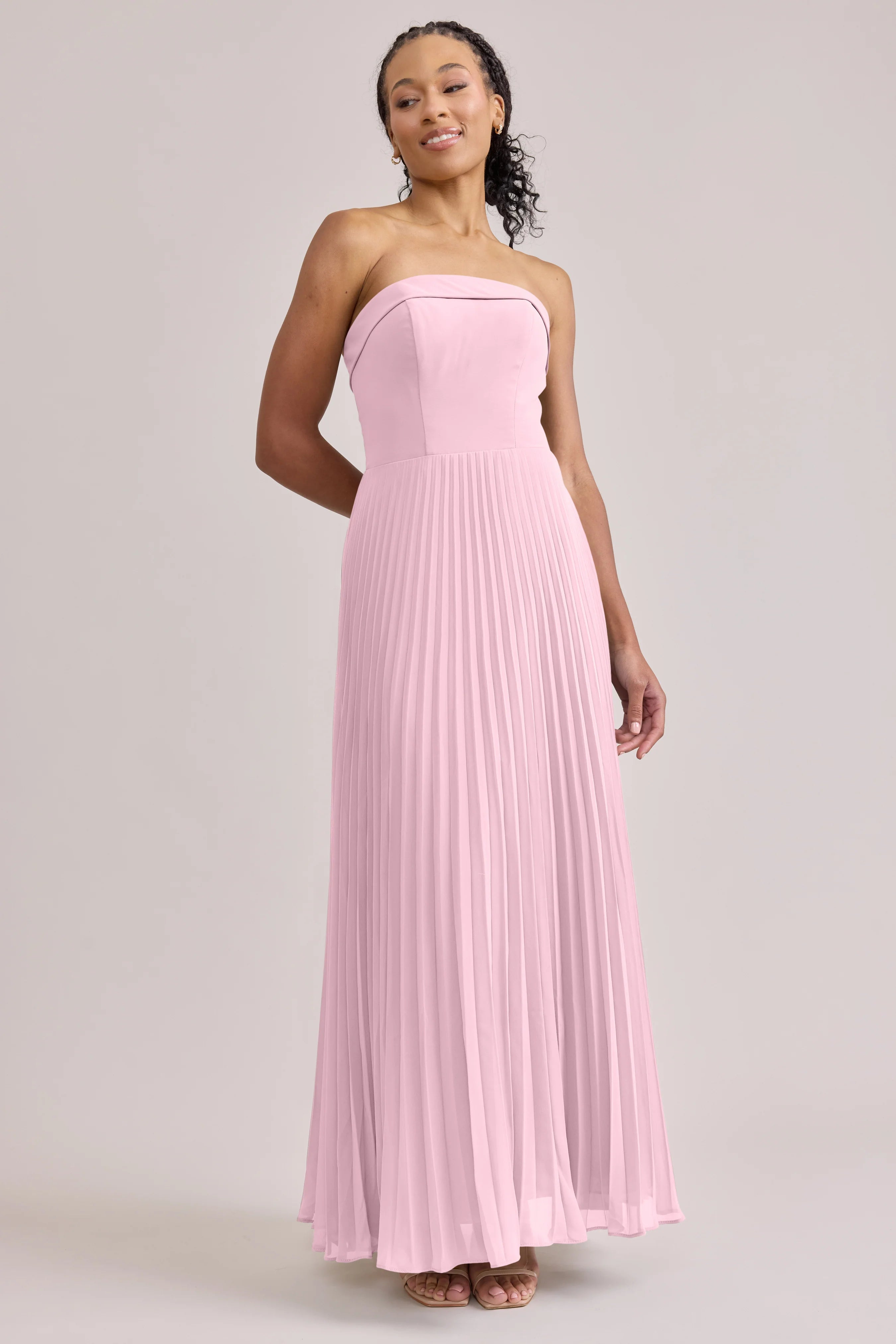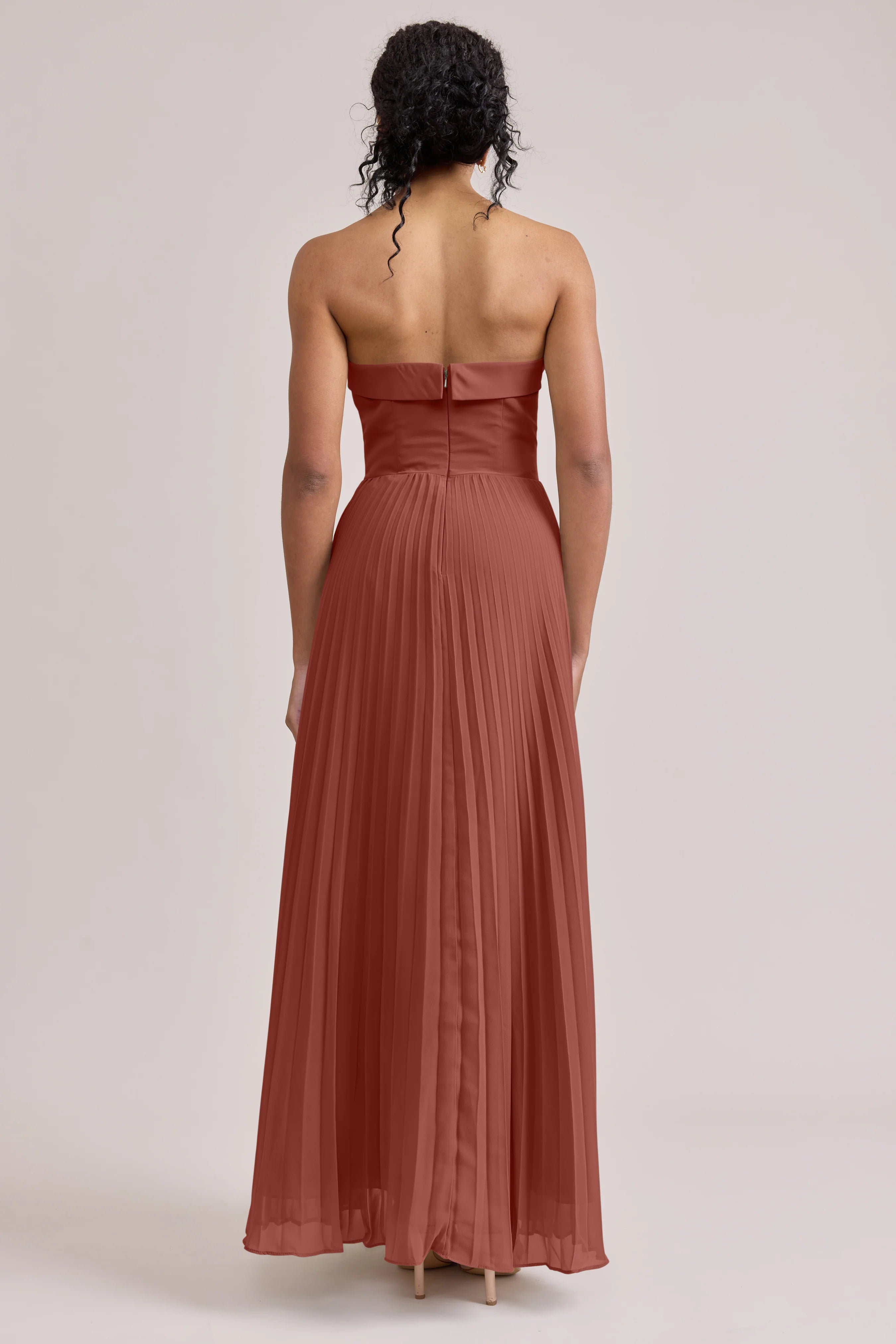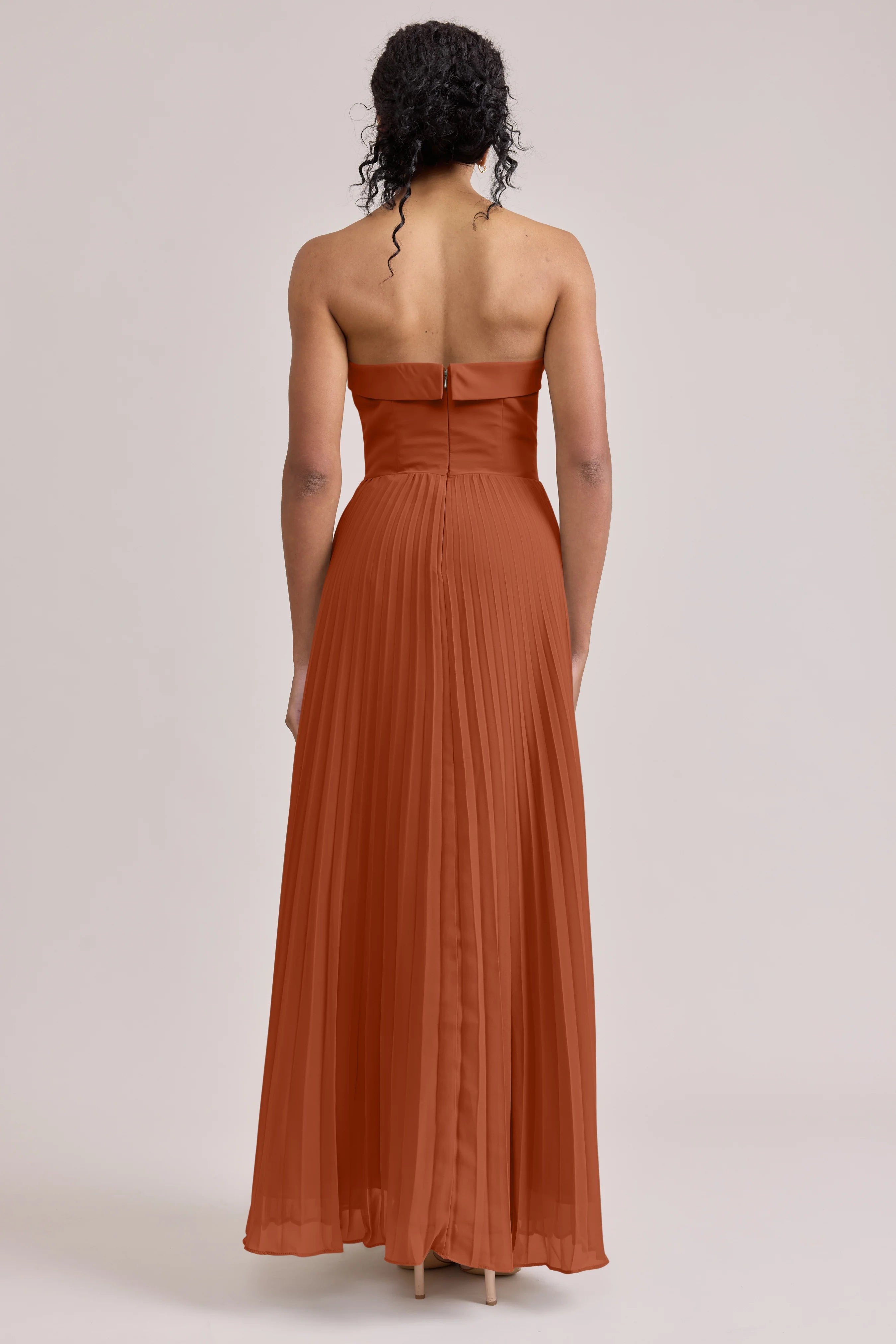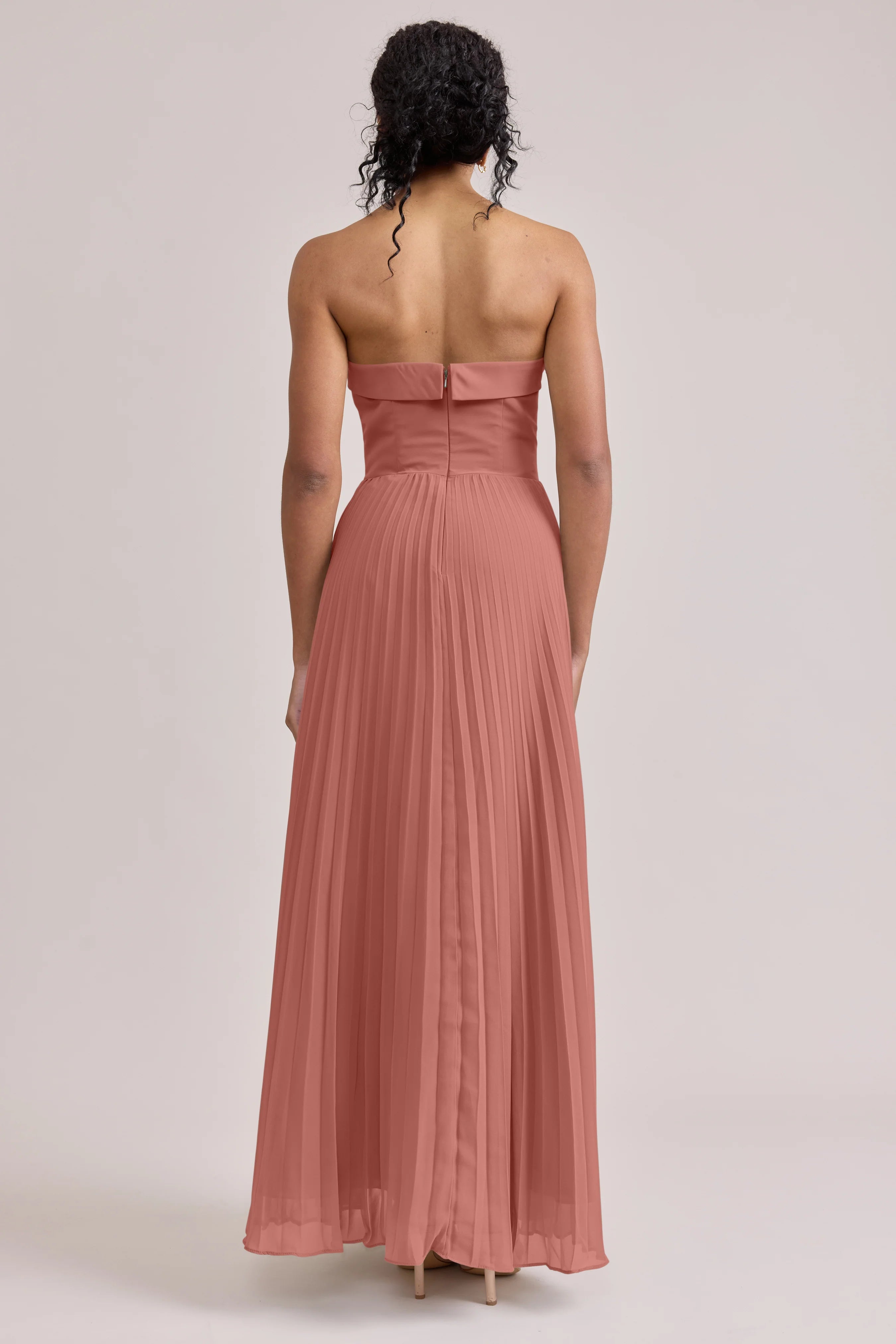 The best-selling Saylor Satin Pleated Dress is now available in Chiffon. A jaw-dropping strapless dress, Saylor will become essential for your elevated wedding line-up. Saylor features a fold over straight-cut neckline and back in our regular chiffon fabric that flows into a vertical pleating skirt at a dropped waistline. Pair with our floral chiffon dresses for the perfect “European Garden” look!
