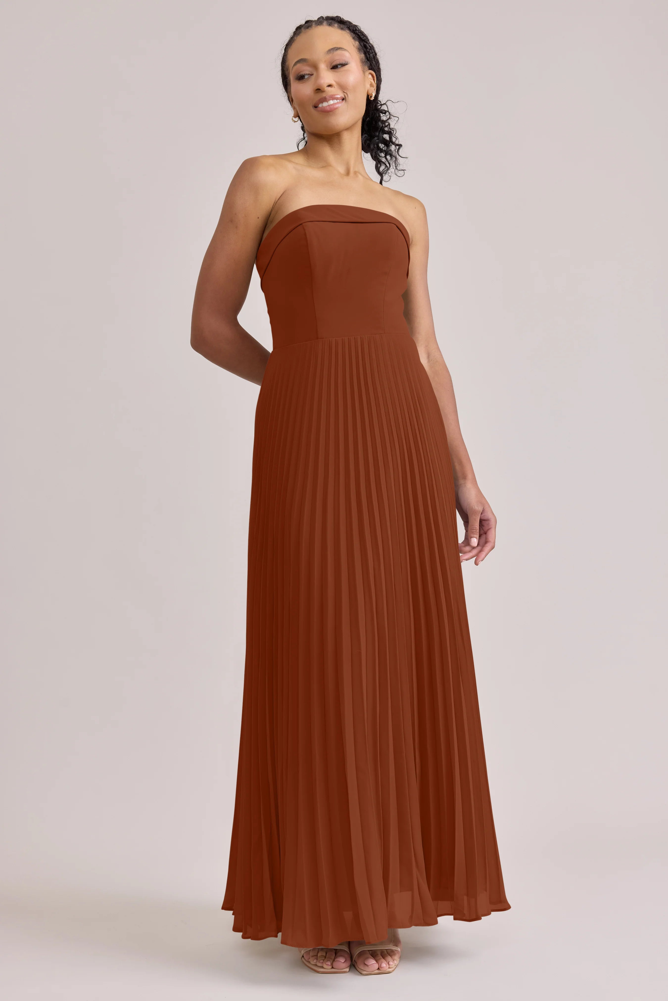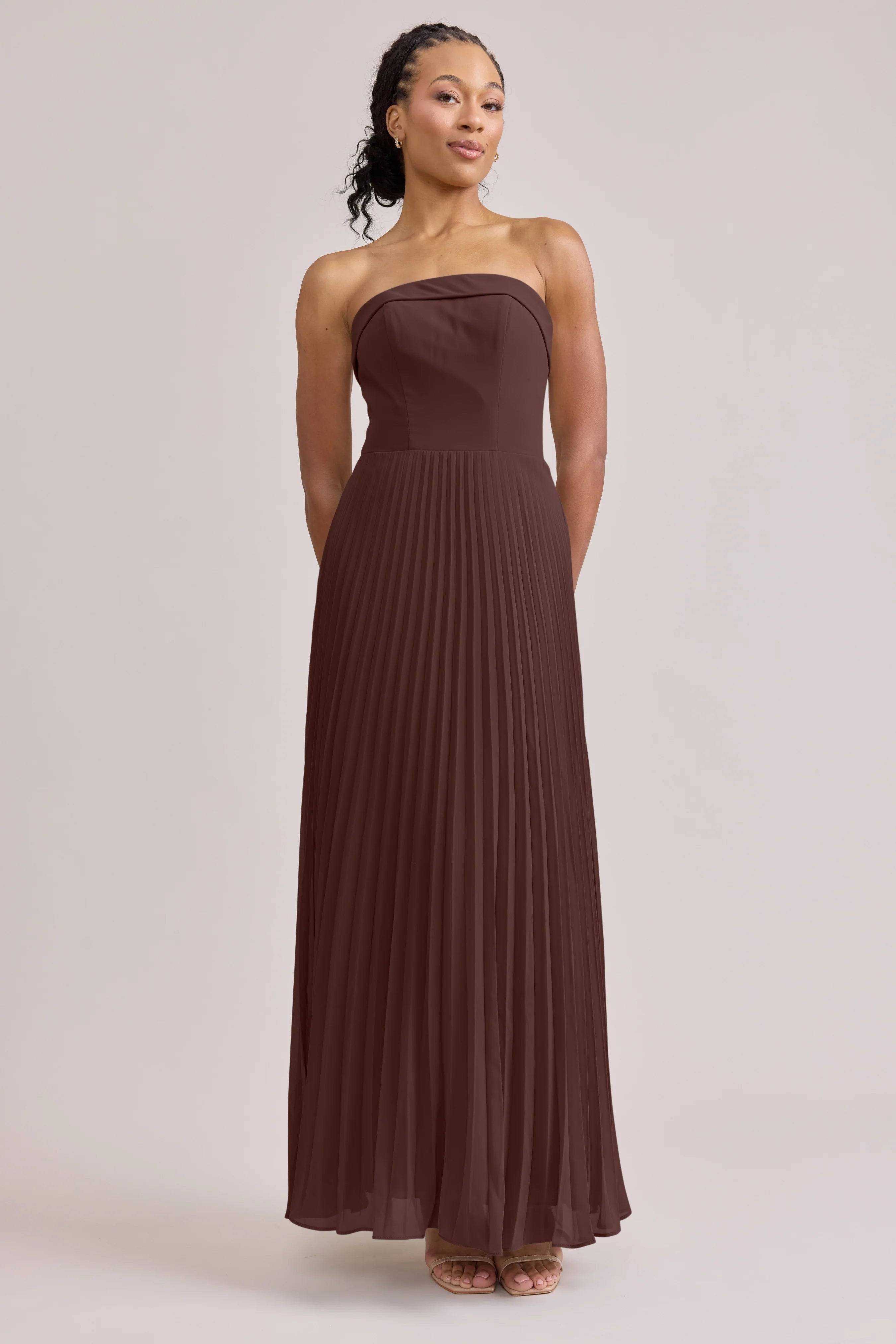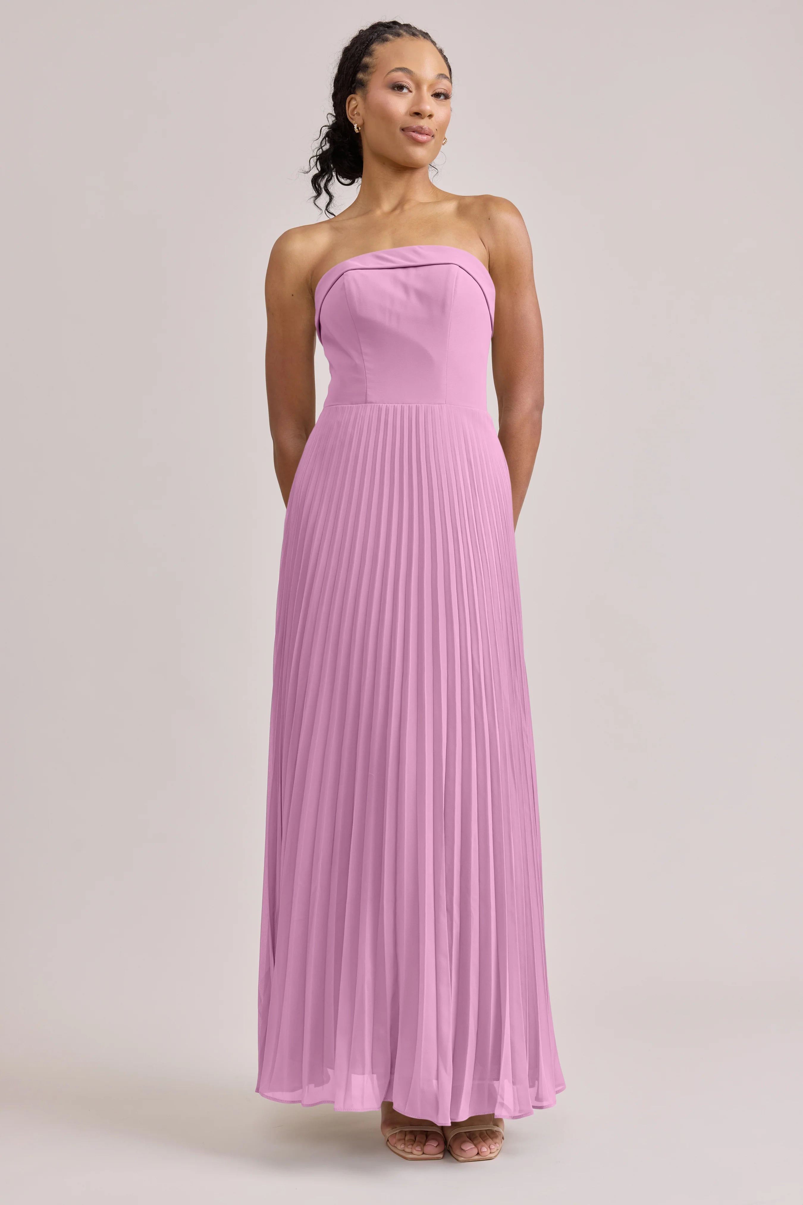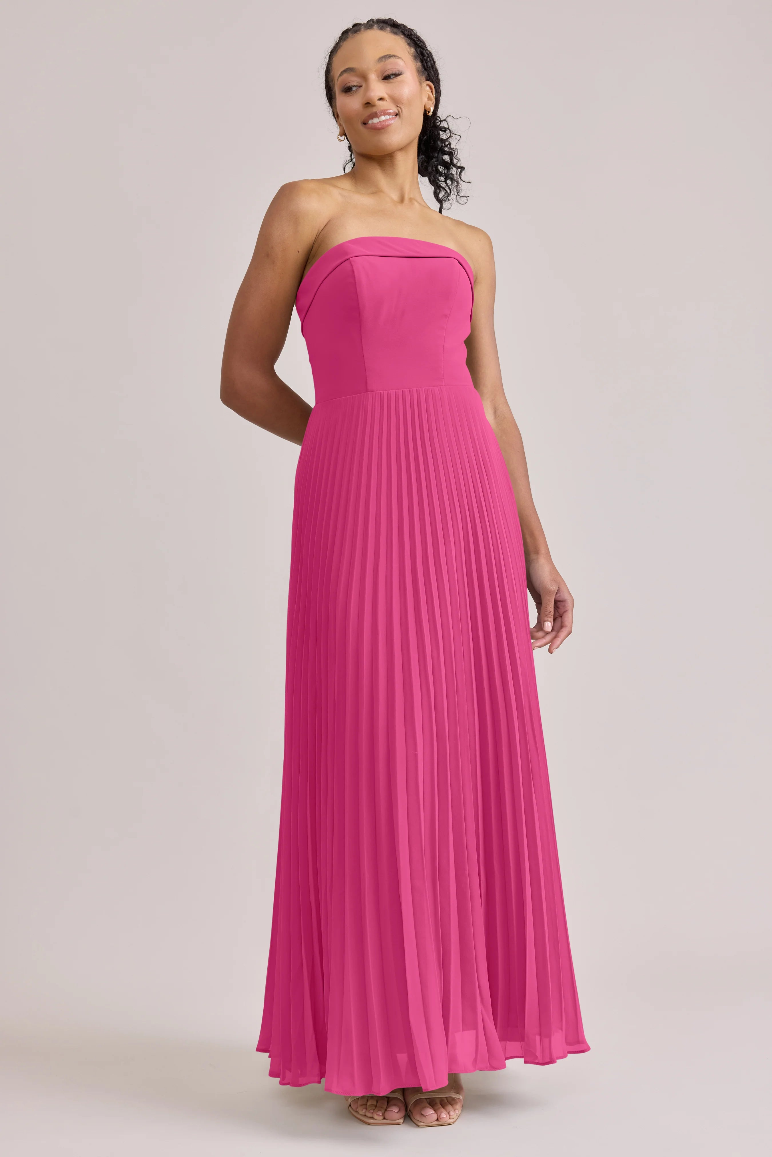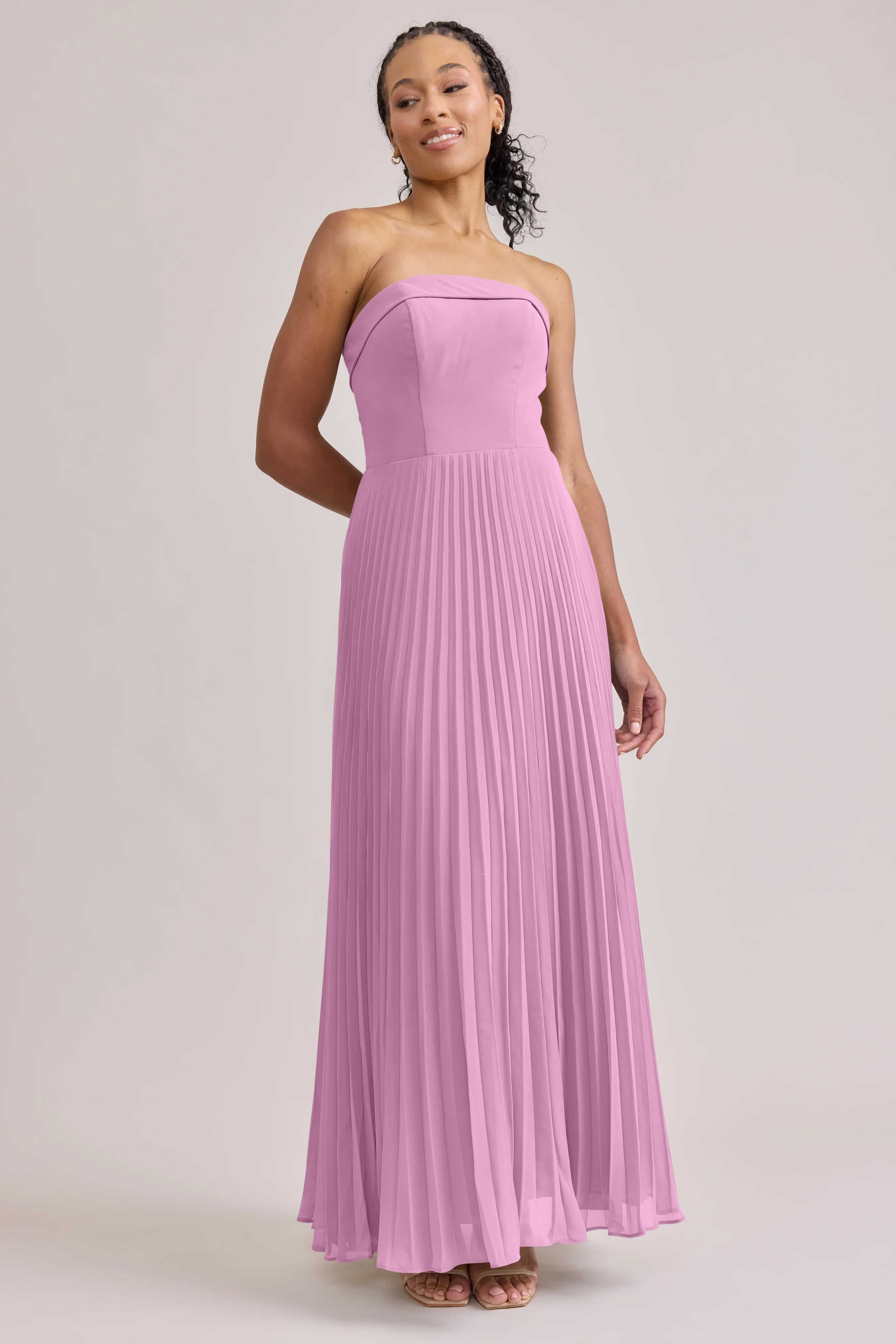 The best-selling Saylor Satin Pleated Dress is now available in Chiffon. A jaw-dropping strapless dress, Saylor will become essential for your elevated wedding line-up. Saylor features a fold over straight-cut neckline and back in our regular chiffon fabric that flows into a vertical pleating skirt at a dropped waistline. Pair with our floral chiffon dresses for the perfect “European Garden” look!