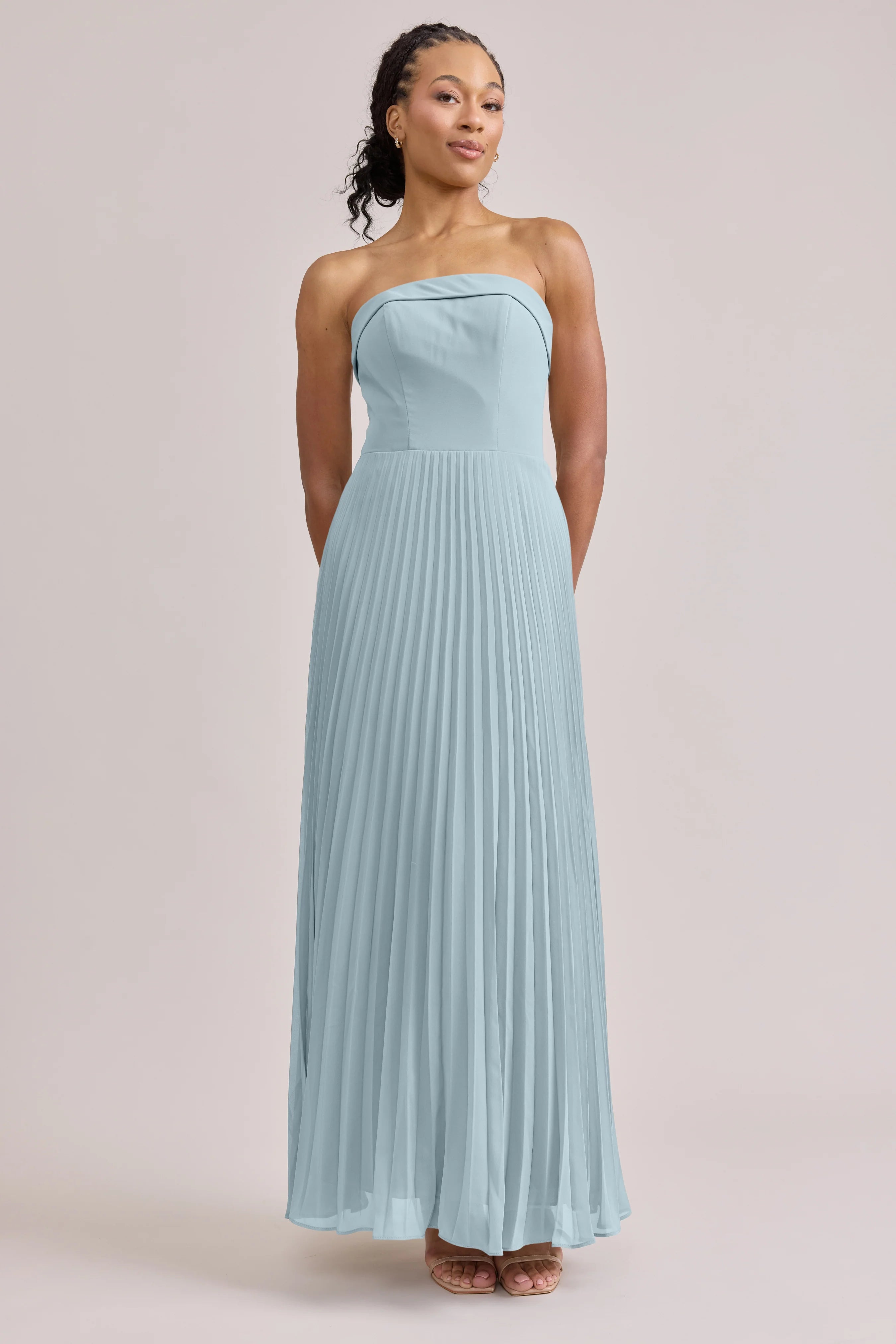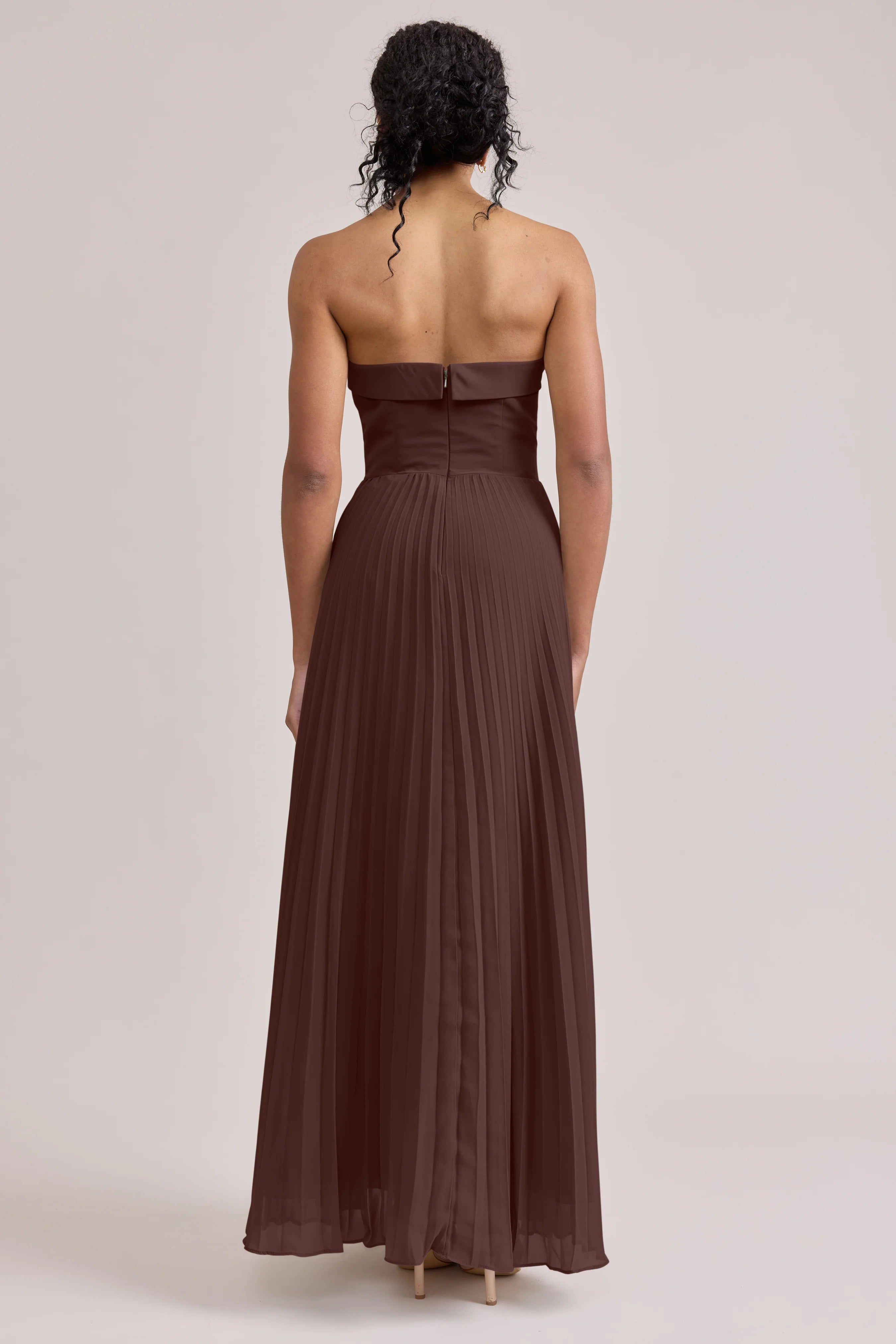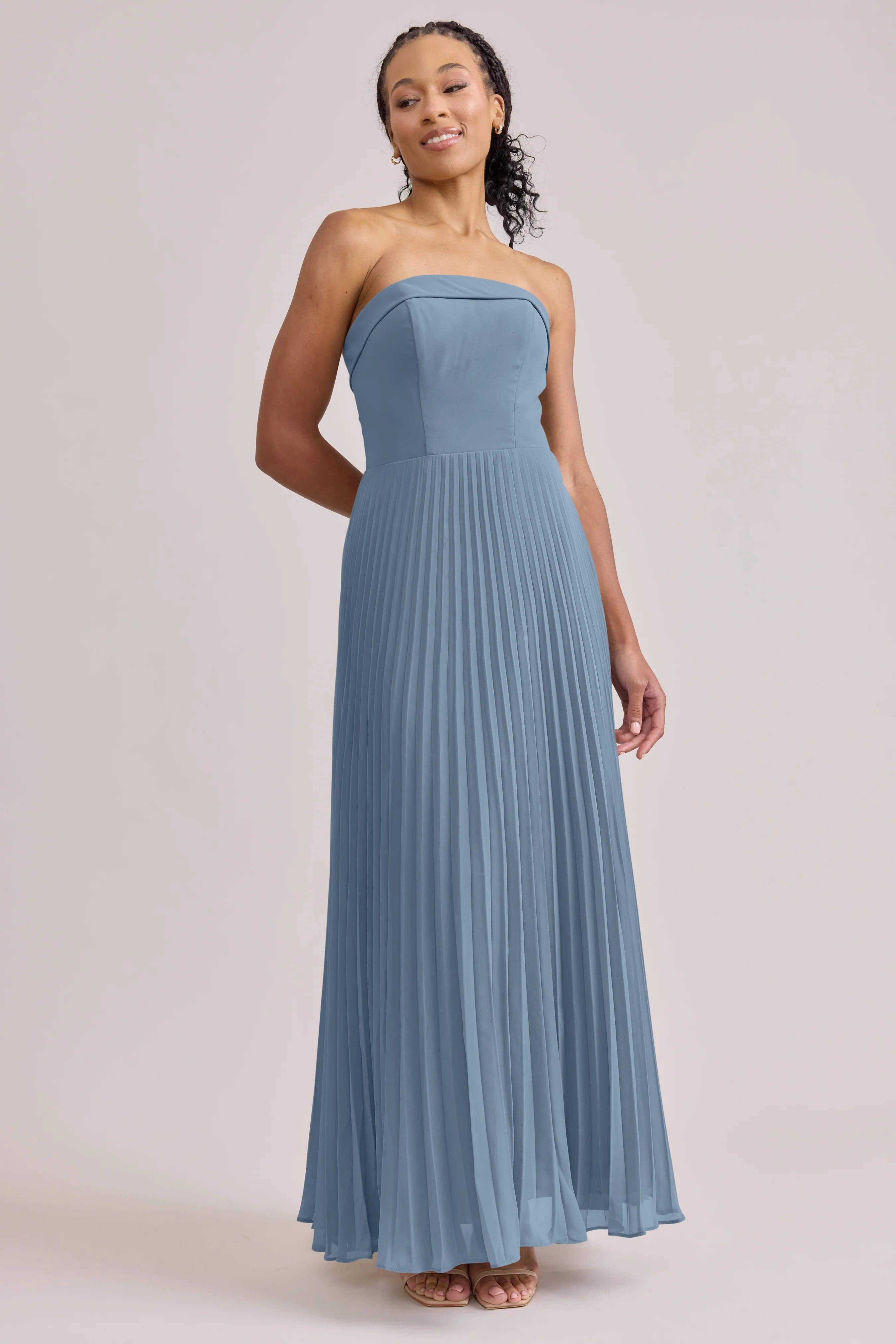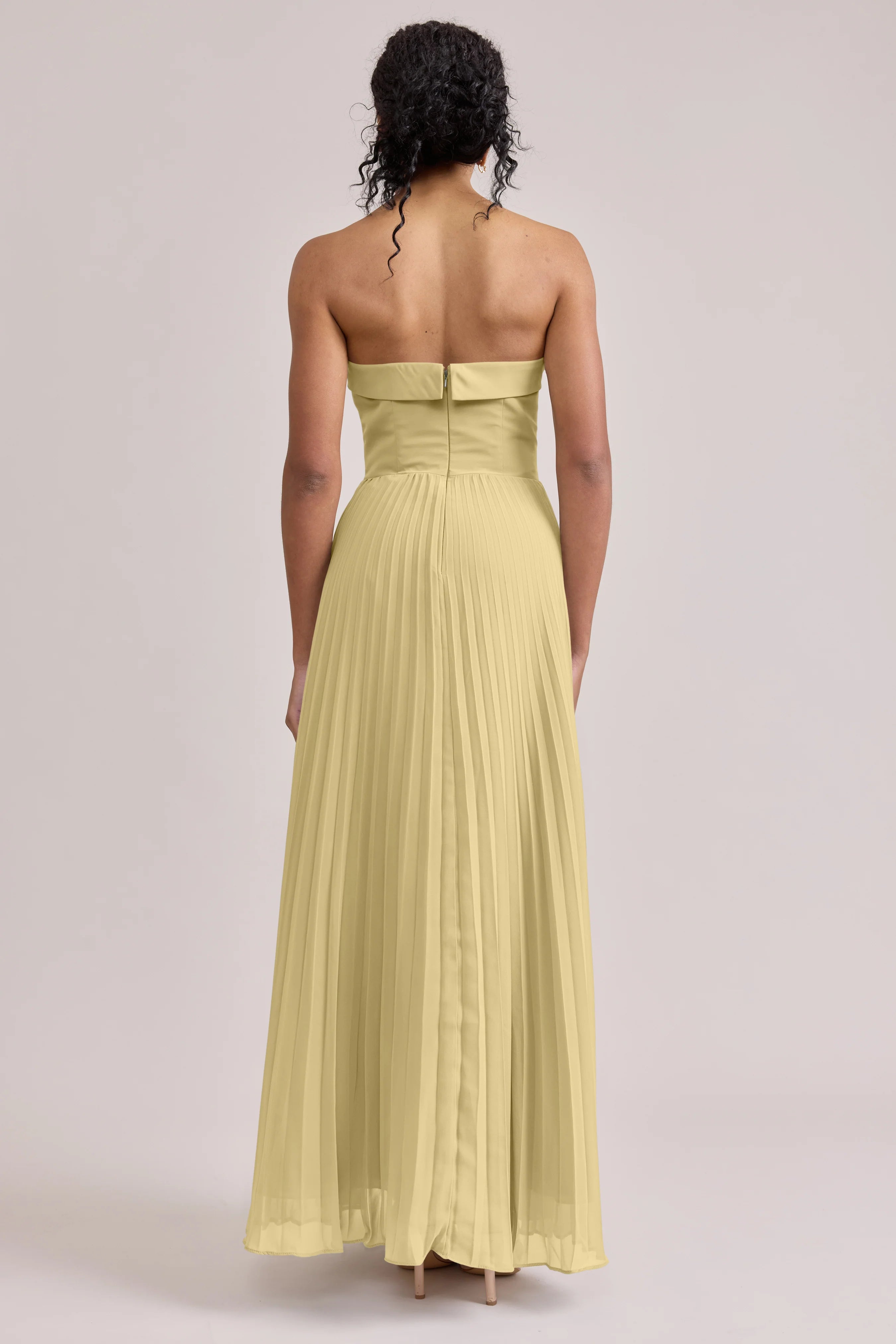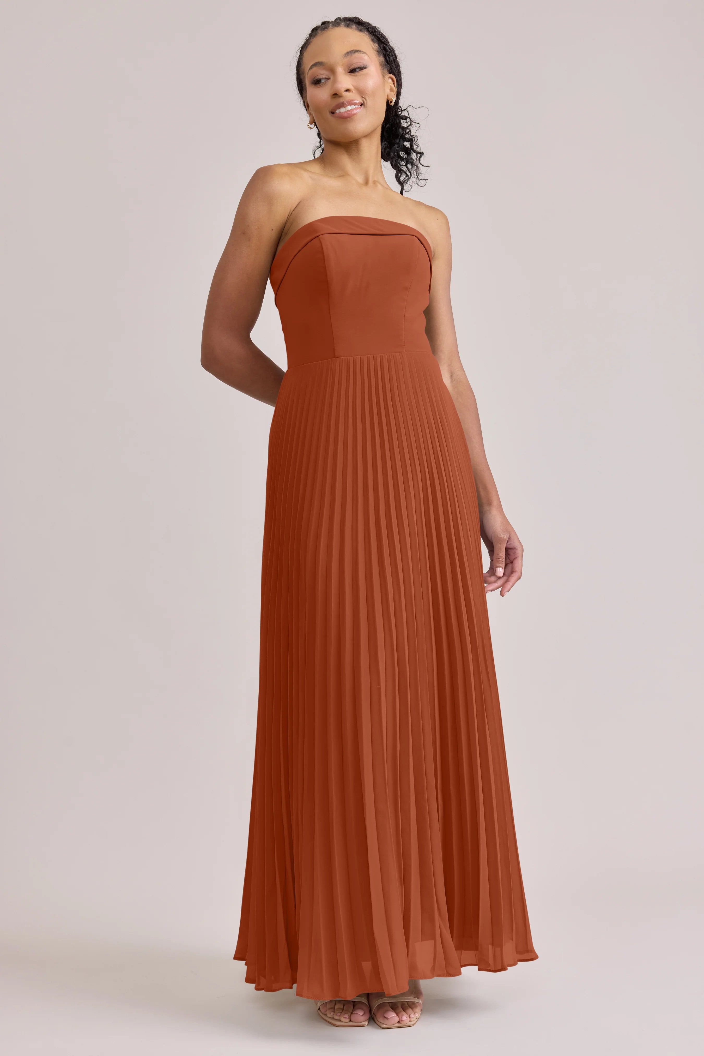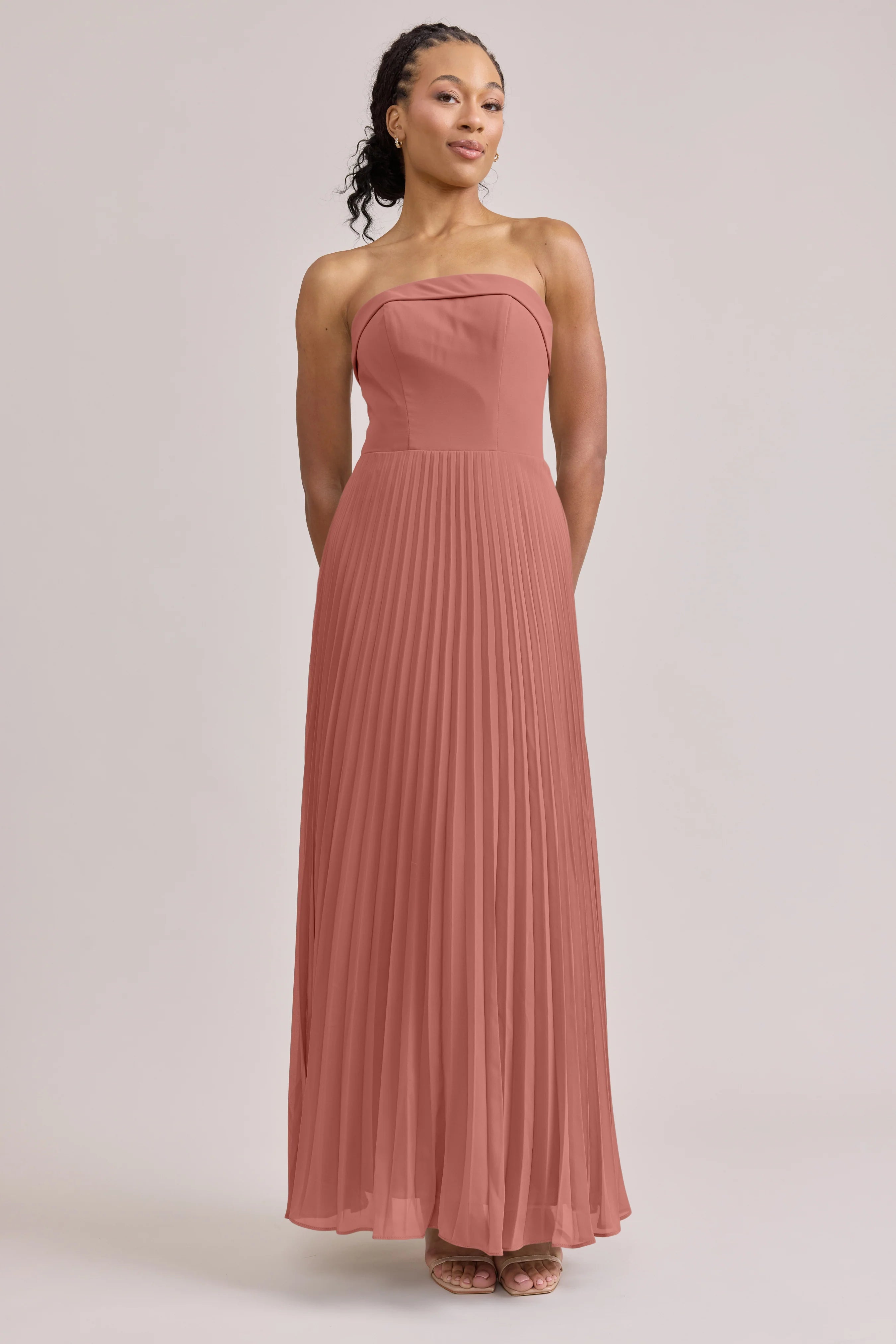 The best-selling Saylor Satin Pleated Dress is now available in Chiffon. A jaw-dropping strapless dress, Saylor will become essential for your elevated wedding line-up. Saylor features a fold over straight-cut neckline and back in our regular chiffon fabric that flows into a vertical pleating skirt at a dropped waistline. Pair with our floral chiffon dresses for the perfect “European Garden” look!