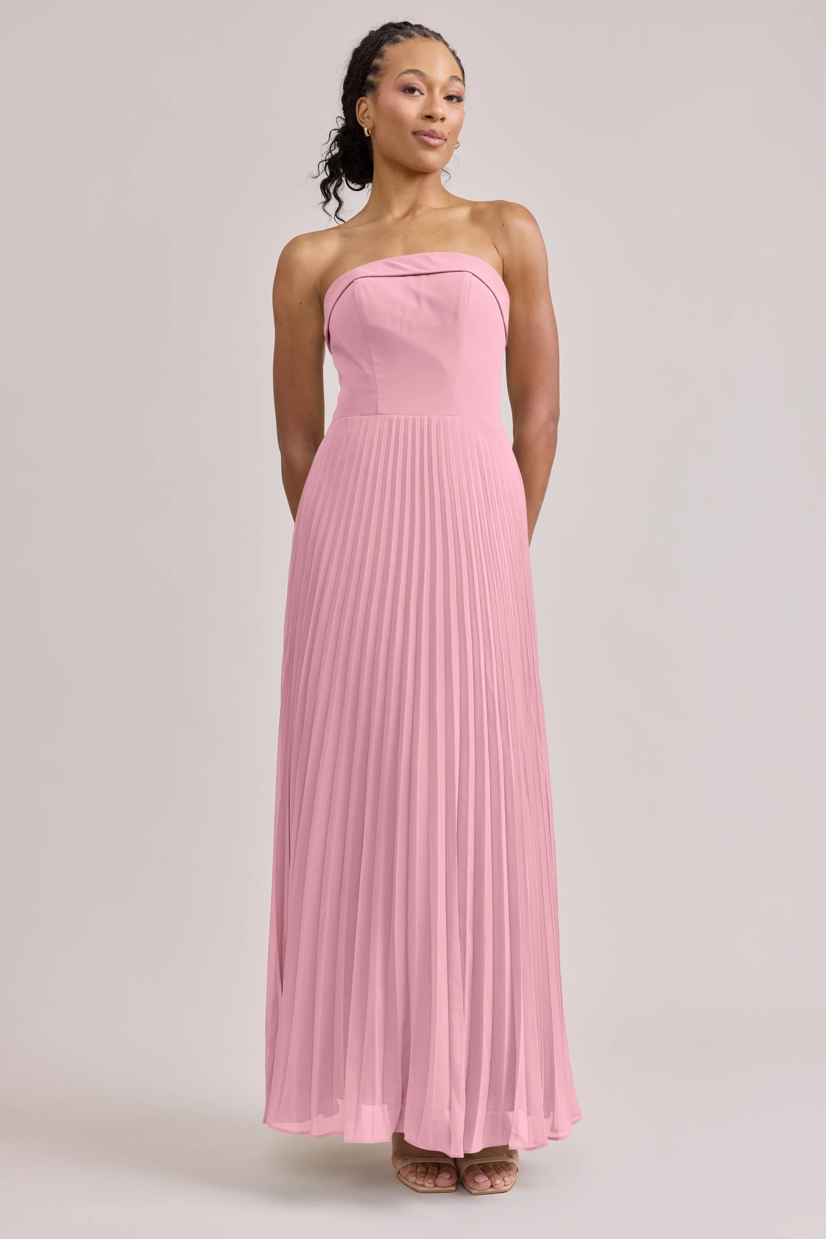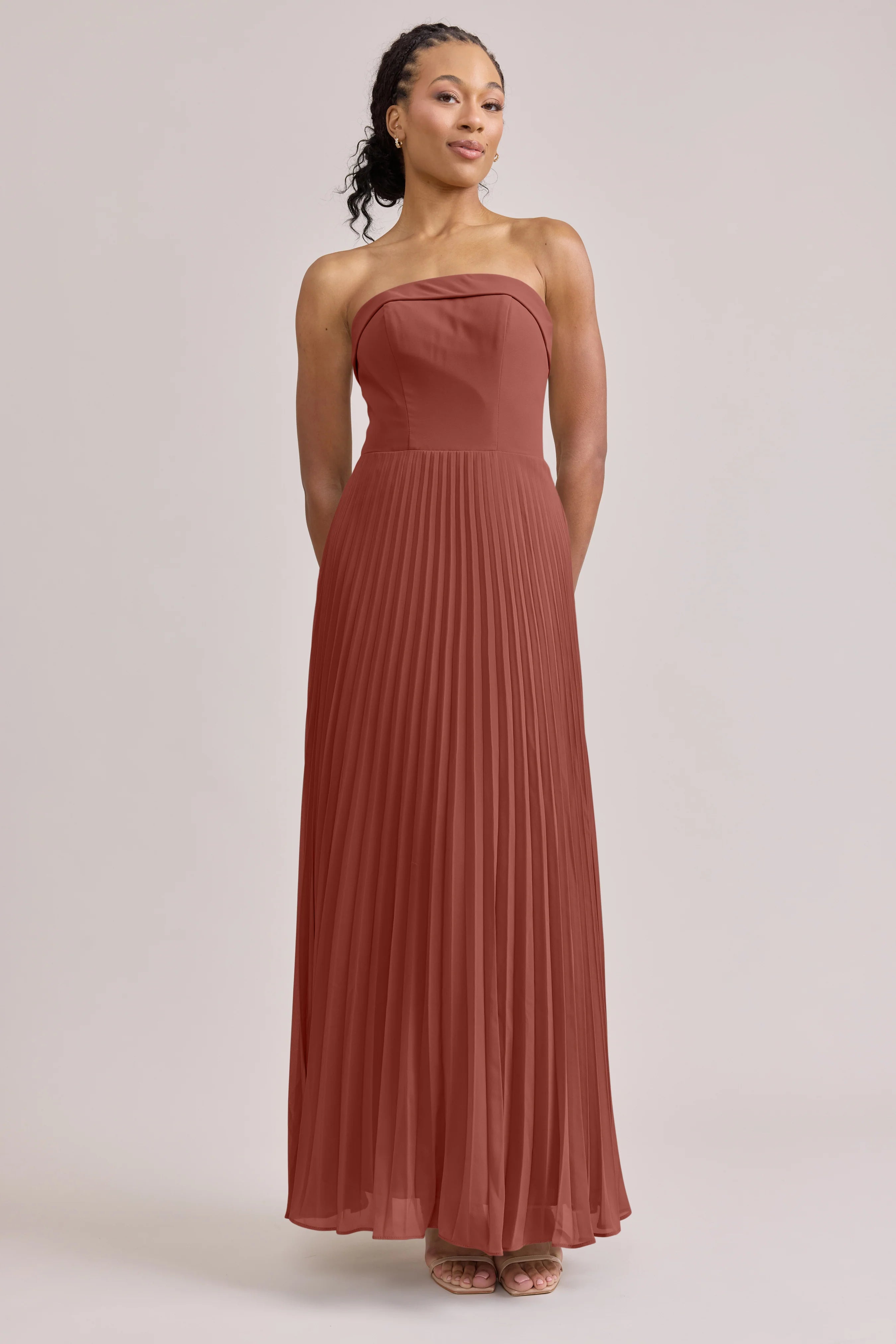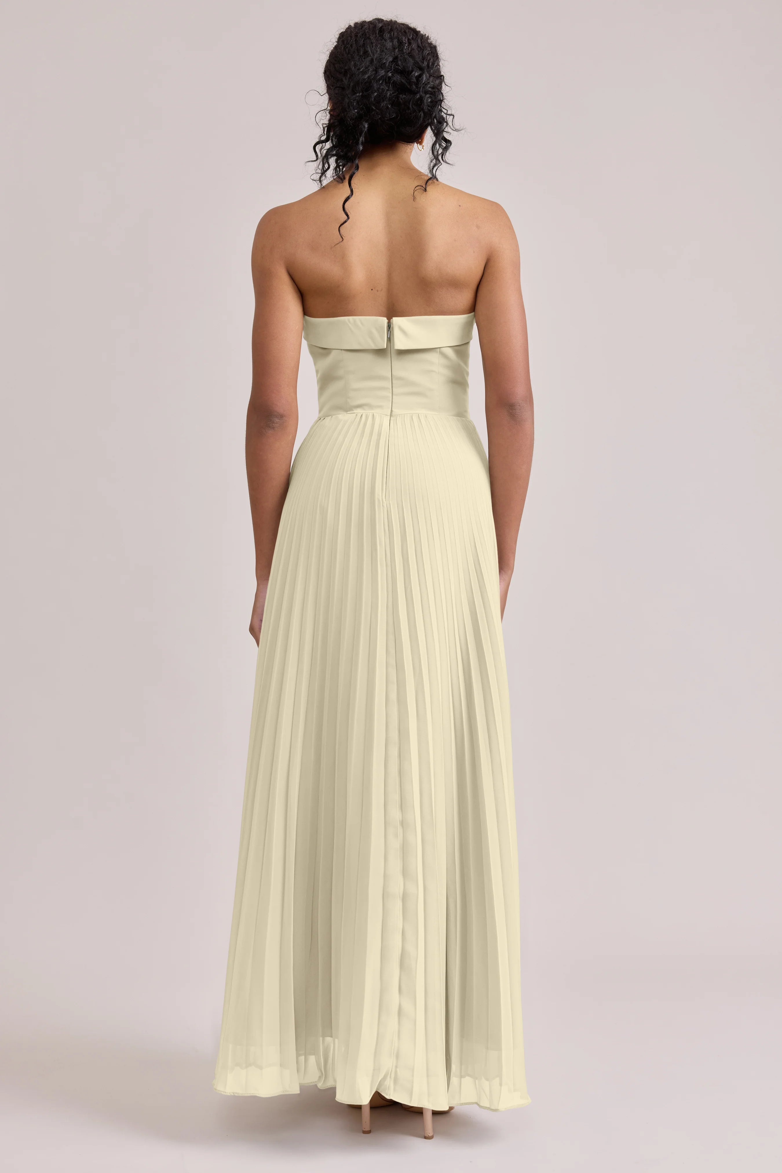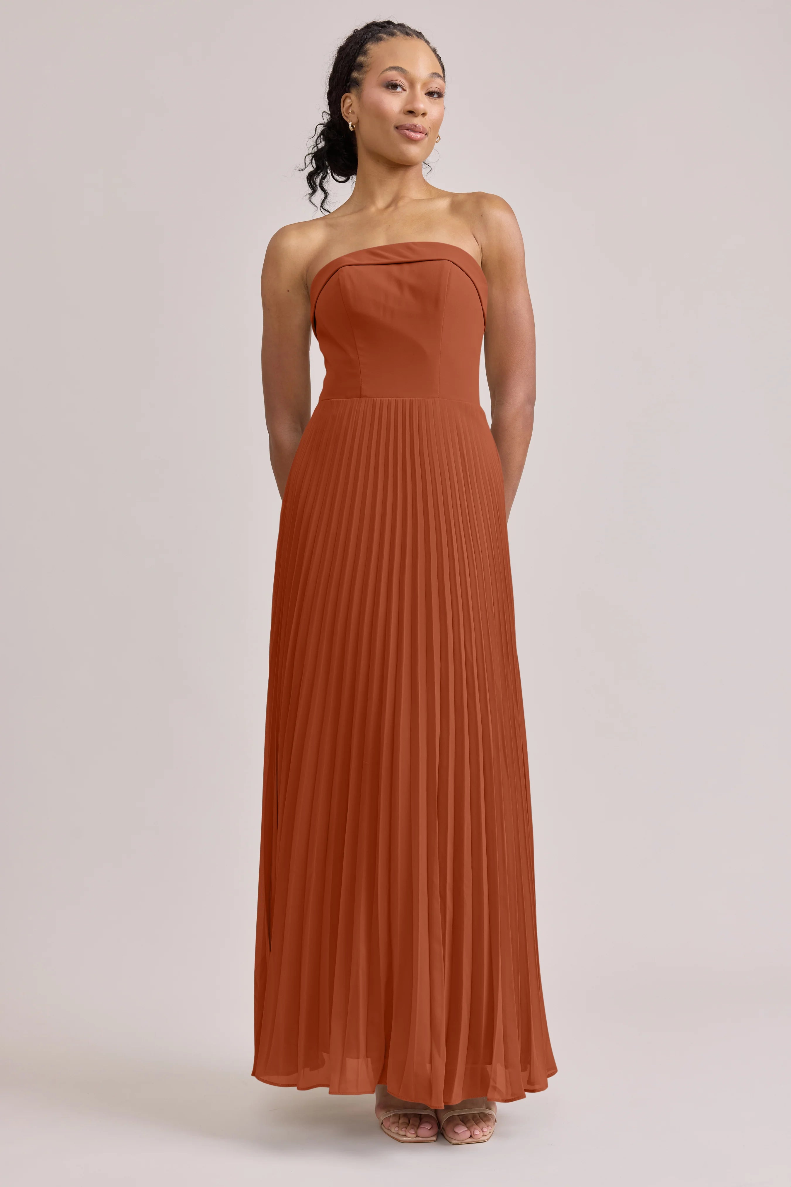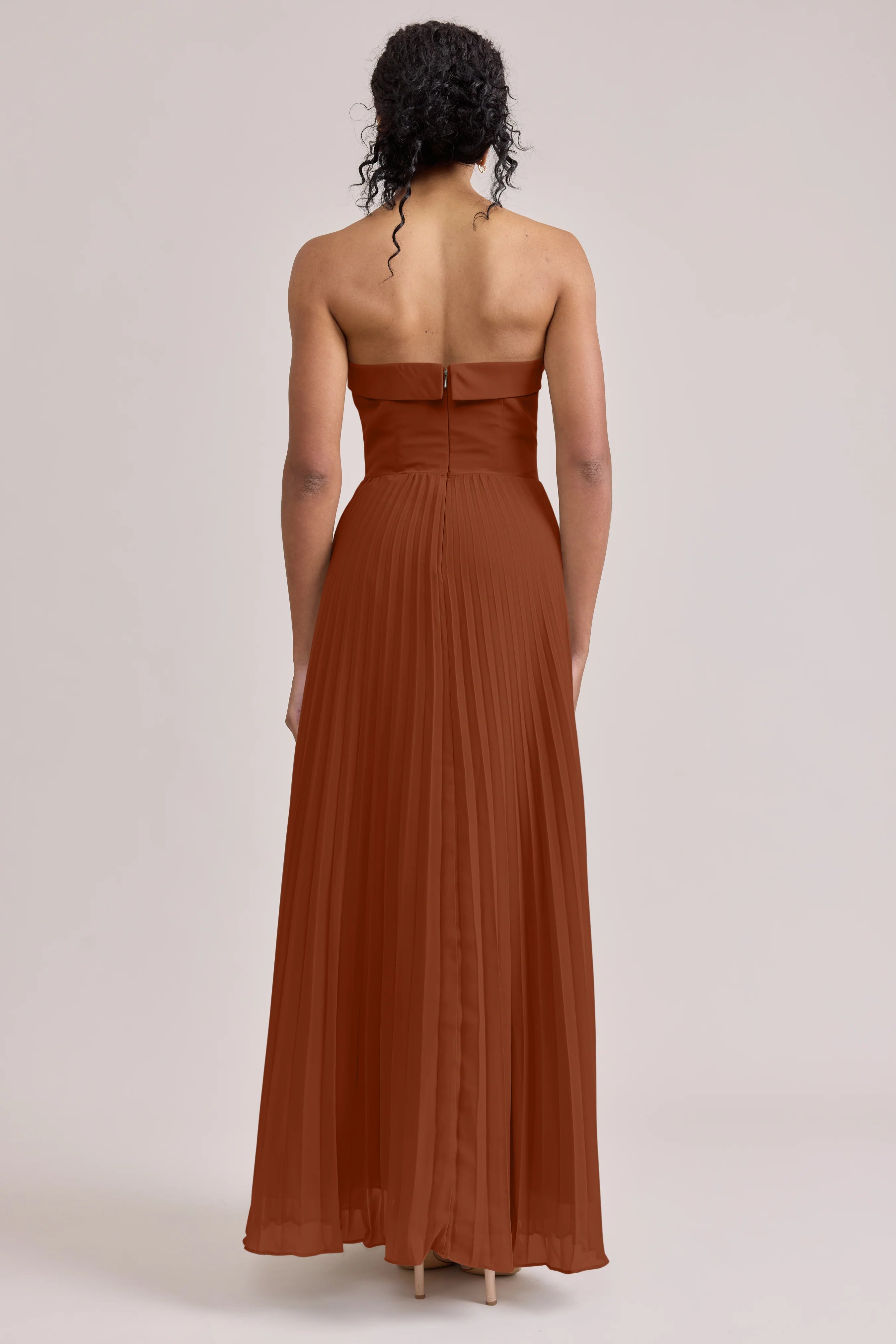 The best-selling Saylor Satin Pleated Dress is now available in Chiffon. A jaw-dropping strapless dress, Saylor will become essential for your elevated wedding line-up. Saylor features a fold over straight-cut neckline and back in our regular chiffon fabric that flows into a vertical pleating skirt at a dropped waistline. Pair with our floral chiffon dresses for the perfect “European Garden” look!