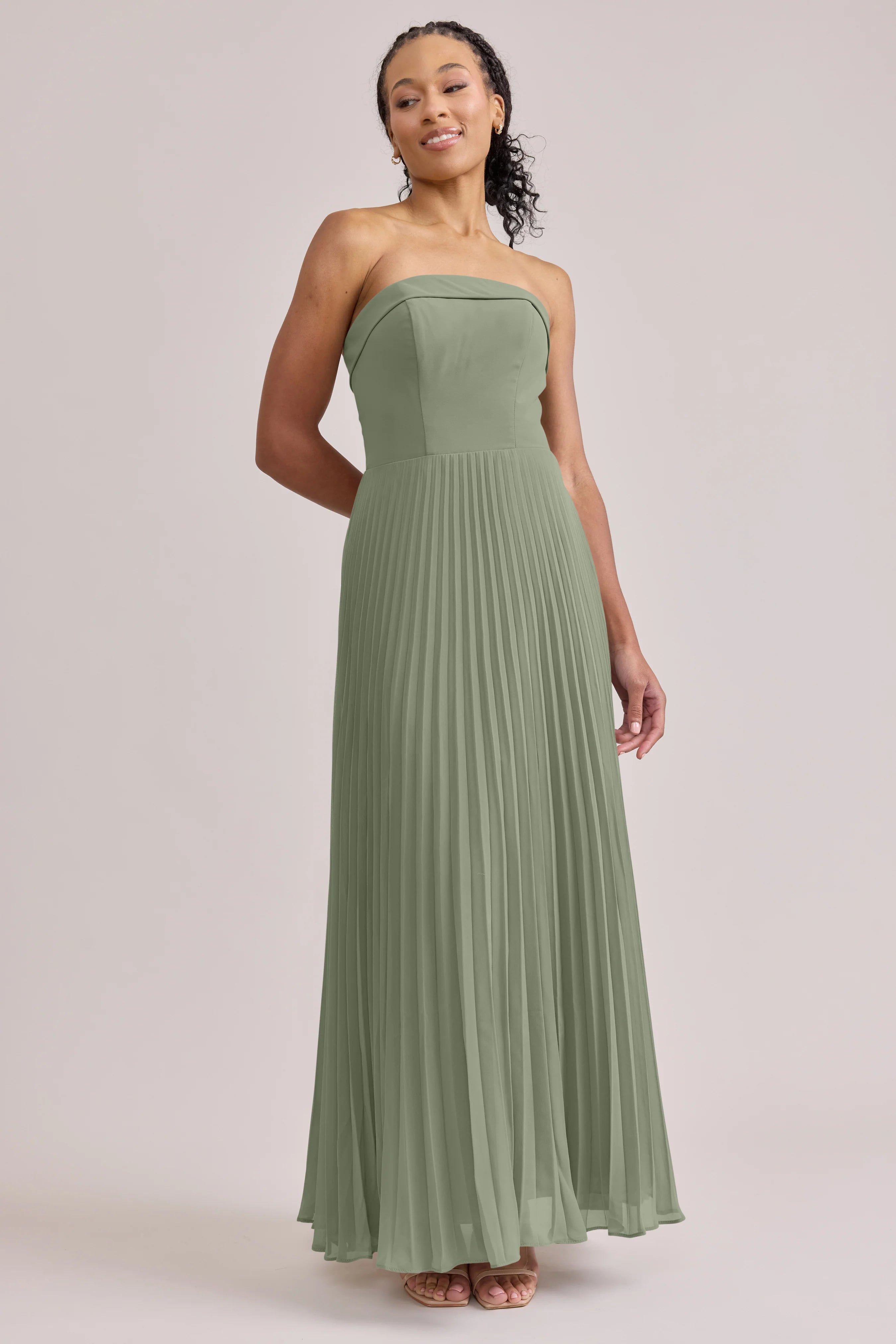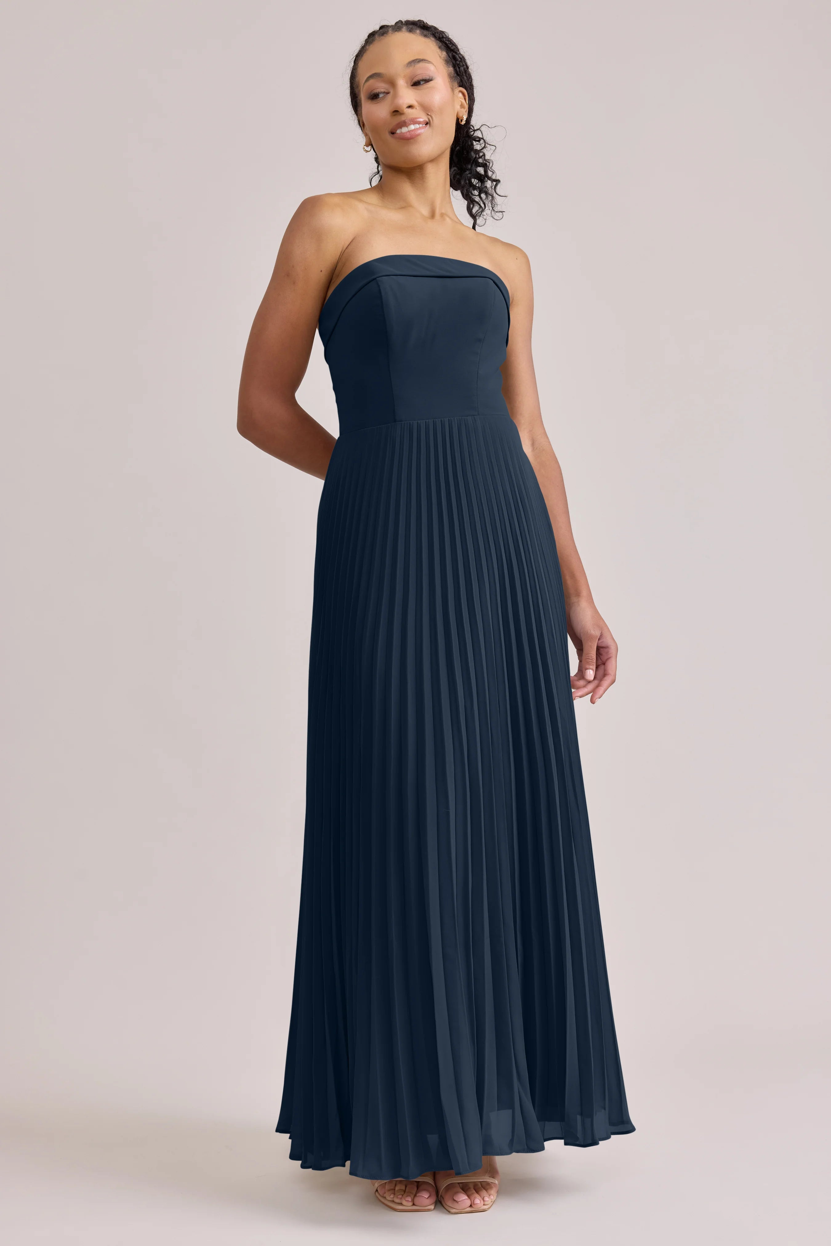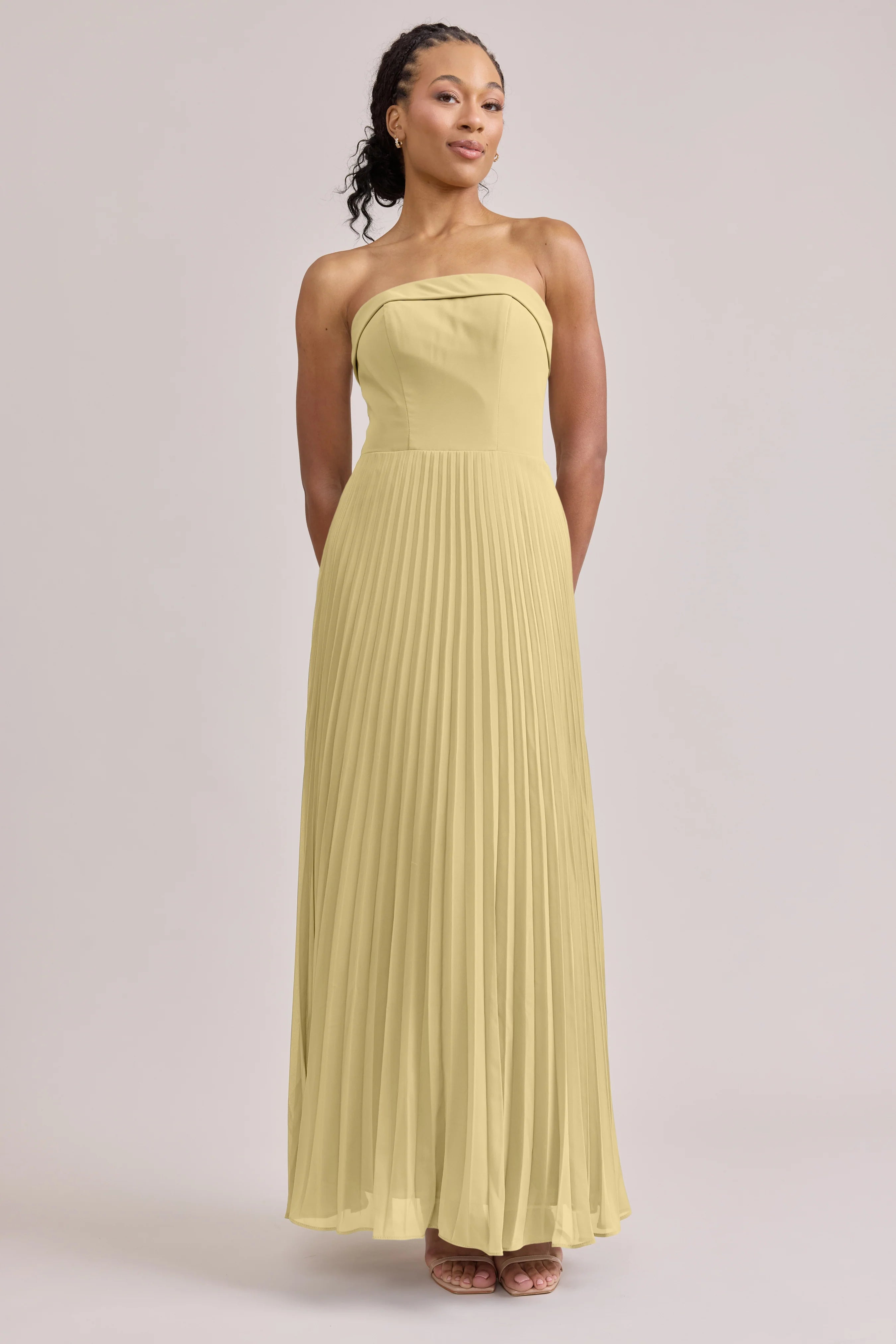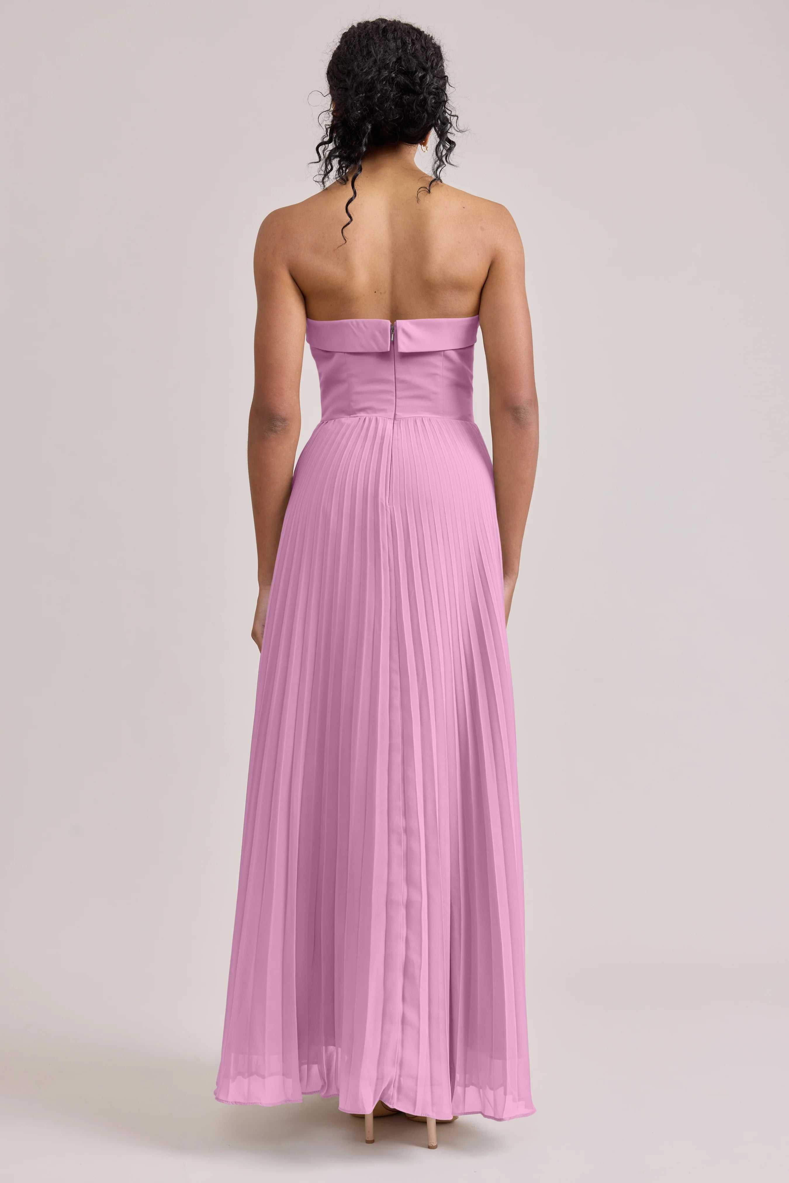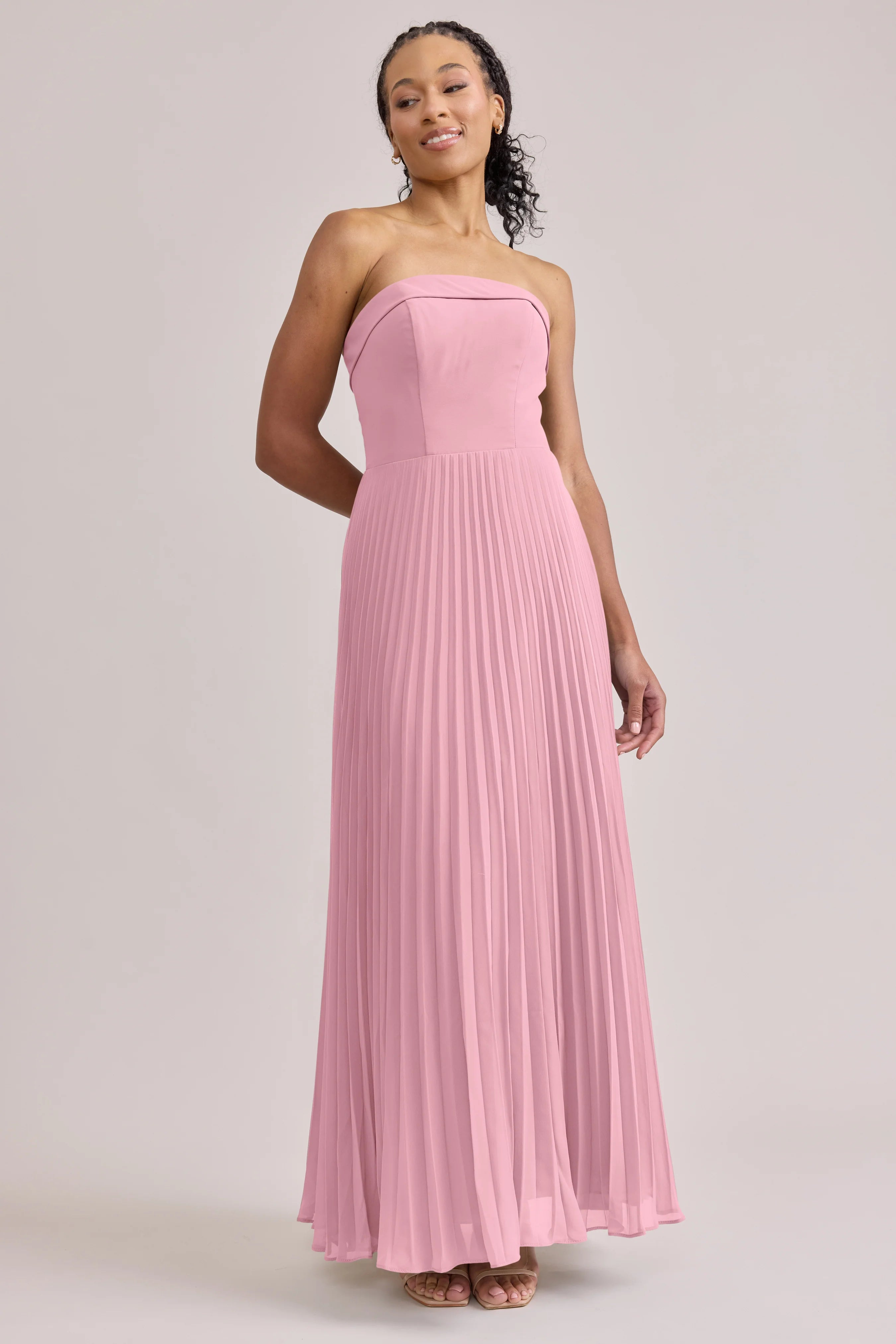 The best-selling Saylor Satin Pleated Dress is now available in Chiffon. A jaw-dropping strapless dress, Saylor will become essential for your elevated wedding line-up. Saylor features a fold over straight-cut neckline and back in our regular chiffon fabric that flows into a vertical pleating skirt at a dropped waistline. Pair with our floral chiffon dresses for the perfect “European Garden” look!