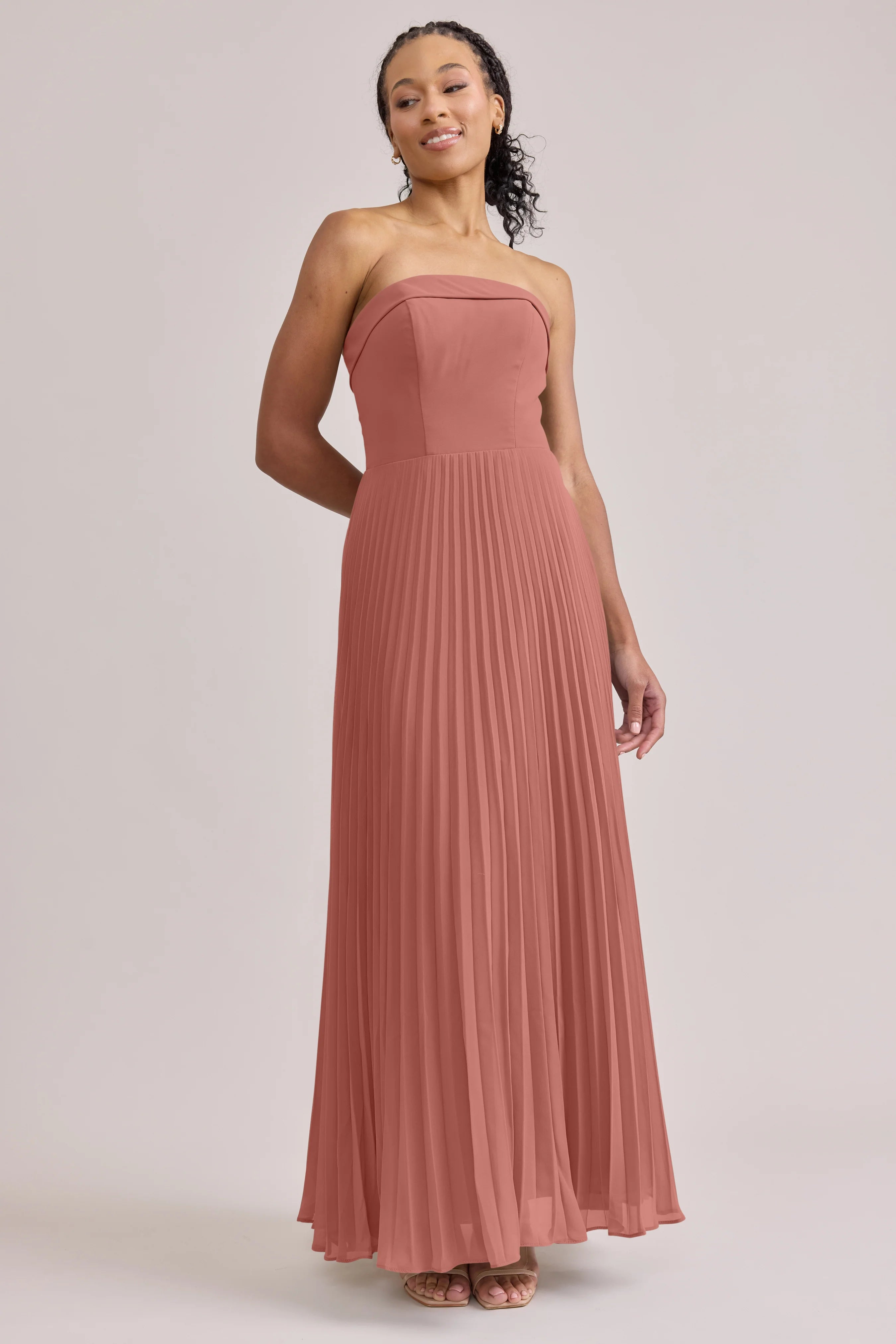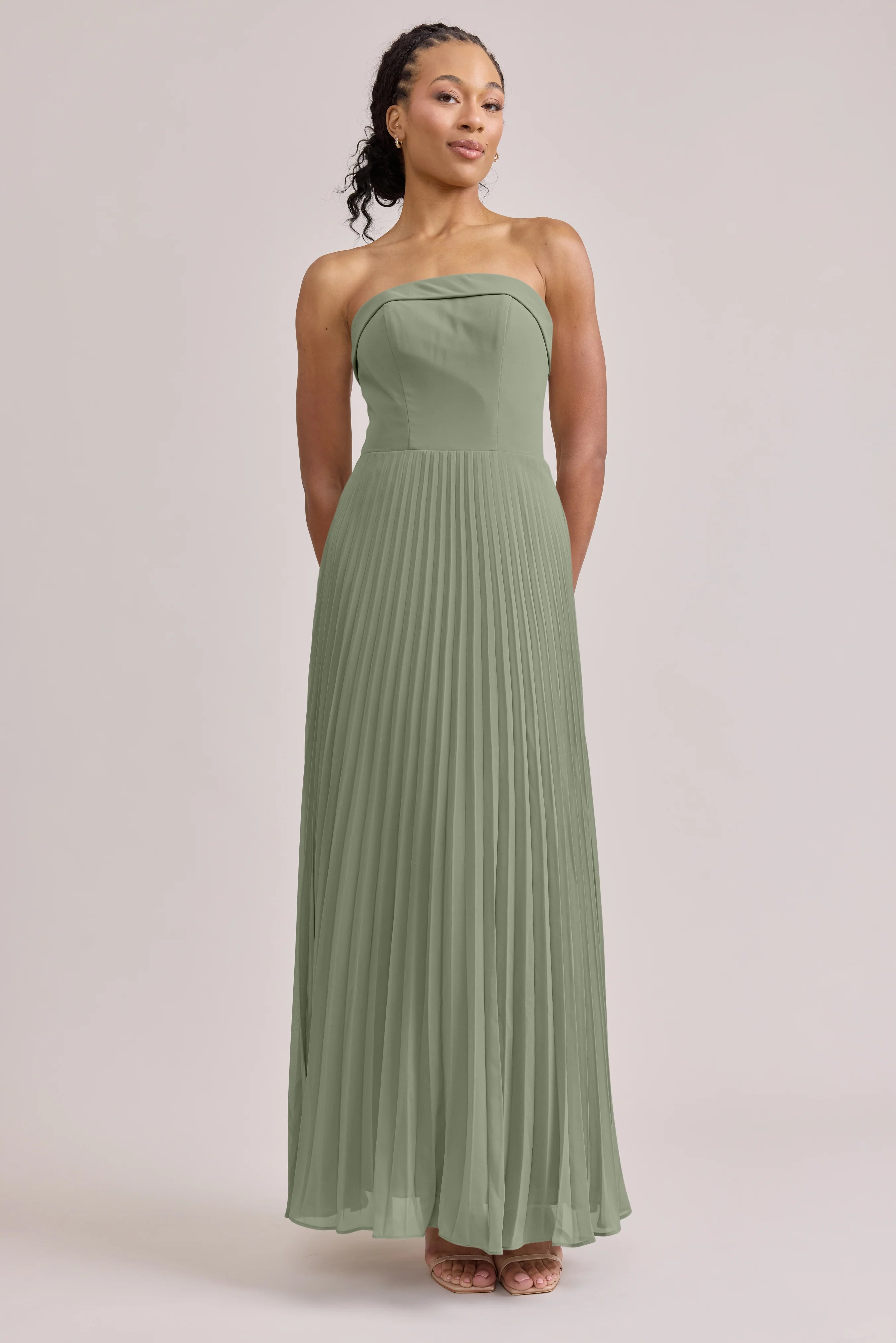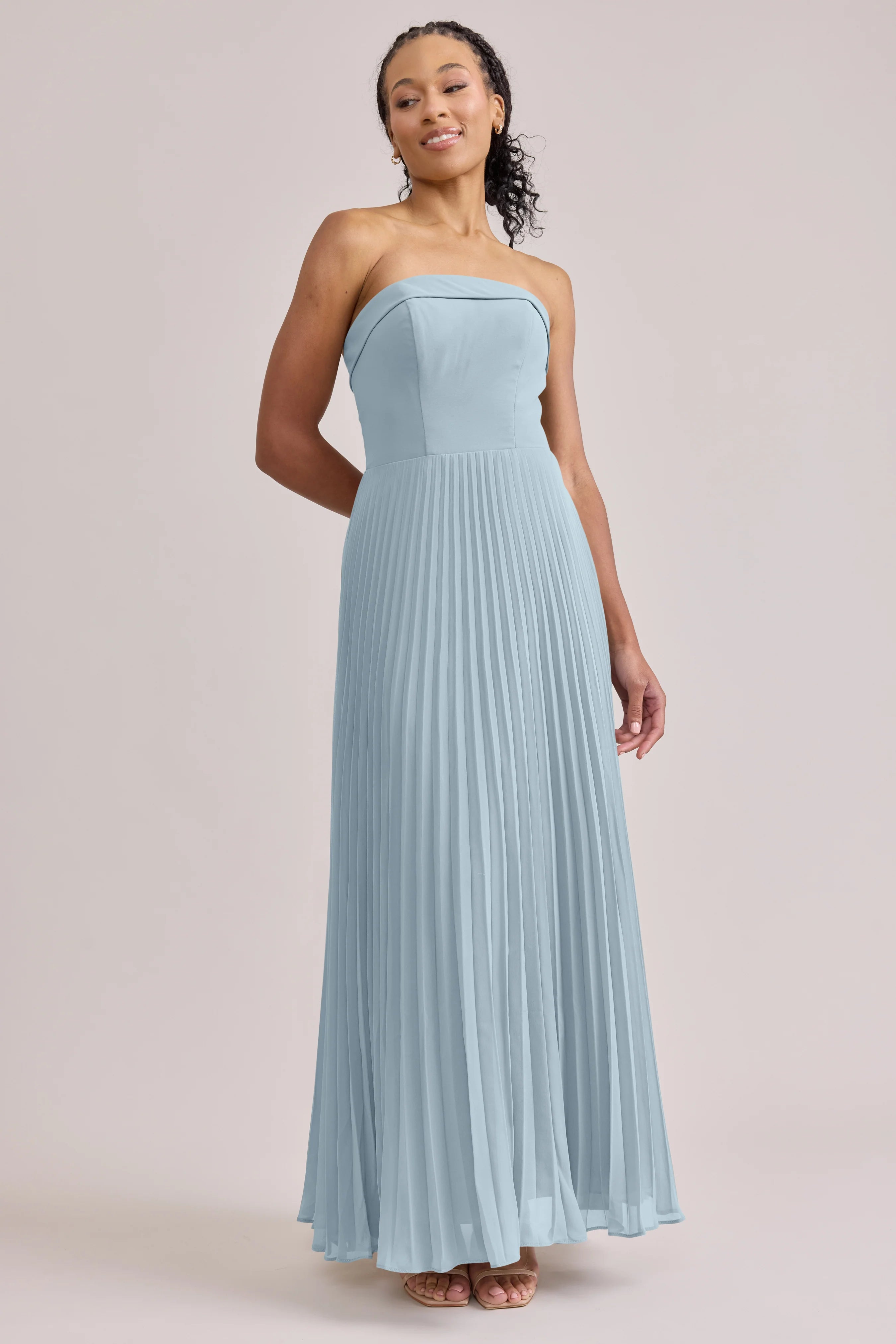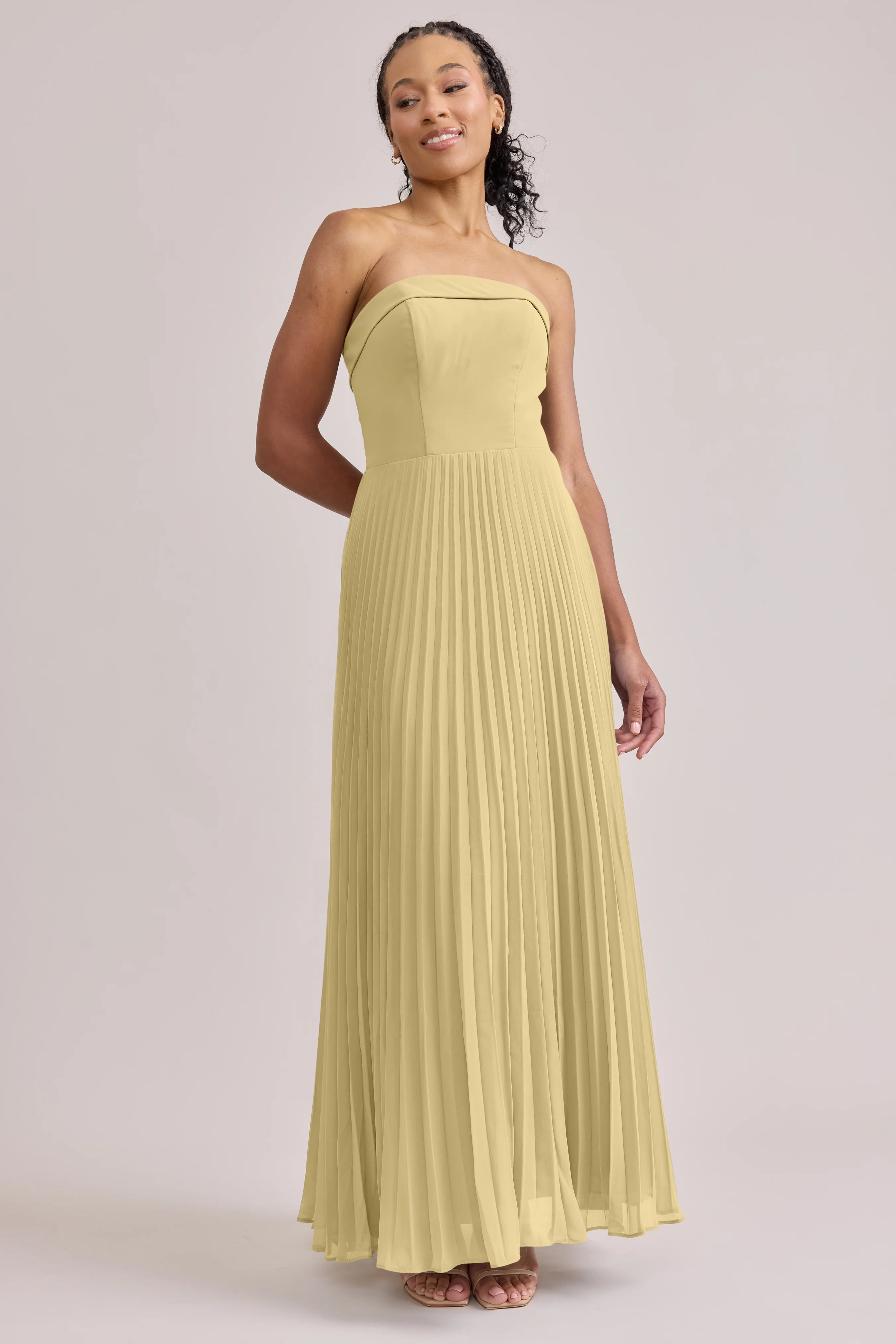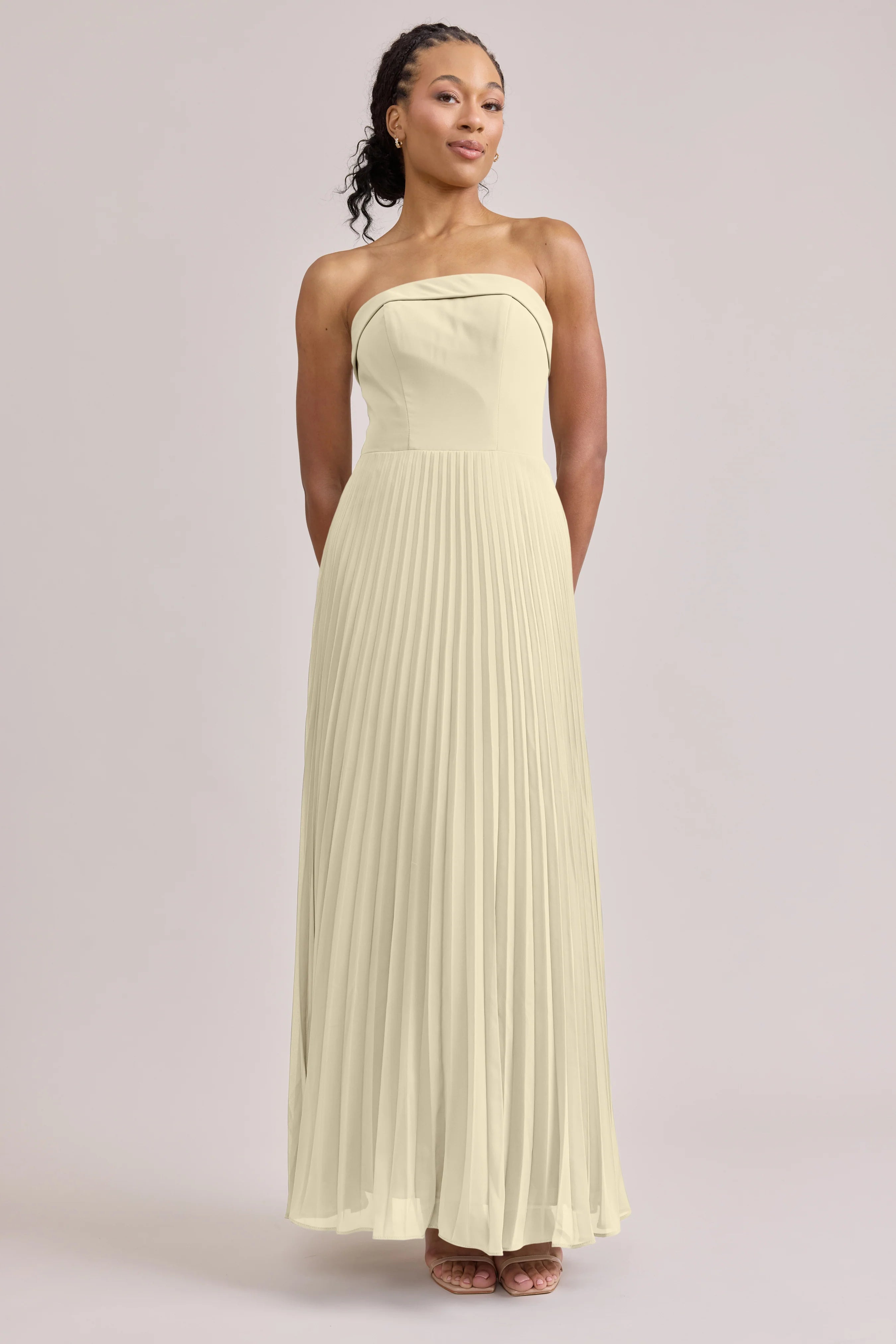 The best-selling Saylor Satin Pleated Dress is now available in Chiffon. A jaw-dropping strapless dress, Saylor will become essential for your elevated wedding line-up. Saylor features a fold over straight-cut neckline and back in our regular chiffon fabric that flows into a vertical pleating skirt at a dropped waistline. Pair with our floral chiffon dresses for the perfect “European Garden” look!