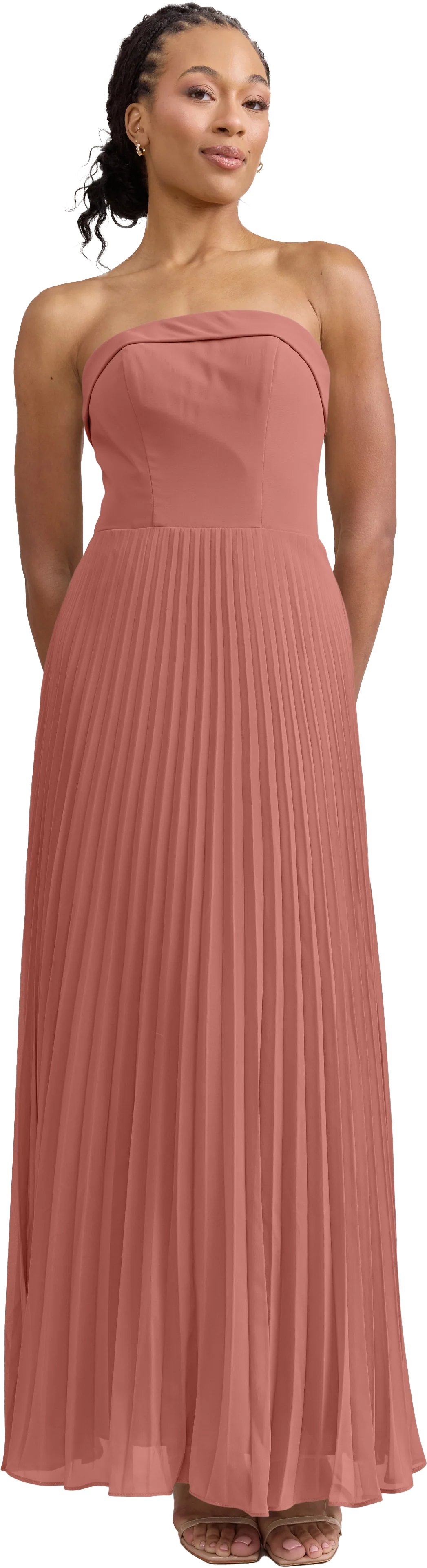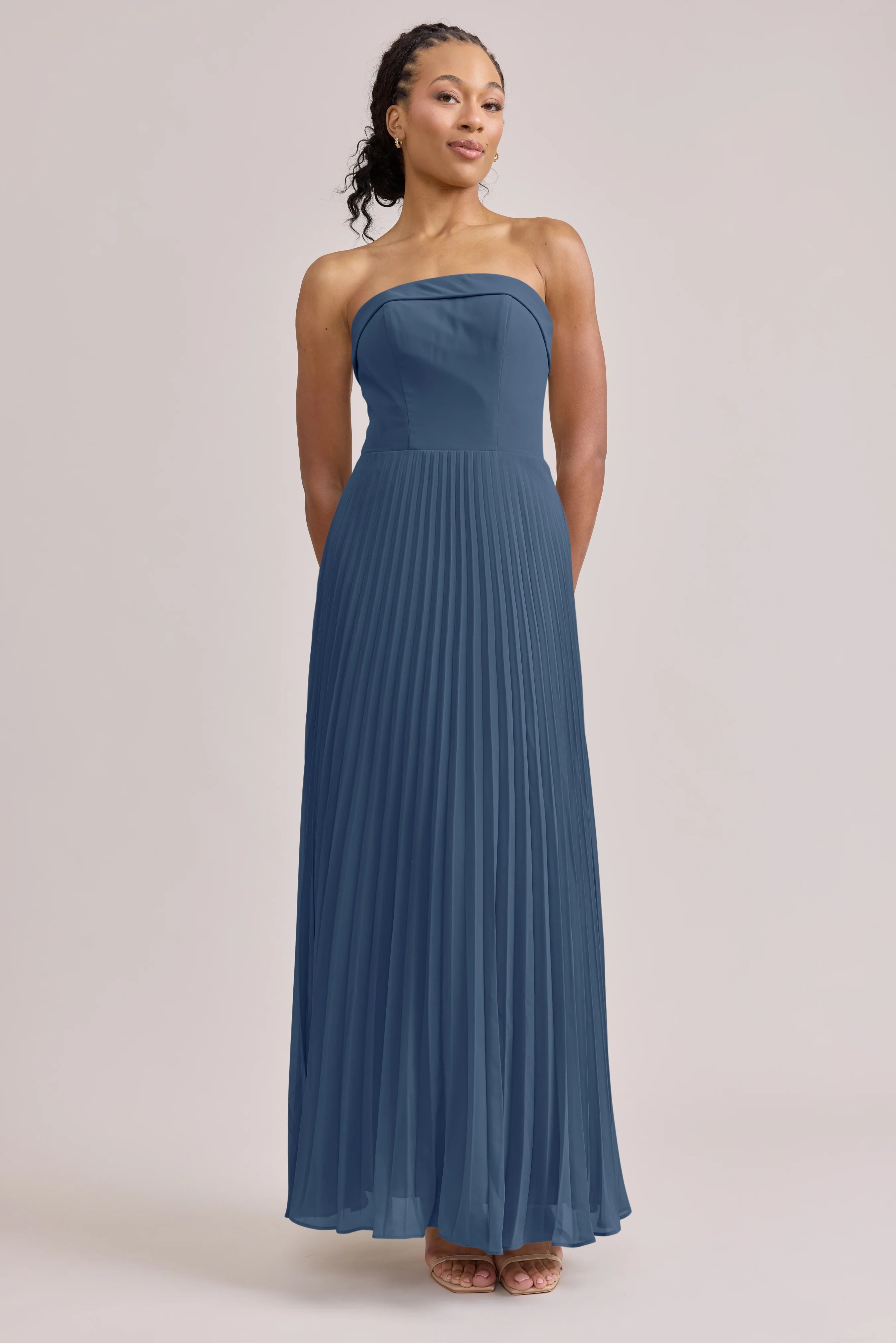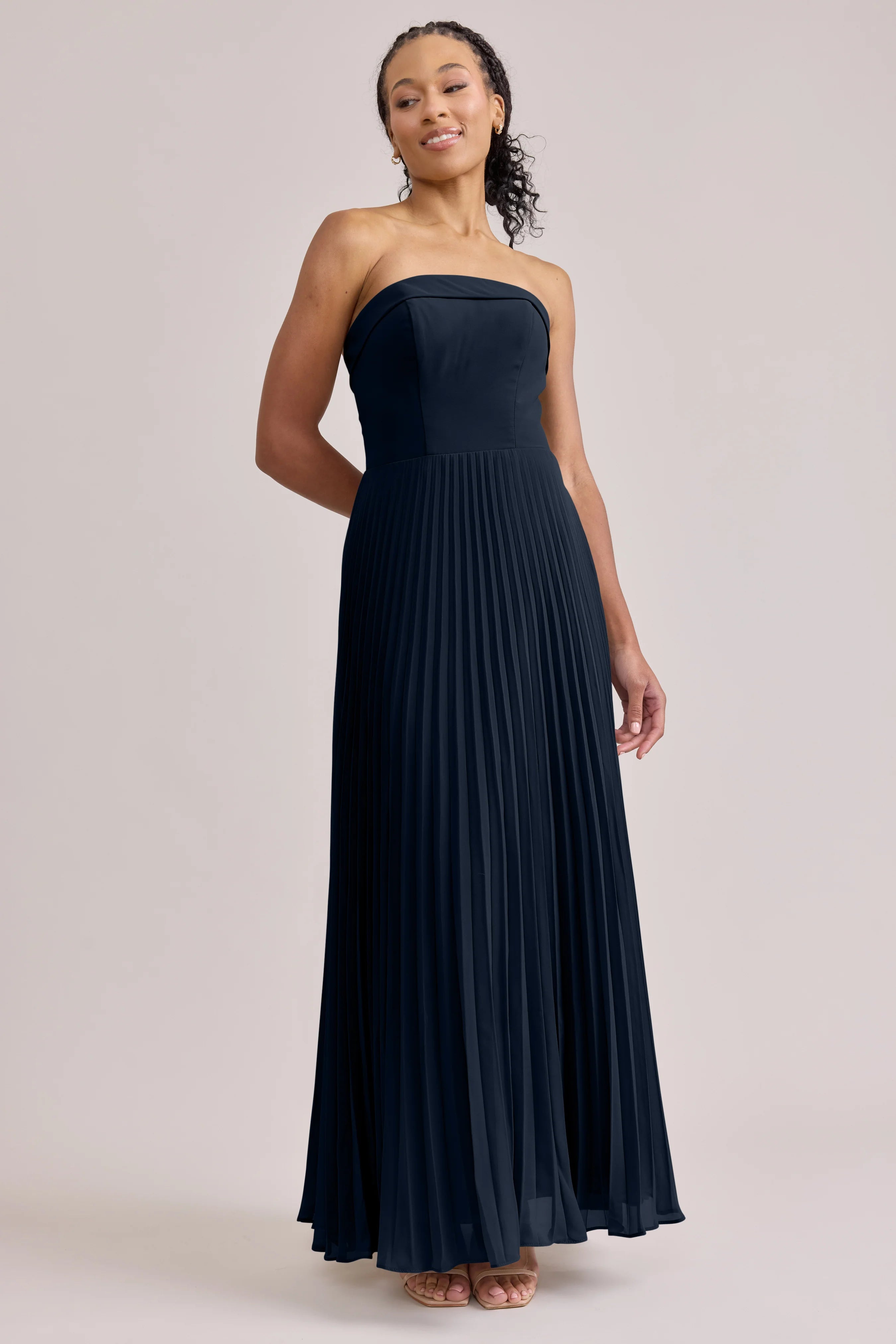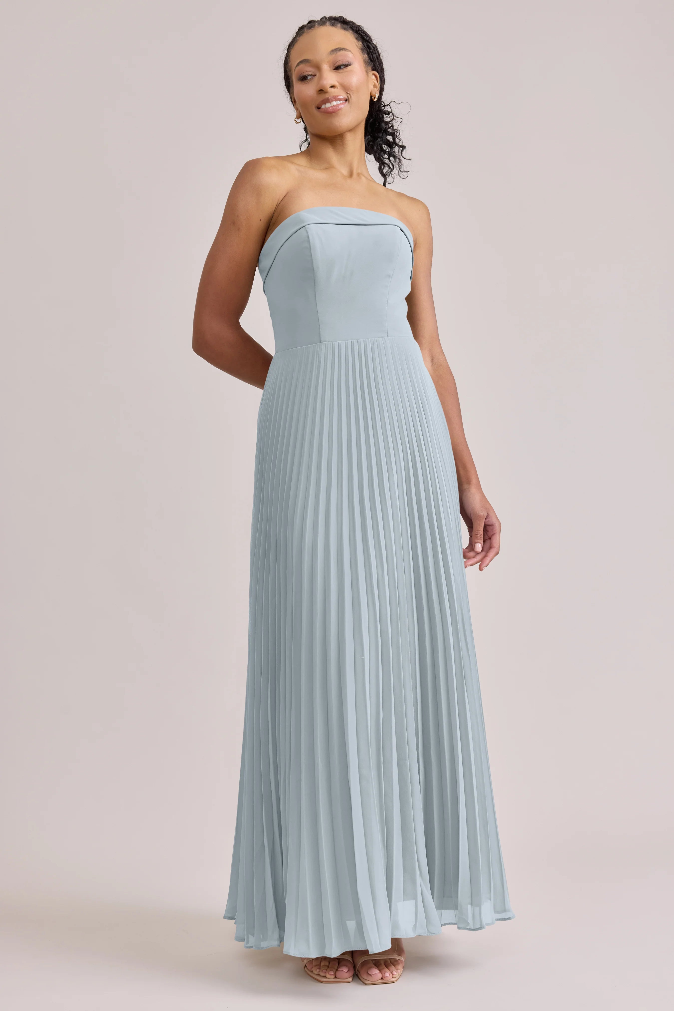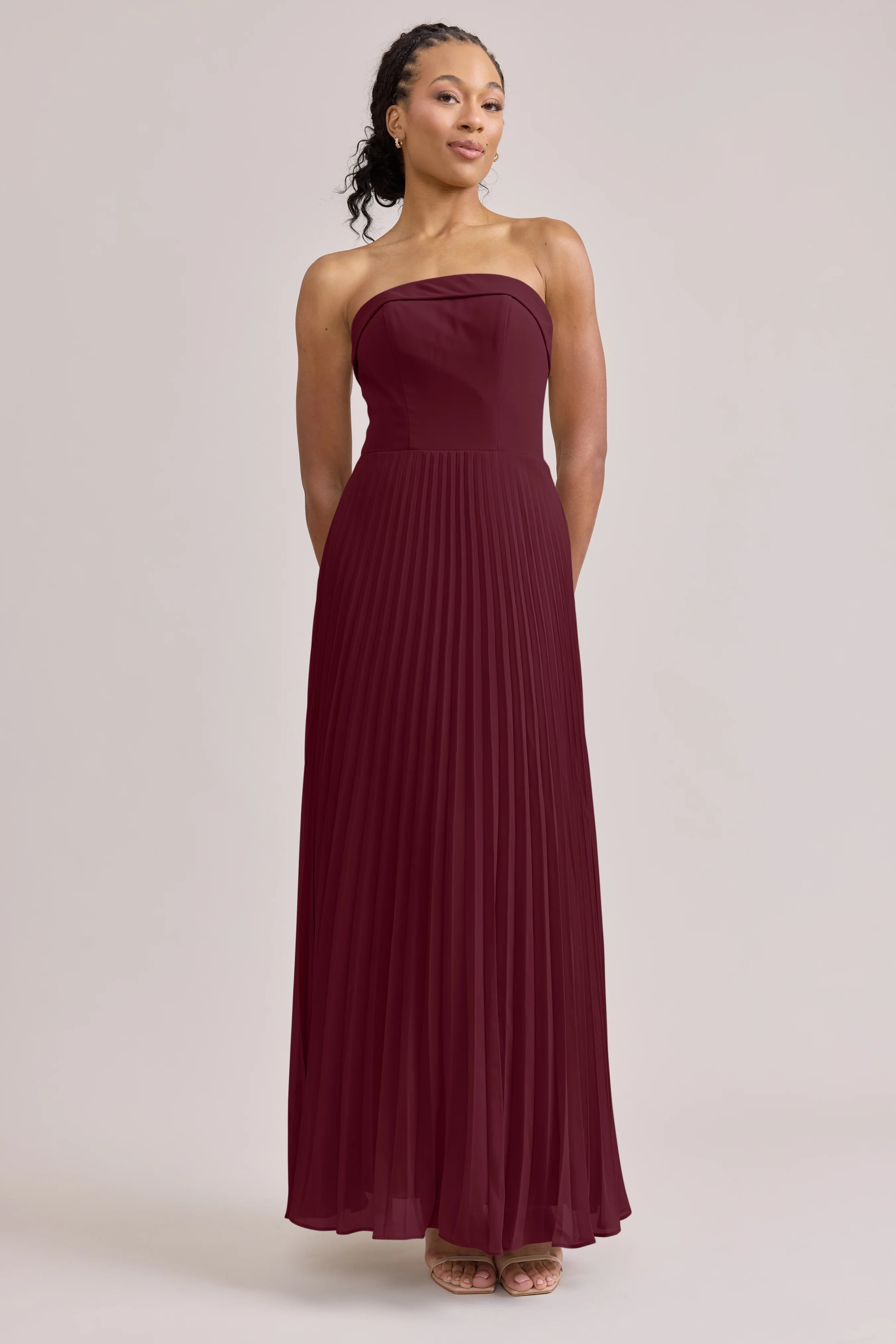 The best-selling Saylor Satin Pleated Dress is now available in Chiffon. A jaw-dropping strapless dress, Saylor will become essential for your elevated wedding line-up. Saylor features a fold over straight-cut neckline and back in our regular chiffon fabric that flows into a vertical pleating skirt at a dropped waistline. Pair with our floral chiffon dresses for the perfect “European Garden” look!