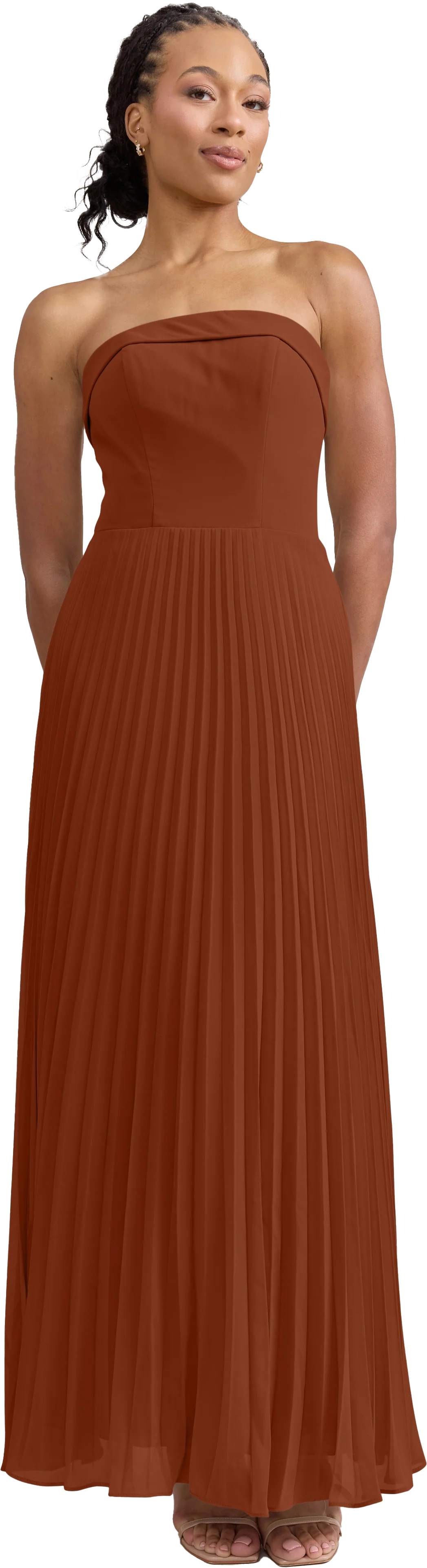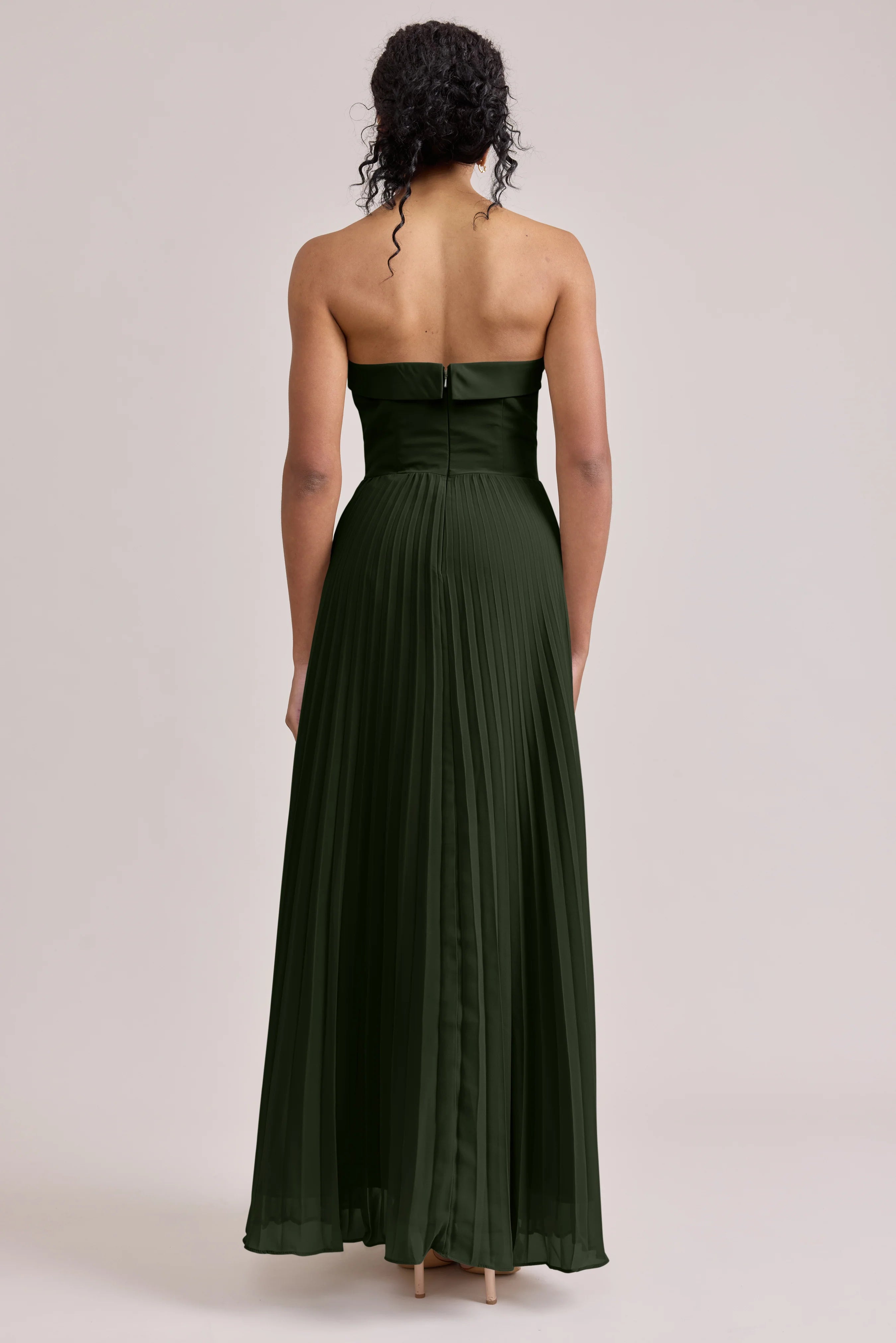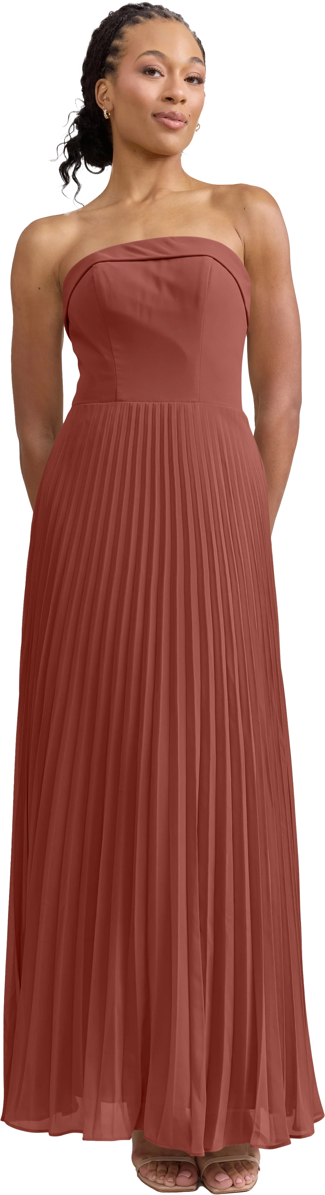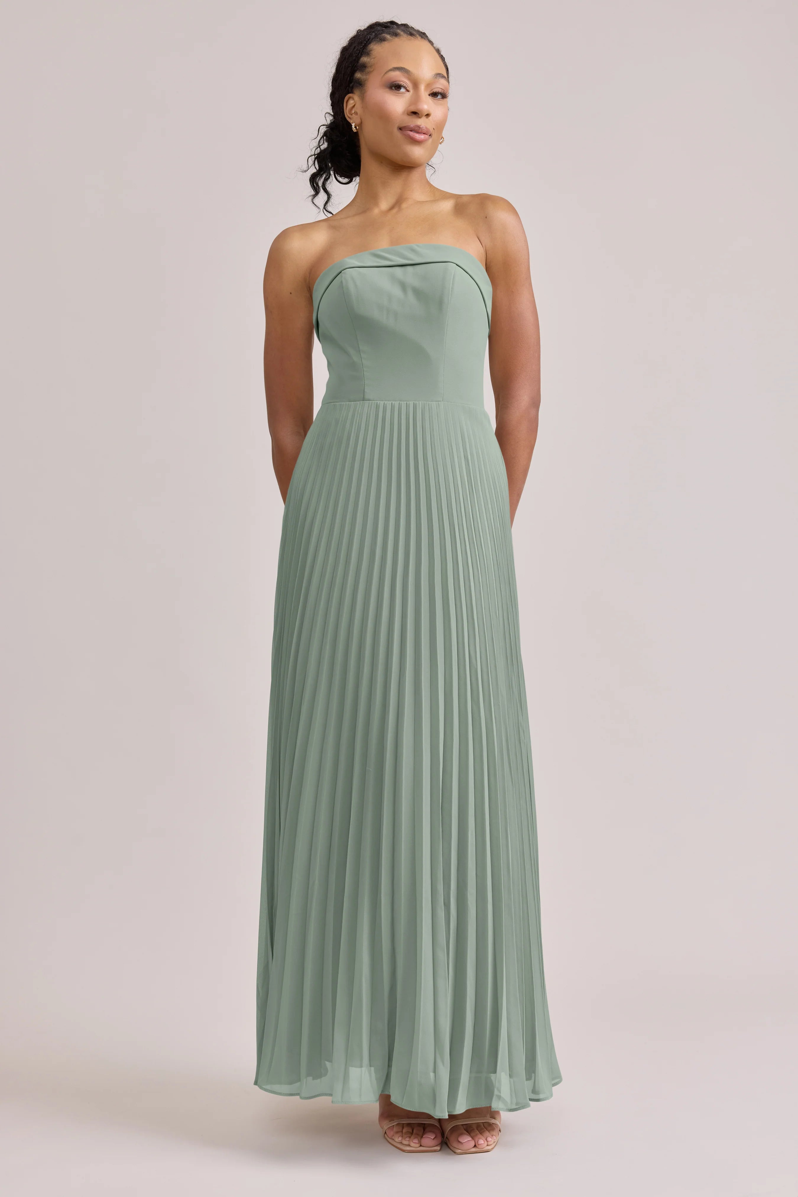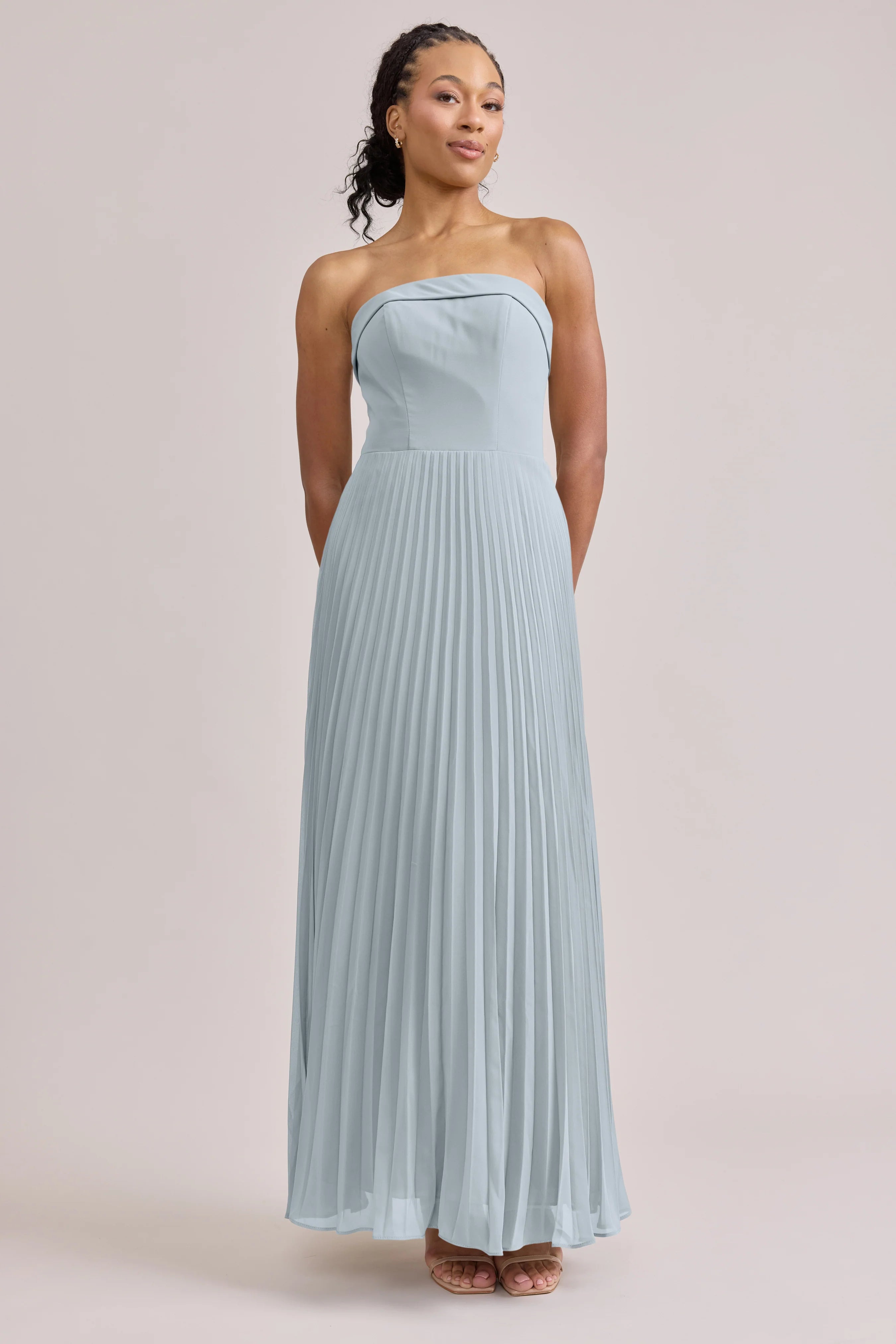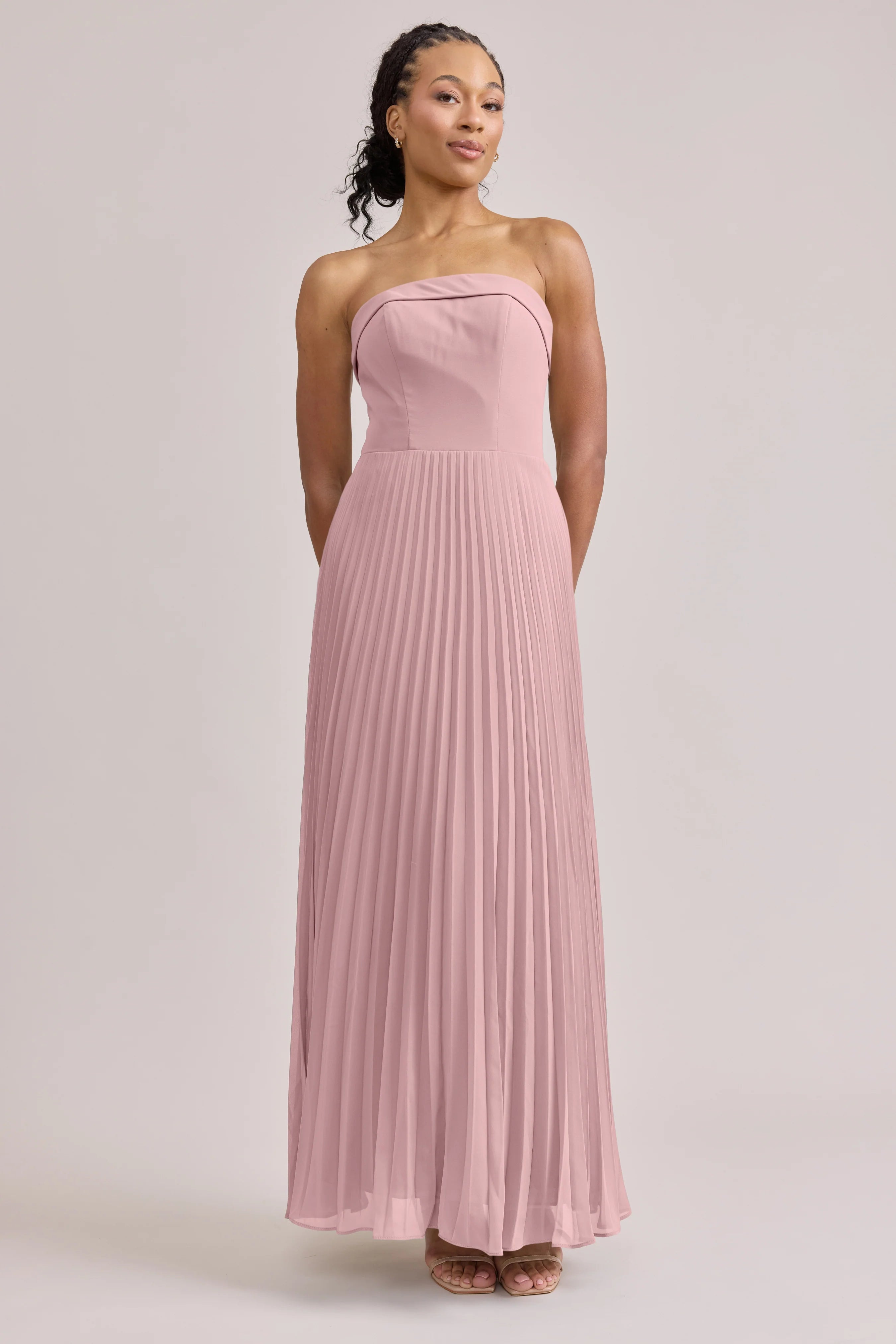 The best-selling Saylor Satin Pleated Dress is now available in Chiffon. A jaw-dropping strapless dress, Saylor will become essential for your elevated wedding line-up. Saylor features a fold over straight-cut neckline and back in our regular chiffon fabric that flows into a vertical pleating skirt at a dropped waistline. Pair with our floral chiffon dresses for the perfect “European Garden” look!