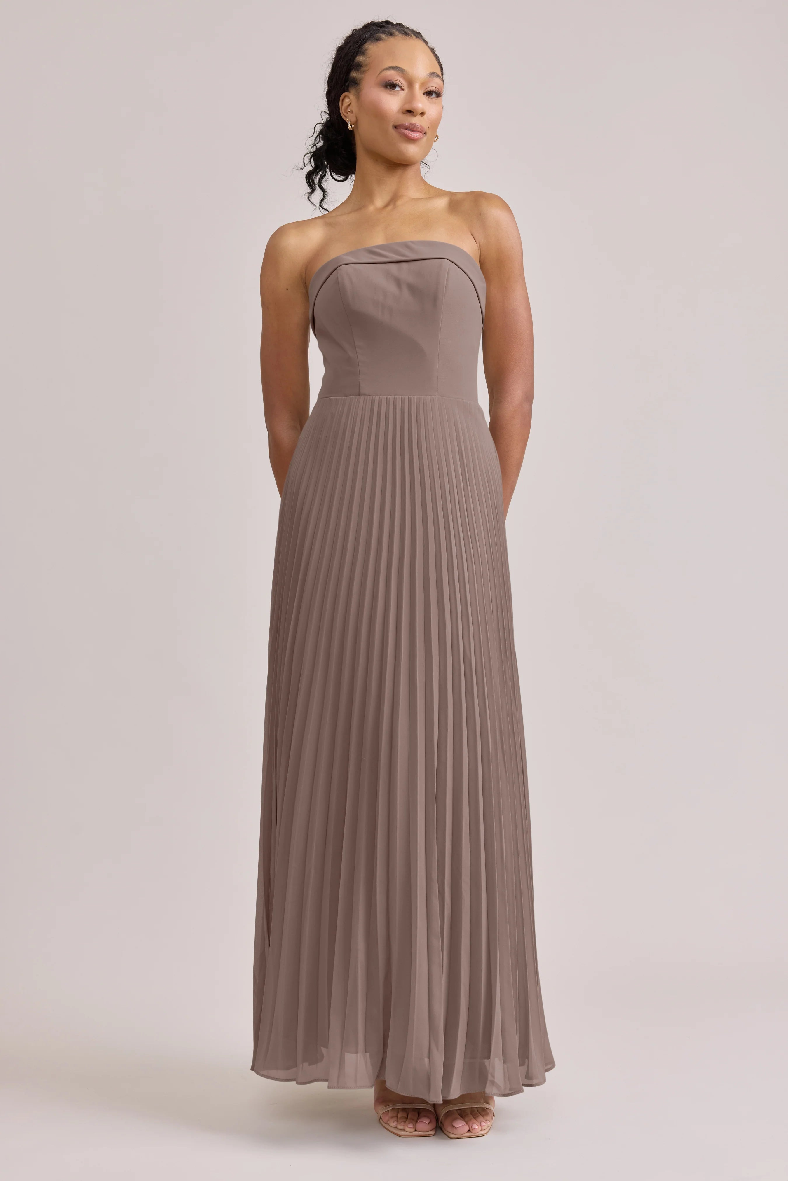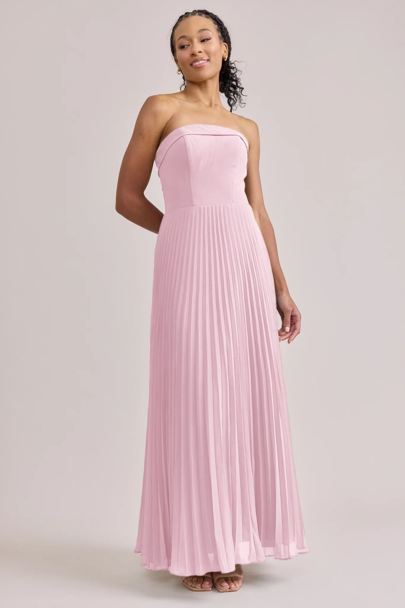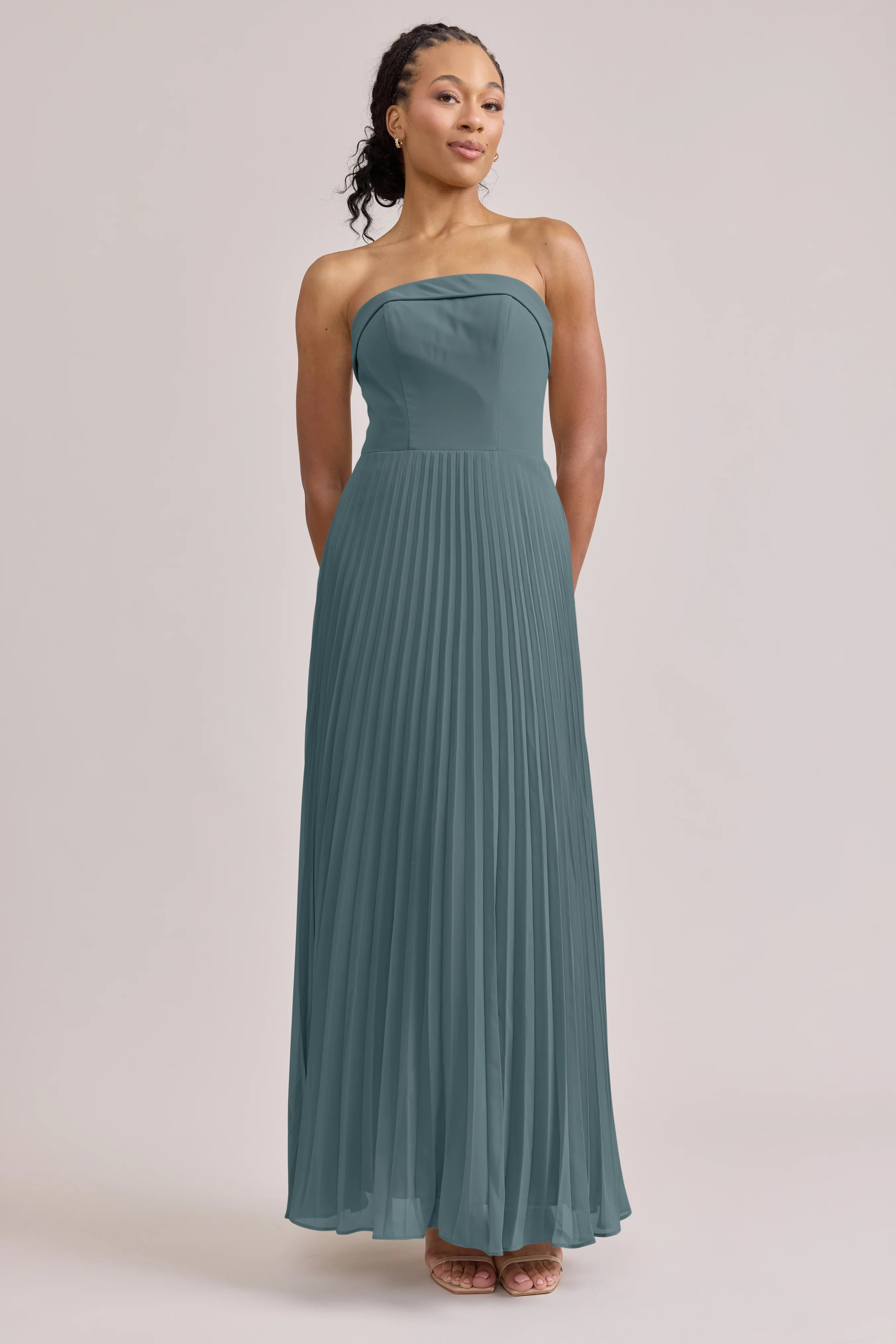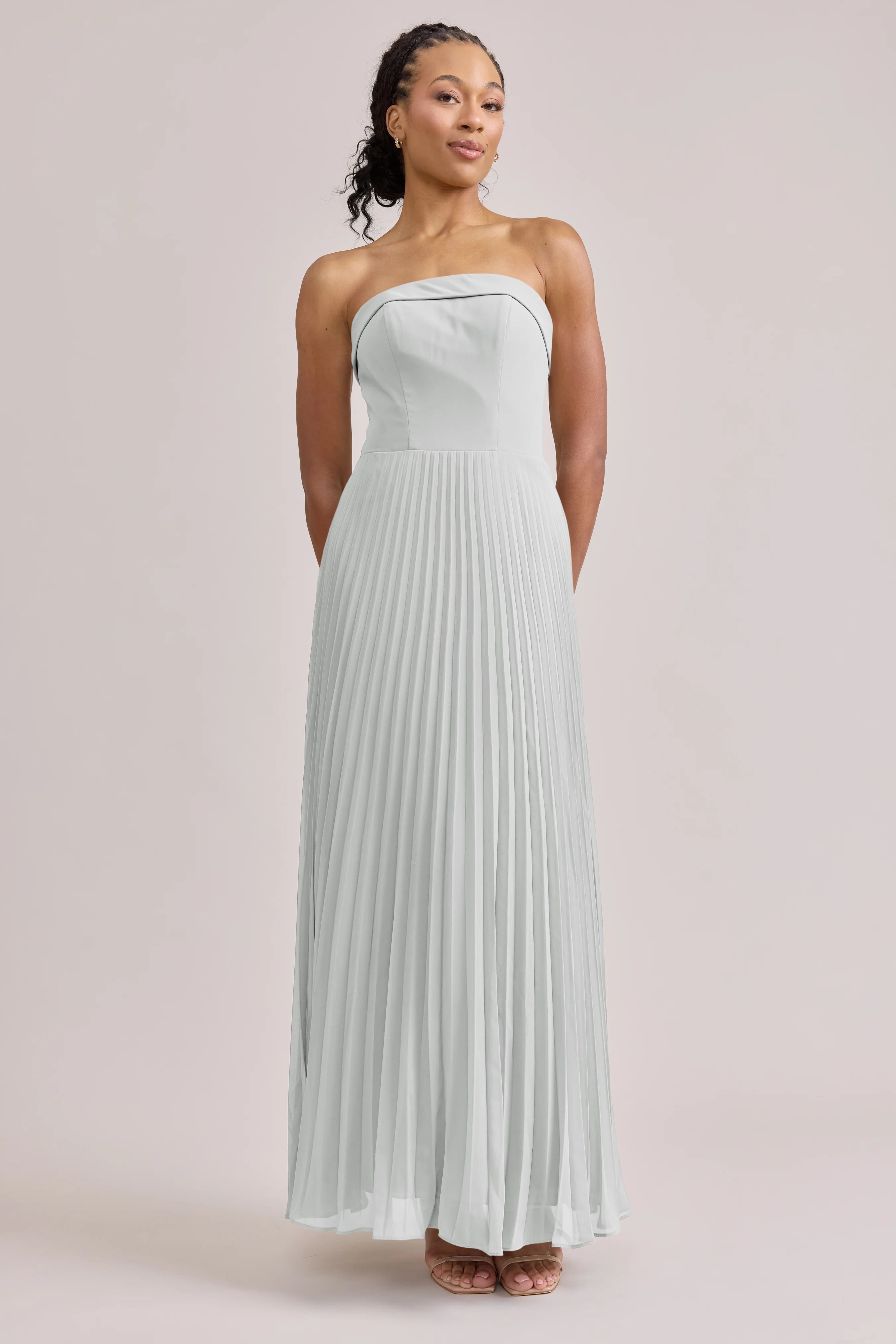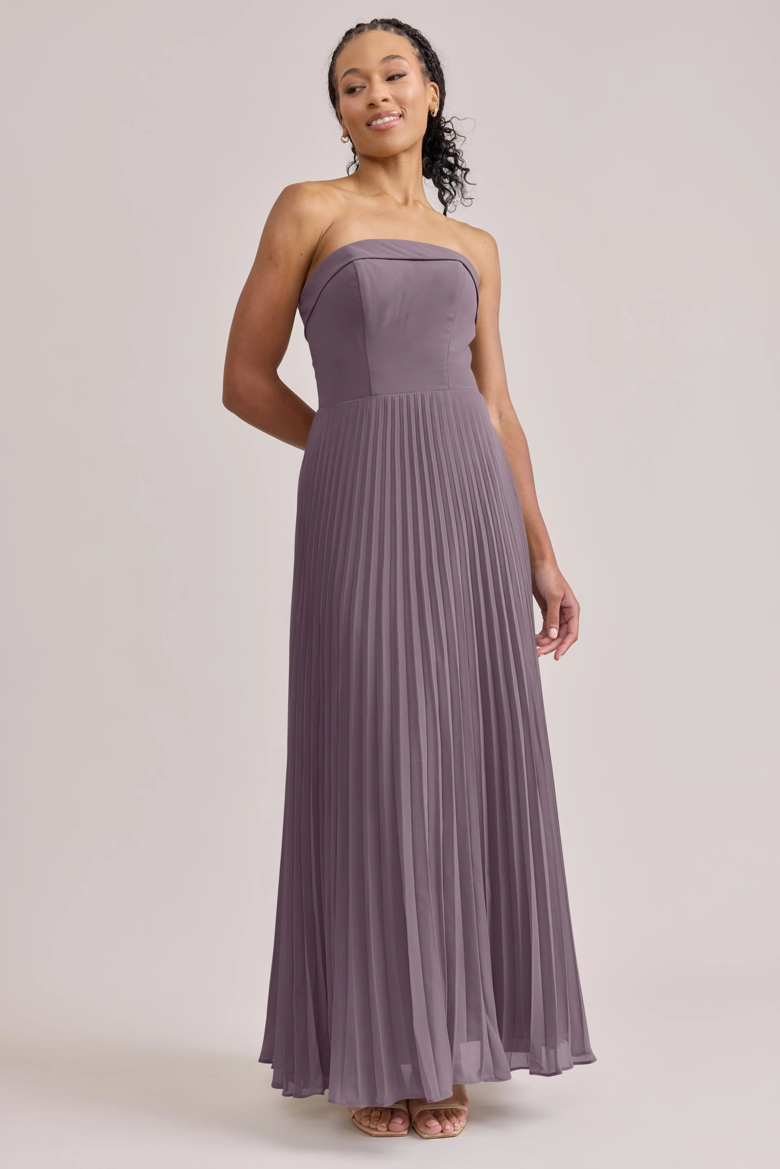 The best-selling Saylor Satin Pleated Dress is now available in Chiffon. A jaw-dropping strapless dress, Saylor will become essential for your elevated wedding line-up. Saylor features a fold over straight-cut neckline and back in our regular chiffon fabric that flows into a vertical pleating skirt at a dropped waistline. Pair with our floral chiffon dresses for the perfect “European Garden” look!
