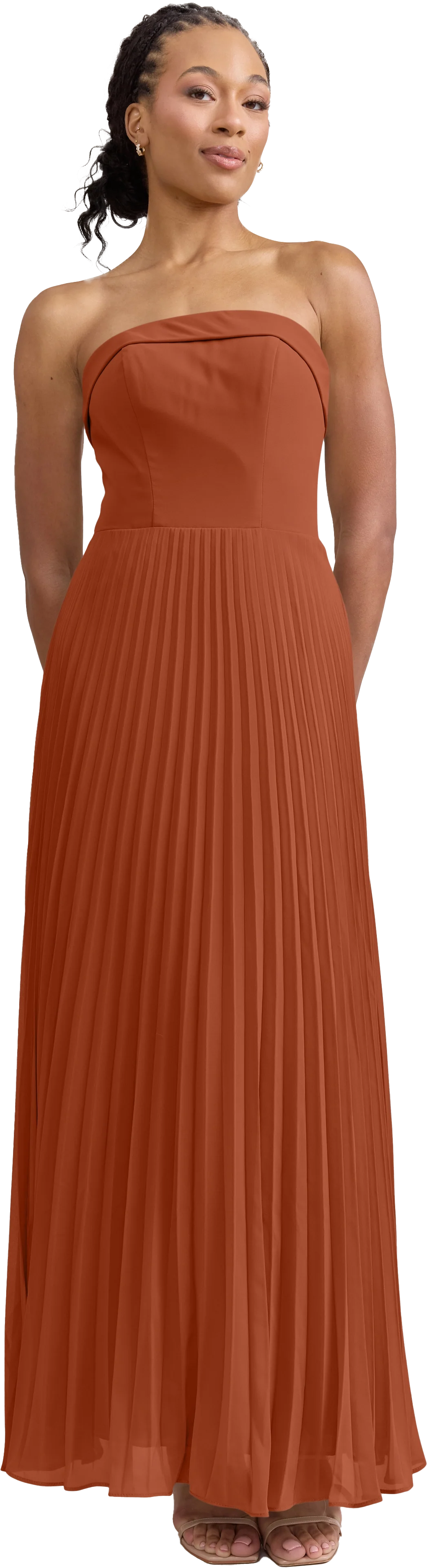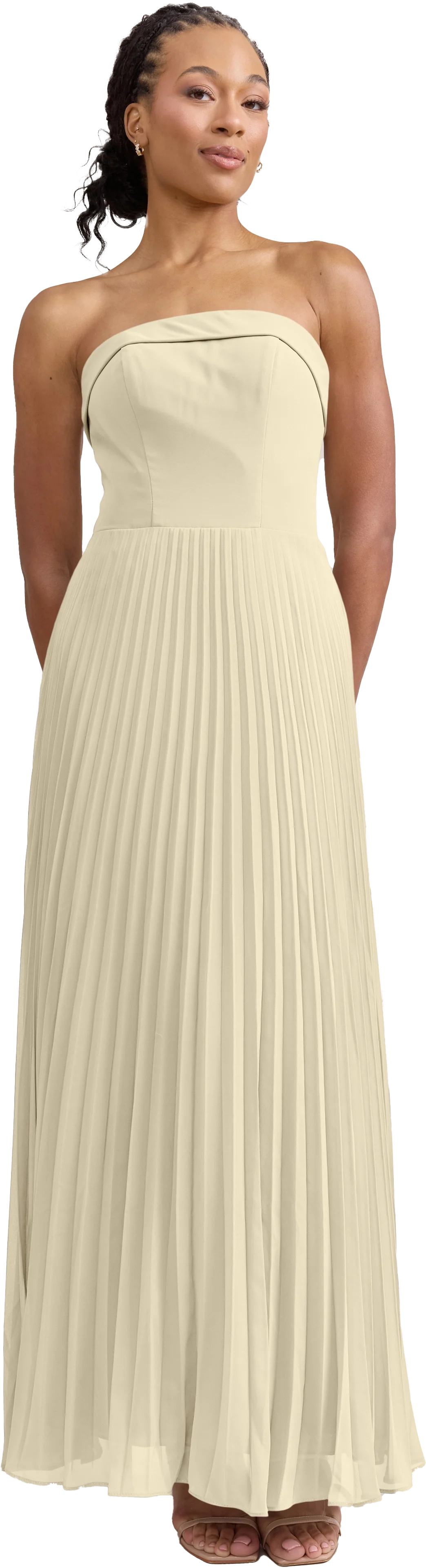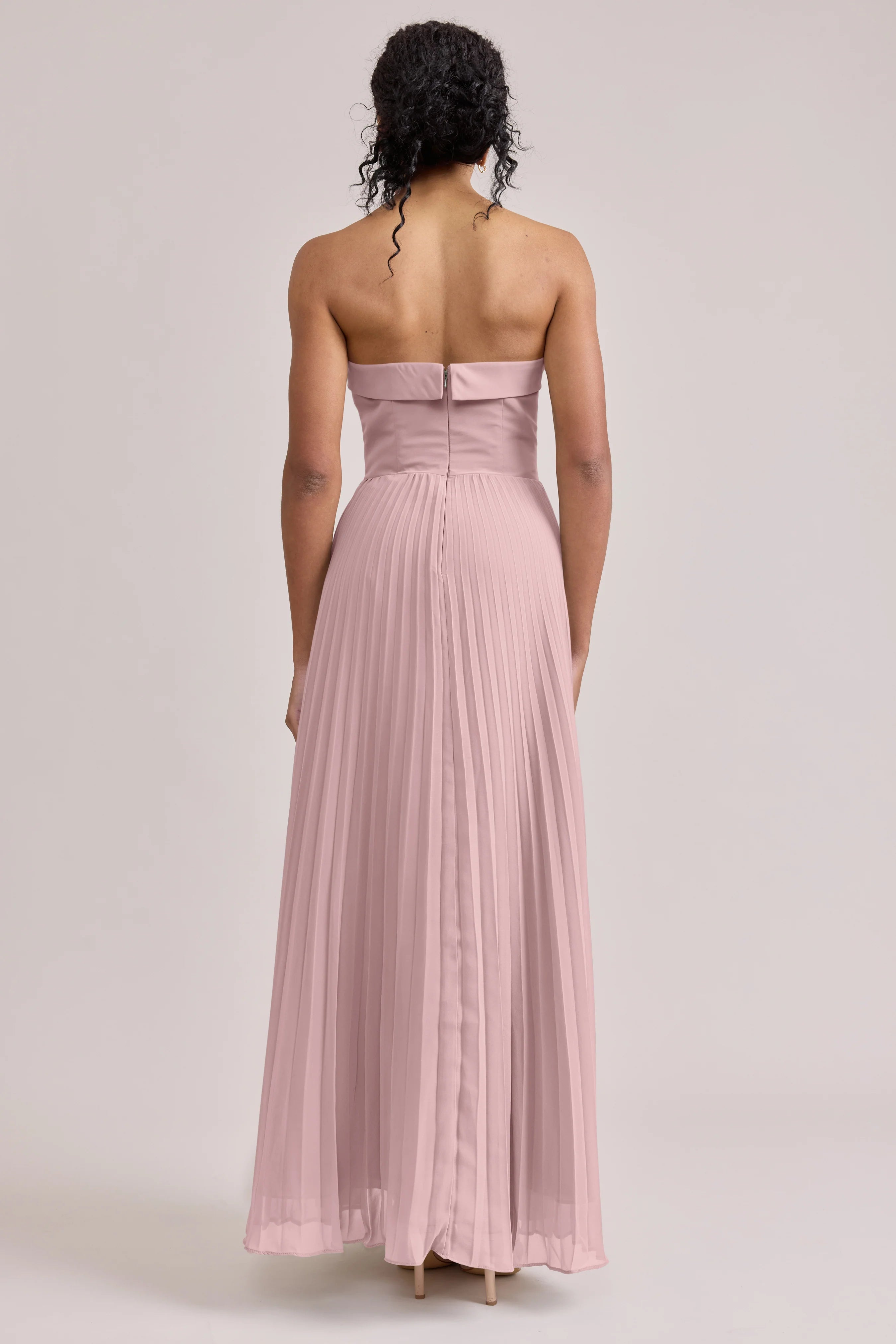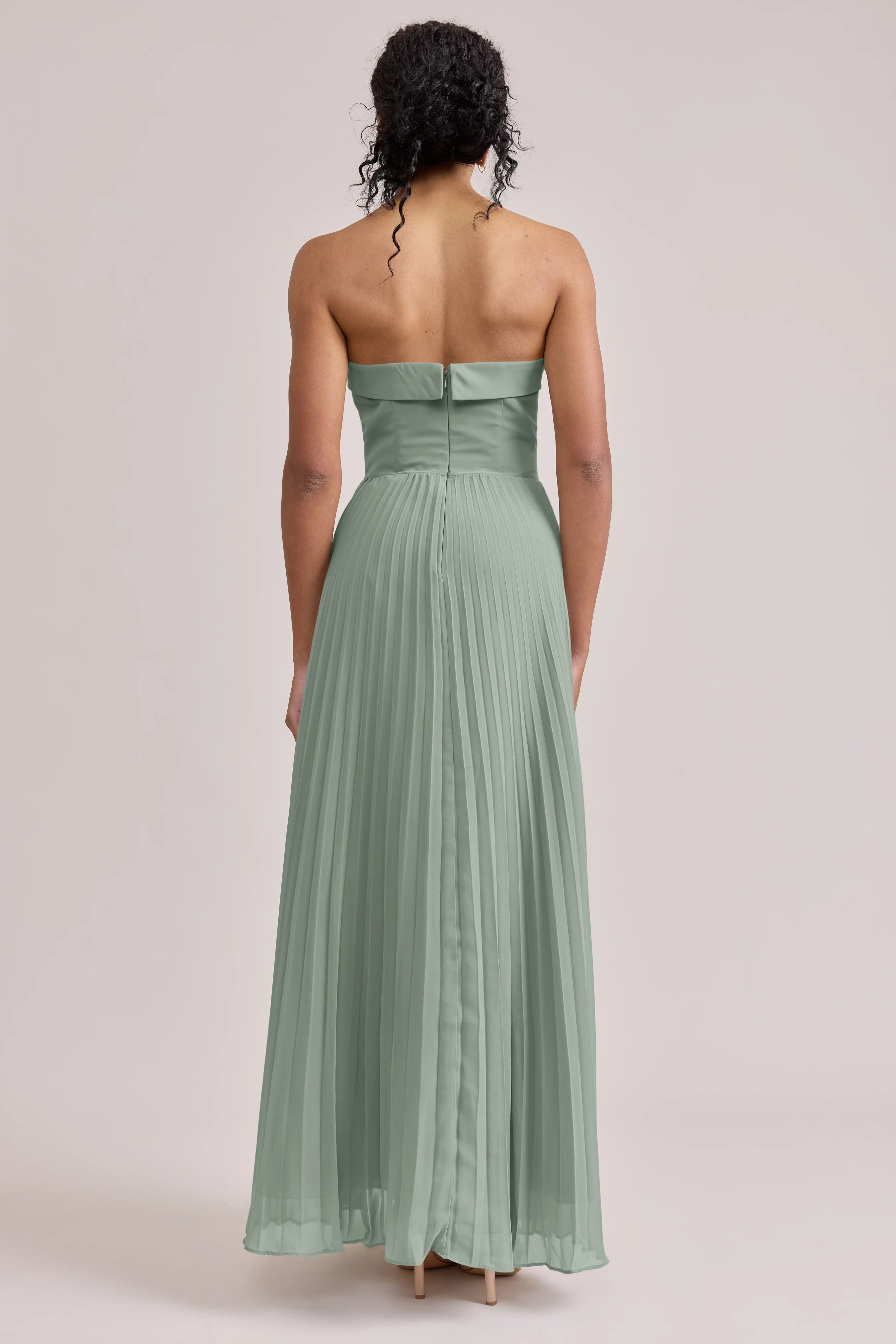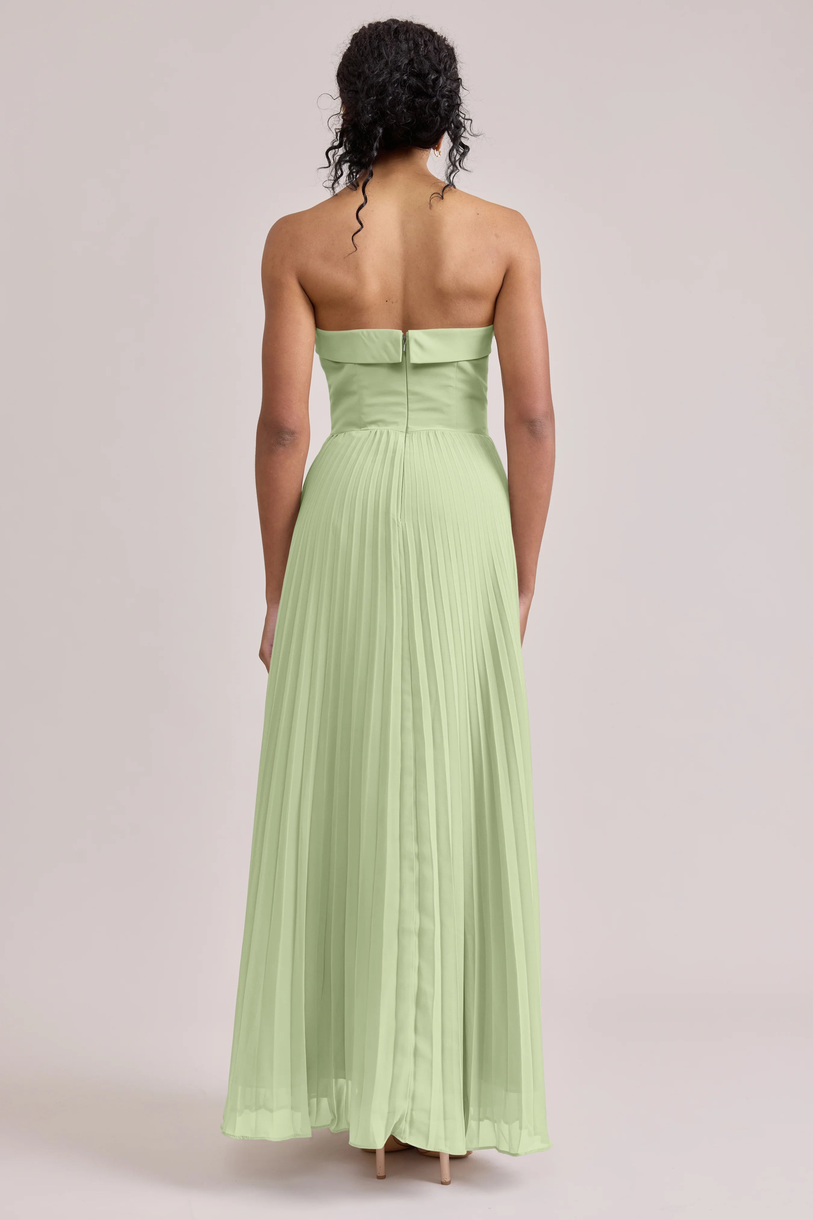 The best-selling Saylor Satin Pleated Dress is now available in Chiffon. A jaw-dropping strapless dress, Saylor will become essential for your elevated wedding line-up. Saylor features a fold over straight-cut neckline and back in our regular chiffon fabric that flows into a vertical pleating skirt at a dropped waistline. Pair with our floral chiffon dresses for the perfect “European Garden” look!