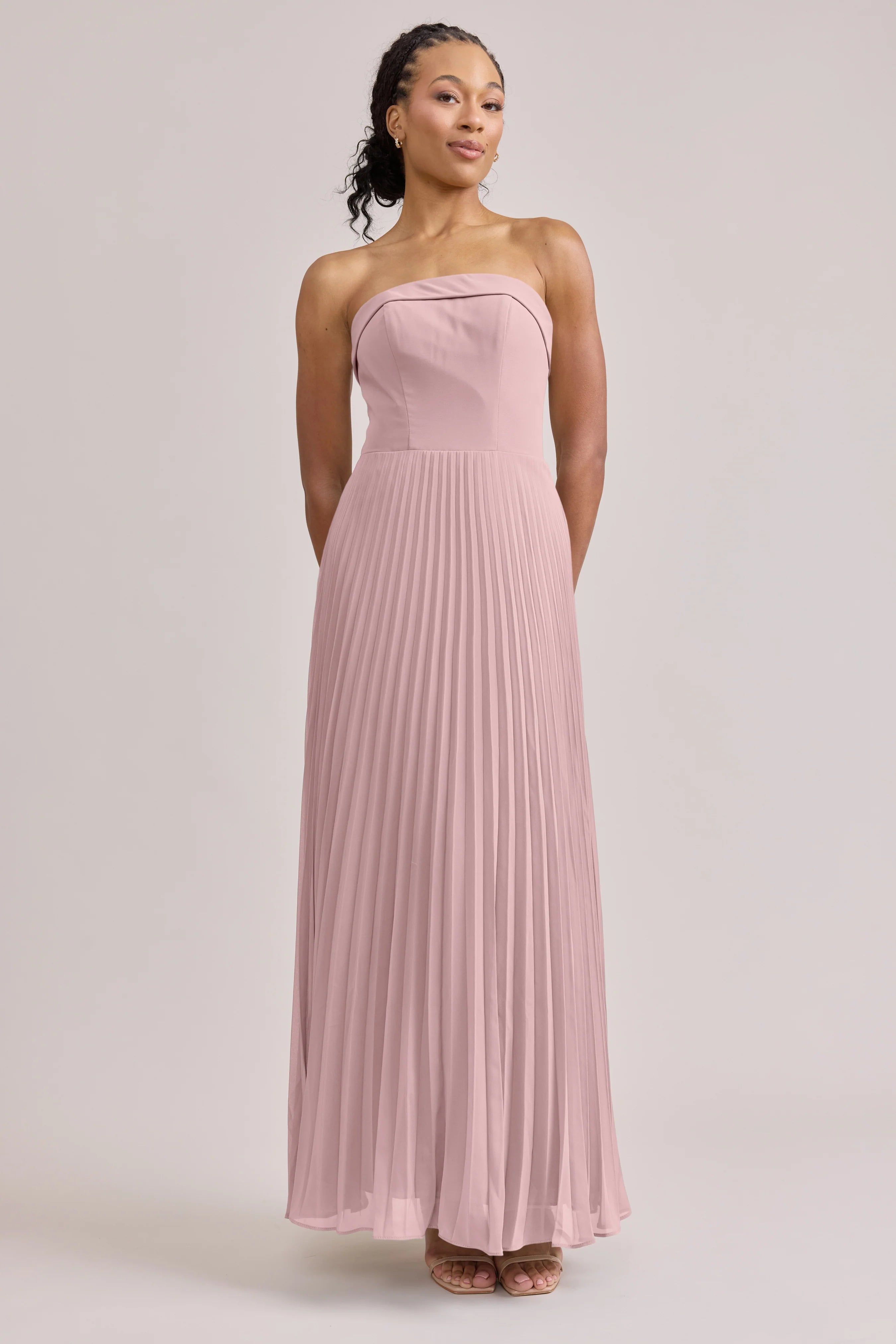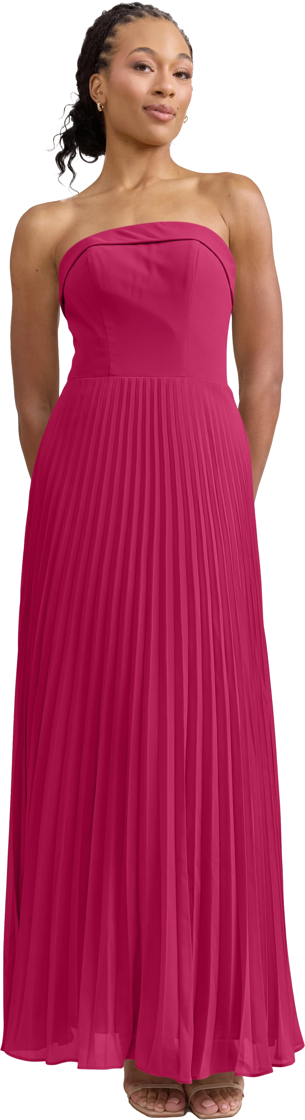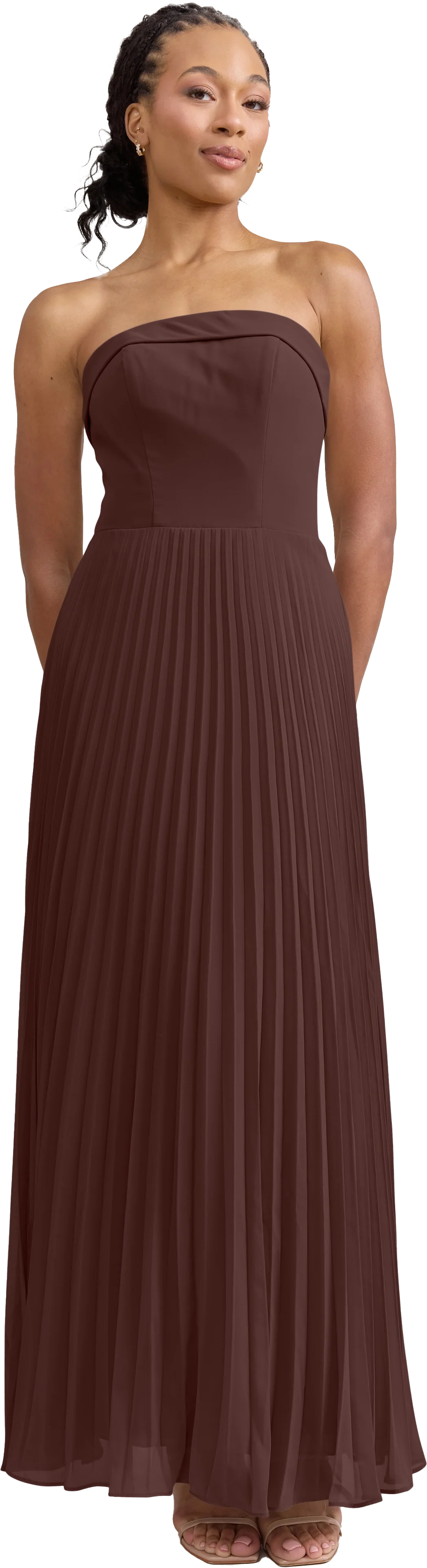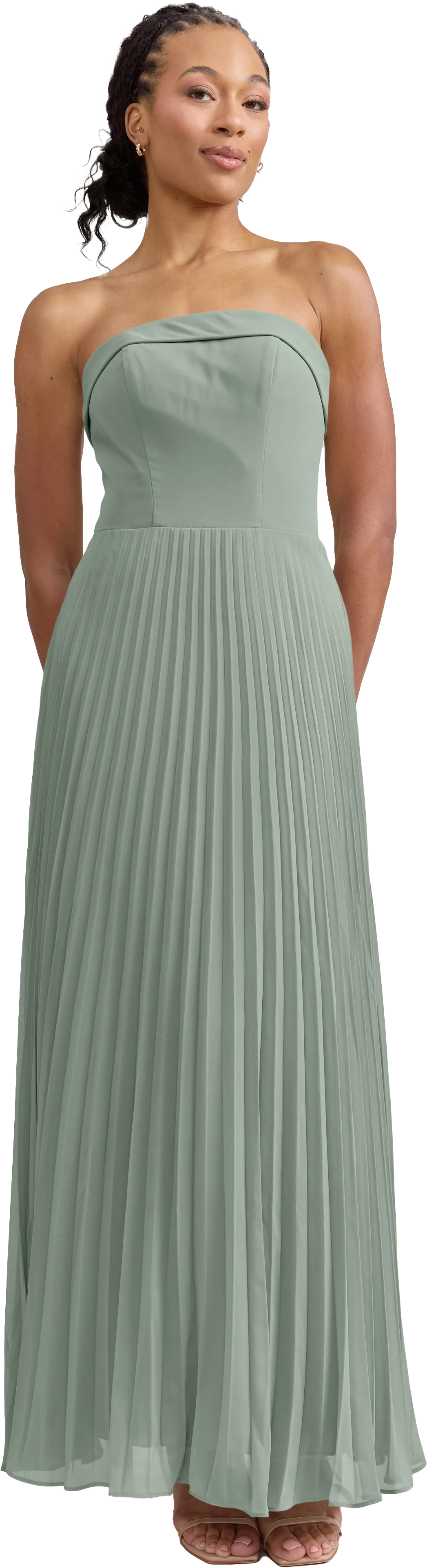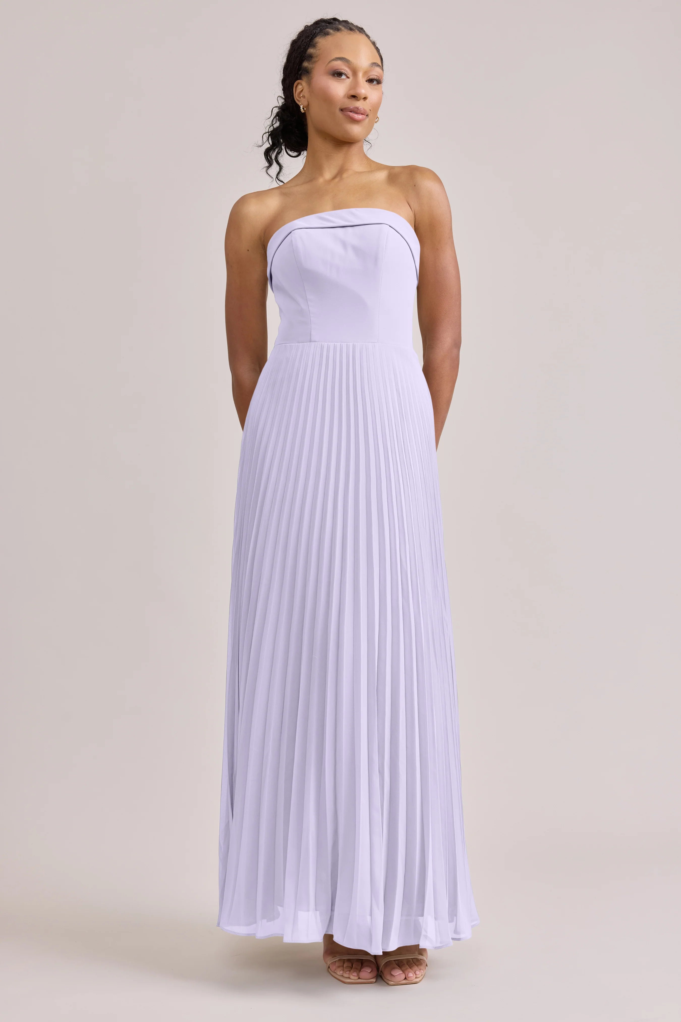 The best-selling Saylor Satin Pleated Dress is now available in Chiffon. A jaw-dropping strapless dress, Saylor will become essential for your elevated wedding line-up. Saylor features a fold over straight-cut neckline and back in our regular chiffon fabric that flows into a vertical pleating skirt at a dropped waistline. Pair with our floral chiffon dresses for the perfect “European Garden” look!