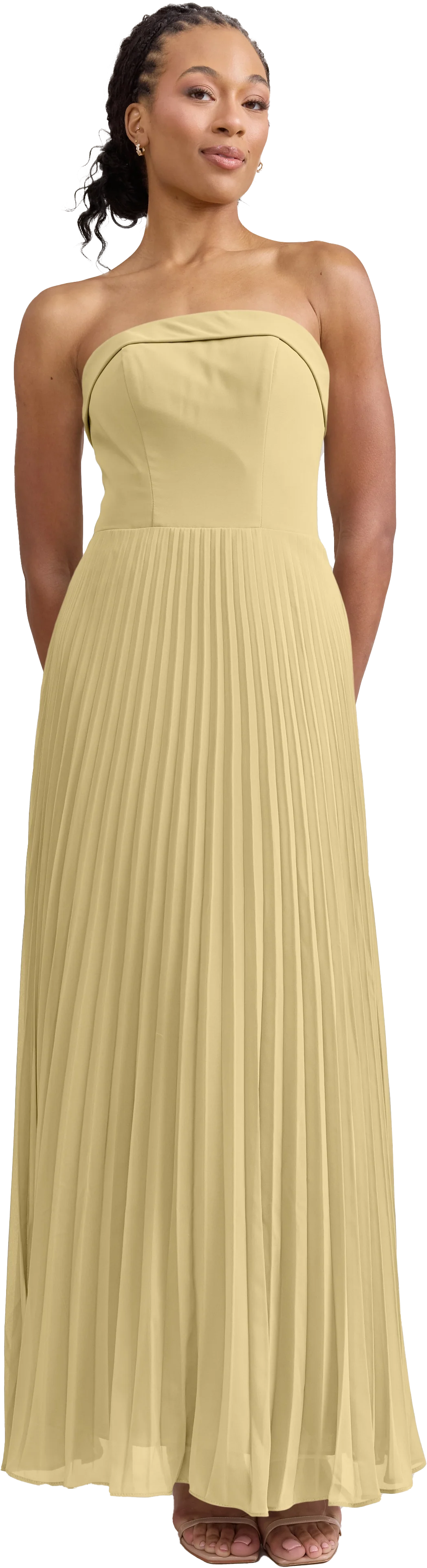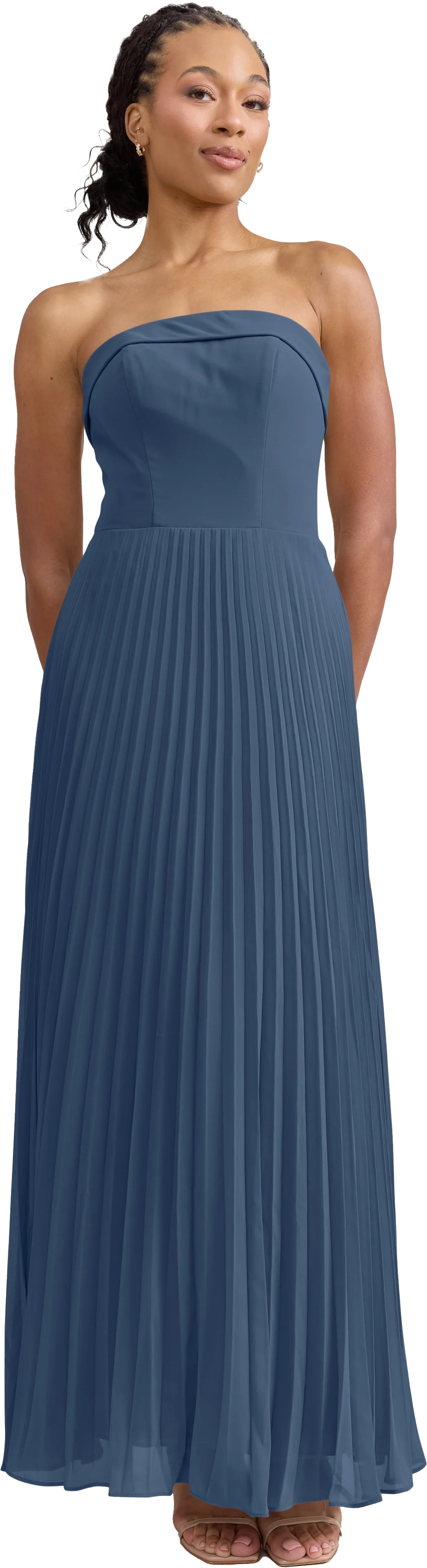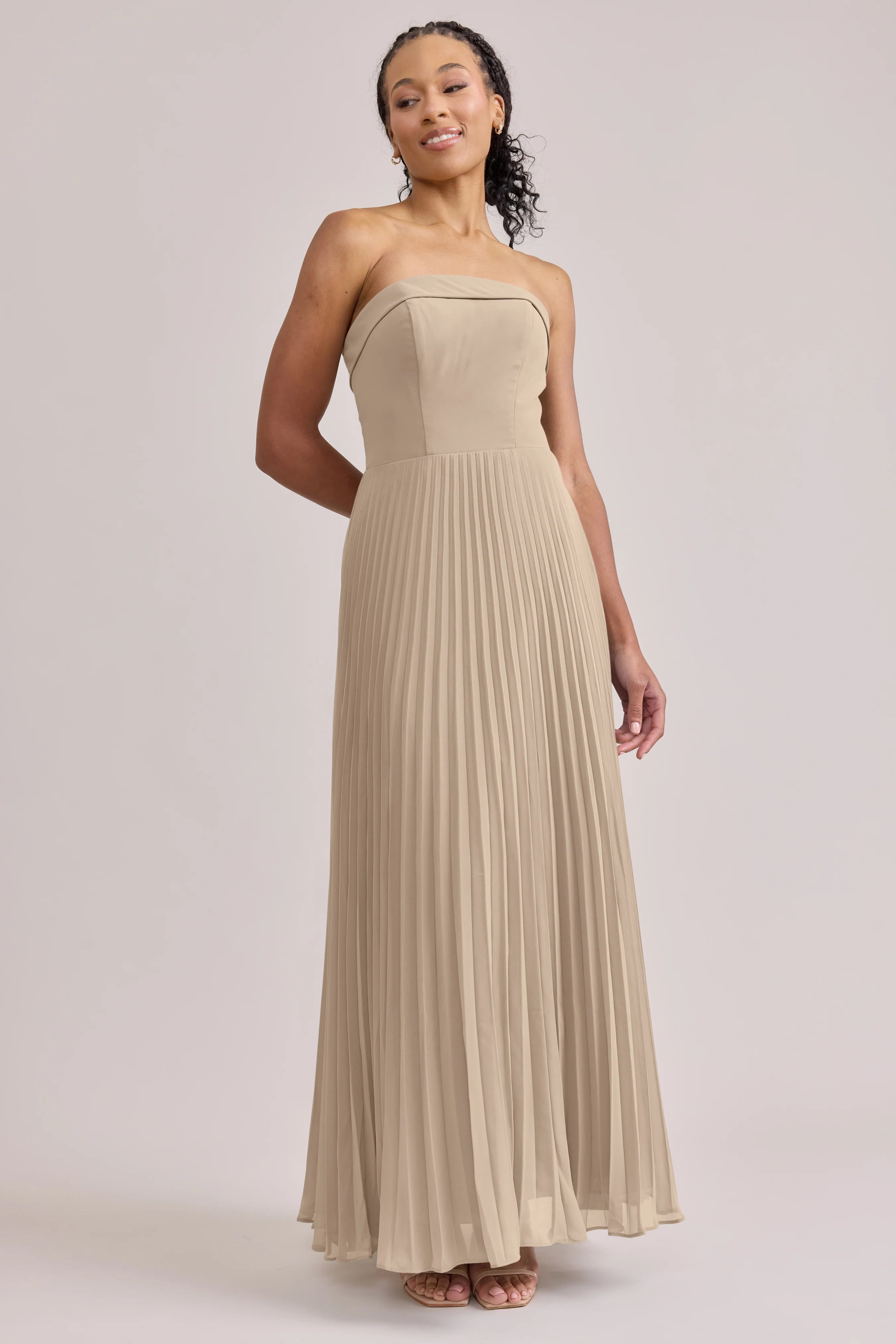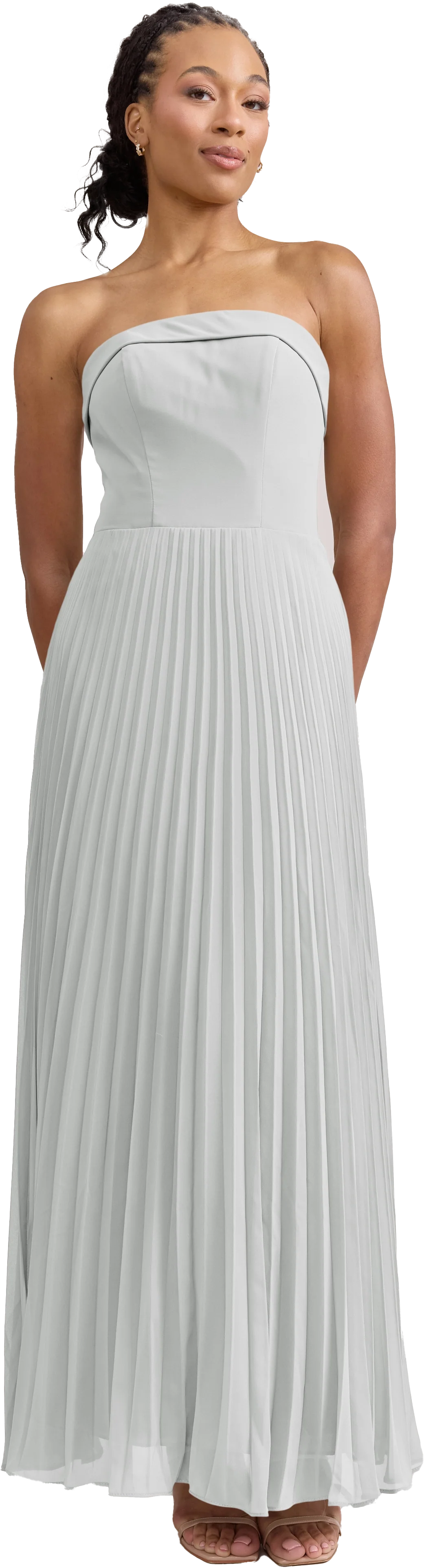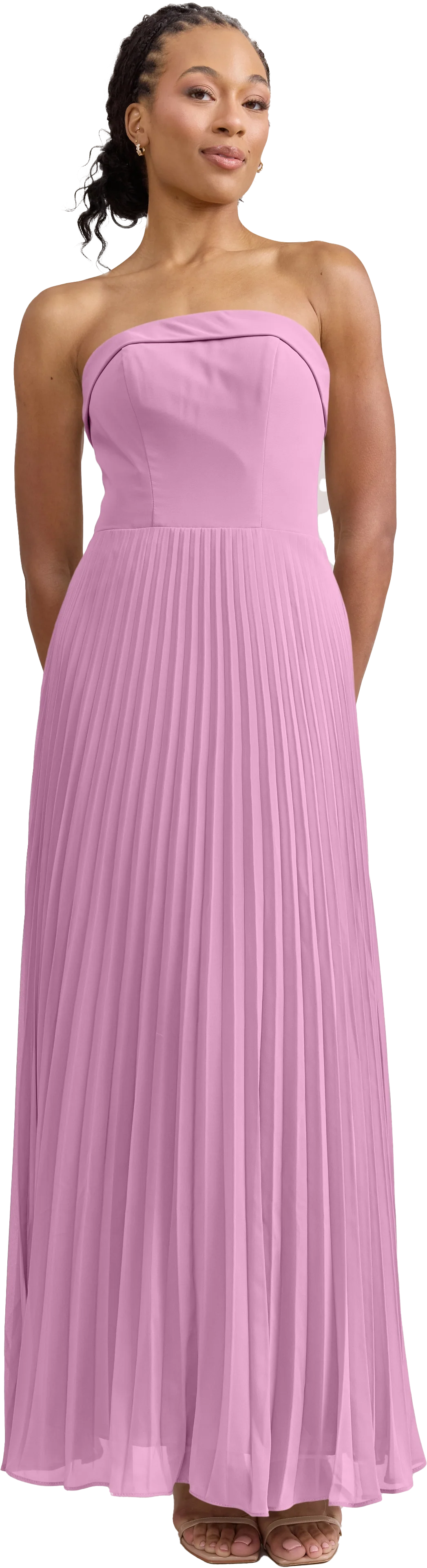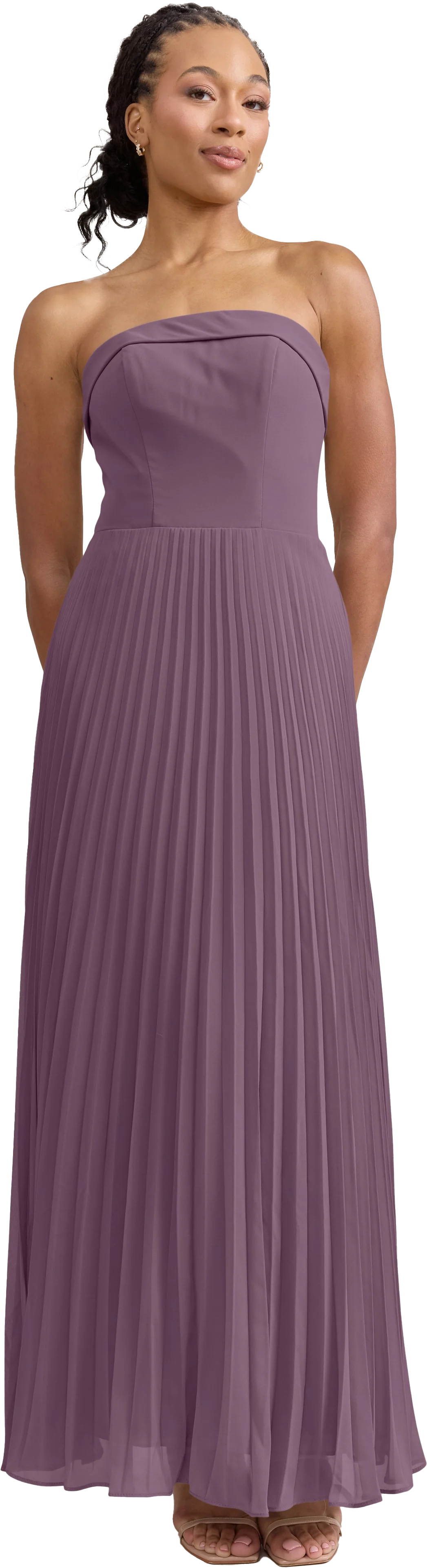 The best-selling Saylor Satin Pleated Dress is now available in Chiffon. A jaw-dropping strapless dress, Saylor will become essential for your elevated wedding line-up. Saylor features a fold over straight-cut neckline and back in our regular chiffon fabric that flows into a vertical pleating skirt at a dropped waistline. Pair with our floral chiffon dresses for the perfect “European Garden” look!