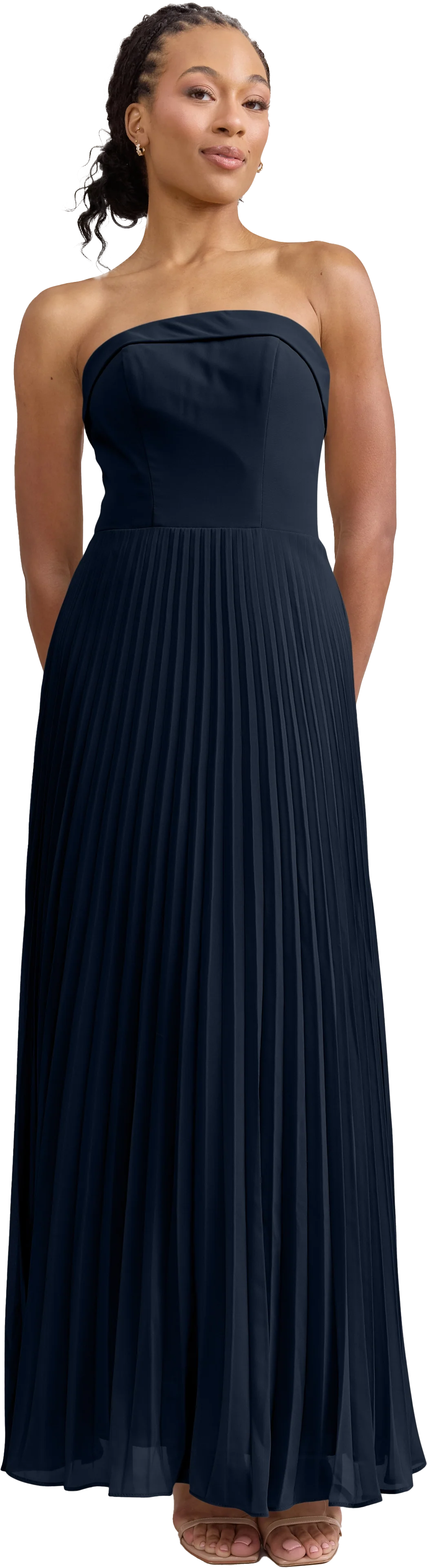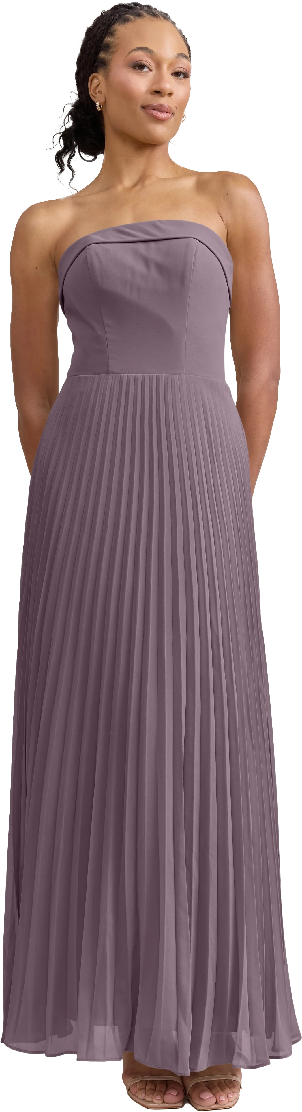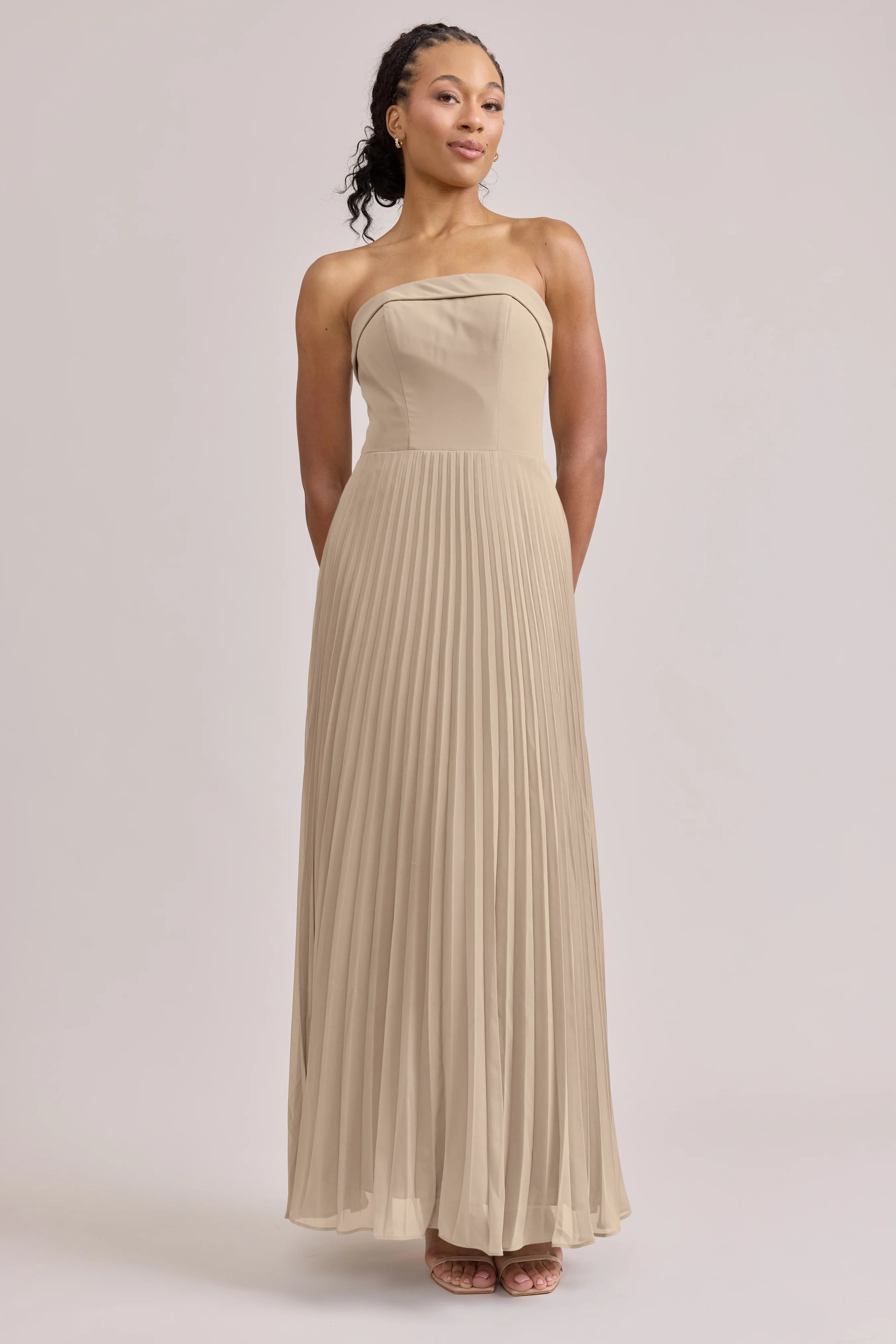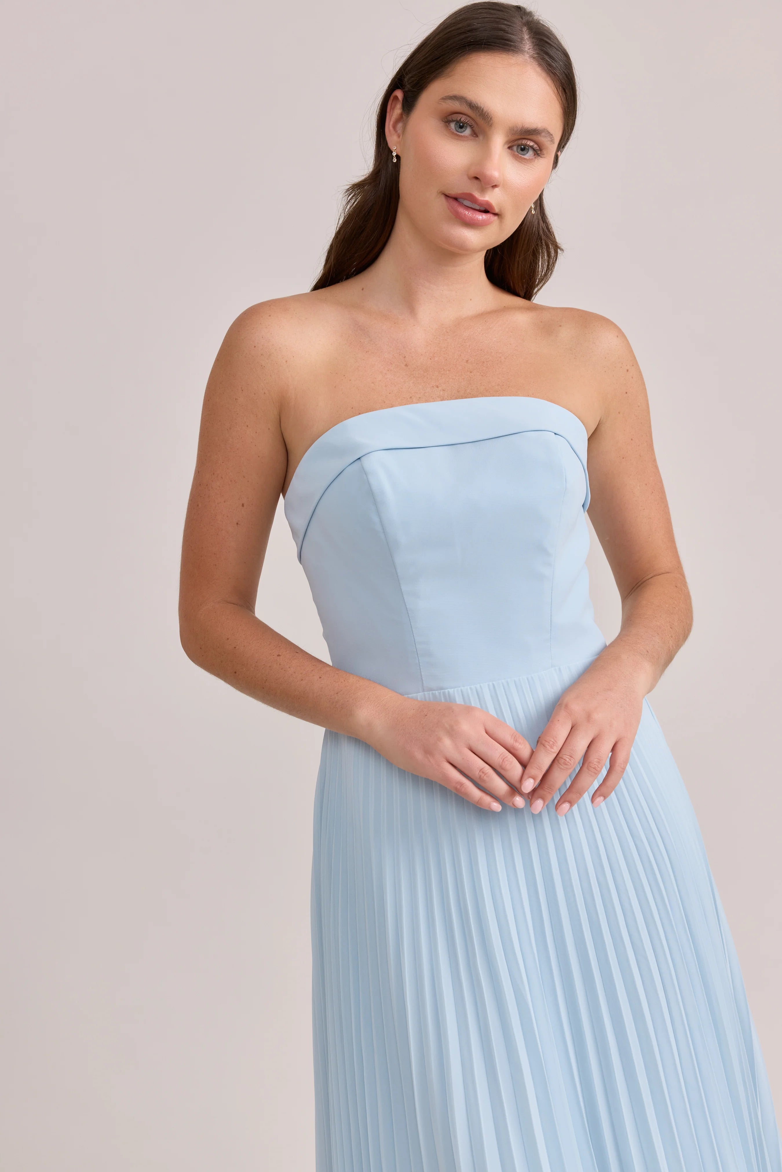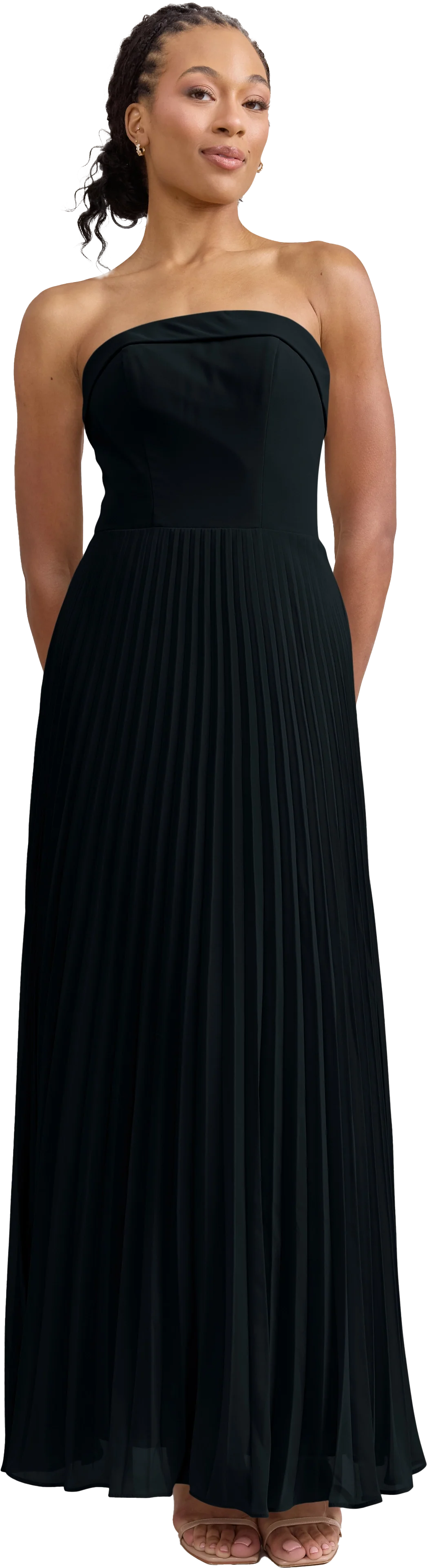 The best-selling Saylor Satin Pleated Dress is now available in Chiffon. A jaw-dropping strapless dress, Saylor will become essential for your elevated wedding line-up. Saylor features a fold over straight-cut neckline and back in our regular chiffon fabric that flows into a vertical pleating skirt at a dropped waistline. Pair with our floral chiffon dresses for the perfect “European Garden” look!